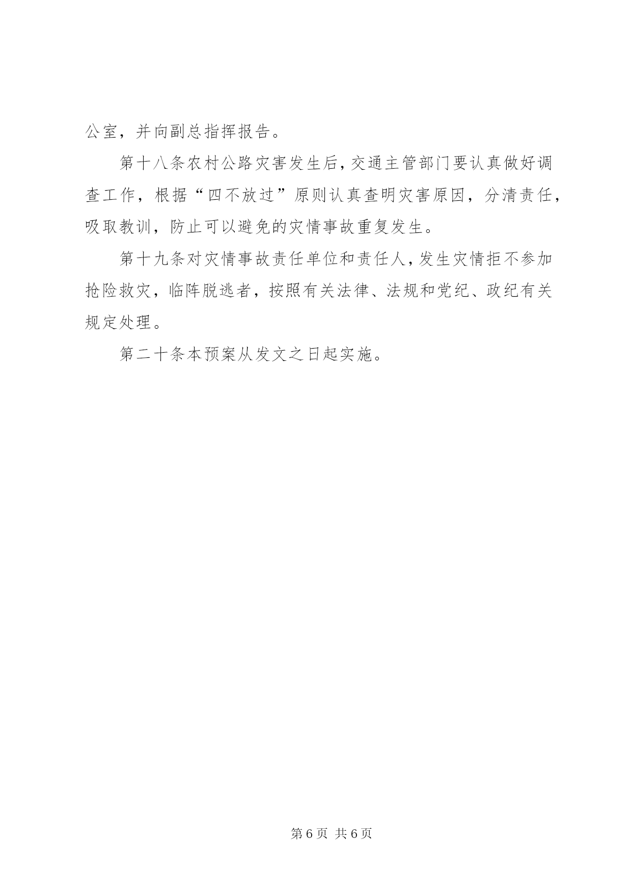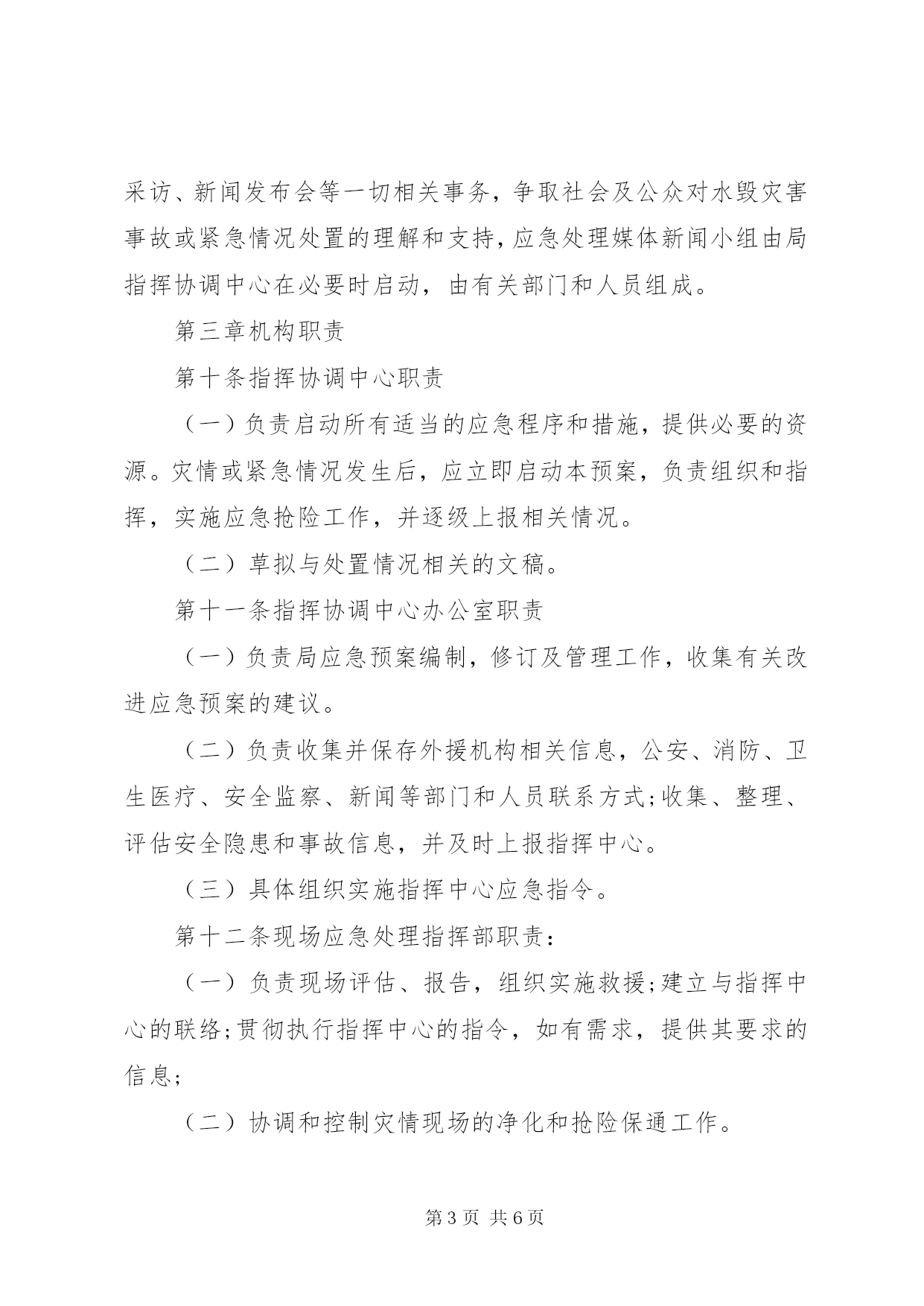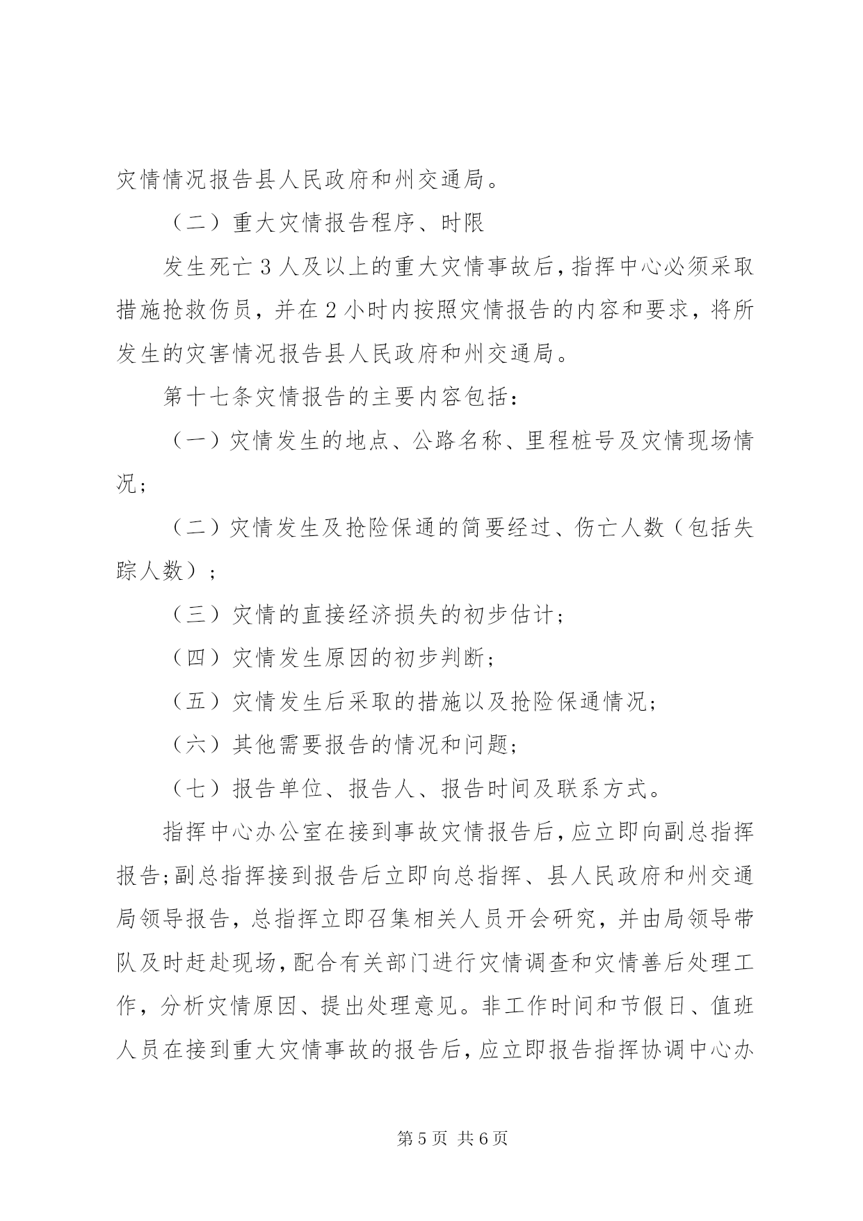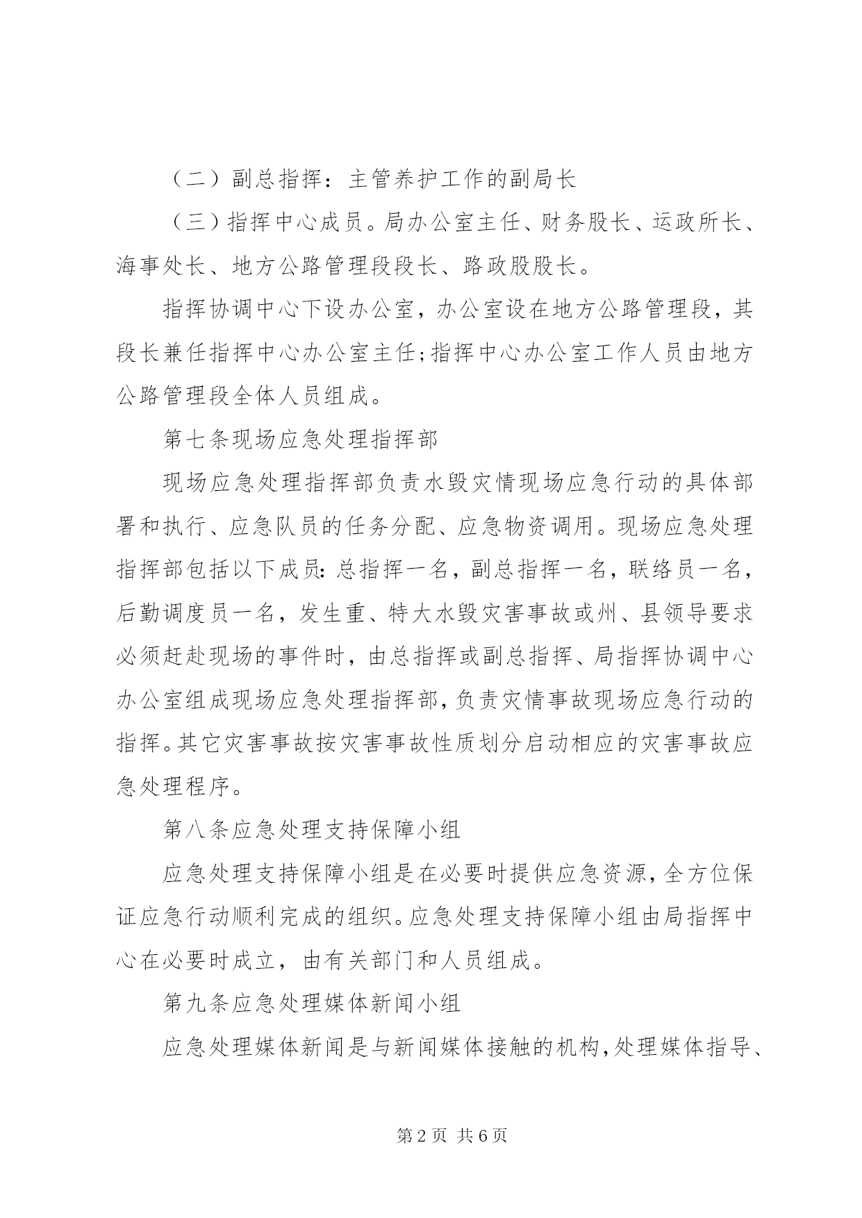 第PAGE\*Arabic\*MERGEFORMAT6页共NUMPAGES\*MERGEFORMAT6页交通局水毁应急预案第一章总则第一条为认真贯彻“安全第一,预防为主”的方针,切实保障人民群众生命财产安全,有效地防范和处置农村公路水毁灾害和安全保通工作,根据《安全法》及有关法律法规和××省人民政府发布的《××省突发公共事件总体应急预案》文件、××州交通局《××州农村公路灾害和安全保通应急预案》,结合我县农村公路养护实际,制定本预案。第二条凡是在××县境内农村公路水毁等造成的公路灾害应急处置,均适用于本预案。第三条本预案制定的目的:公路水毁灾害发生后,及时进行处置,防止灾害扩大,减少人员伤亡、财产损失及环境破坏。指导思想是:以人为本,先人后物,减少损失。第四条成立水毁应急处置指挥部,一旦灾情发生,立即启动指挥系统,实施统一指挥。第二章应急组织机构第五条县交通局指挥协调中心局指挥协调中心是县乡公路水毁灾害应急处理指挥机构,负责协调应急期间各部门的运作,统筹安排整个应急行动,保证行动紧张有效、有序进行。(一)总指挥:局长(二)副总指挥:主管养护工作的副局长(三)指挥中心成员。局办公室主任、财务股长、运政所长、海事处长、地方公路管理段段长、路政股股长。指挥协调中心下设办公室,办公室设在地方公路管理段,其段长兼任指挥中心办公室主任;指挥中心办公室工作人员由地方公路管理段全体人员组成。第七条现场应急处理指挥部现场应急处理指挥部负责水毁灾情现场应急行动的具体部署和执行、应急队员的任务分配、应急物资调用。现场应急处理指挥部包括以下成员:总指挥一名,副总指挥一名,联络员一名,后勤调度员一名,发生重、特大水毁灾害事故或州、县领导要求必须赶赴现场的事件时,由总指挥或副总指挥、局指挥协调中心办公室组成现场应急处理指挥部,负责灾情事故现场应急行动的指挥。其它灾害事故按灾害事故性质划分启动相应的灾害事故应急处理程序。第八条应急处理支持保障小组应急处理支持保障小组是在必要时提供应急资源,全方位保证应急行动顺利完成的组织。应急处理支持保障小组由局指挥中心在必要时成立,由有关部门和人员组成。第九条应急处理媒体新闻小组应急处理媒体新闻是与新闻媒体接触的机构,处理媒体指导、采访、新闻发布会等一切相关事务,争取社会及公众对水毁灾害事故或紧急情况处置的理解和支持,应急处理媒体新闻小组由局指挥协调中心在必要时启动,由有关部门和人员组成。第三章机构职责第十条指挥协调中心职责(一)负责启动所有适当的应急程序和措施,提供必要的资源。灾情或紧急情况发生后,应立即启动本预案,负责组织和指挥,实施应急抢险工作,并逐级上报相关情况。(二)草拟与处置情况相关的文稿。第十一条指挥协调中心办公室职责(一)负责局应急预案编制,修订及管理工作,收集有关改进应急预案的建议。(二)负责收集并保存外援机构相关信息,公安、消防、卫生医疗、安全监察、新闻等部门和人员联系方式;收集、整理、评估安全隐患和事故信息,并及时上报指挥中心。(三)具体组织实施指挥中心应急指令。第十二条现场应急处理指挥部职责:(一)负责现场评估、报告,组织实施救援;建立与指挥中心的联络;贯彻执行指挥中心的指令,如有需求,提供其要求的信息;(二)协调和控制灾情现场的净化和抢险保通工作。(三)应急行动结束后,进行灾情现场应急行动总结并向上级部门递交书面报告。第十三条现场应急处理指挥部总指挥职责:(一)决定(如还未决的话)是否属于重大紧急情况,是否应启动非现场应急计划;(二)确定现场应急处置措施,并指挥实施;持续判断事态的发展,确定事态可能的进程。(三)与消防、公安、安监、上级主管、工会负责人做好协调。第四章灾害等级的划分和预案启动的条件第十四条灾害发生后,交通系统要以最大限度减少人员伤亡和经济损失为原则,及时、迅速、有序、有效地积极组织人员投入抢险,同时按照规定时间和程序向各级主管单位报告;并如实反映灾害和抢险保通情况。第十五条接到灾害报告后,交通行政主管领导应带领职能部门人员立即赶赴出事地点,组织抢险并按灾情报告要求逐级上报到州交通局。第十六条灾害报告程序、时限(一)一般灾情报告程序、时限发生死亡1—2人的一般灾情后,交通局应及时采取措施抢救伤员,并在6小时内按照灾情报告的内容和要求,将所发生的灾情情况报告县人民政府和州交通局。(二)重大灾情报告程序、时限发生死亡3人及以上的重大灾情事故后,指挥中心必须采取措施抢救伤员,并在2小时内按照灾情报告的内容和要求,将所发生的灾害情况报告县人民政府和州交通局。第十七条灾情报告的主要内容包括:(一)灾情发生的地点、公路名称、里程桩号及灾情现场情况;(二)灾情发生及抢险保通的简要经过、伤亡人数(包括失踪人数);(三)灾情的直接经济损失的初步估计;(四)灾情发生原因的初步