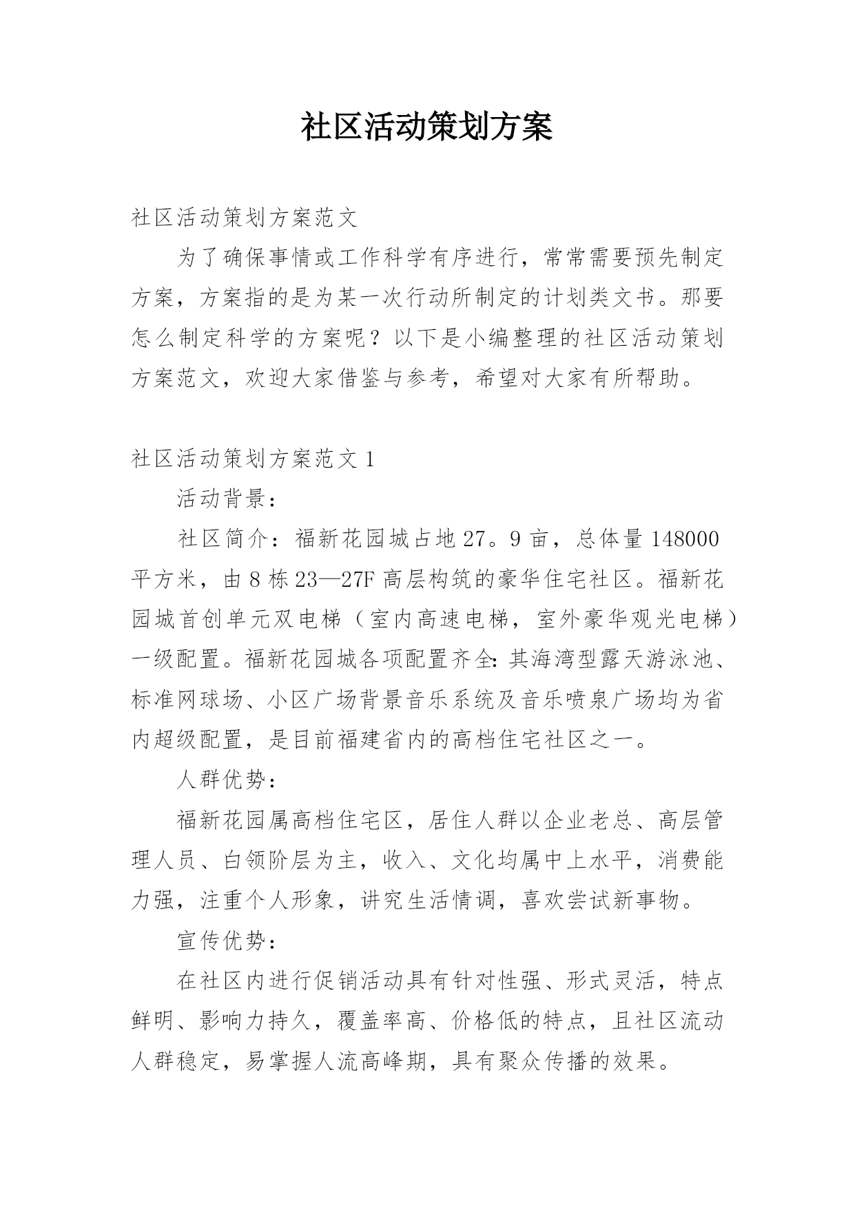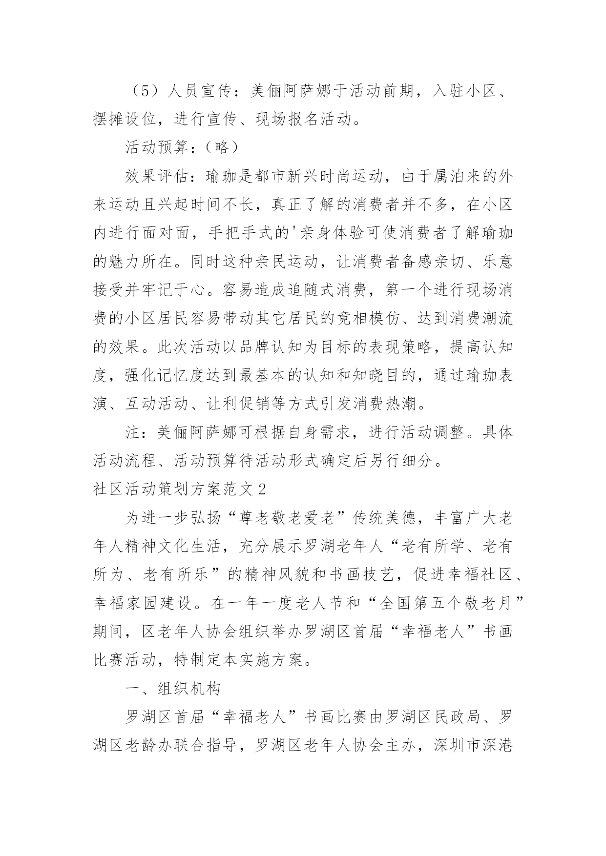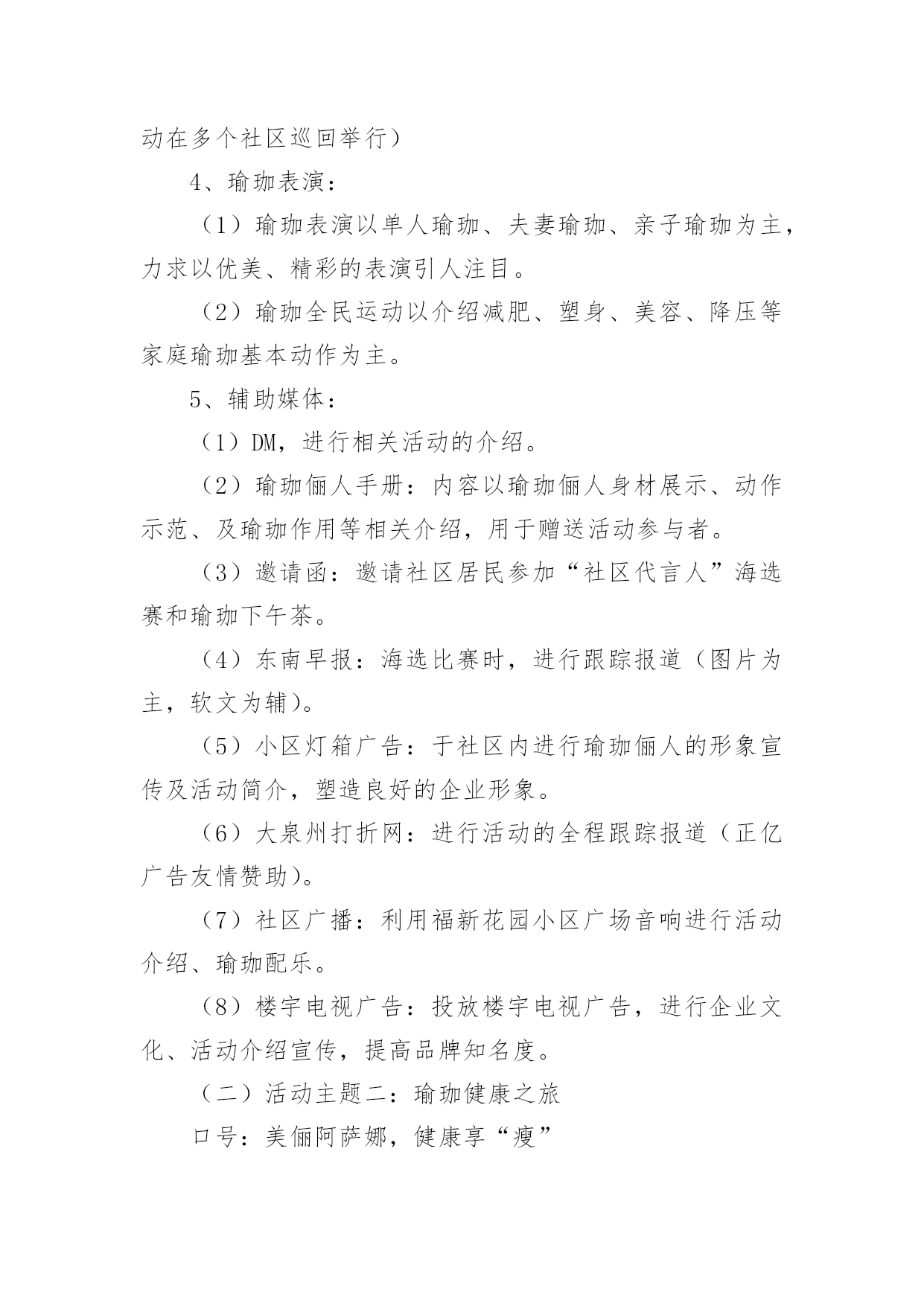 社区活动策划方案社区活动策划方案范文为了确保事情或工作科学有序进行,常常需要预先制定方案,方案指的是为某一次行动所制定的计划类文书。那要怎么制定科学的方案呢?以下是小编整理的社区活动策划方案范文,欢迎大家借鉴与参考,希望对大家有所帮助。社区活动策划方案范文1活动背景:社区简介:福新花园城占地27。9亩,总体量148000平方米,由8栋23—27F高层构筑的豪华住宅社区。福新花园城首创单元双电梯(室内高速电梯,室外豪华观光电梯)一级配置。福新花园城各项配置齐全:其海湾型露天游泳池、标准网球场、小区广场背景音乐系统及音乐喷泉广场均为省内超级配置,是目前福建省内的高档住宅社区之一。人群优势:福新花园属高档住宅区,居住人群以企业老总、高层管理人员、白领阶层为主,收入、文化均属中上水平,消费能力强,注重个人形象,讲究生活情调,喜欢尝试新事物。宣传优势:在社区内进行促销活动具有针对性强、形式灵活,特点鲜明、影响力持久,覆盖率高、价格低的特点,且社区流动人群稳定,易掌握人流高峰期,具有聚众传播的效果。活动目的:品牌推广、项目介绍、拉动销售。活动形式:以现场展示、让利促销为主。活动安排:(一)活动主题一:瑜珈俪人秀口号:美俪赢天下!1、时间:9月4日—9日(星期一至星期六)2、地点:福新花园城3、活动内容:活动节目活动时间活动地点活动细则瑜珈表演9月4日—8日(上午7:30—8:30,下午5:30—6:30)福新花园城前的音乐喷泉广场(或福新花园游泳池旁)美俪阿萨娜会员于上下班人流高峰期进行瑜珈表演,形成一道独特的风景,吸引目标消费者,促使其产生冲动消费。促销活动9月4日—8日福新花园城小区内配合社区上下班时间于小区内摆设摊位,发放瑜珈俪人手册、人员现场介绍、让利促销(打折抽奖赠礼),鼓励居民进行现场报名。活动期间教师可凭相关证件取得最优惠价并获得精美礼品一份(化妆品/美容卡)。瑜珈全民运动9月4日—8日(上午7:30—8:30,下午5:30—6:30)福新花园城网球场9月4日,工作人员于福新花园入口处,发放活动宣传单,邀请社区居民加入瑜珈全民运动中,参与人员可参与瑜珈表演并获得专业人员现场指导的机会。瑜珈下午茶9月8日(下午5:30—7:30)福新花园城小区内由物业人员负责发放请柬,邀请居民参加“瑜珈下午茶”,即时将提供茶水、水果等简单招待,登记参与人员,建立客户资料库并进行相关瑜珈讲座,咨询社区人员对瑜珈运动的心得体会。瑜珈社区代言人9月9日福新花园城前的音乐喷泉广场邀请社区人员参加“瑜珈社区代言人”海选赛,优胜者将获得一定的奖金(具体数额待定)与证书(社区代言人证书),同时将被招聘为小区代言人,代言人有底薪,帮助美俪阿萨娜做小区宣传,同时也帮助进行销售。(建议此项活动在多个社区巡回举行)4、瑜珈表演:(1)瑜珈表演以单人瑜珈、夫妻瑜珈、亲子瑜珈为主,力求以优美、精彩的表演引人注目。(2)瑜珈全民运动以介绍减肥、塑身、美容、降压等家庭瑜珈基本动作为主。5、辅助媒体:(1)DM,进行相关活动的介绍。(2)瑜珈俪人手册:内容以瑜珈俪人身材展示、动作示范、及瑜珈作用等相关介绍,用于赠送活动参与者。(3)邀请函:邀请社区居民参加“社区代言人”海选赛和瑜珈下午茶。(4)东南早报:海选比赛时,进行跟踪报道(图片为主,软文为辅)。(5)小区灯箱广告:于社区内进行瑜珈俪人的形象宣传及活动简介,塑造良好的企业形象。(6)大泉州打折网:进行活动的全程跟踪报道(正亿广告友情赞助)。(7)社区广播:利用福新花园小区广场音响进行活动介绍、瑜珈配乐。(8)楼宇电视广告:投放楼宇电视广告,进行企业文化、活动介绍宣传,提高品牌知名度。(二)活动主题二:瑜珈健康之旅口号:美俪阿萨娜,健康享“瘦”1、时间:10月1日—8日2、地点:泉州知名社区(福新花园、和昌商城、太平洋花园、宝珊花园、南丰新城)3、活动内容:(1)健康之旅——体验瑜珈:10月1日—4日,市民可交纳一定费用参加为期八天的健康之旅,在游山玩水时体验瑜珈魅力(每天穿插1个小时的瑜珈体验活动,瑜珈体验为免费赠送)。(2)美俪沙龙(含抽奖活动):10月4日—8日,邀请市民参加“美俪沙龙”,市民只须交纳少额手续费便可免费体验“美俪阿萨娜”馆内任何一项活动。(3)俪人座谈会:邀请新老会员参加座谈会,大家对“乐出健康、练出美丽”,以及在生活中所遇到的压力、美容养颜等问题进行了讨论,同时穿插了抽奖活动,赠送精美礼品和贺卡!会员在轻松的座谈会中互相认识、交流,最后一起合影,共度国庆节!4、辅助媒体:(1)DM:制作活动宣传单,以夹报、社区邮箱投递两种形式进行投放。(2)小区灯箱广告:以形象宣传为主,活动介绍为辅。(3)新华都灯箱广告:借助新华都十一长假人流高峰期,进行活动宣传、形象塑造。(4)大泉州打折网:进行活动的全程