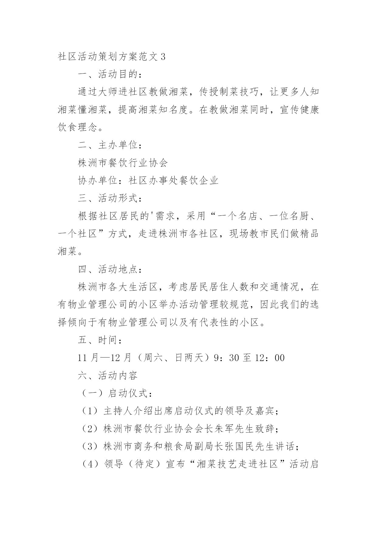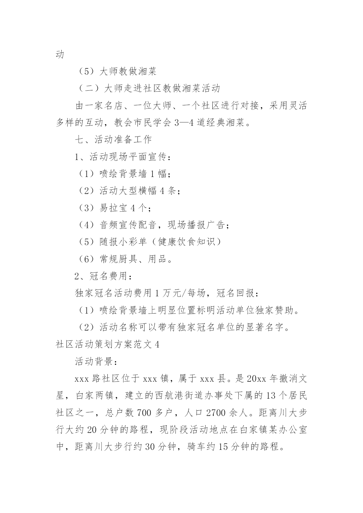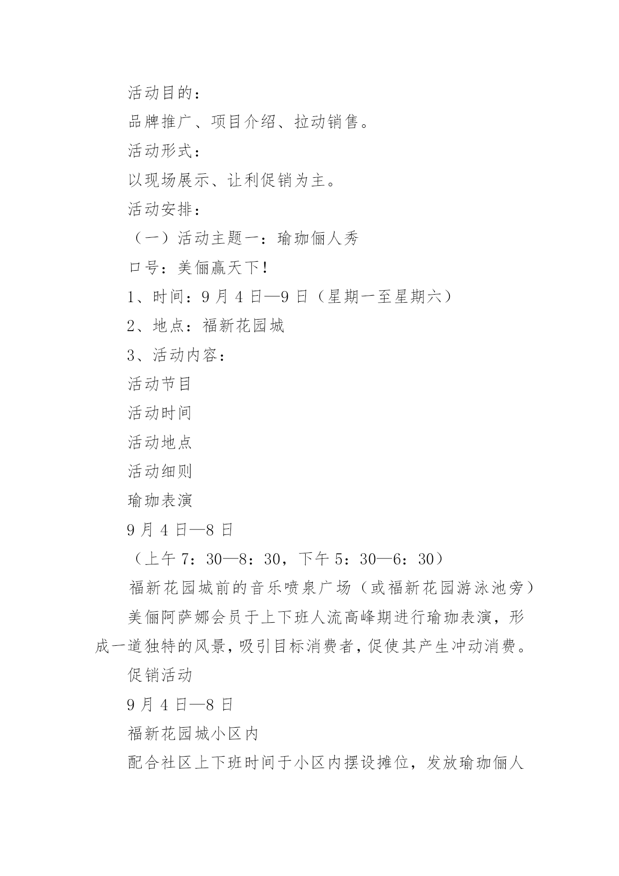 社区活动策划方案社区活动策划方案范文为了确保事情或工作科学有序进行,常常需要预先制定方案,方案指的是为某一次行动所制定的计划类文书。那要怎么制定科学的方案呢?以下是小编整理的社区活动策划方案范文,欢迎大家借鉴与参考,希望对大家有所帮助。社区活动策划方案范文1活动背景:社区简介:福新花园城占地27。9亩,总体量148000平方米,由8栋23—27F高层构筑的豪华住宅社区。福新花园城首创单元双电梯(室内高速电梯,室外豪华观光电梯)一级配置。福新花园城各项配置齐全:其海湾型露天游泳池、标准网球场、小区广场背景音乐系统及音乐喷泉广场均为省内超级配置,是目前福建省内的高档住宅社区之一。人群优势:福新花园属高档住宅区,居住人群以企业老总、高层管理人员、白领阶层为主,收入、文化均属中上水平,消费能力强,注重个人形象,讲究生活情调,喜欢尝试新事物。宣传优势:在社区内进行促销活动具有针对性强、形式灵活,特点鲜明、影响力持久,覆盖率高、价格低的特点,且社区流动人群稳定,易掌握人流高峰期,具有聚众传播的效果。活动目的:品牌推广、项目介绍、拉动销售。活动形式:以现场展示、让利促销为主。活动安排:(一)活动主题一:瑜珈俪人秀口号:美俪赢天下!1、时间:9月4日—9日(星期一至星期六)2、地点:福新花园城3、活动内容:活动节目活动时间活动地点活动细则瑜珈表演9月4日—8日(上午7:30—8:30,下午5:30—6:30)福新花园城前的音乐喷泉广场(或福新花园游泳池旁)美俪阿萨娜会员于上下班人流高峰期进行瑜珈表演,形成一道独特的风景,吸引目标消费者,促使其产生冲动消费。促销活动9月4日—8日福新花园城小区内配合社区上下班时间于小区内摆设摊位,发放瑜珈俪人手册、人员现场介绍、让利促销(打折抽奖赠礼),鼓励居民进行现场报名。活动期间教师可凭相关证件取得最优惠价并获得精美礼品一份(化妆品/美容卡)。瑜珈全民运动9月4日—8日(上午7:30—8:30,下午5:30—6:30)福新花园城网球场9月4日,工作人员于福新花园入口处,发放活动宣传单,邀请社区居民加入瑜珈全民运动中,参与人员可参与瑜珈表演并获得专业人员现场指导的机会。瑜珈下午茶9月8日(下午5:30—7:30)福新花园城小区内由物业人员负责发放请柬,邀请居民参加“瑜珈下午茶”,即时将提供茶水、水果等简单招待,登记参与人员,建立客户资料库并进行相关瑜珈讲座,咨询社区人员对瑜珈运动的心得体会。瑜珈社区代言人9月9日福新花园城前的音乐喷泉广场邀请社区人员参加“瑜珈社区代言人”海选赛,优胜者将获得一定的奖金(具体数额待定)与证书(社区代言人证书),同时将被招聘为小区代言人,代言人有底薪,帮助美俪阿萨娜做小区宣传,同时也帮助进行销售。(建议此项活动在多个社区巡回举行)4、瑜珈表演:(1)瑜珈表演以单人瑜珈、夫妻瑜珈、亲子瑜珈为主,力求以优美、精彩的表演引人注目。(2)瑜珈全民运动以介绍减肥、塑身、美容、降压等家庭瑜珈基本动作为主。5、辅助媒体:(1)DM,进行相关活动的介绍。(2)瑜珈俪人手册:内容以瑜珈俪人身材展示、动作示范、及瑜珈作用等相关介绍,用于赠送活动参与者。(3)邀请函:邀请社区居民参加“社区代言人”海选赛和瑜珈下午茶。(4)东南早报:海选比赛时,进行跟踪报道(图片为主,软文为辅)。(5)小区灯箱广告:于社区内进行瑜珈俪人的形象宣传及活动简介,塑造良好的企业形象。(6)大泉州打折网:进行活动的全程跟踪报道(正亿广告友情赞助)。(7)社区广播:利用福新花园小区广场音响进行活动介绍、瑜珈配乐。(8)楼宇电视广告:投放楼宇电视广告,进行企业文化、活动介绍宣传,提高品牌知名度。(二)活动主题二:瑜珈健康之旅口号:美俪阿萨娜,健康享“瘦”1、时间:10月1日—8日2、地点:泉州知名社区(福新花园、和昌商城、太平洋花园、宝珊花园、南丰新城)3、活动内容:(1)健康之旅——体验瑜珈:10月1日—4日,市民可交纳一定费用参加为期八天的健康之旅,在游山玩水时体验瑜珈魅力(每天穿插1个小时的瑜珈体验活动,瑜珈体验为免费赠送)。(2)美俪沙龙(含抽奖活动):10月4日—8日,邀请市民参加“美俪沙龙”,市民只须交纳少额手续费便可免费体验“美俪阿萨娜”馆内任何一项活动。(3)俪人座谈会:邀请新老会员参加座谈会,大家对“乐出健康、练出美丽”,以及在生活中所遇到的压力、美容养颜等问题进行了讨论,同时穿插了抽奖活动,赠送精美礼品和贺卡!会员在轻松的座谈会中互相认识、交流,最后一起合影,共度国庆节!4、辅助媒体:(1)DM:制作活动宣传单,以夹报、社区邮箱投递两种形式进行投放。(2)小区灯箱广告:以形象宣传为主,活动介绍为辅。(3)新华都灯箱广告:借助新华都十一长假人流高峰期,进行活动宣传、形象塑造。(4)大泉州打折网:进行活动的全程