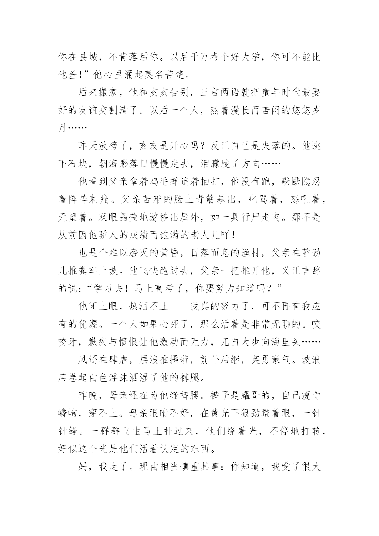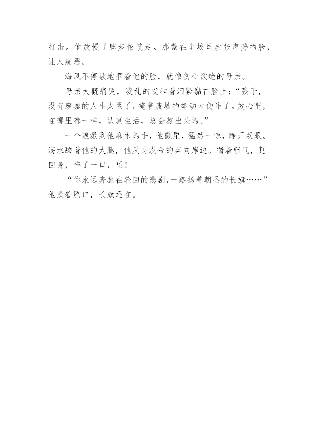 高考之外高一散文高考之外高一散文海风凄厉的叫嚣着西山日暮,掀起滚滚白浪冲向干涩的岸边,拍击着呜咽的丑石。他的脚踝冷浸浸的,附在石上……凛然起身。他想,所有年轻的头颅都是高贵的,要高高昂着,不要俯首屈就那些陈腐衰老的经验主义者。于是他把头重重抬起,一只大鹄一飞而逝。他痴想:他是不是那种鹄?岩石呜咽着*,他的眼神黯淡下来。他想起了那段似曾相识的年幼。亥亥的爷爷就是打这种鹄的。黄昏,“蹬蹬”的脚步声,准是亥亥拉他去“打牙祭”。这种大鸟肉鲜味美,诱人垂涎,难得的佳肴。他们搓净手,正襟危坐,对视一下,相继吃抢开来,油乎乎的嘴淌着笑意……他咽咽口水,好似在回味。突然眼睛濡湿了,他用手背一抹,叹了口气。12岁,爸爸用银发和臂膀为他换得去县城求学的机会。他珍惜,上进,坚持以傲人的成绩迎合父亲傲人的神采。邻居们艳羡不已,夸赞不绝。每月归家,他迫急的找亥亥。亥亥却越来越忙碌,时时伏案苦读。忙碌到无暇去好奇新鲜的县城故事,忙碌到忘记请他吃鸟肉,忘记见了面的寒暄。姥姥说:“亥亥妈妈说了,人家亥亥要努力学习,知道你在县城,不肯落后你。以后千万考个好大学,你可不能比他差!”他心里涌起莫名苦楚。后来搬家,他和亥亥告别,三言两语就把童年时代最要好的友谊交割清了。以后一个人,熬着漫长而苦闷的悠悠岁月……昨天放榜了,亥亥是开心吗?反正自己是失落的。他跳下石块,朝海影落日慢慢走去,泪朦胧了方向……他看到父亲拿着鸡毛掸追着抽打,他没有跑,默默隐忍着阵阵刺痛。父亲苦难的脸上青筋暴出,叱骂着,怒吼着,无望着。双眼晶莹地游移出屋外,如一具行尸走肉。那不是从前因他骄人的成绩而饱满的老人儿吖!也是个难以磨灭的黄昏,日落而息的渔村,父亲在蓄劲儿推粪车上坡。他飞快跑过去,父亲一把推开他,义正言辞的说:“学习去!马上高考了,你要努力知道吗?”他闭上眼,热泪不止——我真的努力了,可不再有我应有的优渥。一个人如果心死了,那么活着是非常无聊的。咬咬牙,歉疚与愤恨让他激动而无力,兀自大步向海里头……风还在肆虐,层浪推搡着,前仆后继,英勇豪气。波浪席卷起白色浮沫洒湿了他的裤腿。昨晚,母亲还在为他缝裤腿。裤子是耀哥的,自己瘦骨嶙峋,穿不上。母亲眼睛不好,在黄光下狠劲瞪着眼,一针针缝。一群群飞虫马上扑过来,他们绕着光,不停地打转,好似这个光是他们活着认定的东西。妈,我走了。理由相当慎重其事:你知道,我受了很大打击。他放慢了脚步依就走。那蒙在尘埃里虚张声势的脸,让人痛恶。海风不停歇地掴着他的脸,就像伤心欲绝的母亲。母亲大概痛哭,凌乱的发和着泪紧黏在脸上:“孩子,没有废墟的人生太累了,掩着废墟的举动太伪诈了。放心吧,在哪里都一样,认真生活,总会熬出头的。”一个浪激到他麻木的手,他颤栗,猛然一惊,睁开双眼。海水舔着他的大腿,他反身没命的奔向岸边。喘着粗气,踅回身,啐了一口,呸!“你永远奔驰在轮回的悲剧,一路扬着朝圣的长旗……”他摸着胸口,长旗还在。