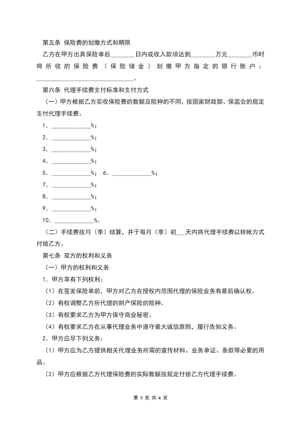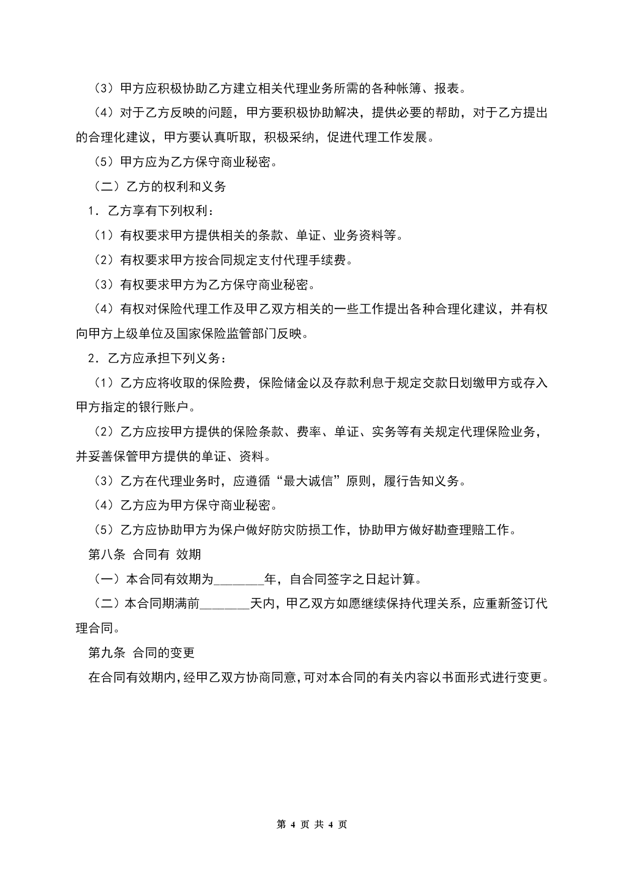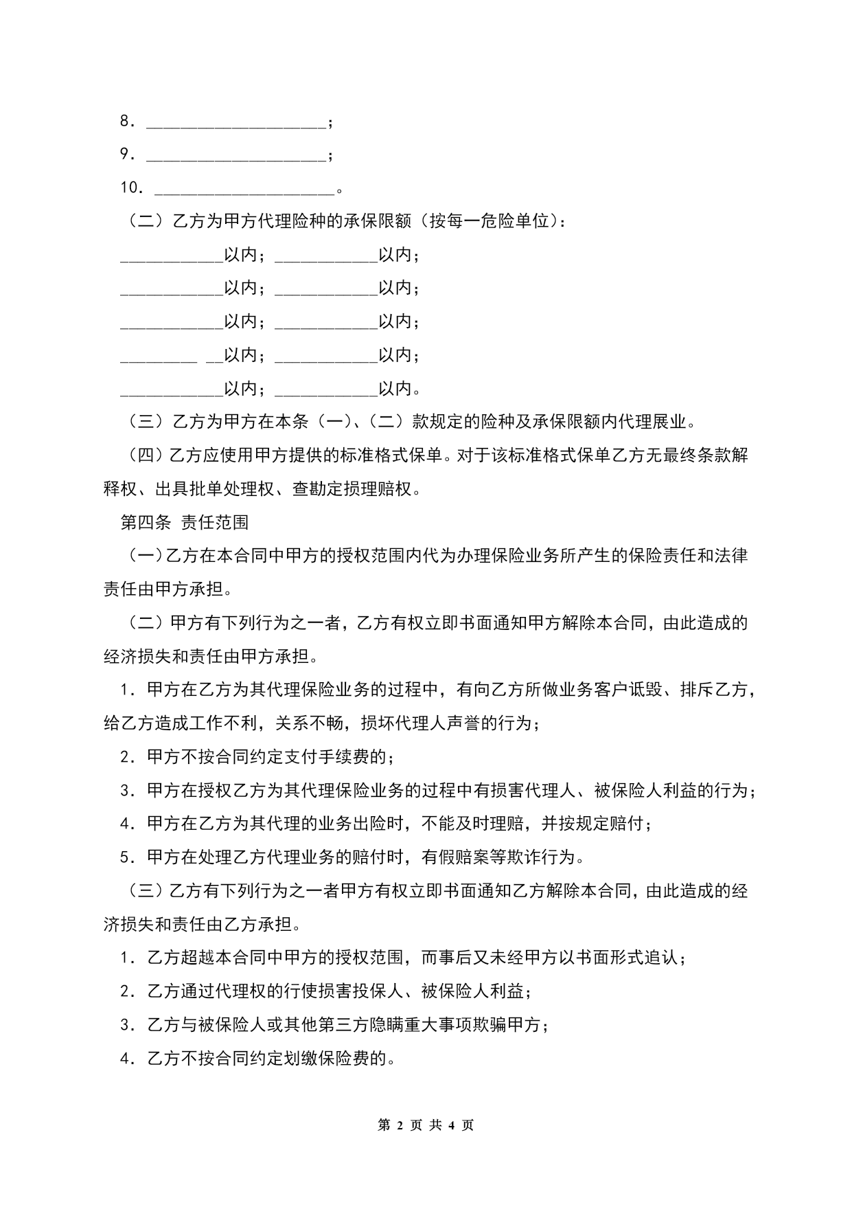 第PAGE\*MERGEFORMAT4页共NUMPAGES\*MERGEFORMAT4页保险代理合同保险代理合同保险代理合同合同编号:______________保险代理公司名称:_________________________地址:_____________________________________邮编:_____________________________________联系人:___________________________________电话:_____________________________________被代理方(以下简称甲方):_________________代理方(以下简称乙方):__________________根据《中华人民共和国保险法》和《保险代理人管理规定(试行)》及有关法规,甲乙双方经平等协商达成一致,签订本合同。第一条甲方委托乙方代理保险业务,乙方在甲方授权范围内,以甲方的名义为甲方代理保险业务。第二条代理地域范围乙方为甲方在甲方经营区域_________内代理保险业务。第三条代理业务范围(一)甲方授权乙方代理下列保险业务(按险种列明)1._____________________;2._____________________;3._____________________;4._____________________;5._____________________;6._____________________;7._____________________;8._____________________;9._____________________;10._____________________。(二)乙方为甲方代理险种的承保限额(按每一危险单位):____________以内;____________以内;____________以内;____________以内;____________以内;____________以内;___________以内;____________以内;____________以内;____________以内。(三)乙方为甲方在本条(一)、(二)款规定的险种及承保限额内代理展业。(四)乙方应使用甲方提供的标准格式保单。对于该标准格式保单乙方无最终条款解释权、出具批单处理权、查勘定损理赔权。第四条责任范围(一)乙方在本合同中甲方的授权范围内代为办理保险业务所产生的保险责任和法律责任由甲方承担。(二)甲方有下列行为之一者,乙方有权立即书面通知甲方解除本合同,由此造成的经济损失和责任由甲方承担。1.甲方在乙方为其代理保险业务的过程中,有向乙方所做业务客户诋毁、排斥乙方,给乙方造成工作不利,关系不畅,损坏代理人声誉的行为;2.甲方不按合同约定支付手续费的;3.甲方在授权乙方为其代理保险业务的过程中有损害代理人、被保险人利益的行为;4.甲方在乙方为其代理的业务出险时,不能及时理赔,并按规定赔付;5.甲方在处理乙方代理业务的赔付时,有假赔案等欺诈行为。(三)乙方有下列行为之一者甲方有权立即书面通知乙方解除本合同,由此造成的经济损失和责任由乙方承担。1.乙方超越本合同中甲方的授权范围,而事后又未经甲方以书面形式追认;2.乙方通过代理权的行使损害投保人、被保险人利益;3.乙方与被保险人或其他第三方隐瞒重大事项欺骗甲方;4.乙方不按合同约定划缴保险费的。第五条保险费的划缴方式和期限乙方在甲方出具保险单后________日内或收入款项达到________万元________币时将所收的保险费(保险储金)划缴甲方指定的银行账户:________________________________。第六条代理手续费支付标准和支付方式(一)甲方根据乙方实收保险费的数额及险种的不同,按国家财政部、保监会的规定支付代理手续费。1._____________%;2._____________%;3._____________%;4._____________%;5._____________%;6._____________%;7._____________%;8._____________%;9._____________%;10._____________%。(二)手续费按月(季)结算,并于每月(季)初___天内将代理手续费以转帐方式付给乙方。第七条双方的权利和义务(一)甲方的权利和义务1.甲方享有下列权利:(1)在签发保险单前,甲方对乙方在授权内范围代理的保险业务有最后确认权。(2)有权调整乙方所代理的财产保险的险种。(3)有权要求乙方为甲方保守商业秘密。(4)有权要求乙方在从事代理业务中遵守最大诚信原则,履行告知义务。2.甲方应尽