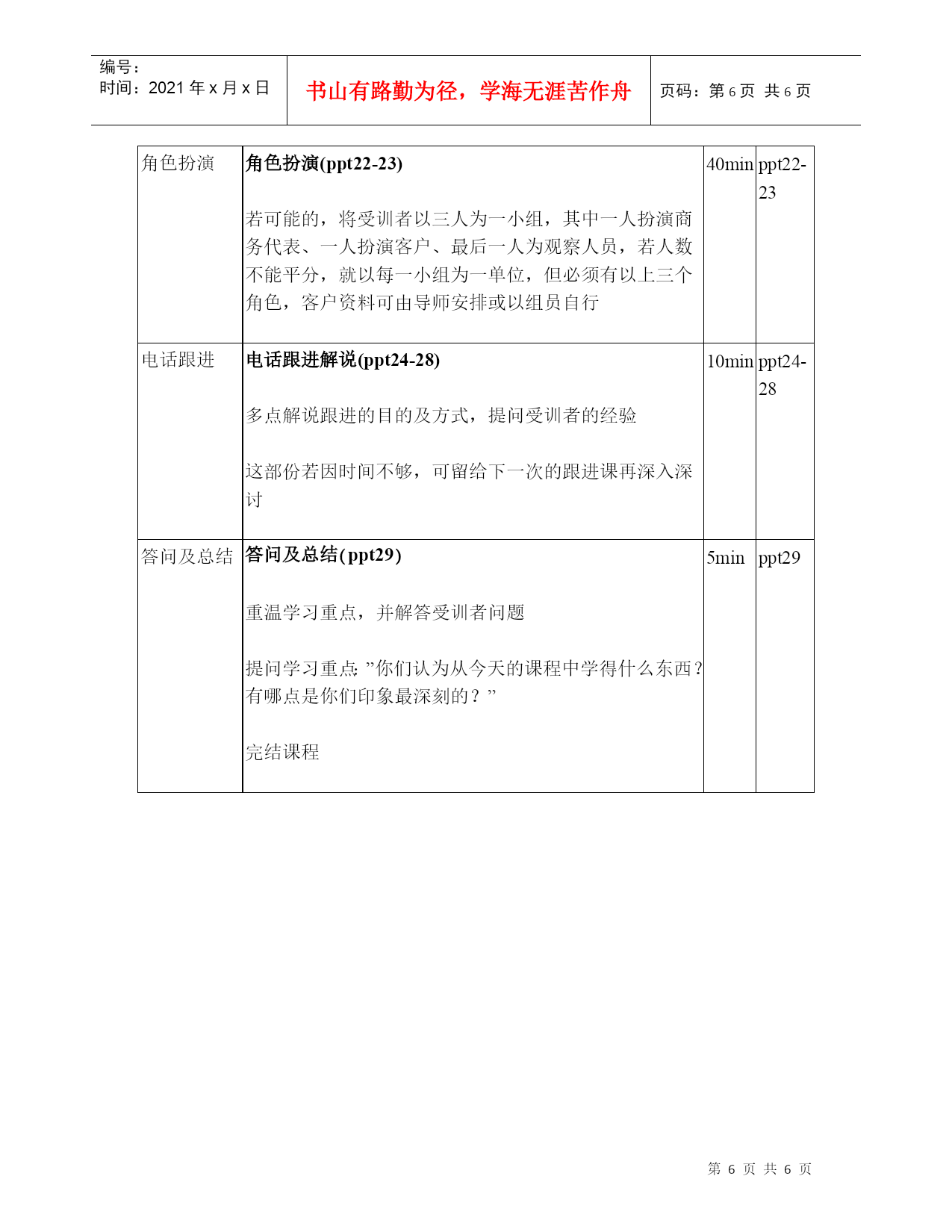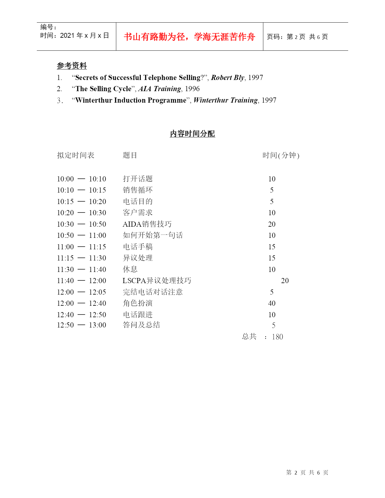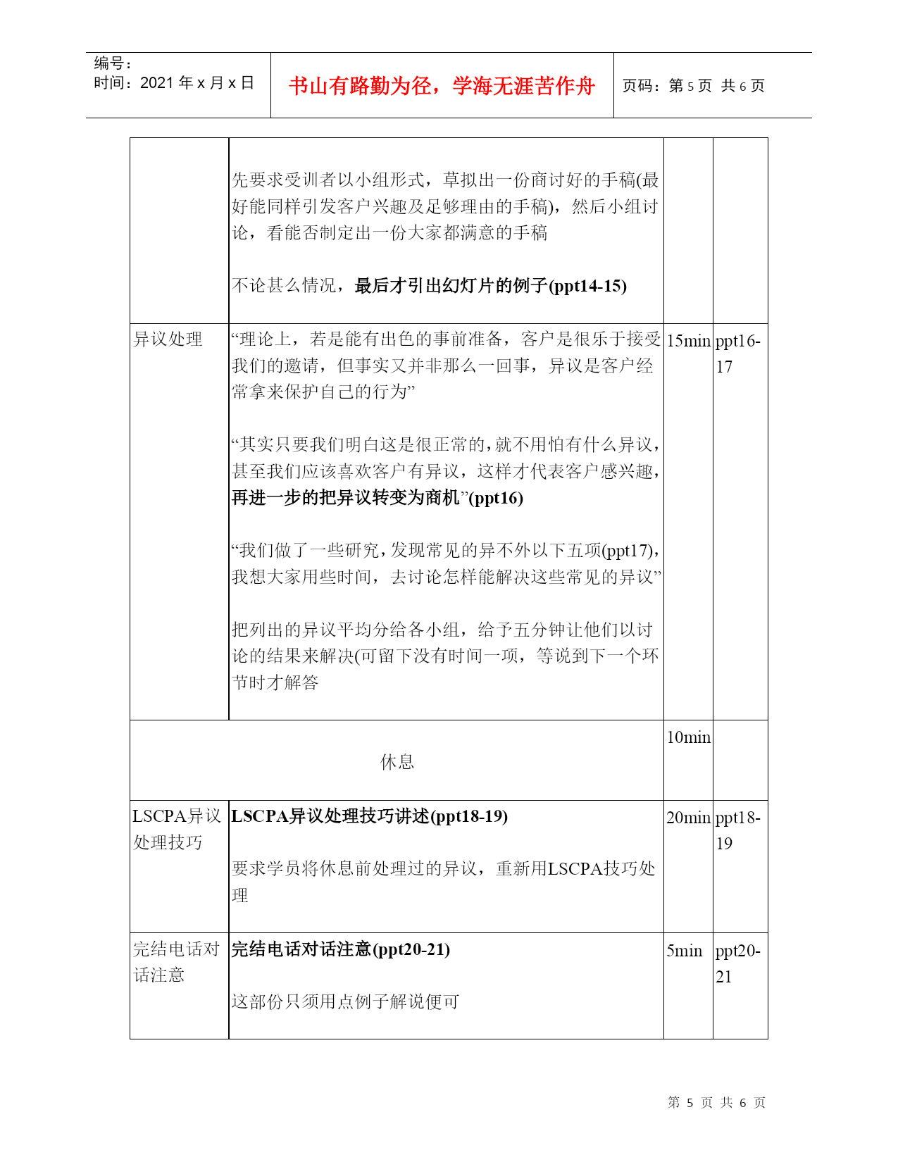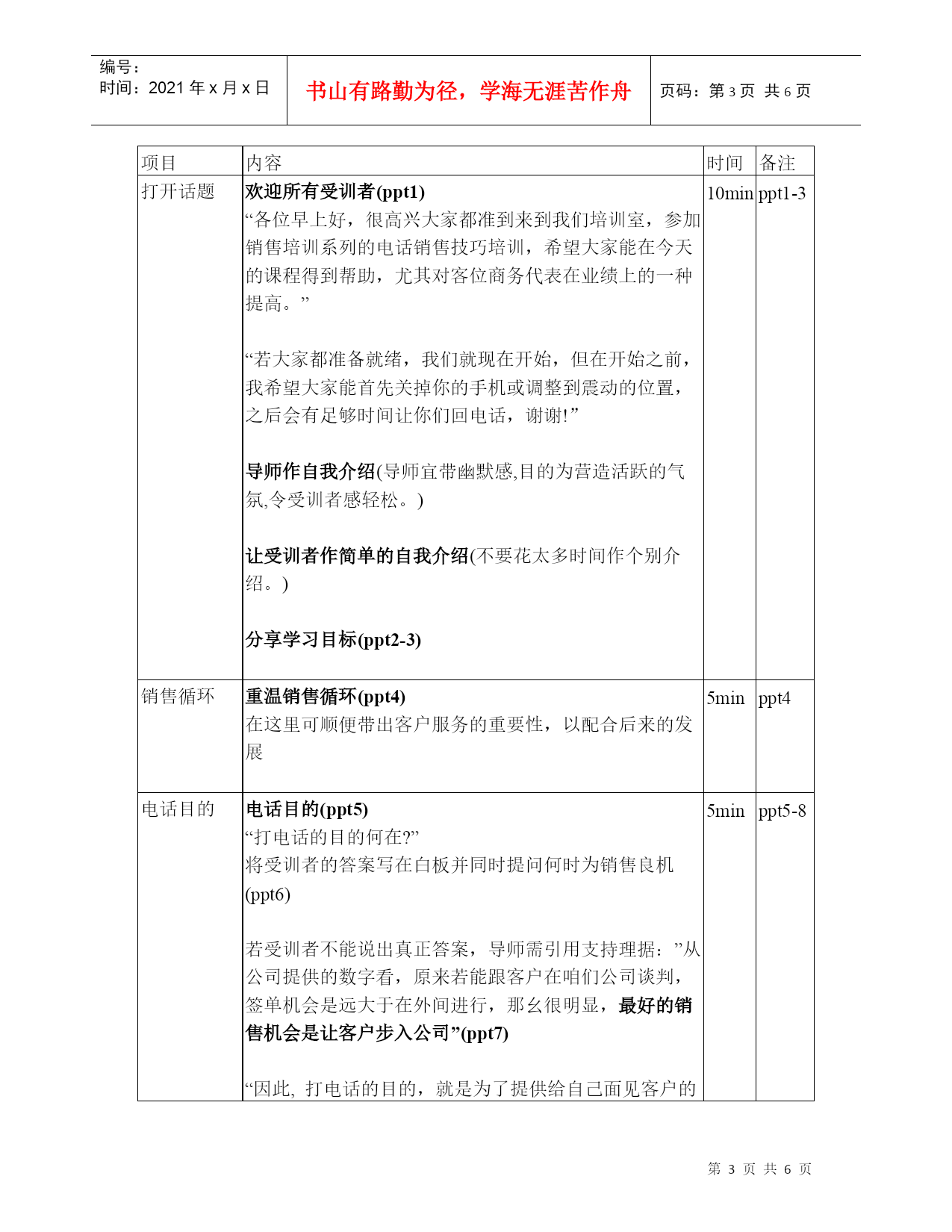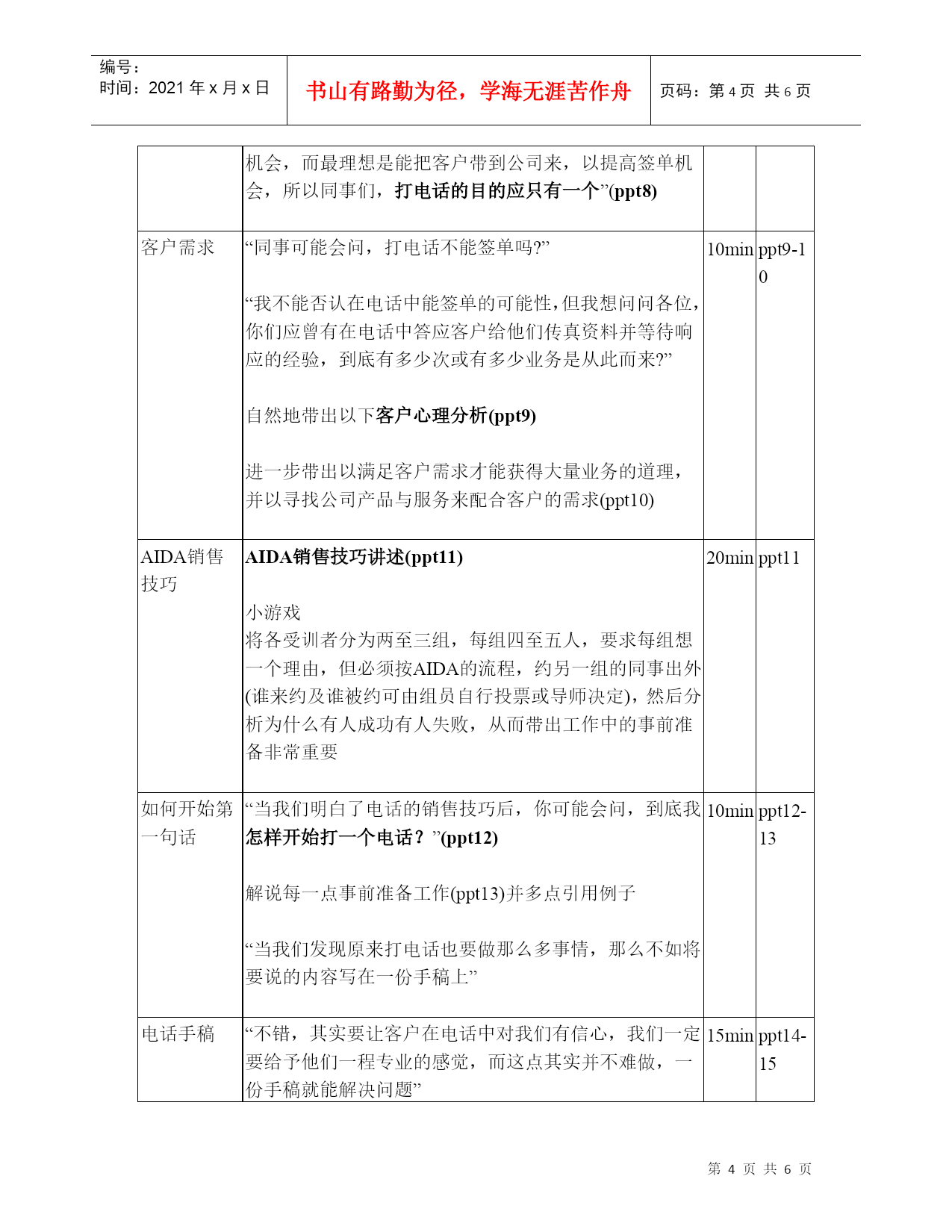 编号:时间:2021年x月x日书山有路勤为径,学海无涯苦作舟页码:第PAGE6页共NUMPAGES6页第PAGE\*MERGEFORMAT6页共NUMPAGES\*MERGEFORMAT6页电话销售技巧导师讲义培训重点‧让参与的商务代表能掌握一套标准而专业的商务电话技巧‧让商务代表有效的处理电话异议目的:1.概述电话对话基本原则2.探讨客户需求的重要性3.概述AIDA销售技巧4.讨论及练习电话流程的实际操作5.分析及制订电话手稿6.概述LSCPA异议处理法7.点出电话完结的注意项8.建议电话跟进的方法技巧使用小组讨论形式,将全数分为三或四组,每组各有三至五名受训者小组游戏角色扮演坐位编排沿四张小型长桌分为两排的鱼骨形编排培训所需的设施及器材1.电话销售技巧培训导师教材2.电话销售技巧幻灯片,3.电话销售技巧讲义(电话手稿),共一页4.投影器及屏幕5.白板及水写板笔三支(红、黑、篮)参考资料“SecretsofSuccessfulTelephoneSelling?”,RobertBly,1997“TheSellingCycle”,AIATraining,1996“WinterthurInductionProgramme”,WinterthurTraining,1997内容时间分配拟定时间表题目时间(分钟)10:00─10:10打开话题1010:10─10:15销售循环510:15─10:20电话目的510:20─10:30客户需求1010:30─10:50AIDA销售技巧2010:50─11:00如何开始第一句话1011:00─11:15电话手稿1511:15─11:30异议处理1511:30─11:40休息1011:40─12:00LSCPA异议处理技巧2012:00─12:05完结电话对话注意512:00─12:40角色扮演4012:40─12:50电话跟进1012:50─13:00答问及总结5总共:180项目内容时间备注打开话题欢迎所有受训者(ppt1)“各位早上好,很高兴大家都准到来到我们培训室,参加销售培训系列的电话销售技巧培训,希望大家能在今天的课程得到帮助,尤其对客位商务代表在业绩上的一种提高。”“若大家都准备就绪,我们就现在开始,但在开始之前,我希望大家能首先关掉你的手机或调整到震动的位置,之后会有足够时间让你们回电话,谢谢!”导师作自我介绍(导师宜带幽默感,目的为营造活跃的气氛,令受训者感轻松。)让受训者作简单的自我介绍(不要花太多时间作个别介绍。)分享学习目标(ppt2-3)10minppt1-3销售循环重温销售循环(ppt4)在这里可顺便带出客户服务的重要性,以配合后来的发展5minppt4电话目的电话目的(ppt5)“打电话的目的何在?”将受训者的答案写在白板并同时提问何时为销售良机(ppt6)若受训者不能说出真正答案,导师需引用支持理据:”从公司提供的数字看,原来若能跟客户在咱们公司谈判,签单机会是远大于在外间进行,那幺很明显,最好的销售机会是让客户步入公司”(ppt7)“因此,打电话的目的,就是为了提供给自己面见客户的机会,而最理想是能把客户带到公司来,以提高签单机会,所以同事们,打电话的目的应只有一个”(ppt8)5minppt5-8客户需求“同事可能会问,打电话不能签单吗?”“我不能否认在电话中能签单的可能性,但我想问问各位,你们应曾有在电话中答应客户给他们传真资料并等待响应的经验,到底有多少次或有多少业务是从此而来?”自然地带出以下客户心理分析(ppt9)进一步带出以满足客户需求才能获得大量业务的道理,并以寻找公司产品与服务来配合客户的需求(ppt10)10minppt9-10AIDA销售技巧AIDA销售技巧讲述(ppt11)小游戏将各受训者分为两至三组,每组四至五人,要求每组想一个理由,但必须按AIDA的流程,约另一组的同事出外(谁来约及谁被约可由组员自行投票或导师决定),然后分析为什么有人成功有人失败,从而带出工作中的事前准备非常重要20minppt11如何开始第一句话“当我们明白了电话的销售技巧后,你可能会问,到底我怎