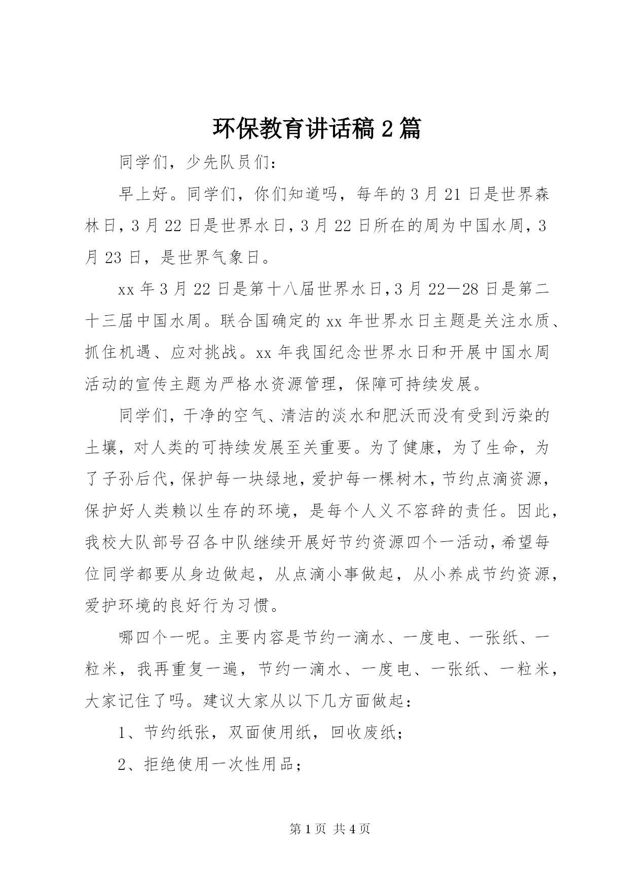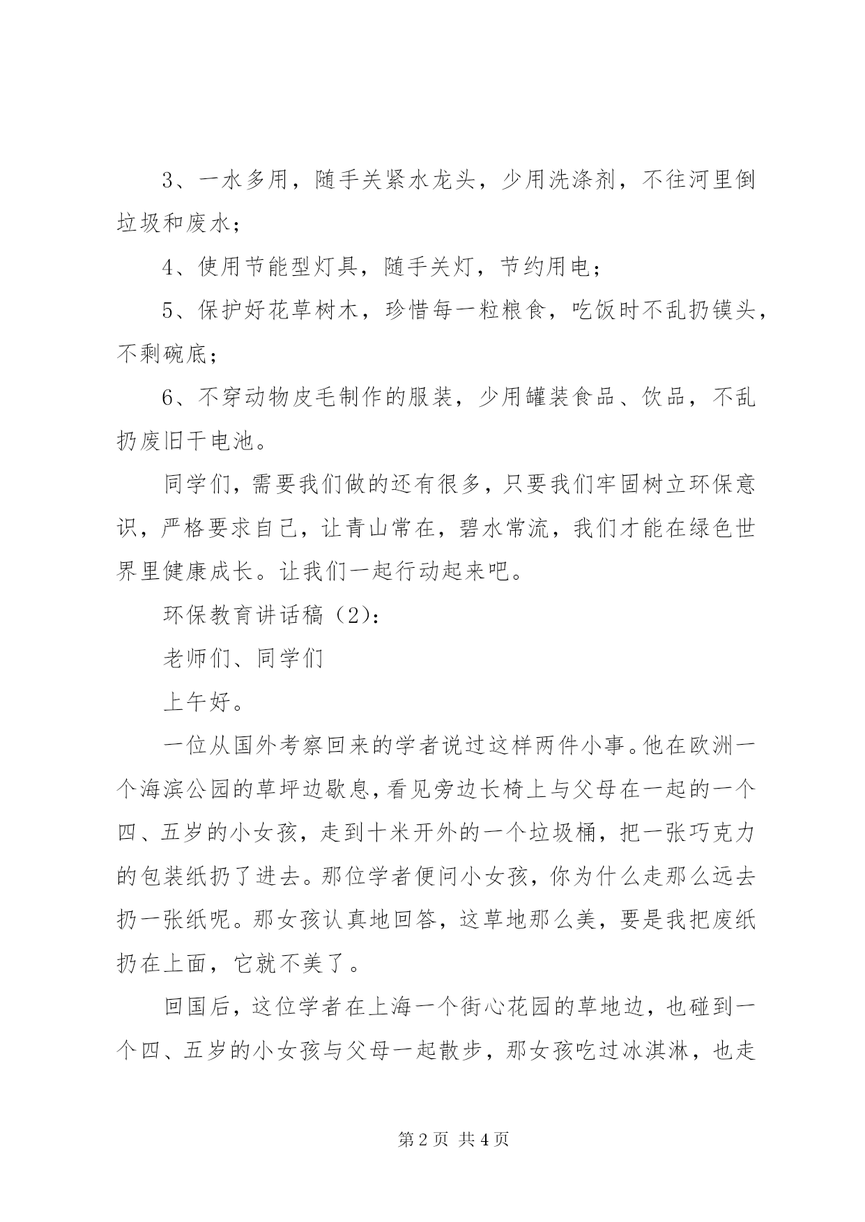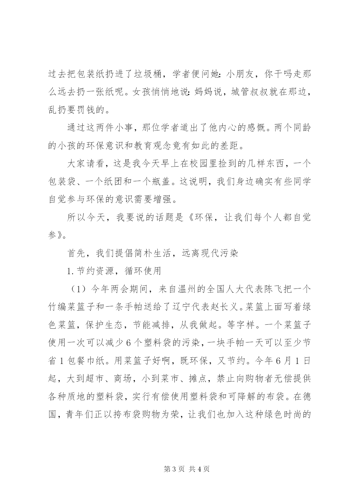 第PAGE\*Arabic\*MERGEFORMAT4页共NUMPAGES\*MERGEFORMAT4页环保教育讲话稿2篇同学们,少先队员们:早上好。同学们,你们知道吗,每年的3月21日是世界森林日,3月22日是世界水日,3月22日所在的周为中国水周,3月23日,是世界气象日。xx年3月22日是第十八届世界水日,3月22-28日是第二十三届中国水周。联合国确定的xx年世界水日主题是关注水质、抓住机遇、应对挑战。xx年我国纪念世界水日和开展中国水周活动的宣传主题为严格水资源管理,保障可持续发展。同学们,干净的空气、清洁的淡水和肥沃而没有受到污染的土壤,对人类的可持续发展至关重要。为了健康,为了生命,为了子孙后代,保护每一块绿地,爱护每一棵树木,节约点滴资源,保护好人类赖以生存的环境,是每个人义不容辞的责任。因此,我校大队部号召各中队继续开展好节约资源四个一活动,希望每位同学都要从身边做起,从点滴小事做起,从小养成节约资源,爱护环境的良好行为习惯。哪四个一呢。主要内容是节约一滴水、一度电、一张纸、一粒米,我再重复一遍,节约一滴水、一度电、一张纸、一粒米,大家记住了吗。建议大家从以下几方面做起:1、节约纸张,双面使用纸,回收废纸;2、拒绝使用一次性用品;3、一水多用,随手关紧水龙头,少用洗涤剂,不往河里倒垃圾和废水;4、使用节能型灯具,随手关灯,节约用电;5、保护好花草树木,珍惜每一粒粮食,吃饭时不乱扔镆头,不剩碗底;6、不穿动物皮毛制作的服装,少用罐装食品、饮品,不乱扔废旧干电池。同学们,需要我们做的还有很多,只要我们牢固树立环保意识,严格要求自己,让青山常在,碧水常流,我们才能在绿色世界里健康成长。让我们一起行动起来吧。环保教育讲话稿(2):老师们、同学们上午好。一位从国外考察回来的学者说过这样两件小事。他在欧洲一个海滨公园的草坪边歇息,看见旁边长椅上与父母在一起的一个四、五岁的小女孩,走到十米开外的一个垃圾桶,把一张巧克力的包装纸扔了进去。那位学者便问小女孩,你为什么走那么远去扔一张纸呢。那女孩认真地回答,这草地那么美,要是我把废纸扔在上面,它就不美了。回国后,这位学者在上海一个街心花园的草地边,也碰到一个四、五岁的小女孩与父母一起散步,那女孩吃过冰淇淋,也走过去把包装纸扔进了垃圾桶,学者便问她:小朋友,你干吗走那么远去扔一张纸呢。女孩悄悄地说:妈妈说,城管叔叔就在那边,乱扔要罚钱的。通过这两件小事,那位学者道出了他内心的感慨。两个同龄的小孩的环保意识和教育观念竟有如此的差距。大家请看,这是我今天早上在校园里捡到的几样东西,一个包装袋、一个纸团和一个瓶盖。这说明,我们身边确实有些同学自觉参与环保的意识需要增强。所以今天,我要说的话题是《环保,让我们每个人都自觉参》。首先,我们提倡简朴生活,远离现代污染1.节约资源,循环使用(1)今年两会期间,来自温州的全国人大代表陈飞把一个竹编菜篮子和一条手帕送给了辽宁代表赵长义。菜篮上面写着绿色菜篮,保护生态,节能减排,从我做起。等字样。一个菜篮子使用一次可以减少6个塑料袋的污染,一块手帕一天可以至少节省1包餐巾纸。用菜篮子好啊,既环保,又节约。今年6月1日起,大到超市、商场,小到菜市、摊点,禁止向购物者无偿提供各种质地的塑料袋,实行有偿使用塑料袋和可降解的布袋。在德国,青年们正以挎布袋购物为荣,让我们也加入这种绿色时尚的行列中来吧。