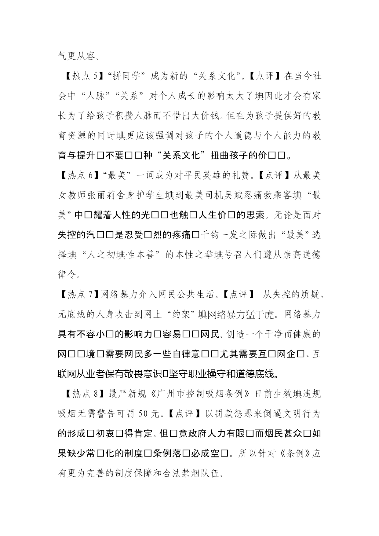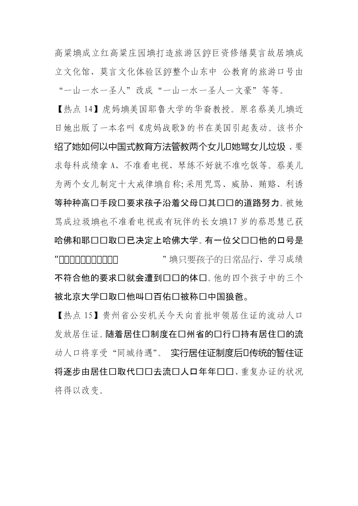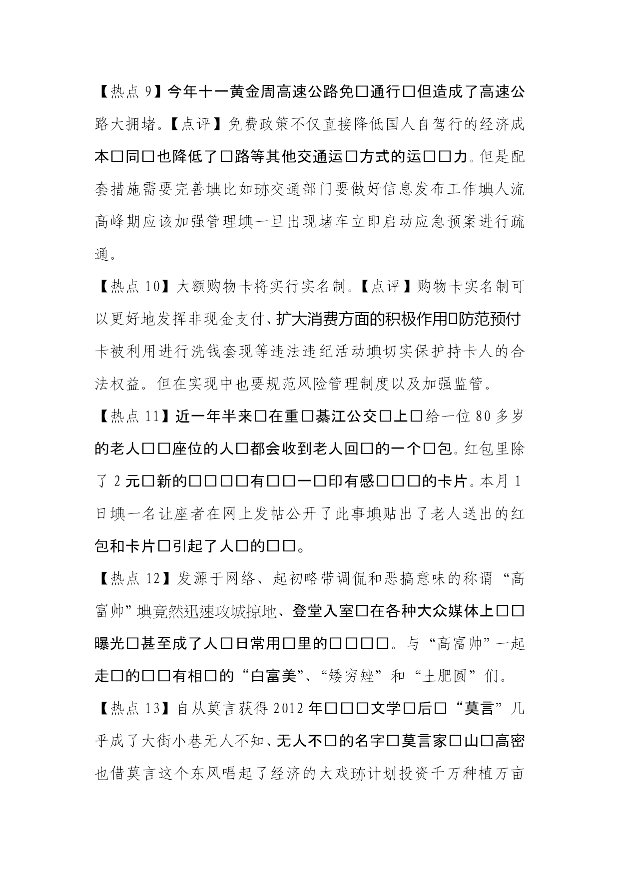 2013年公务员面试热点15个【热点1】最近在微博上流行一个词叫做“中国式过马路”就是凑够一撮人就可以走了跟红绿灯是没有关系的。【点评】交通规则的制定目的就在于服务于城市管理方便行人。而“中国式过马路”是对我国法治化进程的严重阻碍体现了国人规则意识的淡薄必须加强宣传教育对违法违规者加以严厉处罚。【热点2】“元芳你怎么看”是狄仁杰对李元芳常说的一句话回答是“大人此事必有蹊跷”。这些语言最近很火网友万事皆问“元芳”使狄仁杰成为被网友调侃的对象。【点评】元芳的走红说明我们的政务信息还不够公开透明民众对于权威的说法还不够信任。【热点3】十一黄金周期间著名景区以及公园每日垃圾处理量较平日翻倍增长。环卫工感叹游客别随地扔垃圾我们就能省很多力气。【点评】维护公共环境的迫切性凸显提高国民素质、呼吁文明出游的必要性。但公共环境的治理不仅需要私德同时也需要必要的治理手段。比如增加垃圾箱景区接待力预警等等。【热点4】今年年底之前全国美术馆、公共图书馆、文化馆(文化站)将全部实现向公众免费开放。【点评】此举必定会滋养民众的心灵进而激发出人们的创造力创作出更加灿烂的文艺成果。在实施过程中要注意经费保障不能打马虎眼避免重建馆轻管理要培养文化艺术人才。这样我们面对未来会更有底气更从容。【热点5】“拼同学”成为新的“关系文化”。【点评】在当今社会中“人脉”“关系”对个人成长的影响太大了因此才会有家长为了给孩子积攒人脉而不惜出大价钱。但在为孩子提供好的教育资源的同时更应该强调对孩子的个人道德与个人能力的教育与提升不要让这种“关系文化”扭曲孩子的价值观。【热点6】“最美”一词成为对平民英雄的礼赞。【点评】从最美女教师张丽莉舍身护学生到最美司机吴斌忍痛救乘客“最美”中闪耀着人性的光辉也触发人生价值的思索。无论是面对失控的汽车还是忍受剧烈的疼痛千钧一发之际做出“最美”选择“人之初性本善”的本性之举号召人们遵从崇高道德律令。【热点7】网络暴力介入网民公共生活。【点评】从失控的质疑、无底线的人身攻击到网上“约架”网络暴力猛于虎。网络暴力具有不容小觑的影响力容易误导网民。创造一个干净而健康的网络环境需要网民多一些自律意识尤其需要互联网企业、互联网从业者保有敬畏意识坚守职业操守和道德底线。【热点8】最严新规《广州市控制吸烟条例》日前生效违规吸烟无需警告可罚50元。【点评】以罚款惩恶来倒逼文明行为的形成初衷值得肯定。但毕竟政府人力有限而烟民甚众如果缺少常态化的制度条例落实必成空谈。所以针对《条例》应有更为完善的制度保障和合法禁烟队伍。【热点9】今年十一黄金周高速公路免费通行但造成了高速公路大拥堵。【点评】免费政策不仅直接降低国人自驾行的经济成本同时也降低了铁路等其他交通运输方式的运载压力。但是配套措施需要完善比如交通部门要做好信息发布工作人流高峰期应该加强管理一旦出现堵车立即启动应急预案进行疏通。【热点10】大额购物卡将实行实名制。【点评】购物卡实名制可以更好地发挥非现金支付、扩大消费方面的积极作用防范预付卡被利用进行洗钱套现等违法违纪活动切实保护持卡人的合法权益。但在实现中也要规范风险管理制度以及加强监管。【热点11】近一年半来在重庆綦江公交车上给一位80多岁的老人让过座位的人都会收到老人回赠的一个红包。红包里除了2元崭新的纸币还有这样一张印有感谢话语的卡片。本月1日一名让座者在网上发帖公开了此事贴出了老人送出的红包和卡片引起了人们的热议。【热点12】发源于网络、起初略带调侃和恶搞意味的称谓“高富帅”竟然迅速攻城掠地、登堂入室在各种大众媒体上频频曝光甚至成了人们日常用语里的热门词汇。与“高富帅”一起走红的还有相应的“白富美”、“矮穷矬”和“土肥圆”们。【热点13】自从莫言获得2012年诺贝尔文学奖后“莫言”几乎成了大街小巷无人不知、无人不晓的名字莫言家乡山东高密也借莫言这个东风唱起了经济的大戏计划投资千万种植万亩高粱成立红高粱庄园打造旅游区巨资修缮莫言故居成立文化馆、莫言文化体验区整个山东中公教育的旅游口号由“一山一水一圣人”改成“一山一水一圣人一文豪”等等。【热点14】虎妈美国耶鲁大学的华裔教授。原名蔡美儿近日她出版了一本名叫《虎妈战歌》的书在美国引起轰动。该书介绍了她如何以中国式教育方法管教两个女儿她骂女儿垃圾、要求每科成绩拿A、不准看电视、琴练不好就不准吃饭等。蔡美儿为两个女儿制定十大戒律自称;采用咒骂、威胁、贿赂、利诱等种种高压手段要求孩子沿着父母为其选择的道路努力。被她骂成垃圾也不准看电视或有玩伴的长女17岁的蔡思慧已获哈佛和耶鲁录取已决定上哈佛大学。有一位父亲他的口号是“三