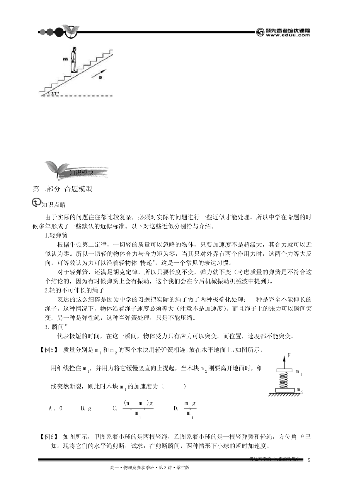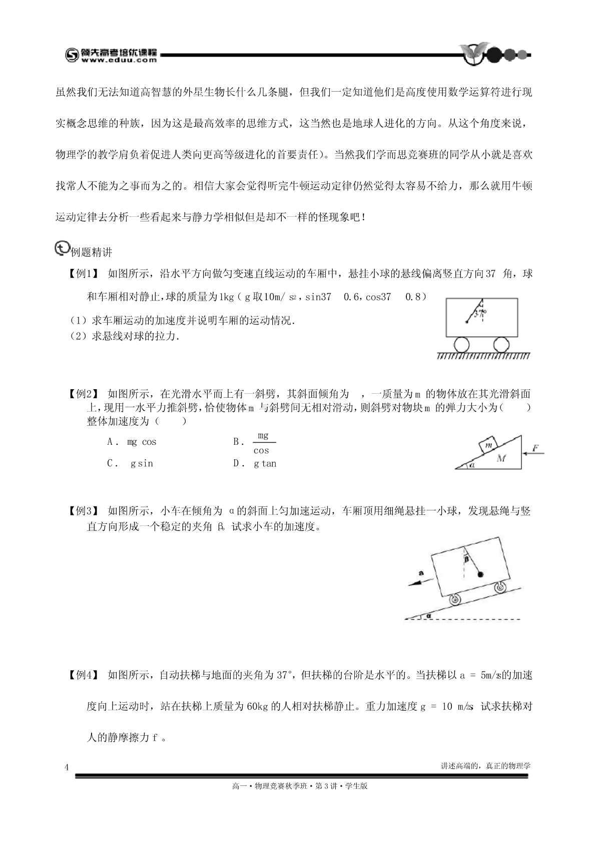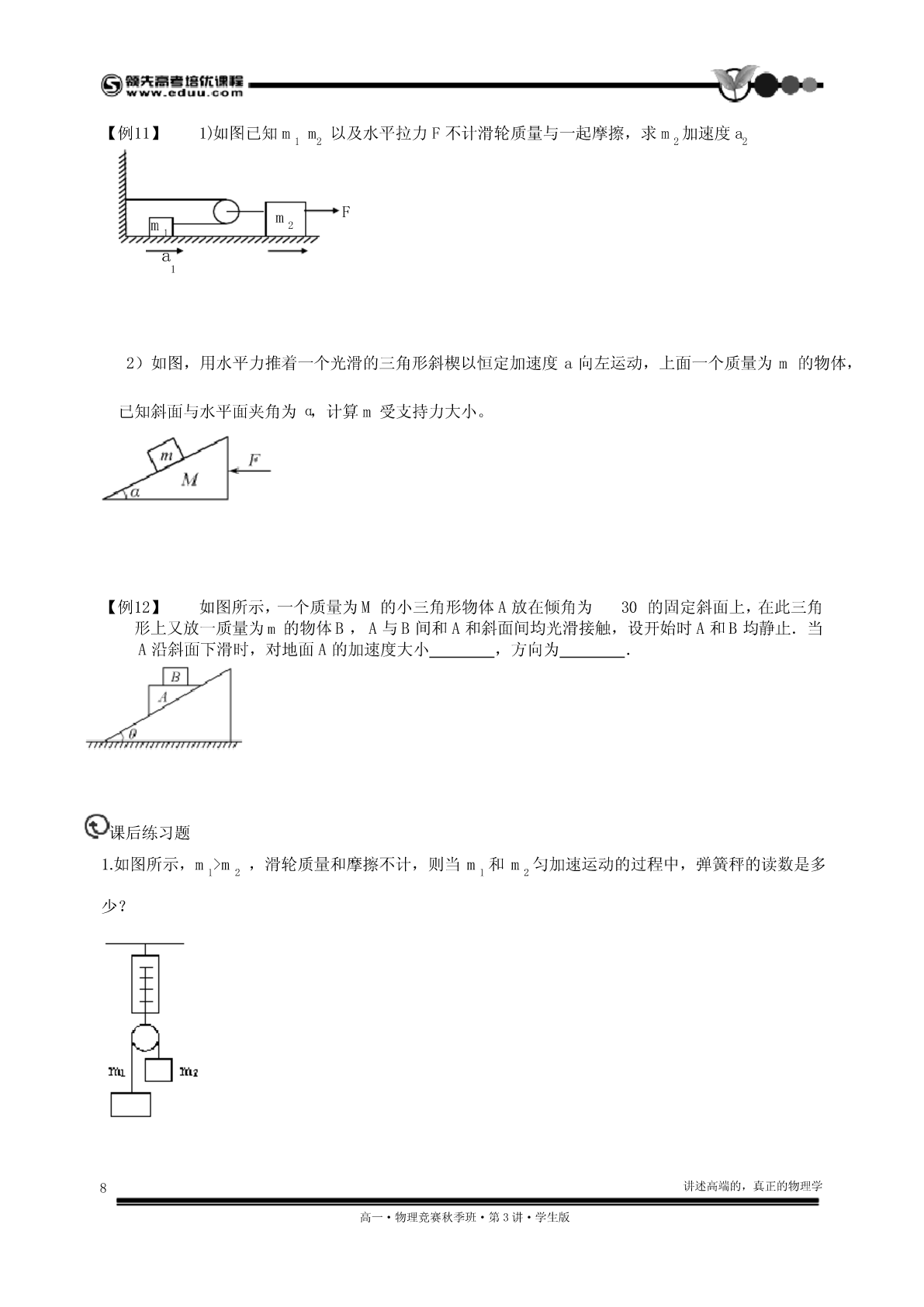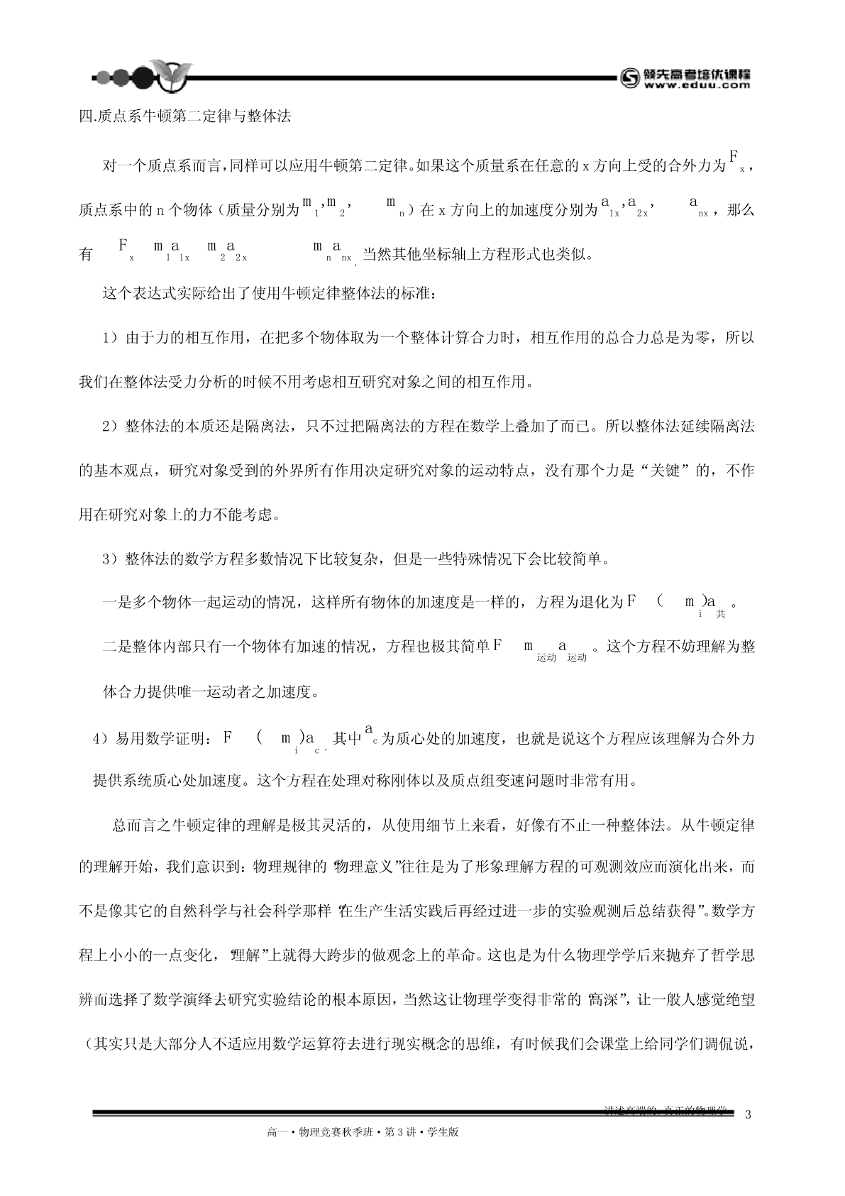 第3讲牛顿运动定律本讲导学1.牛顿定律是讨论力与运动关系的理论,所以本讲的难点在于处理力矢量与运动矢量的关系。2.由于初中与高考范围内对力学的教学很容易导致一些思维定势,所以刚开始的时候我们要检讨以前在静力学中看起来很自然的结论成立的条件是什么,到了新情景中是否还成立。3.“力可以传递”不是个很靠谱的理论,希望同学们学习本章不要满足于知道了某些题怎么做就成,一定要想明白每一步的严格理由。知识模块第一部分牛顿定律知识点睛一.牛顿第一定律任何物体都保持静止或匀速直线运动状态,直到其他物体所作用的力迫使它改变这种状态为止。这是牛顿第一定律的内容。牛顿第一定律是质点动力学的出发点。关于牛顿第一定律的理解:牛顿第一定律告诉了我们计算平衡态物体力的一个标准,那就是合力为零。在中学的教学中,由于对矢量运算格式要求不严格,所以经常把一对平衡力书写成“F=F”(严格的方程应该是F+F=0),老师们1212形象的就把这个等式解释为“相抵”,所以大家现在应该了解所谓“力可以相抵”实际是相反的力在求和过程中的形象理解而已,而不是从奥特曼冲击波与怪兽冲击波对冲现象中归纳出来牛顿定律补充。二.牛顿第二定律一个物体如果做变速运动,其加速度跟所受外力成正比,跟物体的质量成反比,加速度的方向跟外力的方向相同Fa或Fma数学表达式:m牛顿第二定律的方程是典型的矢量方程,所以有很多的数学变换,这里就不做推导,这里直接给出数学讲述高端的,真正的物理学1高一·物理竞赛秋季班·第3讲·学生版表达的理解:1)牛顿第二定律不仅揭示了物体的加速度跟它所受的合外力之间的数量关系,而且揭示了加速度方向总与合外力的方向一致的矢量关系。大家注意等式应该理解为“提供”,而不要把ma当成一个实际的力与其他力去“相抵”了。2)公式中的F可以指某个力,那么等式右边的a为此力题产生的加速F度,实际物体运动的加速度为各个力提供加速度矢量合。这个理解方式比2Faa较适合用于少量力作用下物体变速运动的问题,尤其是一些力提供的加速2aF11度已知的情况下(比如重力提供的加速度为g,重力沿斜面分力提供加速度gsinθ等)。3)F也可以只所有外力的合力,那么a就是实际的加速度,或者某个方向上的合力,这样就会出来牛顿定律的分量式FmaFmaxx且yy以上方程给出了牛顿定律与坐标系结合的使用标准:如果我们建立坐标系,那么力与运动都可以向着坐标系分解,通常复杂的题力与加速度都得分解,再分别在每个坐标轴上进行计算。不过如果受力少,而且物体做直线运动,我们不妨沿着速度与垂直速度方向分解,这样在垂直速度方向,合力必然为零,方程会变得简单些。当然,我们的尽量让坐标轴上的物理量越多越好,而且尽量不分解未知力。三.牛顿第三定律两个物体之间的作用力与反作用力总是大小相等,方向相反,作用在一条直线上。数学表达式:FF注意这个理论对于平衡与非平衡的物体都是可以适用的,要和平衡力的观点区分出来。理解:牛顿第三定律实际是消灭了“力具有传递性”这个江湖理论,也给出了力具有相互性的公设(牛顿第三定律的实质是因为动量守恒,这个我们以后会讲到)。2讲述高端的,真正的物理学高一·物理竞赛秋季班·第3讲·学生版四.质点系牛顿第二定律与整体法F对一个质点系而言,同样可以应用牛顿第二定律。如果这个质量系在任意的x方向上受的合外力为x,m,m,ma,a,a质点系中的n个物体(质量分别为12n)在x方向上的加速度分别为1x2xnx,那么Fmamama有x11x22xnnx当然其他坐标轴上方程形式也类似。,这个表达式实际给出了使用牛顿定律整体法的标准:1)由于力的相互作用,在把多个物体取为一个整体计算合力时,相互作用的总合力总是为零,所以我们在整体法受力分析的时候不用考虑相互研究对象之间的相互作用。2)整体法的本质还是隔离法,只不过把隔离法的方程在数学上叠加了而已。所以整体法延续隔离法的基本观点,研究对象受到的外界所有作用决定研究对象的运动特点,没有那个力是“关键”的,不作用在研究对象上的力不能考虑。3)整体法的数学方程多数情况下比较复杂,但是一些特殊情况下会比较简单。一是多个物体一起运动的情况,这样所有物体的加速度是一样的,方程为退化为F(m)a。i共二是整体内部只有一个物体有加速的情况,方程也极其简单Fma。这个方程不妨理解为整运动运动体合力提供唯一运动者之加速度。a4)易用数学证明:F(m)a其中c为质心处的加速度,