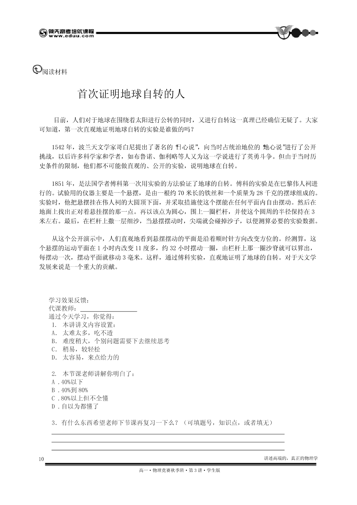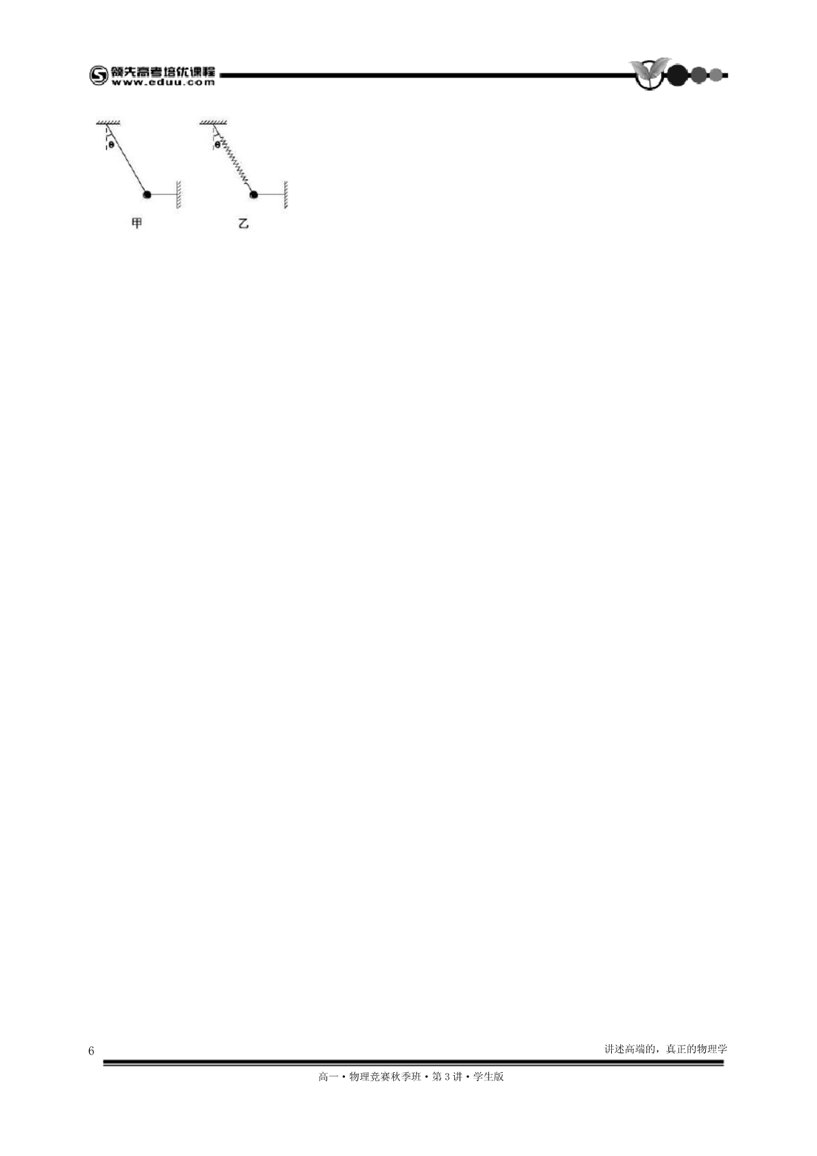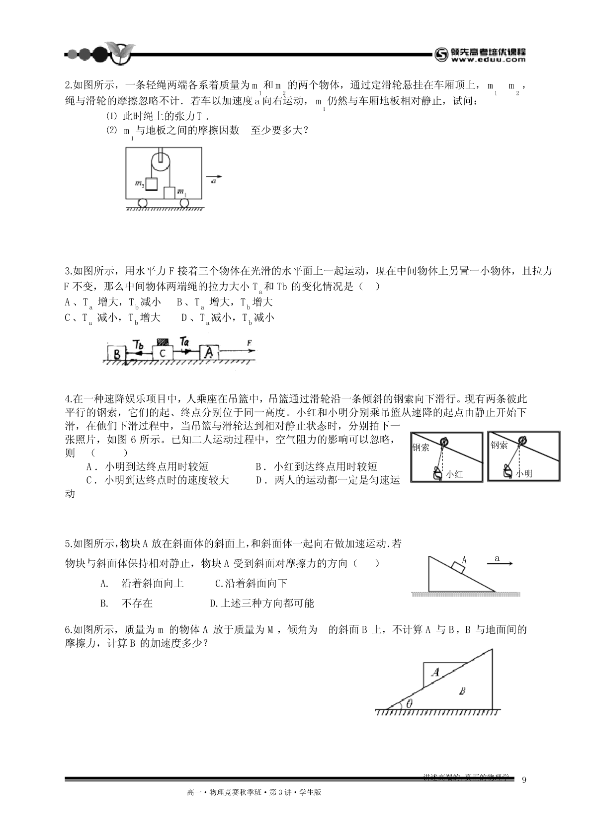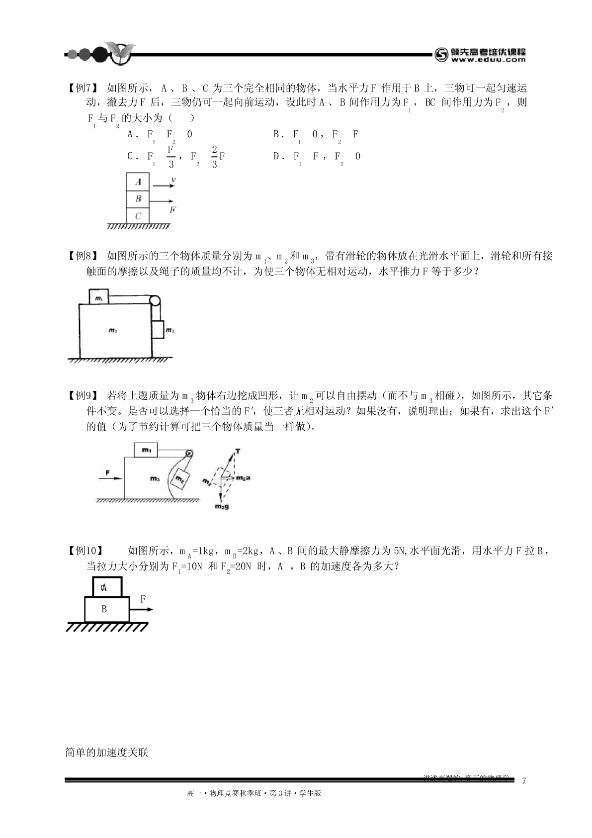 第3讲牛顿运动定律本讲导学1.牛顿定律是讨论力与运动关系的理论,所以本讲的难点在于处理力矢量与运动矢量的关系。2.由于初中与高考范围内对力学的教学很容易导致一些思维定势,所以刚开始的时候我们要检讨以前在静力学中看起来很自然的结论成立的条件是什么,到了新情景中是否还成立。3.“力可以传递”不是个很靠谱的理论,希望同学们学习本章不要满足于知道了某些题怎么做就成,一定要想明白每一步的严格理由。知识模块第一部分牛顿定律知识点睛一.牛顿第一定律任何物体都保持静止或匀速直线运动状态,直到其他物体所作用的力迫使它改变这种状态为止。这是牛顿第一定律的内容。牛顿第一定律是质点动力学的出发点。关于牛顿第一定律的理解:牛顿第一定律告诉了我们计算平衡态物体力的一个标准,那就是合力为零。在中学的教学中,由于对矢量运算格式要求不严格,所以经常把一对平衡力书写成“F=F”(严格的方程应该是F+F=0),老师们1212形象的就把这个等式解释为“相抵”,所以大家现在应该了解所谓“力可以相抵”实际是相反的力在求和过程中的形象理解而已,而不是从奥特曼冲击波与怪兽冲击波对冲现象中归纳出来牛顿定律补充。二.牛顿第二定律一个物体如果做变速运动,其加速度跟所受外力成正比,跟物体的质量成反比,加速度的方向跟外力的方向相同Fa或Fma数学表达式:m牛顿第二定律的方程是典型的矢量方程,所以有很多的数学变换,这里就不做推导,这里直接给出数学讲述高端的,真正的物理学1高一·物理竞赛秋季班·第3讲·学生版表达的理解:1)牛顿第二定律不仅揭示了物体的加速度跟它所受的合外力之间的数量关系,而且揭示了加速度方向总与合外力的方向一致的矢量关系。大家注意等式应该理解为“提供”,而不要把ma当成一个实际的力与其他力去“相抵”了。2)公式中的F可以指某个力,那么等式右边的a为此力题产生的加速F度,实际物体运动的加速度为各个力提供加速度矢量合。这个理解方式比2Faa较适合用于少量力作用下物体变速运动的问题,尤其是一些力提供的加速2aF11度已知的情况下(比如重力提供的加速度为g,重力沿斜面分力提供加速度gsinθ等)。3)F也可以只所有外力的合力,那么a就是实际的加速度,或者某个方向上的合力,这样就会出来牛顿定律的分量式FmaFmaxx且yy以上方程给出了牛顿定律与坐标系结合的使用标准:如果我们建立坐标系,那么力与运动都可以向着坐标系分解,通常复杂的题力与加速度都得分解,再分别在每个坐标轴上进行计算。不过如果受力少,而且物体做直线运动,我们不妨沿着速度与垂直速度方向分解,这样在垂直速度方向,合力必然为零,方程会变得简单些。当然,我们的尽量让坐标轴上的物理量越多越好,而且尽量不分解未知力。三.牛顿第三定律两个物体之间的作用力与反作用力总是大小相等,方向相反,作用在一条直线上。数学表达式:FF注意这个理论对于平衡与非平衡的物体都是可以适用的,要和平衡力的观点区分出来。理解:牛顿第三定律实际是消灭了“力具有传递性”这个江湖理论,也给出了力具有相互性的公设(牛顿第三定律的实质是因为动量守恒,这个我们以后会讲到)。2讲述高端的,真正的物理学高一·物理竞赛秋季班·第3讲·学生版四.质点系牛顿第二定律与整体法F对一个质点系而言,同样可以应用牛顿第二定律。如果这个质量系在任意的x方向上受的合外力为x,m,m,ma,a,a质点系中的n个物体(质量分别为12n)在x方向上的加速度分别为1x2xnx,那么Fmamama有x11x22xnnx当然其他坐标轴上方程形式也类似。,这个表达式实际给出了使用牛顿定律整体法的标准:1)由于力的相互作用,在把多个物体取为一个整体计算合力时,相互作用的总合力总是为零,所以我们在整体法受力分析的时候不用考虑相互研究对象之间的相互作用。2)整体法的本质还是隔离法,只不过把隔离法的方程在数学上叠加了而已。所以整体法延续隔离法的基本观点,研究对象受到的外界所有作用决定研究对象的运动特点,没有那个力是“关键”的,不作用在研究对象上的力不能考虑。3)整体法的数学方程多数情况下比较复杂,但是一些特殊情况下会比较简单。一是多个物体一起运动的情况,这样所有物体的加速度是一样的,方程为退化为F(m)a。i共二是整体内部只有一个物体有加速的情况,方程也极其简单Fma。这个方程不妨理解为整运动运动体合力提供唯一运动者之加速度。a4)易用数学证明:F(m)a其中c为质心处的加速度,