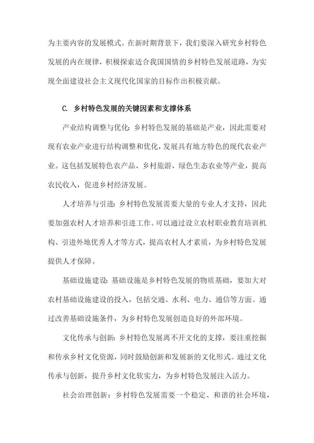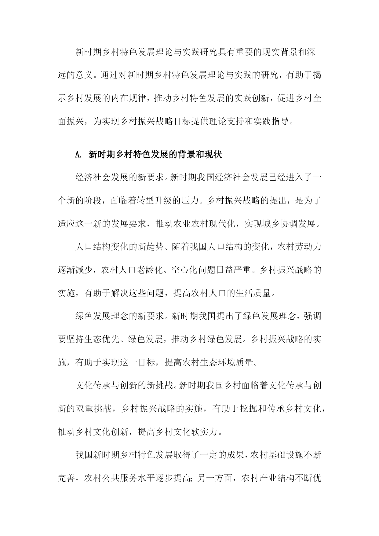 新时期乡村特色发展理论与实践初探一、研究背景与意义随着我国经济社会的快速发展,乡村振兴战略已成为国家发展的重要支柱。新时期乡村特色发展理论与实践研究,旨在深入分析乡村发展的内在规律,探讨新时代乡村特色发展的有效路径,为实现乡村振兴战略目标提供理论支持和实践指导。研究背景是新时期乡村特色发展的现实需求,我国乡村面临着产业结构单生态环境恶化、基础设施落后、人口流失等问题,亟待寻求新的发展模式和路径。通过深入研究新时期乡村特色发展理论与实践,有助于揭示乡村发展的内在规律,为乡村特色发展提供科学依据。研究意义在于推动乡村特色发展的实践创新,新时期乡村特色发展理论与实践研究,将有助于丰富和发展乡村发展战略理论体系,为乡村特色发展提供理论指导。研究成果可以为地方政府和相关部门制定政策提供参考,推动乡村特色发展的实践创新。研究意义还在于促进乡村全面振兴,新时期乡村特色发展理论与实践研究,将有助于提高乡村发展的质量和效益,实现乡村经济、文化、生态、民生等多方面的全面振兴。这对于实现全面建设社会主义现代化国家的目标具有重要意义。新时期乡村特色发展理论与实践研究具有重要的现实背景和深远的意义。通过对新时期乡村特色发展理论与实践的研究,有助于揭示乡村发展的内在规律,推动乡村特色发展的实践创新,促进乡村全面振兴,为实现乡村振兴战略目标提供理论支持和实践指导。A.新时期乡村特色发展的背景和现状经济社会发展的新要求。新时期我国经济社会发展已经进入了一个新的阶段,面临着转型升级的压力。乡村振兴战略的提出,是为了适应这一新的发展要求,推动农业农村现代化,实现城乡协调发展。人口结构变化的新趋势。随着我国人口结构的变化,农村劳动力逐渐减少,农村人口老龄化、空心化问题日益严重。乡村振兴战略的实施,有助于解决这些问题,提高农村人口的生活质量。绿色发展理念的新要求。新时期我国提出了绿色发展理念,强调要坚持生态优先、绿色发展,推动乡村绿色发展。乡村振兴战略的实施,有助于实现这一目标,提高农村生态环境质量。文化传承与创新的新挑战。新时期我国乡村面临着文化传承与创新的双重挑战,乡村振兴战略的实施,有助于挖掘和传承乡村文化,推动乡村文化创新,提高乡村文化软实力。我国新时期乡村特色发展取得了一定的成果,农村基础设施不断完善,农村公共服务水平逐步提高;另一方面,农村产业结构不断优化,农村经济发展活力得到激发。与发达国家相比,我国新时期乡村特色发展仍存在一定的差距,主要表现在以下几个方面:农村基础设施建设滞后。虽然近年来我国农村基础设施建设取得了显著成果,但与发达国家相比仍有较大差距,特别是在交通、水利、能源等方面。农村产业结构调整不够充分。当前我国农村产业结构仍以第一产业为主,第二产业和第三产业发展相对滞后。这导致了农村经济发展的内生动力不足,难以实现可持续发展。农村人才培养和引进机制不健全。新时期乡村特色发展需要大量高素质的人才支持,但目前我国农村人才培养和引进机制尚不健全,人才流失问题较为严重。农村生态环境保护亟待加强。虽然近年来我国农村生态环境保护取得了一定成效,但与发达国家相比仍有较大差距,特别是在水土流失、土壤污染等方面。新时期乡村特色发展是我国经济社会发展的重要任务,要实现这一目标,需要从加大基础设施建设投入、优化产业结构、加强人才培养和引进、加强生态环境保护等方面入手,全面推进乡村振兴战略的实施。B.研究乡村特色发展的意义和价值随着我国经济社会的快速发展,乡村振兴战略已经成为国家发展的重要方向。新时期乡村特色发展理论与实践初探,旨在深入研究乡村特色发展的内涵、特点、路径和方法,为推动我国乡村全面振兴提供理论支持和实践指导。研究乡村特色发展具有重要的现实意义,我国农村面临着产业结构单基础设施落后、生态环境恶化等问题,这些问题制约了乡村经济的发展和社会的进步。通过深入研究乡村特色发展,可以为解决这些问题提供有力的理论支撑和实践指导,从而推动乡村经济的持续健康发展。研究乡村特色发展具有重要的理论价值,乡村特色发展涉及到农业、农村、农民等多个领域,是一门跨学科的研究课题。通过对乡村特色发展的理论研究,可以丰富和发展相关领域的理论体系,为我国经济社会发展提供更多的理论创新成果。研究乡村特色发展具有重要的实践价值,乡村特色发展需要充分发挥地方政府、企业和社会组织等多方力量的作用,形成全社会共同参与的格局。通过对乡村特色发展的实践探索,可以为其他地区和领域的发展提供有益的经验借鉴,推动我国各地区协同发展和全面进步。新时期乡村特色发展理论与实践初探具有重要的意义和价值,通过深入研究乡村特色发展的内涵、特点、路径和方法,可以为推动我国乡村全面振兴提供理论支持和实践指导,为我国经济社会发展作出更大的贡献。二、理论分析新时期乡村特色发展的