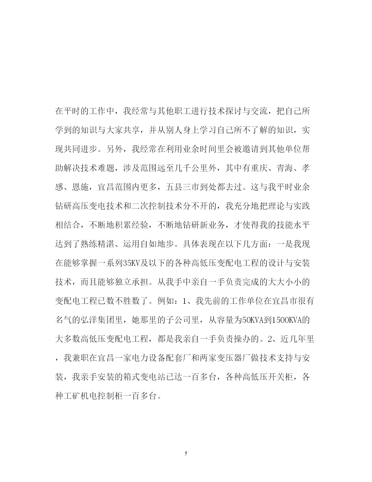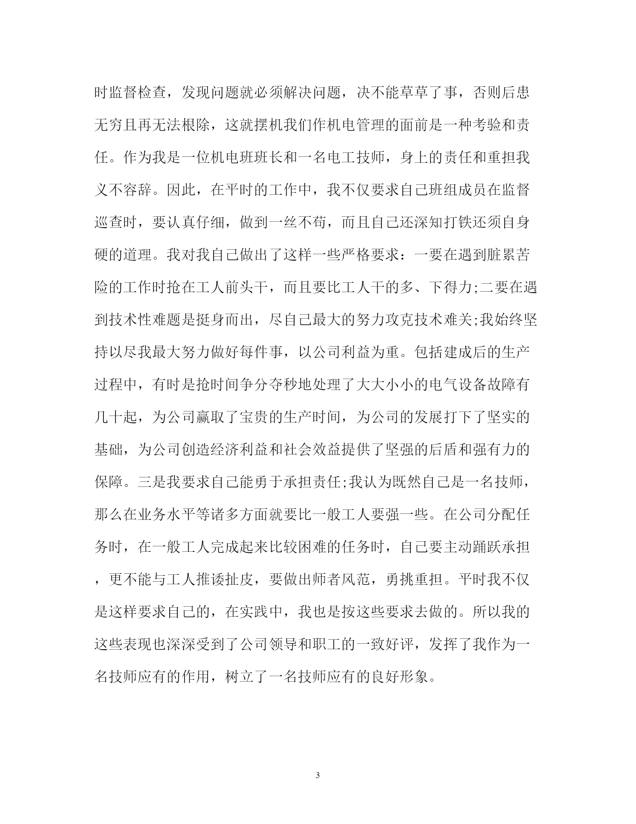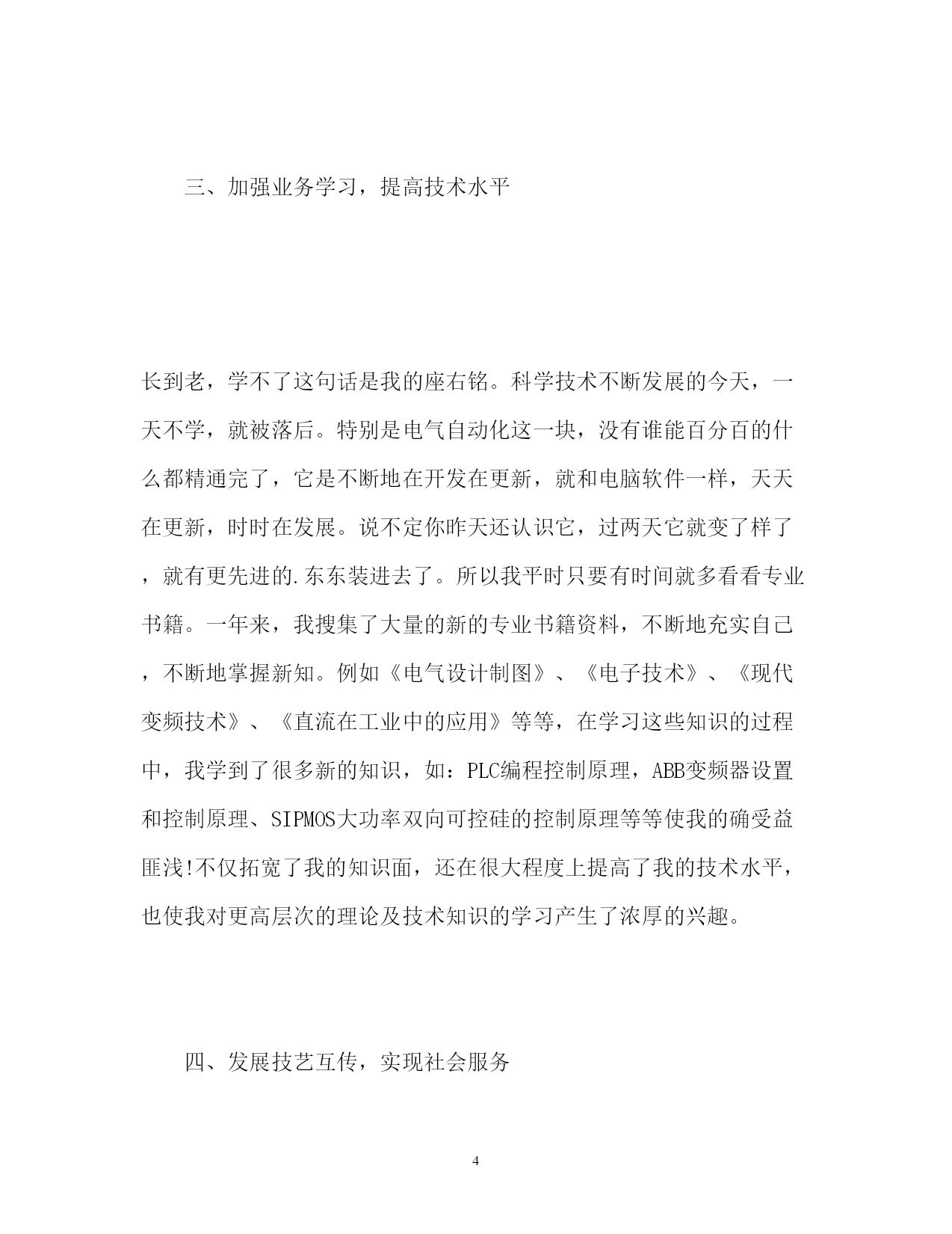 此资料由网络收集而来,如有侵权请告知上传者立即删除。资料共分享,我们负责传递知识。PAGEPAGE6电工技师专业技术工作自我总结电工技师专业技术工作自我总结自从事本职工作以来,我一直在不断地加强自身修养,努力地提高思想道德水平,认真地进行各项文化和专业知识的深化学习,不断地探求新知,锐意进取,积极地开展智能范围内的各项工作,完整履行好一个技师的工作职责,起好模范带头作用。积极参与技术交流和科技创新活动,大地做好了传、帮、带的作用,并全面完成了上级下达的各项任务及指标,在公司的生产和发展中发挥了应有的作用。现将本人任职以来的专业技术工作总结如下:一、自觉加强理论学习,努力提高个人素质没有坚定真确的政治方向,就不会有积极向上的指导思想。为了不断提高自己的政治思想素质,这几年来我一直非常关心国家大事,关注国内外形势,结合形势变化对企业的影响进行分析,并把这种思想付诸实际行动到生产过程中去,保证自己在思想和行动上始终与党和企业保持一致。同时,也把这种思想带入工作和学习中,不断追求自身进步。有人说:一个人要成才,必须得先做人,此话有理。这也就是说:一个人的事业要想得到成功,必须先要学会怎样做人!特别是干我们这项技术性很强的工作的,看事要用心、做事要专心、学习要虚心。容不得有半点马虎和出错。所有首先工作态度要端正,要有良好地职业素养,对工作要认真负责,服从领导安排,虚心听取别人的指点和建议,要团结同事、礼貌待人,服务热情。二、端正工作态度,起好带头作用自从进入公司参加工作开始,我就从事所有了所有的机电事务,包括所有基建时期的安全和质量的监督巡查。我深知机电管理工作在建设期间的重要性,特别是含有大部分隐形的电器基础设施与工程,要随时监督检查,发现问题就必须解决问题,决不能草草了事,否则后患无穷且再无法根除,这就摆机我们作机电管理的面前是一种考验和责任。作为我是一位机电班班长和一名电工技师,身上的责任和重担我义不容辞。因此,在平时的工作中,我不仅要求自己班组成员在监督巡查时,要认真仔细,做到一丝不苟,而且自己还深知打铁还须自身硬的道理。我对我自己做出了这样一些严格要求:一要在遇到脏累苦险的工作时抢在工人前头干,而且要比工人干的多、下得力;二要在遇到技术性难题是挺身而出,尽自己最大的努力攻克技术难关;我始终坚持以尽我最大努力做好每件事,以公司利益为重。包括建成后的生产过程中,有时是抢时间争分夺秒地处理了大大小小的电气设备故障有几十起,为公司赢取了宝贵的生产时间,为公司的发展打下了坚实的基础,为公司创造经济利益和社会效益提供了坚强的后盾和强有力的保障。三是我要求自己能勇于承担责任;我认为既然自己是一名技师,那么在业务水平等诸多方面就要比一般工人要强一些。在公司分配任务时,在一般工人完成起来比较困难的任务时,自己要主动踊跃承担,更不能与工人推诿扯皮,要做出师者风范,勇挑重担。平时我不仅是这样要求自己的,在实践中,我也是按这些要求去做的。所以我的这些表现也深深受到了公司领导和职工的一致好评,发挥了我作为一名技师应有的作用,树立了一名技师应有的良好形象。三、加强业务学习,提高技术水平长到老,学不了这句话是我的座右铭。科学技术不断发展的今天,一天不学,就被落后。特别是电气自动化这一块,没有谁能百分百的什么都精通完了,它是不断地在开发在更新,就和电脑软件一样,天天在更新,时时在发展。说不定你昨天还认识它,过两天它就变了样了,就有更先进的.东东装进去了。所以我平时只要有时间就多看看专业书籍。一年来,我搜集了大量的新的专业书籍资料,不断地充实自己,不断地掌握新知。例如《电气设计制图》、《电子技术》、《现代变频技术》、《直流在工业中的应用》等等,在学习这些知识的过程中,我学到了很多新的知识,如:PLC编程控制原理,ABB变频器设置和控制原理、SIPMOS大功率双向可控硅的控制原理等等使我的确受益匪浅!不仅拓宽了我的知识面,还在很大程度上提高了我的技术水平,也使我对更高层次的理论及技术知识的学习产生了浓厚的兴趣。四、发展技艺互传,实现社会服务在平时的工作中,我经常与其他职工进行技术探讨与交流,把自己所学到的知识与大家共享,并从别人身上学习自己所不了解的知识,实现共同进步。另外,我经常在利用业余时间里会被邀请到其他单位帮助解决技术难题,涉及范围远至几千公里外,其中有重庆、青海、孝感、恩施,宜昌范围内更多,五县三市到处都去过。这与我平时业余钻研高压变电技术和二次控制技术分不开的,我充分地把理论与实践相结合,不断地积累经验,不断地钻研新业务,才使得我的技能水平达到了熟练精湛、运用自如地步。具体表现在以下几方面:一是我现在能够掌握一系列35KV及以下的各种高低压变配电工程的设计与安装技术,而