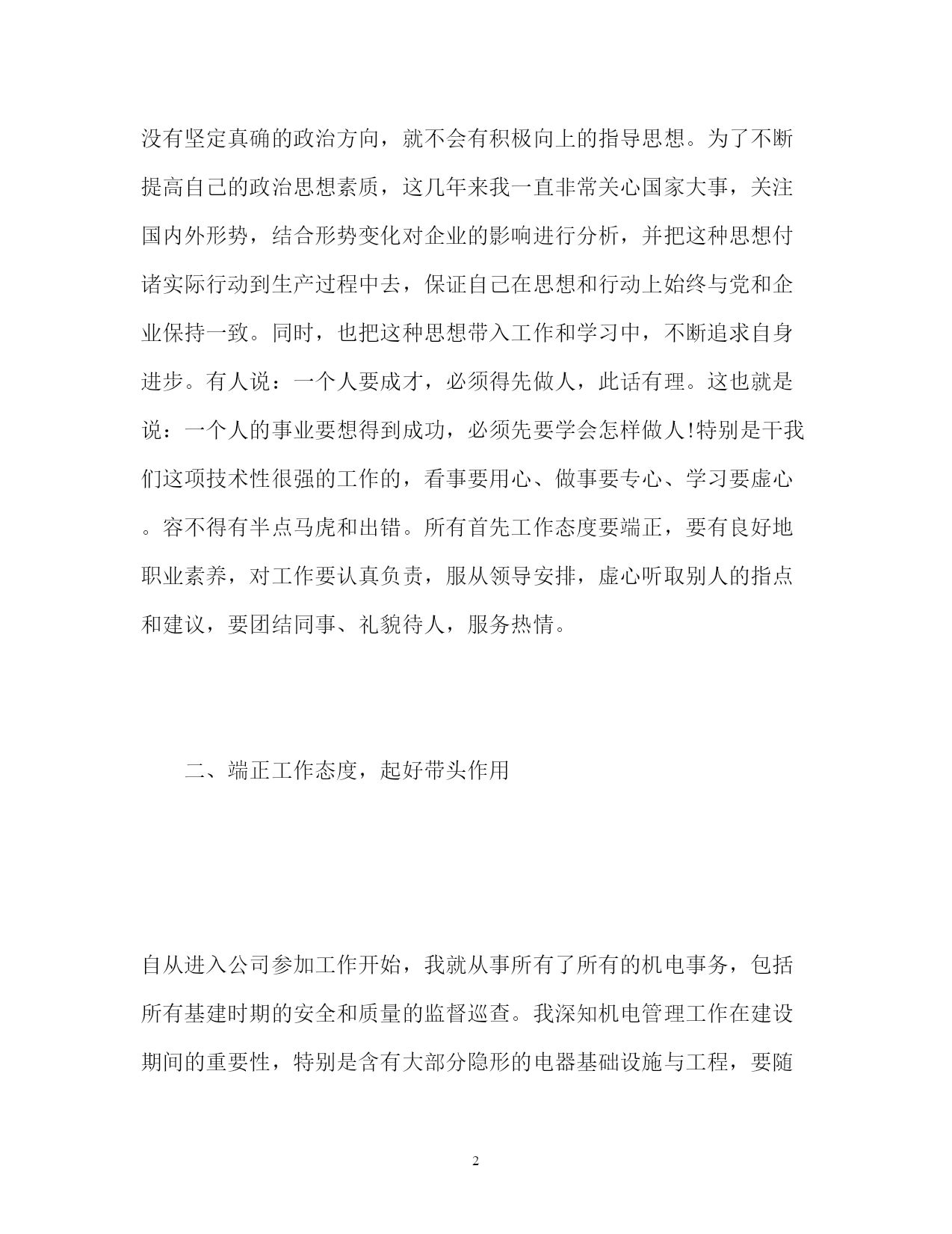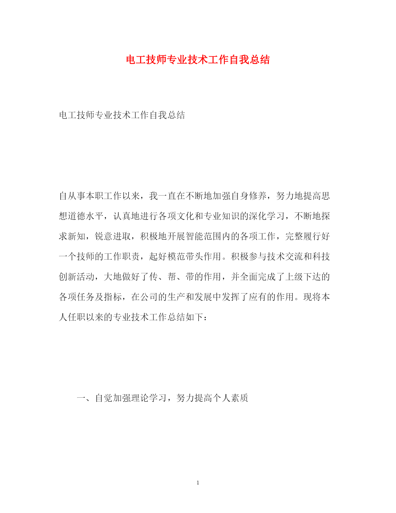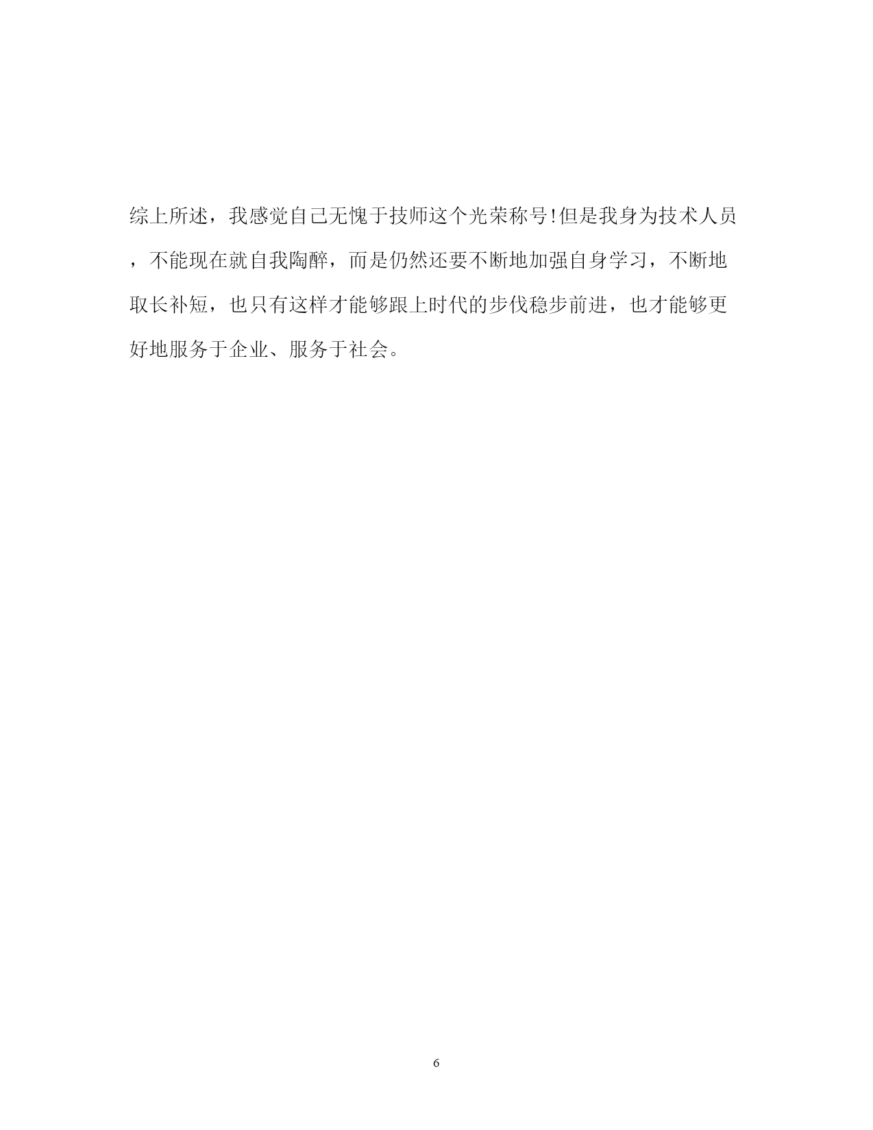 此资料由网络收集而来,如有侵权请告知上传者立即删除。资料共分享,我们负责传递知识。PAGEPAGE6电工技师专业技术工作自我总结电工技师专业技术工作自我总结自从事本职工作以来,我一直在不断地加强自身修养,努力地提高思想道德水平,认真地进行各项文化和专业知识的深化学习,不断地探求新知,锐意进取,积极地开展智能范围内的各项工作,完整履行好一个技师的工作职责,起好模范带头作用。积极参与技术交流和科技创新活动,大地做好了传、帮、带的作用,并全面完成了上级下达的各项任务及指标,在公司的生产和发展中发挥了应有的作用。现将本人任职以来的专业技术工作总结如下:一、自觉加强理论学习,努力提高个人素质没有坚定真确的政治方向,就不会有积极向上的指导思想。为了不断提高自己的政治思想素质,这几年来我一直非常关心国家大事,关注国内外形势,结合形势变化对企业的影响进行分析,并把这种思想付诸实际行动到生产过程中去,保证自己在思想和行动上始终与党和企业保持一致。同时,也把这种思想带入工作和学习中,不断追求自身进步。有人说:一个人要成才,必须得先做人,此话有理。这也就是说:一个人的事业要想得到成功,必须先要学会怎样做人!特别是干我们这项技术性很强的工作的,看事要用心、做事要专心、学习要虚心。容不得有半点马虎和出错。所有首先工作态度要端正,要有良好地职业素养,对工作要认真负责,服从领导安排,虚心听取别人的指点和建议,要团结同事、礼貌待人,服务热情。二、端正工作态度,起好带头作用自从进入公司参加工作开始,我就从事所有了所有的机电事务,包括所有基建时期的安全和质量的监督巡查。我深知机电管理工作在建设期间的重要性,特别是含有大部分隐形的电器基础设施与工程,要随时监督检查,发现问题就必须解决问题,决不能草草了事,否则后患无穷且再无法根除,这就摆机我们作机电管理的面前是一种考验和责任。作为我是一位机电班班长和一名电工技师,身上的责任和重担我义不容辞。因此,在平时的工作中,我不仅要求自己班组成员在监督巡查时,要认真仔细,做到一丝不苟,而且自己还深知打铁还须自身硬的道理。我对我自己做出了这样一些严格要求:一要在遇到脏累苦险的工作时抢在工人前头干,而且要比工人干的多、下得力;二要在遇到技术性难题是挺身而出,尽自己最大的努力攻克技术难关;我始终坚持以尽我最大努力做好每件事,以公司利益为重。包括建成后的生产过程中,有时是抢时间争分夺秒地处理了大大小小的电气设备故障有几十起,为公司赢取了宝贵的生产时间,为公司的发展打下了坚实的基础,为公司创造经济利益和社会效益提供了坚强的后盾和强有力的保障。三是我要求自己能勇于承担责任;我认为既然自己是一名技师,那么在业务水平等诸多方面就要比一般工人要强一些。在公司分配任务时,在一般工人完成起来比较困难的任务时,自己要主动踊跃承担,更不能与工人推诿扯皮,要做出师者风范,勇挑重担。平时我不仅是这样要求自己的,在实践中,我也是按这些要求去做的。所以我的这些表现也深深受到了公司领导和职工的一致好评,发挥了我作为一名技师应有的作用,树立了一名技师应有的良好形象。三、加强业务学习,提高技术水平长到老,学不了这句话是我的座右铭。科学技术不断发展的今天,一天不学,就被落后。特别是电气自动化这一块,没有谁能百分百的什么都精通完了,它是不断地在开发在更新,就和电脑软件一样,天天在更新,时时在发展。说不定你昨天还认识它,过两天它就变了样了,就有更先进的.东东装进去了。所以我平时只要有时间就多看看专业书籍。一年来,我搜集了大量的新的专业书籍资料,不断地充实自己,不断地掌握新知。例如《电气设计制图》、《电子技术》、《现代变频技术》、《直流在工业中的应用》等等,在学习这些知识的过程中,我学到了很多新的知识,如:PLC编程控制原理,ABB变频器设置和控制原理、SIPMOS大功率双向可控硅的控制原理等等使我的确受益匪浅!不仅拓宽了我的知识面,还在很大程度上提高了我的技术水平,也使我对更高层次的理论及技术知识的学习产生了浓厚的兴趣。四、发展技艺互传,实现社会服务在平时的工作中,我经常与其他职工进行技术探讨与交流,把自己所学到的知识与大家共享,并从别人身上学习自己所不了解的知识,实现共同进步。另外,我经常在利用业余时间里会被邀请到其他单位帮助解决技术难题,涉及范围远至几千公里外,其中有重庆、青海、孝感、恩施,宜昌范围内更多,五县三市到处都去过。这与我平时业余钻研高压变电技术和二次控制技术分不开的,我充分地把理论与实践相结合,不断地积累经验,不断地钻研新业务,才使得我的技能水平达到了熟练精湛、运用自如地步。具体表现在以下几方面:一是我现在能够掌握一系列35KV及以下的各种高低压变配电工程的设计与安装技术,而