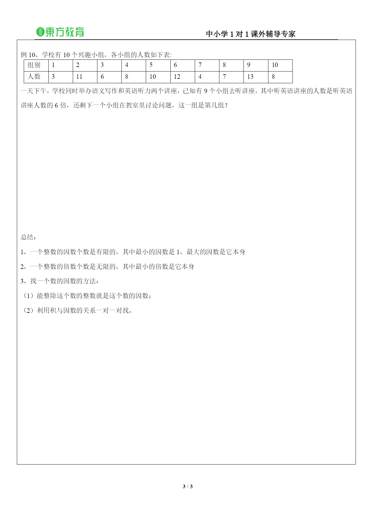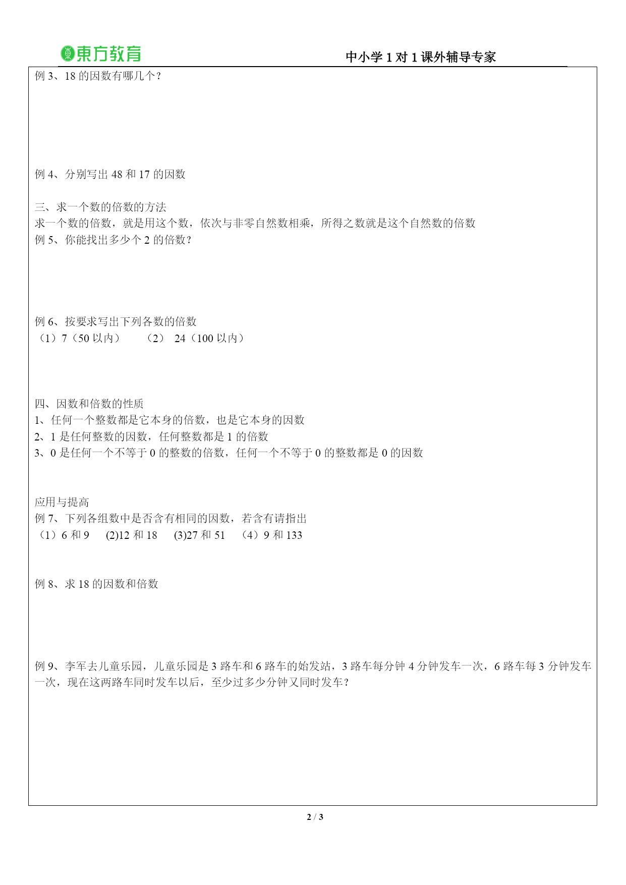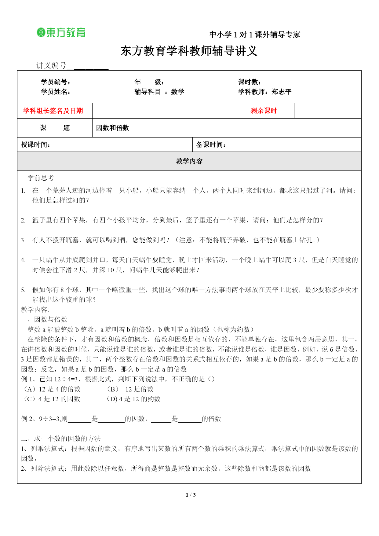 中小学1对1课外辅导专家PAGE3/NUMPAGES3东方教育学科教师辅导讲义讲义编号_________学员编号:年级:课时数:学员姓名:辅导科目:数学学科教师:郑志平学科组长签名及日期剩余课时课题因数和倍数授课时间:备课时间:教学内容学前思考在一个荒芜人迹的河边停着一只小船,小船只能容纳一个人,两个人同时来到河边,都乘这只船过了河。请问:他们是怎样过河的?篮子里有四个苹果,有四个小孩平均分,分到最后,篮子里还有一个苹果,请问:他们是怎样分的?有人不拨开瓶塞,就可以喝到酒,您能做到吗?(注意:不能将瓶子弄破,也不能在瓶塞上钻孔。)一只蜗牛从井底爬到井口,每天白天蜗牛要睡觉,晚上才回来活动,一个晚上蜗牛可以爬3尺,但是白天睡觉的时候会往下滑2尺,井深10尺,问蜗牛几天能够爬出来?假如你有8个球,其中一个略微重一些,找出这个球的唯一方法事将两个球放在天平上比较,最少要称多少次才能找出这个较重的球?教学内容:一、因数与倍数整数a能被整数b整除,a就叫着b的倍数,b就叫着a的因数(也称为约数)在整除的条件下,才有因数和倍数的概念,倍数和因数是相互依存的,不能单独存在,这里包含两层意思,其一,在讲倍数和因数的时候,只能说谁是谁的倍数,或者谁是谁的倍数,不能说谁是倍数,谁是因数,例如,说6是倍数,3是因数都是错误的,其二,两个整数存在倍数和因数的关系式相互依存的,如果a是b的倍数,那么b一定是a的因数;反之,如果a是b的因数,那么b一定是a的倍数例1、已知12÷4=3,根据此式,判断下列说法中,不正确的是()(A)12是4的倍数(B)12是倍数(C)4是12的因数(D)4是12的约数例2、9÷3=3,则_______是________的因数,______是_______的倍数求一个数的因数的方法列乘法算式:根据因数的意义,有序地写出某数的所有两个数的乘积的乘法算式,乘法算式中的因数就是该数的因数。列除法算式:用此数除以任意数,所得商是整数是整数而无余数,这些除数和商都是该数的因数例3、18的因数有哪几个?例4、分别写出48和17的因数求一个数的倍数的方法求一个数的倍数,就是用这个数,依次与非零自然数相乘,所得之数就是这个自然数的倍数例5、你能找出多少个2的倍数?例6、按要求写出下列各数的倍数(1)7(50以内)(2)24(100以内)因数和倍数的性质任何一个整数都是它本身的倍数,也是它本身的因数1是任何整数的因数,任何整数都是1的倍数0是任何一个不等于0的整数的倍数,任何一个不等于0的整数都是0的因数应用与提高例7、下列各组数中是否含有相同的因数,若含有请指出(1)6和9(2)12和18(3)27和51(4)9和133例8、求18的因数和倍数例9、李军去儿童乐园,儿童乐园是3路车和6路车的始发站,3路车每分钟4分钟发车一次,6路车每3分钟发车一次,现在这两路车同时发车以后,至少过多少分钟又同时发车?例10、学校有10个兴趣小组,各小组的人数如下表:组别12345678910人数31168101247138一天下午,学校同时举办语文写作和英语听力两个讲座,已知有9个小组去听讲座,其中听英语讲座的人数是听英语讲座人数的6倍,还剩下一个小组在教室里讨论问题,这一组是第几组?总结:一个整数的因数个数是有限的,其中最小的因数是1,最大的因数是它本身一个整数的倍数个数是无限的,其中最小的倍数是它本身找一个数的因数的方法:能整除这个数的整数就是这个数的因数;利用积与因数的关系一对一对找。