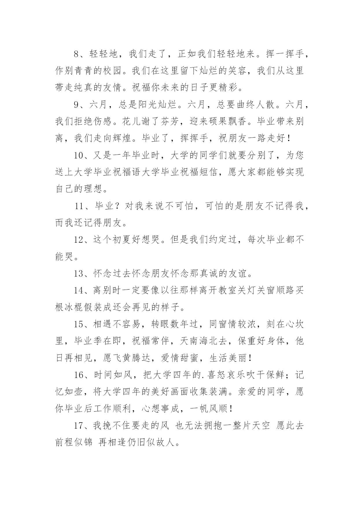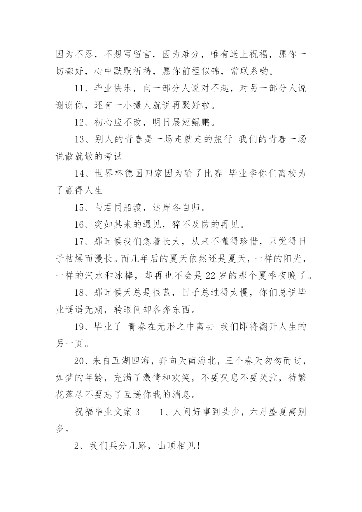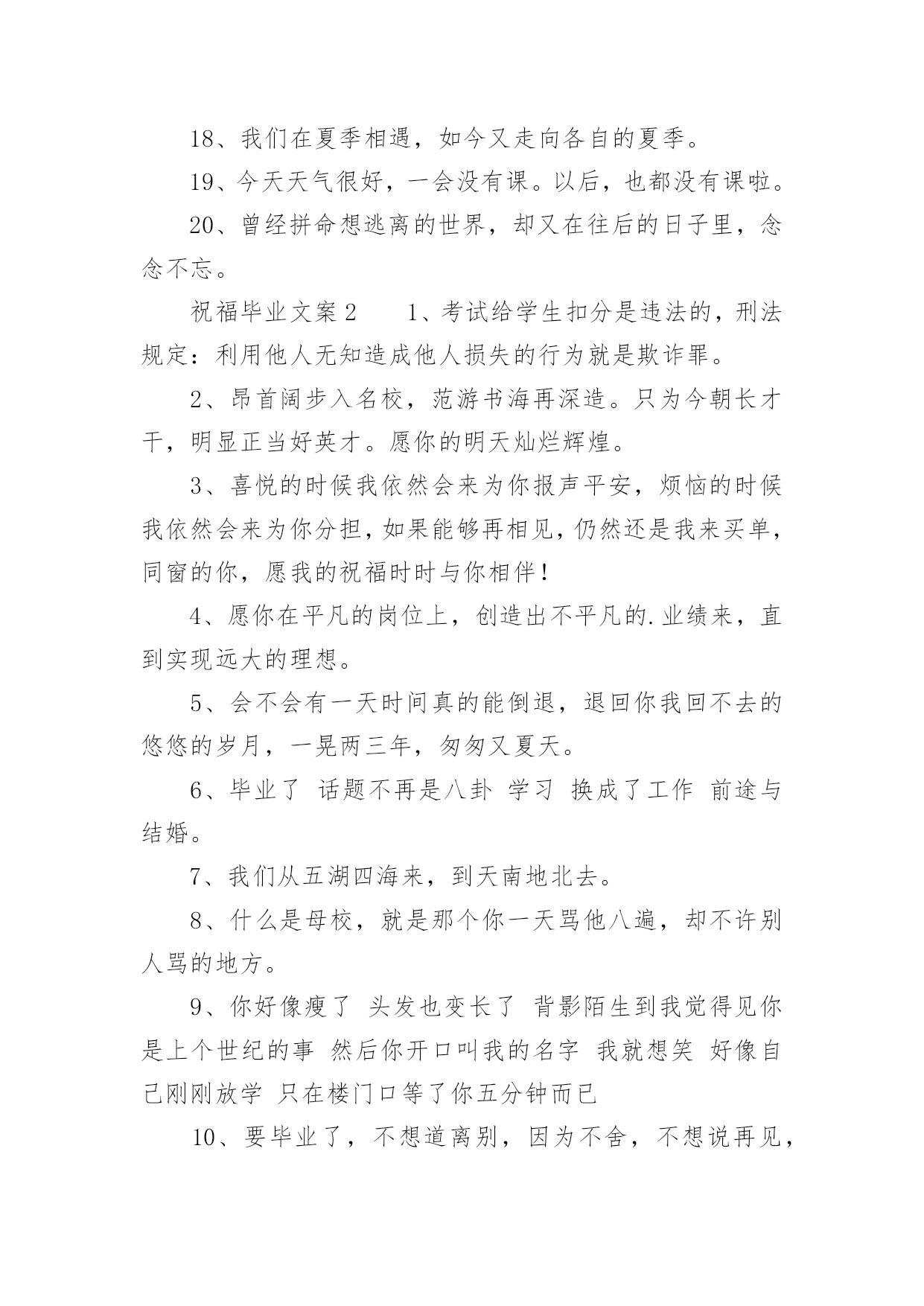 祝福毕业文案关于祝福毕业文案随着社交网络的快速发展,越来越多人热衷于在网上发布文案,文案具有在理智上启发人们,在情感上打动人们的作用。你知道什么样的文案才是特别的吗?以下是小编帮大家整理的关于祝福毕业文案,希望能够帮助到大家。祝福毕业文案11、毕业离别时的伤感。互相登上离开车。飞驰而过的站牌。充满伤感的车站。2、毕业了,我会想你们的,记住“海内存知己,天涯若比邻”。不要让失意占据你的心情,微笑着踏上人生,也祝福你们…。3、我还能做什么你已经不爱我我一直都爱着你这难道还不够吗我知道你已无心在继续看着我。4、“你在干嘛”“练习笑”“为什么”“因为毕业那天不想哭”。5、几个人用同样的钥匙,打开同一扇门,几个人用同样的目光,跟空荡的寝室说再见。6、高尚的理想是人生的指路明灯。有了它,生活就有了方向;有了它,内心就感到充实。迈开坚定的步伐,走向既定的目标吧!7、心有点痛眼有点红,为了理想各奔西东。偶尔心感冰冻,也用真挚笑容,让友谊暖风奉送。远方亲爱的朋友,愿你平安健康!幸福快乐!记得要常联系哦!8、轻轻地,我们走了,正如我们轻轻地来。挥一挥手,作别青青的校园。我们在这里留下灿烂的笑容,我们从这里帯走纯真的友情。祝福你未来的日子更精彩。9、六月,总是阳光灿烂。六月,总要曲终人散。六月,我们拒绝伤感。花儿谢了芬芳,迎来硕果飘香。毕业带来别离,我们走向辉煌。毕业了,挥挥手,祝朋友一路走好!10、又是一年毕业时,大学的同学们就要分别了,为您送上大学毕业祝福语大学毕业祝福短信,愿大家都能够实现自己的理想。11、毕业?对我来说不可怕,可怕的是朋友不记得我,而我还记得朋友。12、这个初夏好想哭。但是我们约定过,每次毕业都不能哭。13、怀念过去怀念朋友怀念那真诚的友谊。14、离别时一定要像以往那样离开教室关灯关窗顺路买根冰棍假装成还会再见的样子。15、相遇不容易,转眼数年过,同窗情较浓,刻在心坎里,毕业季在即,祝福常伴,天南海北去,保重好身体,他日再相见,愿飞黄腾达,爱情甜蜜,生活美丽!16、时间如风,把大学四年的.喜怒哀乐吹干保鲜;记忆如壶,将大学四年的美好画面收集装满。亲爱的同学,愿你毕业后工作顺利,心想事成,一帆风顺!17、我挽不住要走的风也无法拥抱一整片天空愿此去前程似锦再相逢仍旧似故人。18、我们在夏季相遇,如今又走向各自的夏季。19、今天天气很好,一会没有课。以后,也都没有课啦。20、曾经拼命想逃离的世界,却又在往后的日子里,念念不忘。祝福毕业文案21、考试给学生扣分是违法的,刑法规定:利用他人无知造成他人损失的行为就是欺诈罪。2、昂首阔步入名校,范游书海再深造。只为今朝长才干,明显正当好英才。愿你的明天灿烂辉煌。3、喜悦的时候我依然会来为你报声平安,烦恼的时候我依然会来为你分担,如果能够再相见,仍然还是我来买单,同窗的你,愿我的祝福时时与你相伴!4、愿你在平凡的岗位上,创造出不平凡的.业绩来,直到实现远大的理想。5、会不会有一天时间真的能倒退,退回你我回不去的悠悠的岁月,一晃两三年,匆匆又夏天。6、毕业了话题不再是八卦学习换成了工作前途与结婚。7、我们从五湖四海来,到天南地北去。8、什么是母校,就是那个你一天骂他八遍,却不许别人骂的地方。9、你好像瘦了头发也变长了背影陌生到我觉得见你是上个世纪的事然后你开口叫我的名字我就想笑好像自己刚刚放学只在楼门口等了你五分钟而已10、要毕业了,不想道离别,因为不舍,不想说再见,因为不忍,不想写留言,因为难分,唯有送上祝福,愿你一切都好,心中默默祈祷,愿你前程似锦,常联系哟。11、毕业快乐,向一部分人说对不起,对另一部分人说谢谢你,还有一小撮人就说再聚好啦。12、初心应不改,明日展翅鲲鹏。13、别人的青春是一场走就走的旅行我们的青春一场说散就散的考试14、世界杯德国回家因为输了比赛毕业季你们离校为了赢得人生15、与君同船渡,达岸各自归。16、突如其来的遇见,猝不及防的再见。17、那时候我们急着长大,从来不懂得珍惜,只觉得日子枯燥而漫长。而几年后的夏天依然还是夏天,一样的阳光,一样的汽水和冰棒,却再也不会是22岁的那个夏季夜晚了。18、那时候天总是很蓝,日子总过得太慢,你们总说毕业遥遥无期,转眼间却各奔东西。19、毕业了青春在无形之中离去我们即将翻开人生的另一页。20、来自五湖四海,奔向天南海北,三个春天匆匆而过,如梦的年龄,充满了激情和欢笑,不要叹息不要哭泣,待繁花落尽不要忘了互递你我的消息。祝福毕业文案31、人间好事到头少,六月盛夏离别多。2、我们兵分几路,山顶相见!3、风吹起如花般破碎的流年,而你的笑容摇晃摇晃,成为我命途中最美的点缀,看天,看雪,看季节深深的暗影。4、你永远也看不到我最寂寞时候的样子,因为只有你不在我身边的时候,我才最寂寞。5、少亭外,旧道边,芳草碧连地。唱到一半,便未泪淌谦里