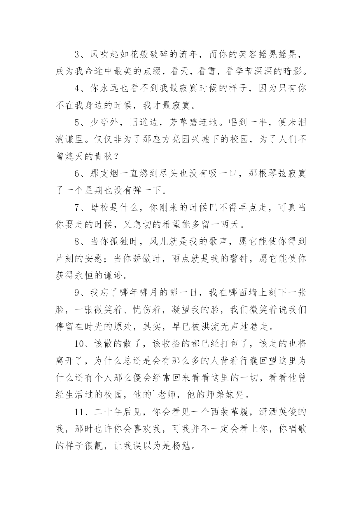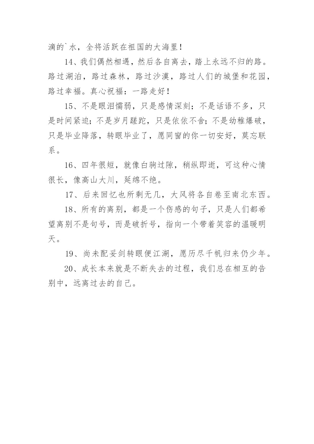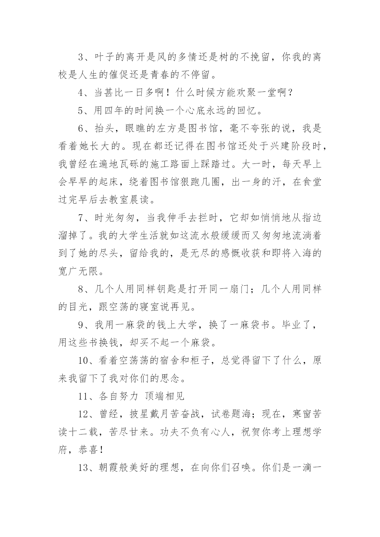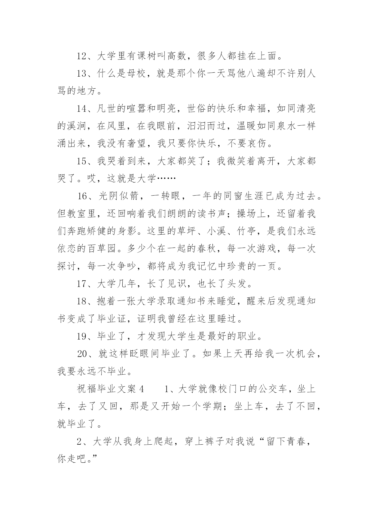 祝福毕业文案关于祝福毕业文案随着社交网络的快速发展,越来越多人热衷于在网上发布文案,文案具有在理智上启发人们,在情感上打动人们的作用。你知道什么样的文案才是特别的吗?以下是小编帮大家整理的关于祝福毕业文案,希望能够帮助到大家。祝福毕业文案11、毕业离别时的伤感。互相登上离开车。飞驰而过的站牌。充满伤感的车站。2、毕业了,我会想你们的,记住“海内存知己,天涯若比邻”。不要让失意占据你的心情,微笑着踏上人生,也祝福你们…。3、我还能做什么你已经不爱我我一直都爱着你这难道还不够吗我知道你已无心在继续看着我。4、“你在干嘛”“练习笑”“为什么”“因为毕业那天不想哭”。5、几个人用同样的钥匙,打开同一扇门,几个人用同样的目光,跟空荡的寝室说再见。6、高尚的理想是人生的指路明灯。有了它,生活就有了方向;有了它,内心就感到充实。迈开坚定的步伐,走向既定的目标吧!7、心有点痛眼有点红,为了理想各奔西东。偶尔心感冰冻,也用真挚笑容,让友谊暖风奉送。远方亲爱的朋友,愿你平安健康!幸福快乐!记得要常联系哦!8、轻轻地,我们走了,正如我们轻轻地来。挥一挥手,作别青青的校园。我们在这里留下灿烂的笑容,我们从这里帯走纯真的友情。祝福你未来的日子更精彩。9、六月,总是阳光灿烂。六月,总要曲终人散。六月,我们拒绝伤感。花儿谢了芬芳,迎来硕果飘香。毕业带来别离,我们走向辉煌。毕业了,挥挥手,祝朋友一路走好!10、又是一年毕业时,大学的同学们就要分别了,为您送上大学毕业祝福语大学毕业祝福短信,愿大家都能够实现自己的理想。11、毕业?对我来说不可怕,可怕的是朋友不记得我,而我还记得朋友。12、这个初夏好想哭。但是我们约定过,每次毕业都不能哭。13、怀念过去怀念朋友怀念那真诚的友谊。14、离别时一定要像以往那样离开教室关灯关窗顺路买根冰棍假装成还会再见的样子。15、相遇不容易,转眼数年过,同窗情较浓,刻在心坎里,毕业季在即,祝福常伴,天南海北去,保重好身体,他日再相见,愿飞黄腾达,爱情甜蜜,生活美丽!16、时间如风,把大学四年的.喜怒哀乐吹干保鲜;记忆如壶,将大学四年的美好画面收集装满。亲爱的同学,愿你毕业后工作顺利,心想事成,一帆风顺!17、我挽不住要走的风也无法拥抱一整片天空愿此去前程似锦再相逢仍旧似故人。18、我们在夏季相遇,如今又走向各自的夏季。19、今天天气很好,一会没有课。以后,也都没有课啦。20、曾经拼命想逃离的世界,却又在往后的日子里,念念不忘。祝福毕业文案21、考试给学生扣分是违法的,刑法规定:利用他人无知造成他人损失的行为就是欺诈罪。2、昂首阔步入名校,范游书海再深造。只为今朝长才干,明显正当好英才。愿你的明天灿烂辉煌。3、喜悦的时候我依然会来为你报声平安,烦恼的时候我依然会来为你分担,如果能够再相见,仍然还是我来买单,同窗的你,愿我的祝福时时与你相伴!4、愿你在平凡的岗位上,创造出不平凡的.业绩来,直到实现远大的理想。5、会不会有一天时间真的能倒退,退回你我回不去的悠悠的岁月,一晃两三年,匆匆又夏天。6、毕业了话题不再是八卦学习换成了工作前途与结婚。7、我们从五湖四海来,到天南地北去。8、什么是母校,就是那个你一天骂他八遍,却不许别人骂的地方。9、你好像瘦了头发也变长了背影陌生到我觉得见你是上个世纪的事然后你开口叫我的名字我就想笑好像自己刚刚放学只在楼门口等了你五分钟而已10、要毕业了,不想道离别,因为不舍,不想说再见,因为不忍,不想写留言,因为难分,唯有送上祝福,愿你一切都好,心中默默祈祷,愿你前程似锦,常联系哟。11、毕业快乐,向一部分人说对不起,对另一部分人说谢谢你,还有一小撮人就说再聚好啦。12、初心应不改,明日展翅鲲鹏。13、别人的青春是一场走就走的旅行我们的青春一场说散就散的考试14、世界杯德国回家因为输了比赛毕业季你们离校为了赢得人生15、与君同船渡,达岸各自归。16、突如其来的遇见,猝不及防的再见。17、那时候我们急着长大,从来不懂得珍惜,只觉得日子枯燥而漫长。而几年后的夏天依然还是夏天,一样的阳光,一样的汽水和冰棒,却再也不会是22岁的那个夏季夜晚了。18、那时候天总是很蓝,日子总过得太慢,你们总说毕业遥遥无期,转眼间却各奔东西。19、毕业了青春在无形之中离去我们即将翻开人生的另一页。20、来自五湖四海,奔向天南海北,三个春天匆匆而过,如梦的年龄,充满了激情和欢笑,不要叹息不要哭泣,待繁花落尽不要忘了互递你我的消息。祝福毕业文案31、人间好事到头少,六月盛夏离别多。2、我们兵分几路,山顶相见!3、风吹起如花般破碎的流年,而你的笑容摇晃摇晃,成为我命途中最美的点缀,看天,看雪,看季节深深的暗影。4、你永远也看不到我最寂寞时候的样子,因为只有你不在我身边的时候,我才最寂寞。5、少亭外,旧道边,芳草碧连地。唱到一半,便未泪淌谦里