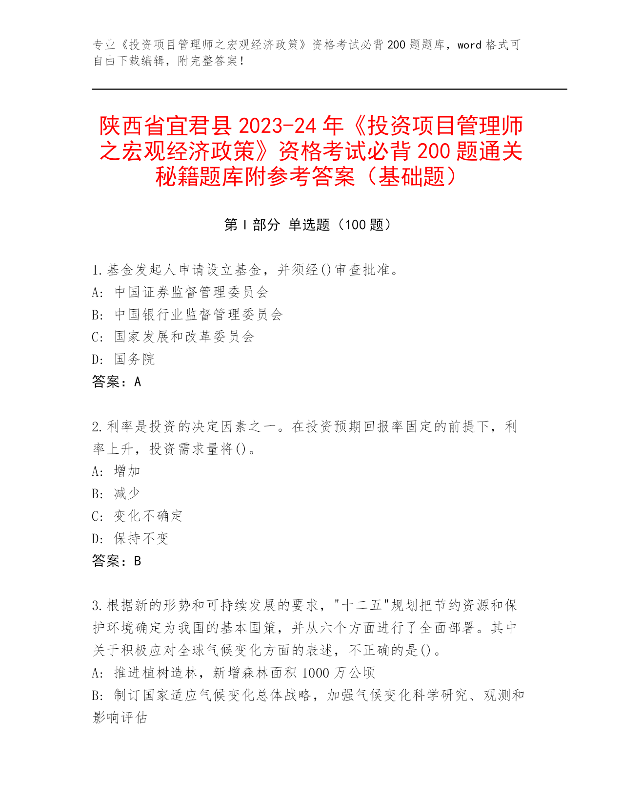 陕西省宜君县2023-24年《投资项目管理师之宏观经济政策》资格考试必背200题通关秘籍题库附参考答案(基础题)