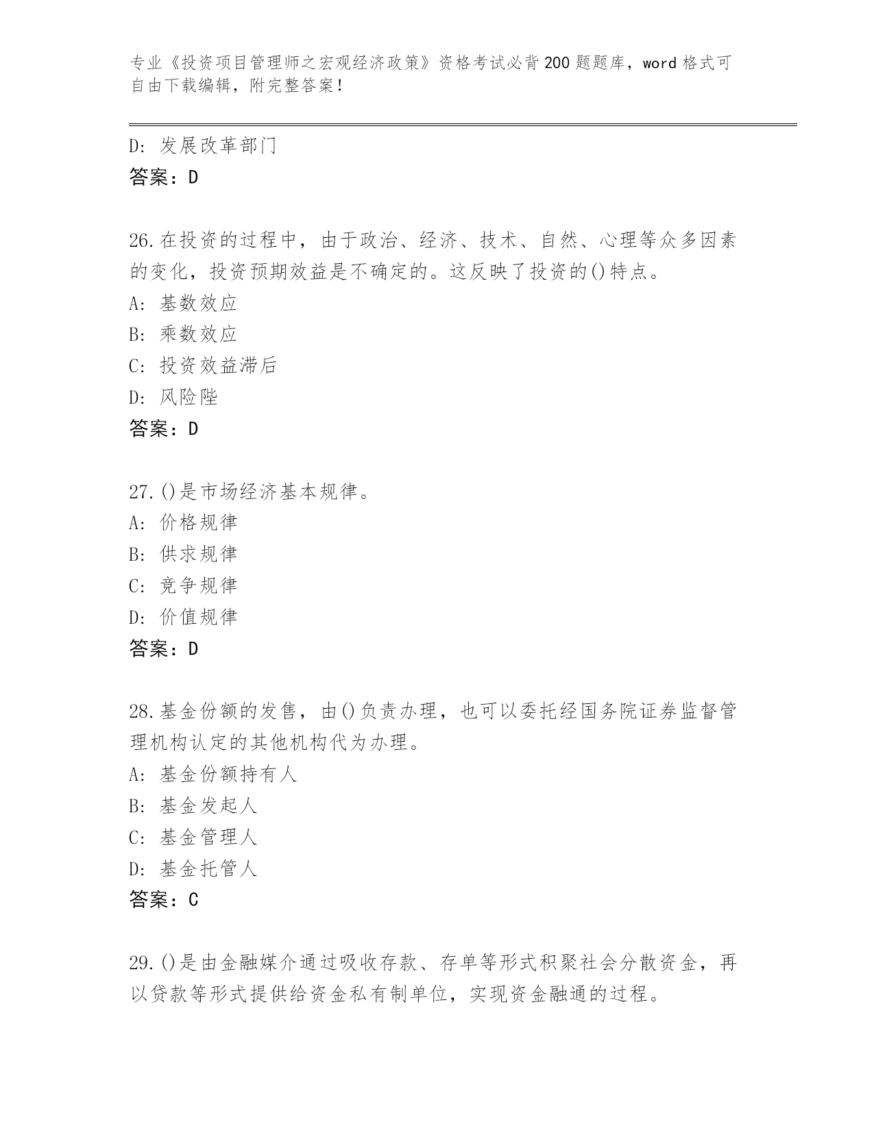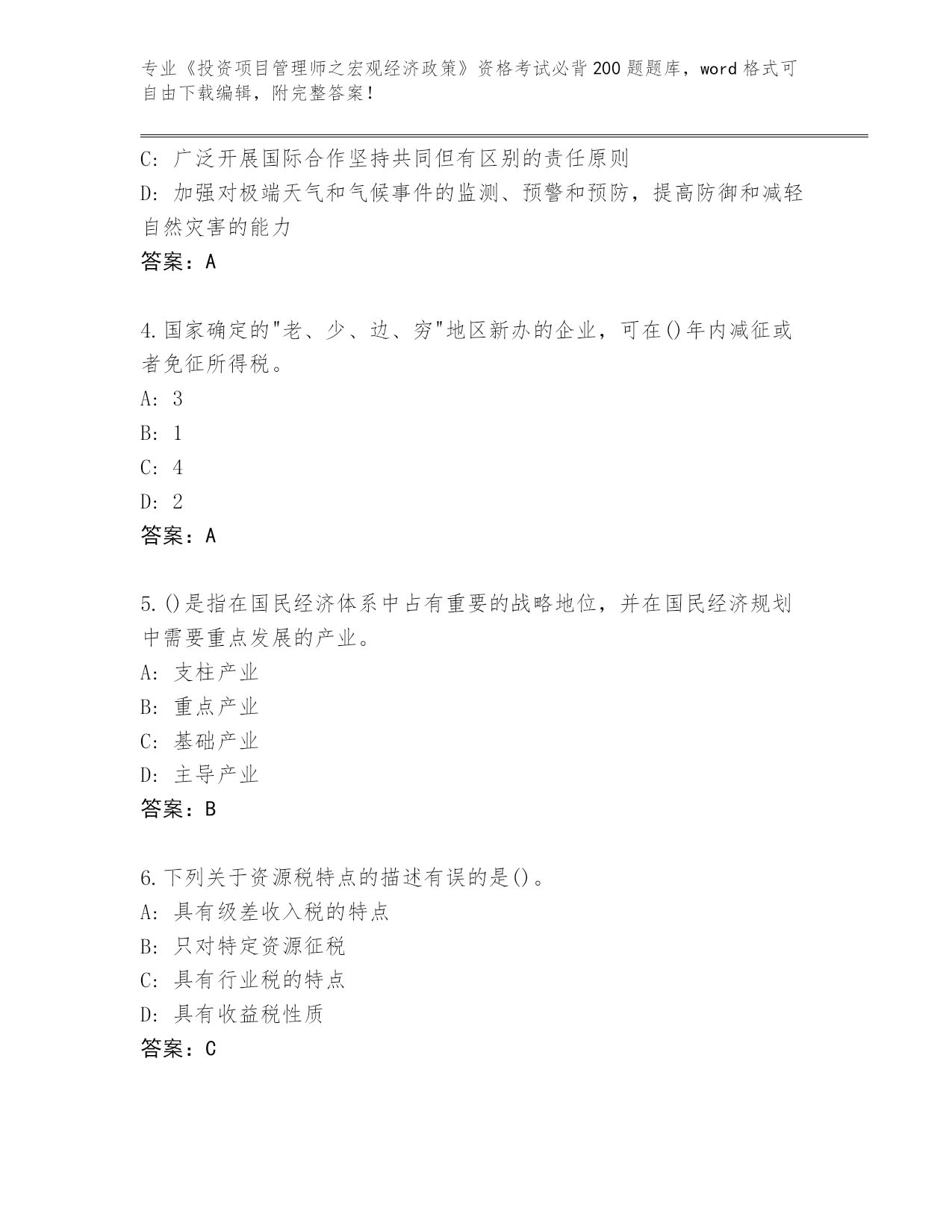 陕西省安塞区2024年《投资项目管理师之宏观经济政策》资格考试必背200题通关秘籍题库及答案