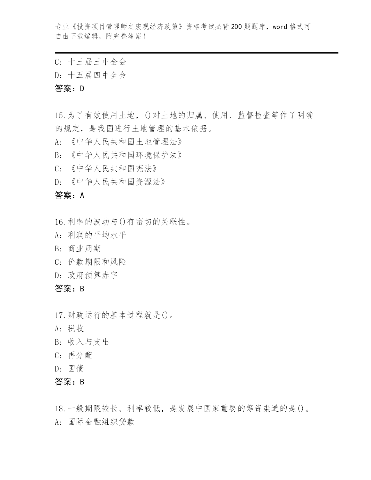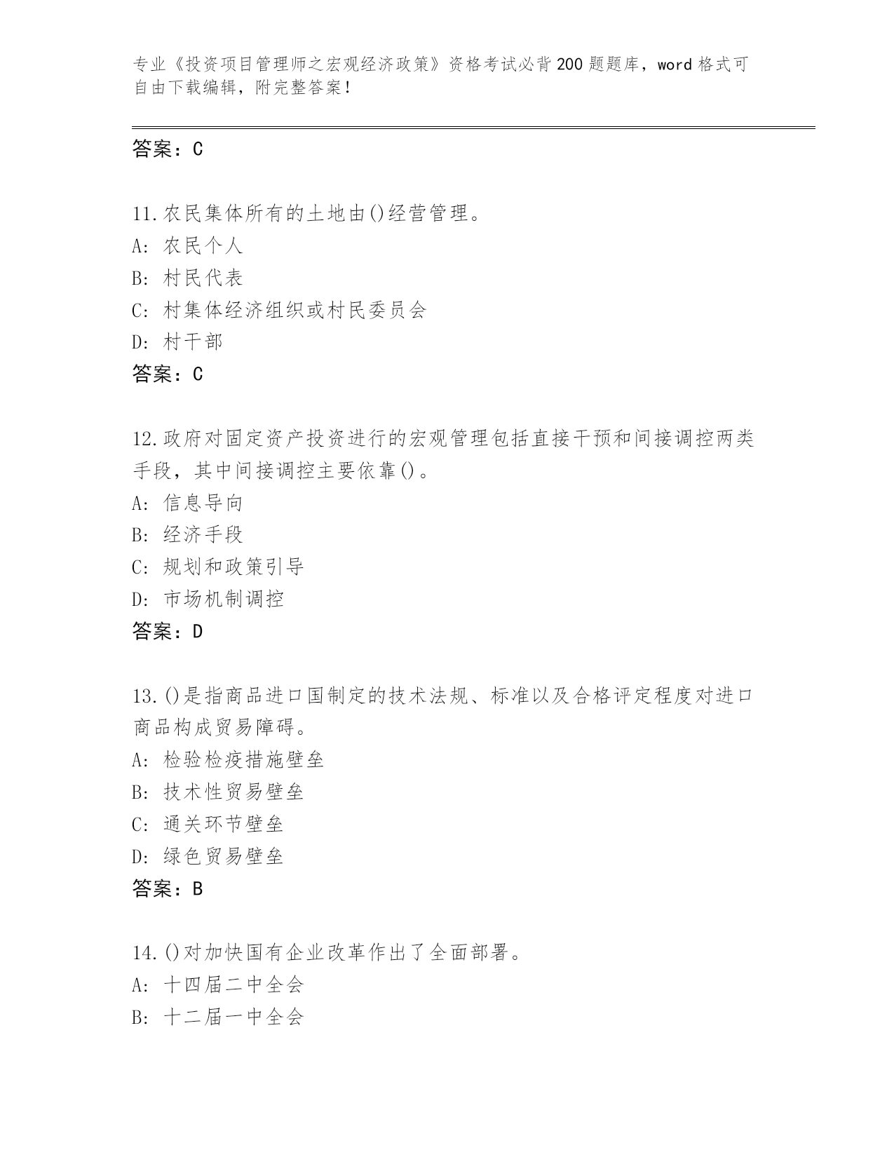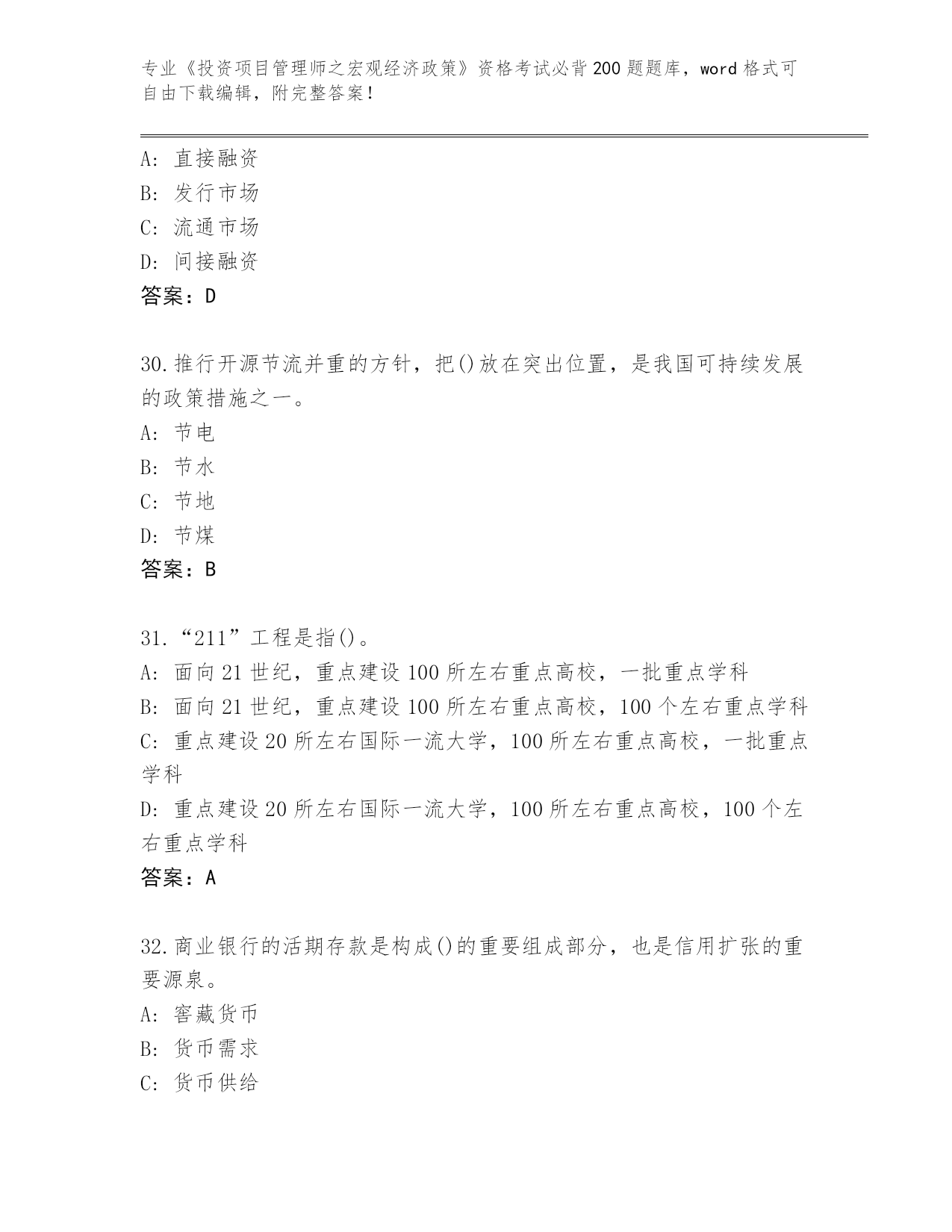 内部使用陕西省宜君县《投资项目管理师之宏观经济政策》资格考试必背200题通关秘籍题库带答案(培优B卷)