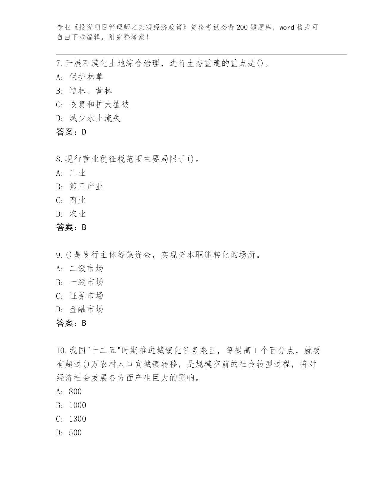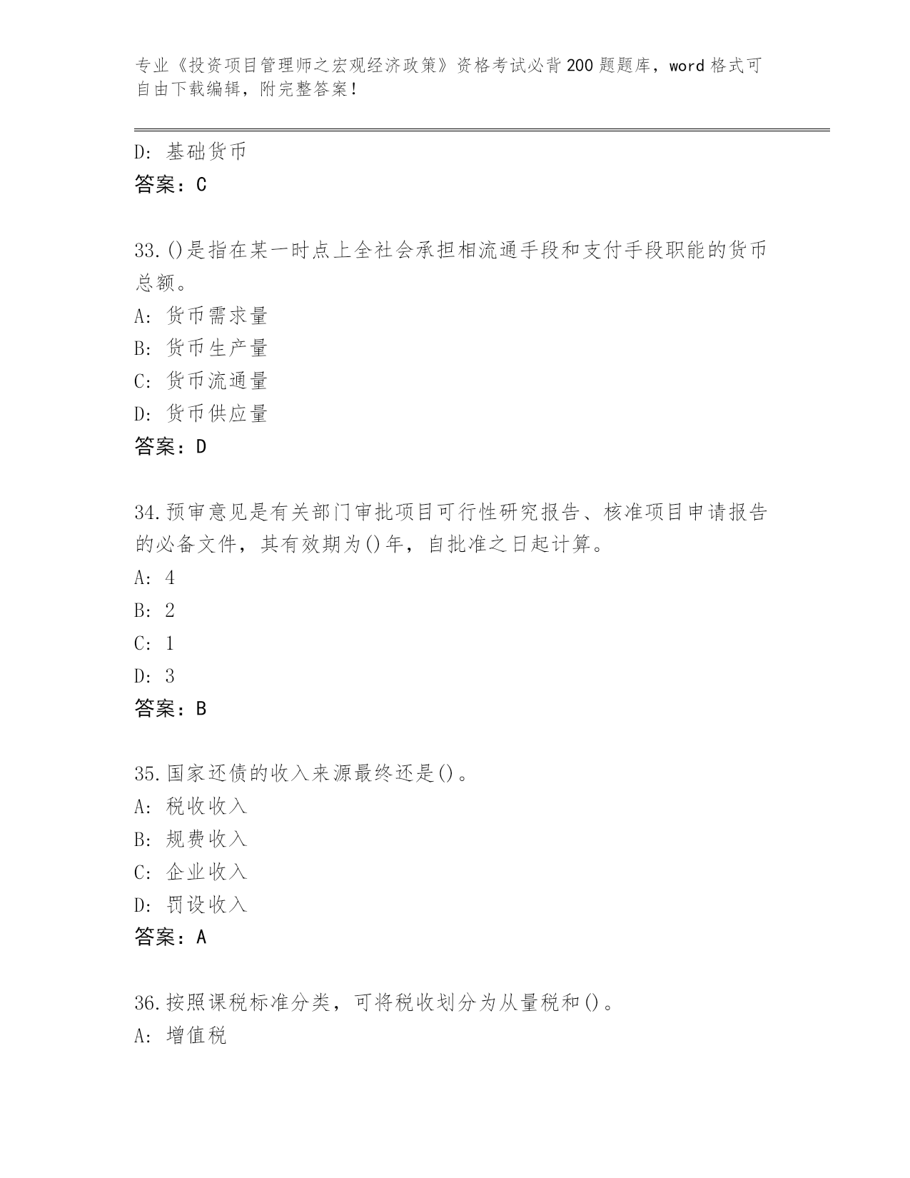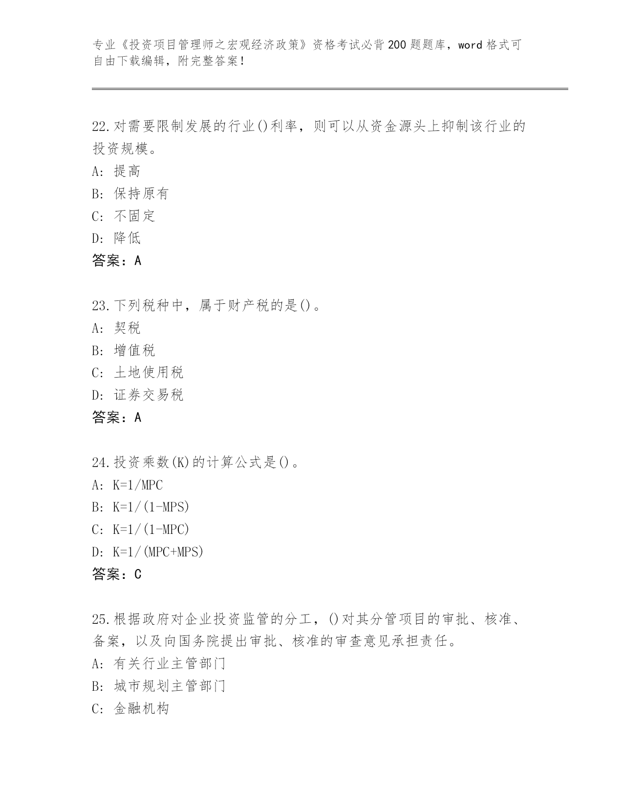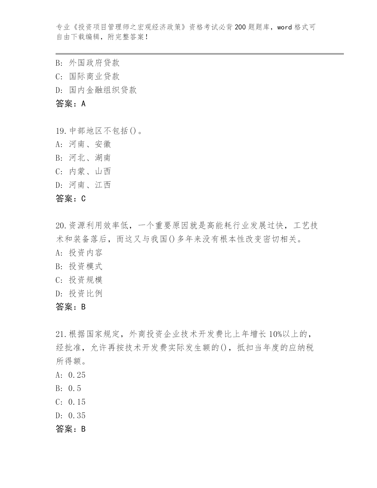 内部使用陕西省宜君县《投资项目管理师之宏观经济政策》资格考试必背200题通关秘籍题库带答案(培优B卷)