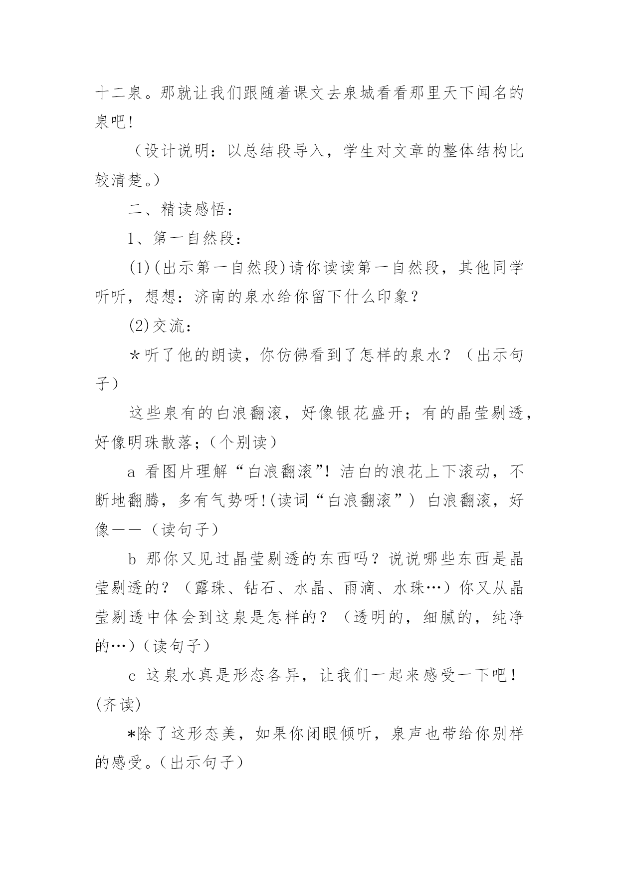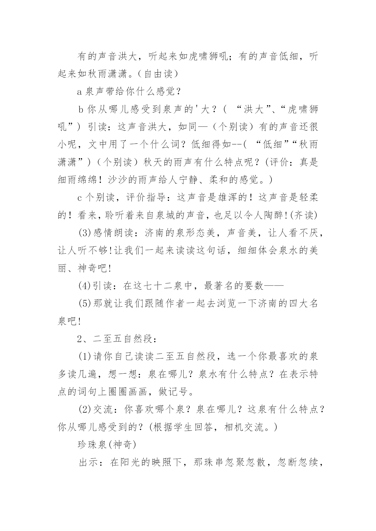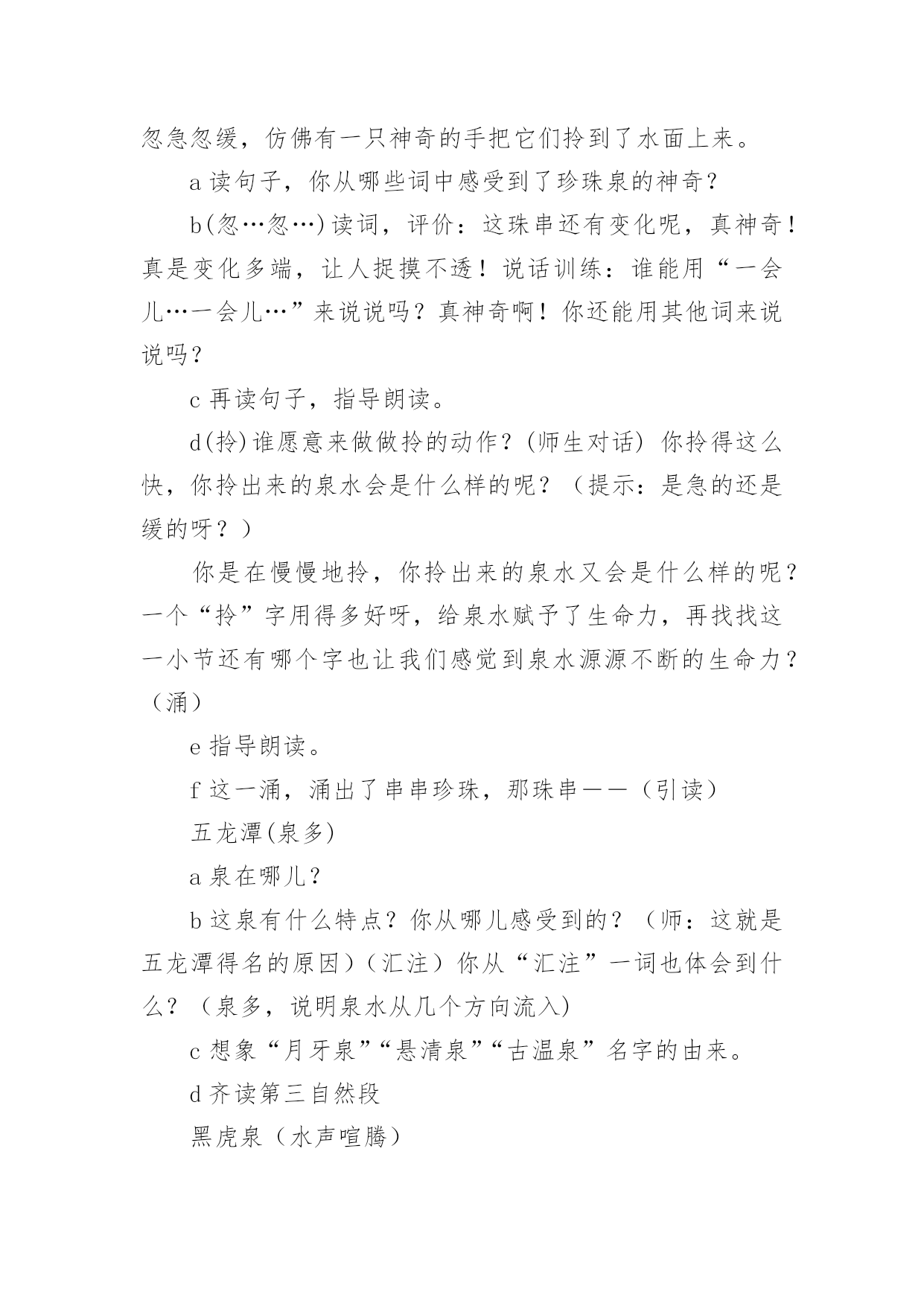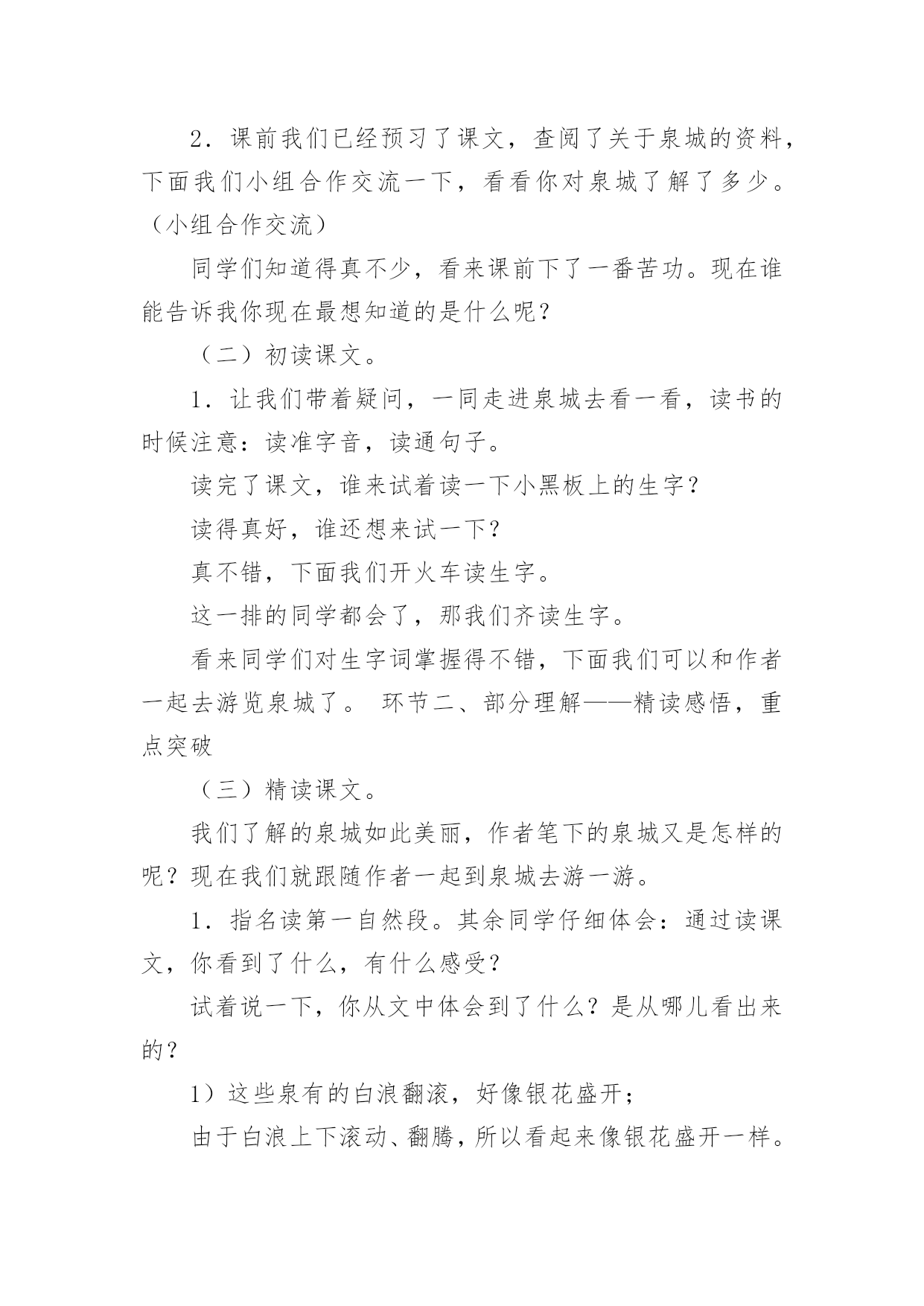 《泉城》教学设计作为一无名无私奉献的教育工作者,往往需要进行教学设计编写工作,教学设计是对学业业绩问题的解决措施进行策划的过程。教学设计应该怎么写呢?以下是小编为大家整理的《泉城》教学设计,仅供参考,欢迎大家阅读。《泉城》教学设计1教学目标:1、能正确、流利、有感情地朗读课文、背诵课文。2、在品词品句中感受济南泉水的美,感受语言文字魅力的同时受到热爱大自然情感熏陶。教学重难点:1、品读词句,感受济南泉水的特点。2、有感情朗读甚至背诵,激发学生乐于表现、热爱自然的情感。教学步骤:一、复习导入,学习第六自然段:1、为什么称济南为“泉城”呢?师评:以泉水而闻名天下,难怪会有这样的别称!2、出示第六自然段,齐读。3、济南的泉水多有名呀!(点出:天下闻名)读词,真是无人不知,无人不晓,真有名呀!再读句子4、过渡:说到泉城济南,人们自然就会想到济南的七十二泉。那就让我们跟随着课文去泉城看看那里天下闻名的泉吧!(设计说明:以总结段导入,学生对文章的整体结构比较清楚。)二、精读感悟:1、第一自然段:(1)(出示第一自然段)请你读读第一自然段,其他同学听听,想想:济南的泉水给你留下什么印象?(2)交流:*听了他的朗读,你仿佛看到了怎样的泉水?(出示句子)这些泉有的白浪翻滚,好像银花盛开;有的晶莹剔透,好像明珠散落;(个别读)a看图片理解“白浪翻滚”!洁白的浪花上下滚动,不断地翻腾,多有气势呀!(读词“白浪翻滚”)白浪翻滚,好像――(读句子)b那你又见过晶莹剔透的东西吗?说说哪些东西是晶莹剔透的?(露珠、钻石、水晶、雨滴、水珠…)你又从晶莹剔透中体会到这泉是怎样的?(透明的,细腻的,纯净的…)(读句子)c这泉水真是形态各异,让我们一起来感受一下吧!(齐读)*除了这形态美,如果你闭眼倾听,泉声也带给你别样的感受。(出示句子)有的声音洪大,听起来如虎啸狮吼;有的声音低细,听起来如秋雨潇潇。(自由读)a泉声带给你什么感觉?b你从哪儿感受到泉声的'大?(“洪大”、“虎啸狮吼”)引读:这声音洪大,如同—(个别读)有的声音还很小呢,文中用了一个什么词?低细得如--(“低细”“秋雨潇潇”)(个别读)秋天的雨声有什么特点呢?(评价:真是细雨绵绵!沙沙的雨声给人宁静、柔和的感觉。)c个别读,评价指导:这声音是雄浑的!这声音是轻柔的!看来,聆听着来自泉城的声音,也足以令人陶醉!(齐读)(3)感情朗读:济南的泉形态美,声音美,让人看不厌,让人听不够!让我们一起来读读这句话,细细体会泉水的美丽、神奇吧!(4)引读:在这七十二泉中,最著名的要数——(5)那就让我们跟随作者一起去浏览一下济南的四大名泉吧!2、二至五自然段:(1)请你自己读读二至五自然段,选一个你最喜欢的泉多读几遍,想一想:泉在哪儿?泉水有什么特点?在表示特点的词句上圈圈画画,做记号。(2)交流:你喜欢哪个泉?泉在哪儿?这泉有什么特点?你从哪儿感受到的?(根据学生回答,相机交流。)珍珠泉(神奇)出示:在阳光的映照下,那珠串忽聚忽散,忽断忽续,忽急忽缓,仿佛有一只神奇的手把它们拎到了水面上来。a读句子,你从哪些词中感受到了珍珠泉的神奇?b(忽…忽…)读词,评价:这珠串还有变化呢,真神奇!真是变化多端,让人捉摸不透!说话训练:谁能用“一会儿…一会儿…”来说说吗?真神奇啊!你还能用其他词来说说吗?c再读句子,指导朗读。d(拎)谁愿意来做做拎的动作?(师生对话)你拎得这么快,你拎出来的泉水会是什么样的呢?(提示:是急的还是缓的呀?)你是在慢慢地拎,你拎出来的泉水又会是什么样的呢?一个“拎”字用得多好呀,给泉水赋予了生命力,再找找这一小节还有哪个字也让我们感觉到泉水源源不断的生命力?(涌)e指导朗读。f这一涌,涌出了串串珍珠,那珠串――(引读)五龙潭(泉多)a泉在哪儿?b这泉有什么特点?你从哪儿感受到的?(师:这就是五龙潭得名的原因)(汇注)你从“汇注”一词也体会到什么?(泉多,说明泉水从几个方向流入)c想象“月牙泉”“悬清泉”“古温泉”名字的由来。d齐读第三自然段黑虎泉(水声喧腾)a你能谈谈对黑虎泉的了解吗?b师相机评价:你了解了它的源头(它的源头也很特别)!我想黑虎泉也是因此而得名的吧!c(出示图片)你看,这就是黑虎泉,泉水不断地从老虎口中喷吐而出(出示词:喷吐),你耳旁仿佛响起什么声音?这声音怎样?(水声喧腾、昼夜不息)(读词)你会用第一自然段学过的句子说说黑虎泉的水声吗?(再读词)多么响亮!多有气势!永不停息!(看图片)d齐读第四自然段趵突泉(大、清、美,充满活力)a泉在哪儿?这泉有什么特点?你从哪儿感受到的?b之首也就是第一!它不仅在七十二泉中位居第一,而且在全国也位居第一,可是天下第一泉呀!c大—差不多占了大半个公园,指导朗读,读出大。d清—清到什么程度呢?真是清澈见底!指导朗读,读出清。e美—如同三堆