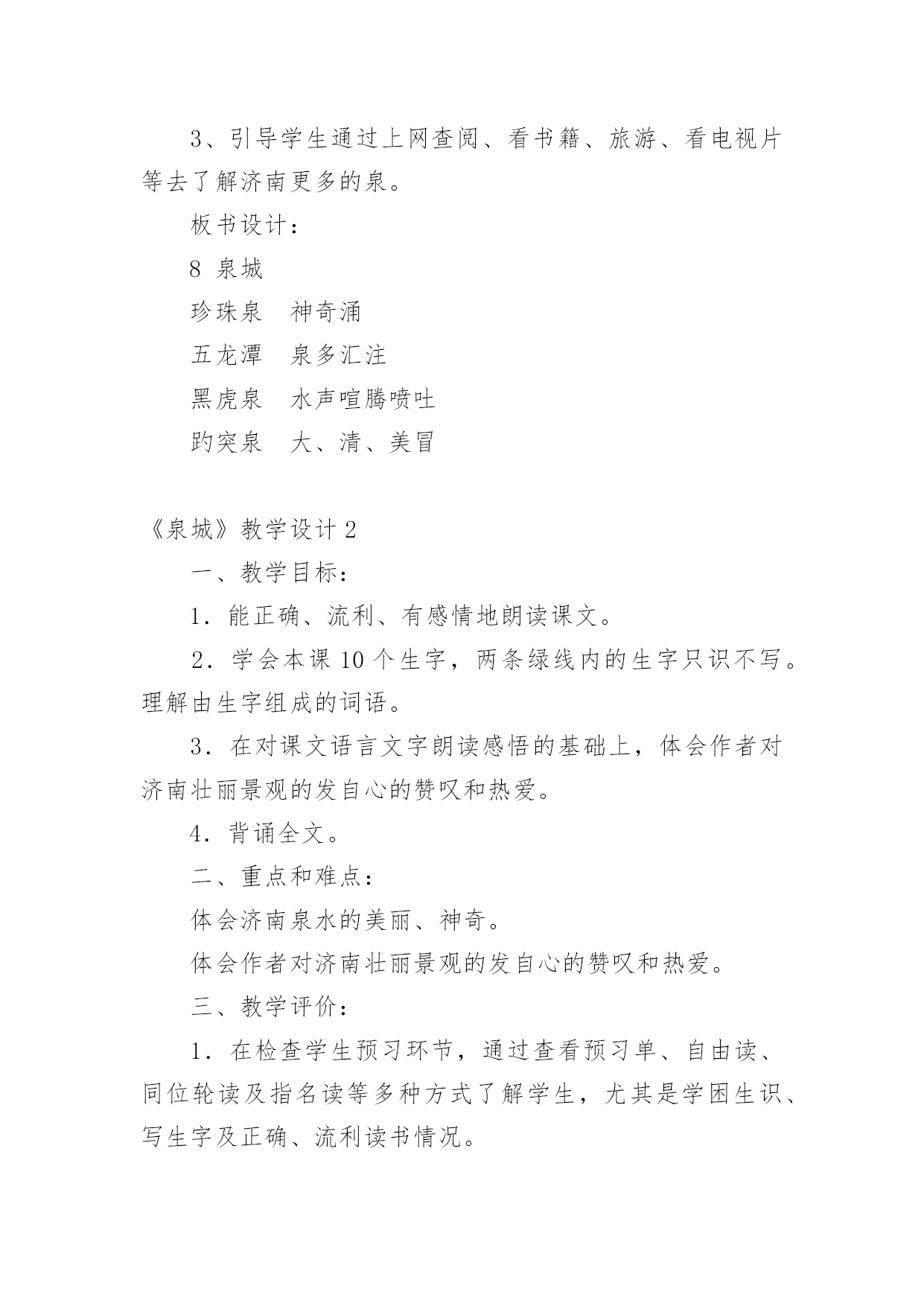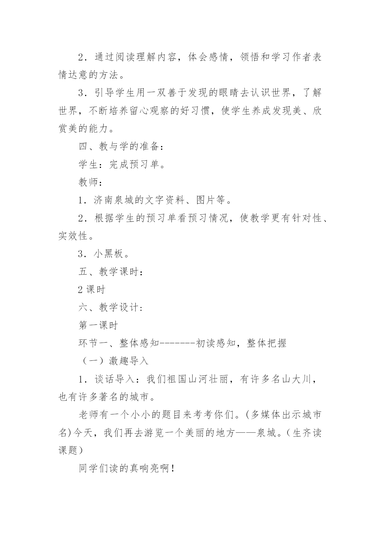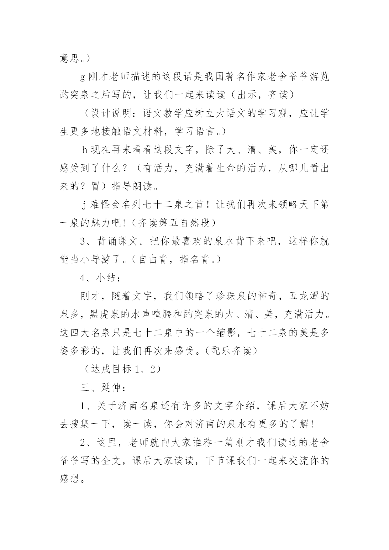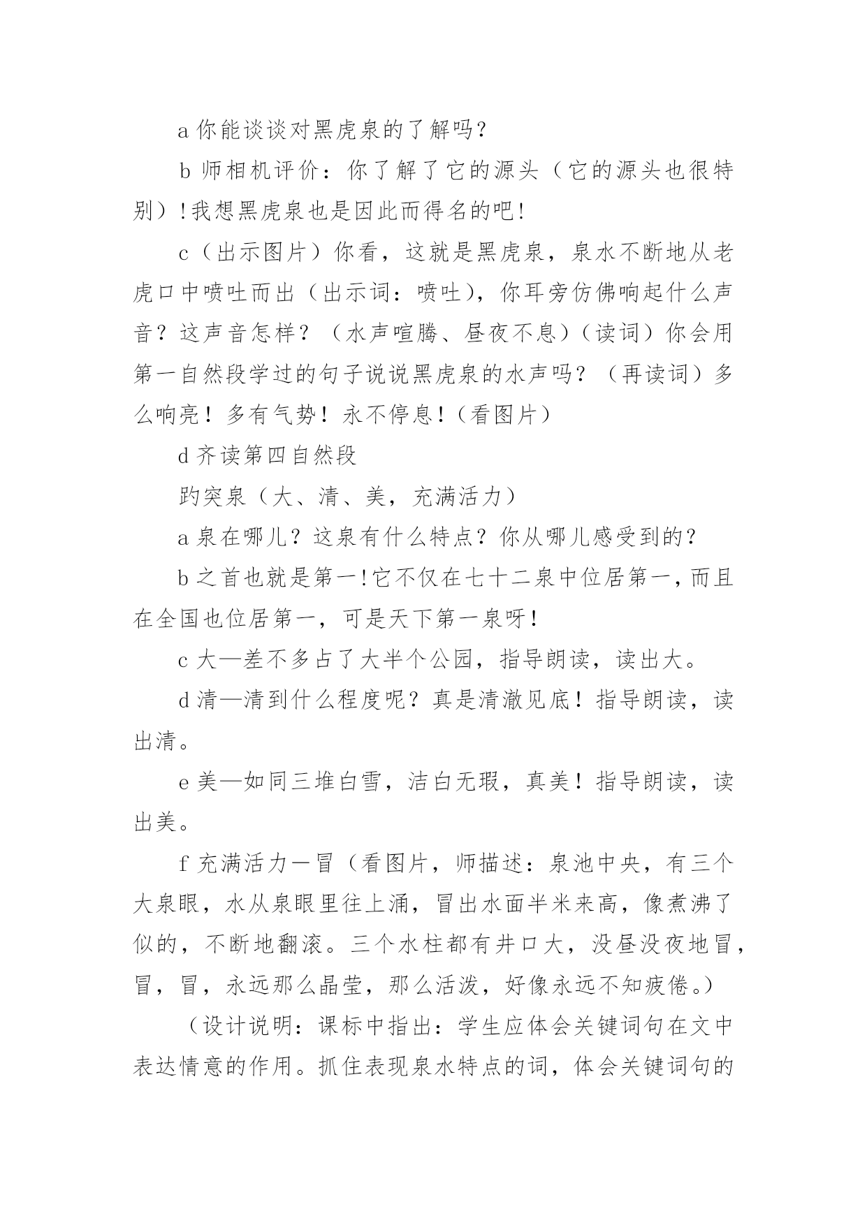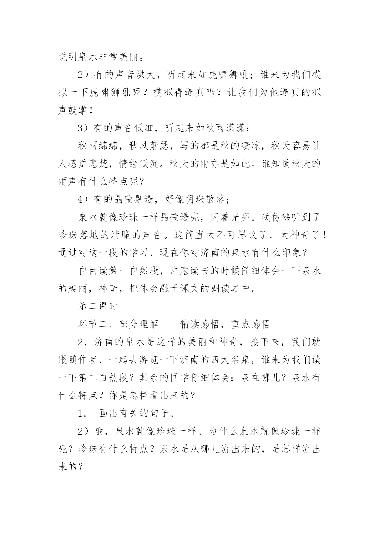 《泉城》教学设计作为一无名无私奉献的教育工作者,往往需要进行教学设计编写工作,教学设计是对学业业绩问题的解决措施进行策划的过程。教学设计应该怎么写呢?以下是小编为大家整理的《泉城》教学设计,仅供参考,欢迎大家阅读。《泉城》教学设计1教学目标:1、能正确、流利、有感情地朗读课文、背诵课文。2、在品词品句中感受济南泉水的美,感受语言文字魅力的同时受到热爱大自然情感熏陶。教学重难点:1、品读词句,感受济南泉水的特点。2、有感情朗读甚至背诵,激发学生乐于表现、热爱自然的情感。教学步骤:一、复习导入,学习第六自然段:1、为什么称济南为“泉城”呢?师评:以泉水而闻名天下,难怪会有这样的别称!2、出示第六自然段,齐读。3、济南的泉水多有名呀!(点出:天下闻名)读词,真是无人不知,无人不晓,真有名呀!再读句子4、过渡:说到泉城济南,人们自然就会想到济南的七十二泉。那就让我们跟随着课文去泉城看看那里天下闻名的泉吧!(设计说明:以总结段导入,学生对文章的整体结构比较清楚。)二、精读感悟:1、第一自然段:(1)(出示第一自然段)请你读读第一自然段,其他同学听听,想想:济南的泉水给你留下什么印象?(2)交流:*听了他的朗读,你仿佛看到了怎样的泉水?(出示句子)这些泉有的白浪翻滚,好像银花盛开;有的晶莹剔透,好像明珠散落;(个别读)a看图片理解“白浪翻滚”!洁白的浪花上下滚动,不断地翻腾,多有气势呀!(读词“白浪翻滚”)白浪翻滚,好像――(读句子)b那你又见过晶莹剔透的东西吗?说说哪些东西是晶莹剔透的?(露珠、钻石、水晶、雨滴、水珠…)你又从晶莹剔透中体会到这泉是怎样的?(透明的,细腻的,纯净的…)(读句子)c这泉水真是形态各异,让我们一起来感受一下吧!(齐读)*除了这形态美,如果你闭眼倾听,泉声也带给你别样的感受。(出示句子)有的声音洪大,听起来如虎啸狮吼;有的声音低细,听起来如秋雨潇潇。(自由读)a泉声带给你什么感觉?b你从哪儿感受到泉声的'大?(“洪大”、“虎啸狮吼”)引读:这声音洪大,如同—(个别读)有的声音还很小呢,文中用了一个什么词?低细得如--(“低细”“秋雨潇潇”)(个别读)秋天的雨声有什么特点呢?(评价:真是细雨绵绵!沙沙的雨声给人宁静、柔和的感觉。)c个别读,评价指导:这声音是雄浑的!这声音是轻柔的!看来,聆听着来自泉城的声音,也足以令人陶醉!(齐读)(3)感情朗读:济南的泉形态美,声音美,让人看不厌,让人听不够!让我们一起来读读这句话,细细体会泉水的美丽、神奇吧!(4)引读:在这七十二泉中,最著名的要数——(5)那就让我们跟随作者一起去浏览一下济南的四大名泉吧!2、二至五自然段:(1)请你自己读读二至五自然段,选一个你最喜欢的泉多读几遍,想一想:泉在哪儿?泉水有什么特点?在表示特点的词句上圈圈画画,做记号。(2)交流:你喜欢哪个泉?泉在哪儿?这泉有什么特点?你从哪儿感受到的?(根据学生回答,相机交流。)珍珠泉(神奇)出示:在阳光的映照下,那珠串忽聚忽散,忽断忽续,忽急忽缓,仿佛有一只神奇的手把它们拎到了水面上来。a读句子,你从哪些词中感受到了珍珠泉的神奇?b(忽…忽…)读词,评价:这珠串还有变化呢,真神奇!真是变化多端,让人捉摸不透!说话训练:谁能用“一会儿…一会儿…”来说说吗?真神奇啊!你还能用其他词来说说吗?c再读句子,指导朗读。d(拎)谁愿意来做做拎的动作?(师生对话)你拎得这么快,你拎出来的泉水会是什么样的呢?(提示:是急的还是缓的呀?)你是在慢慢地拎,你拎出来的泉水又会是什么样的呢?一个“拎”字用得多好呀,给泉水赋予了生命力,再找找这一小节还有哪个字也让我们感觉到泉水源源不断的生命力?(涌)e指导朗读。f这一涌,涌出了串串珍珠,那珠串――(引读)五龙潭(泉多)a泉在哪儿?b这泉有什么特点?你从哪儿感受到的?(师:这就是五龙潭得名的原因)(汇注)你从“汇注”一词也体会到什么?(泉多,说明泉水从几个方向流入)c想象“月牙泉”“悬清泉”“古温泉”名字的由来。d齐读第三自然段黑虎泉(水声喧腾)a你能谈谈对黑虎泉的了解吗?b师相机评价:你了解了它的源头(它的源头也很特别)!我想黑虎泉也是因此而得名的吧!c(出示图片)你看,这就是黑虎泉,泉水不断地从老虎口中喷吐而出(出示词:喷吐),你耳旁仿佛响起什么声音?这声音怎样?(水声喧腾、昼夜不息)(读词)你会用第一自然段学过的句子说说黑虎泉的水声吗?(再读词)多么响亮!多有气势!永不停息!(看图片)d齐读第四自然段趵突泉(大、清、美,充满活力)a泉在哪儿?这泉有什么特点?你从哪儿感受到的?b之首也就是第一!它不仅在七十二泉中位居第一,而且在全国也位居第一,可是天下第一泉呀!c大—差不多占了大半个公园,指导朗读,读出大。d清—清到什么程度呢?真是清澈见底!指导朗读,读出清。e美—如同三堆