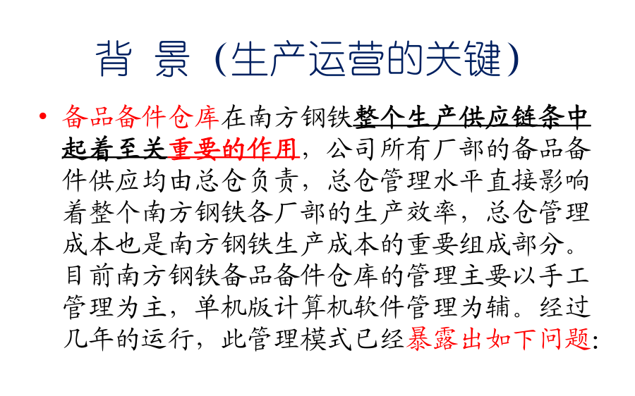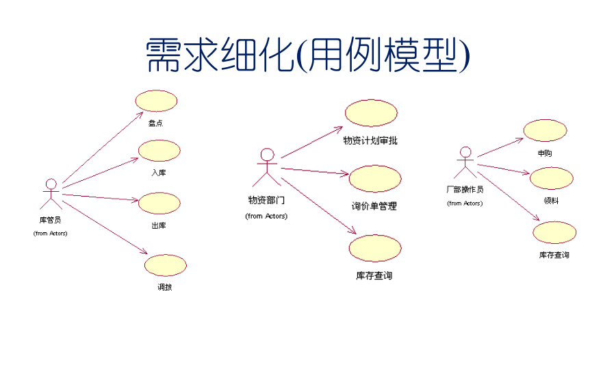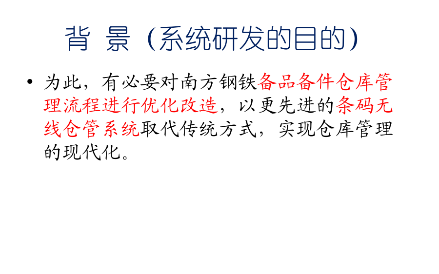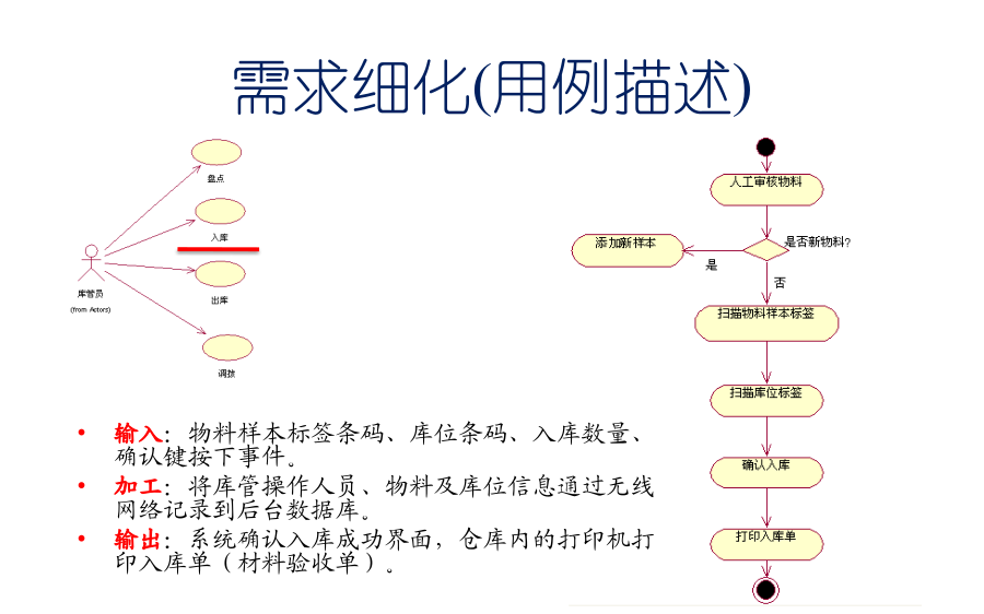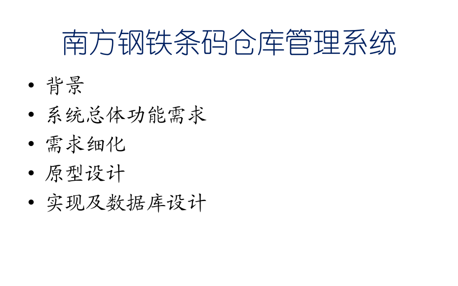 需求分析—案例分析南方钢铁条码仓库管理系统背景背景(生产运营的关键)背景(关键环节暴露的问题)背景(系统研发的目的)系统总体功能需求需求细化(用例模型)需求细化(用例描述)需求细化(软件需求规格说明)需求细化(标准用例描述)需求细化(原系统调研)—微商运行主界面需求细化(原系统调研)—微商运行主界面需求细化(原系统调研)—使用“开入库单”需求细化(原系统调研)—“开入库单”主界面需求细化(原系统调研)—“新增单子”需求细化(原系统调研)—“新增单子”需求细化(原系统调研)—“增加供应商”主界面需求细化(原系统调研)—“增加供应商”选择“所有供应商分类”需求细化(原系统调研)—“增加供应商”选择“所以供应商分类”需求细化(原系统调研)—“增加供应商”选择具体供应商需求细化(原系统调研)—增加商品需求细化(原系统调研)—增加商品需求细化(原系统调研)—审核后需求细化(原系统调研)—记账后需求细化(原系统调研)—打印需求细化(原系统调研)原型设计—“仓管中心”的“开入库单”原型设计—“新增入库单”选择“选择物资”原型设计—“新增入库单”选择“物资编号/名称查询”原型设计—“新增入库单”选择“库位编号查询”原型设计—“新增入库单”选择“供应商查询”原型设计—“新增入库单”选择“打印”原型设计原型设计(简化)数据库设计与实现作业