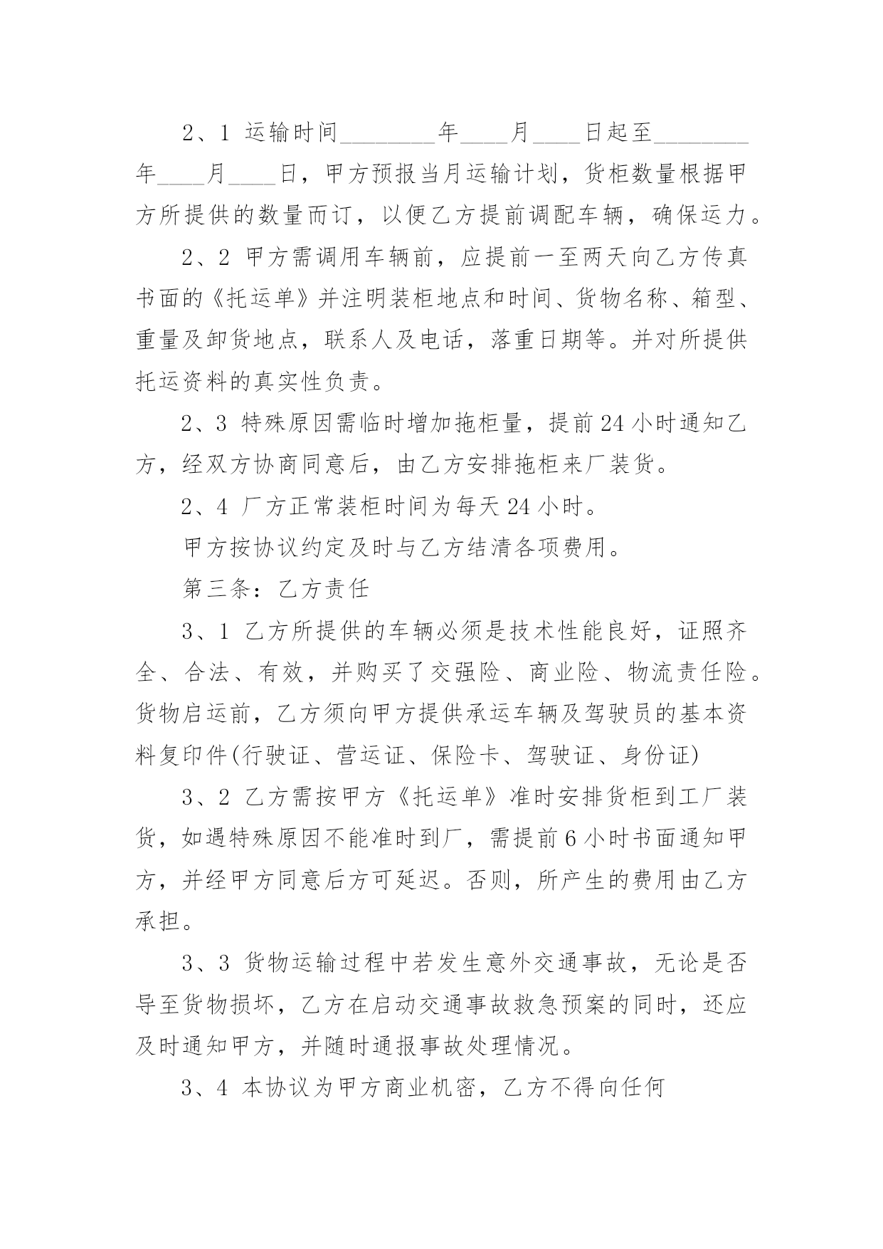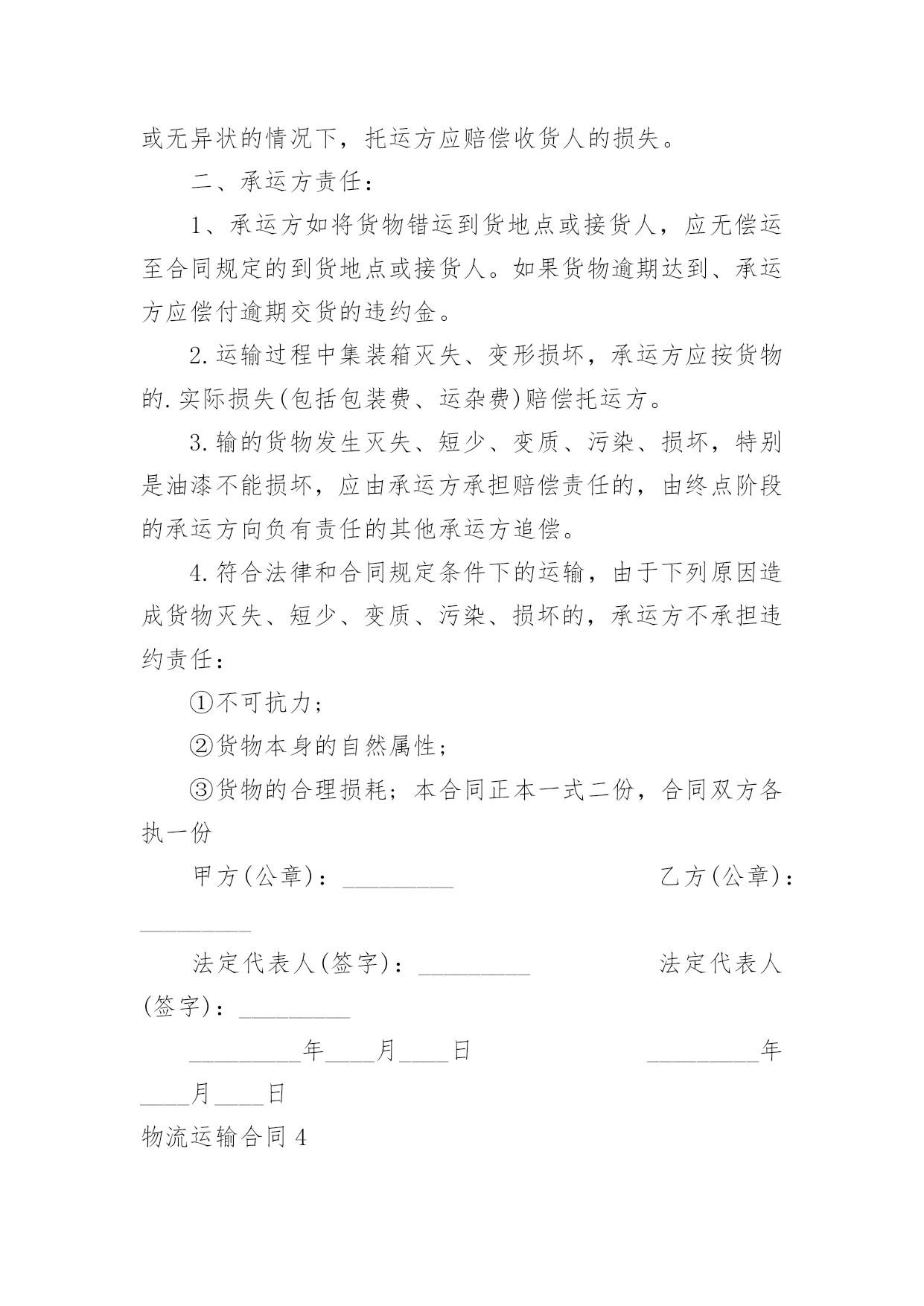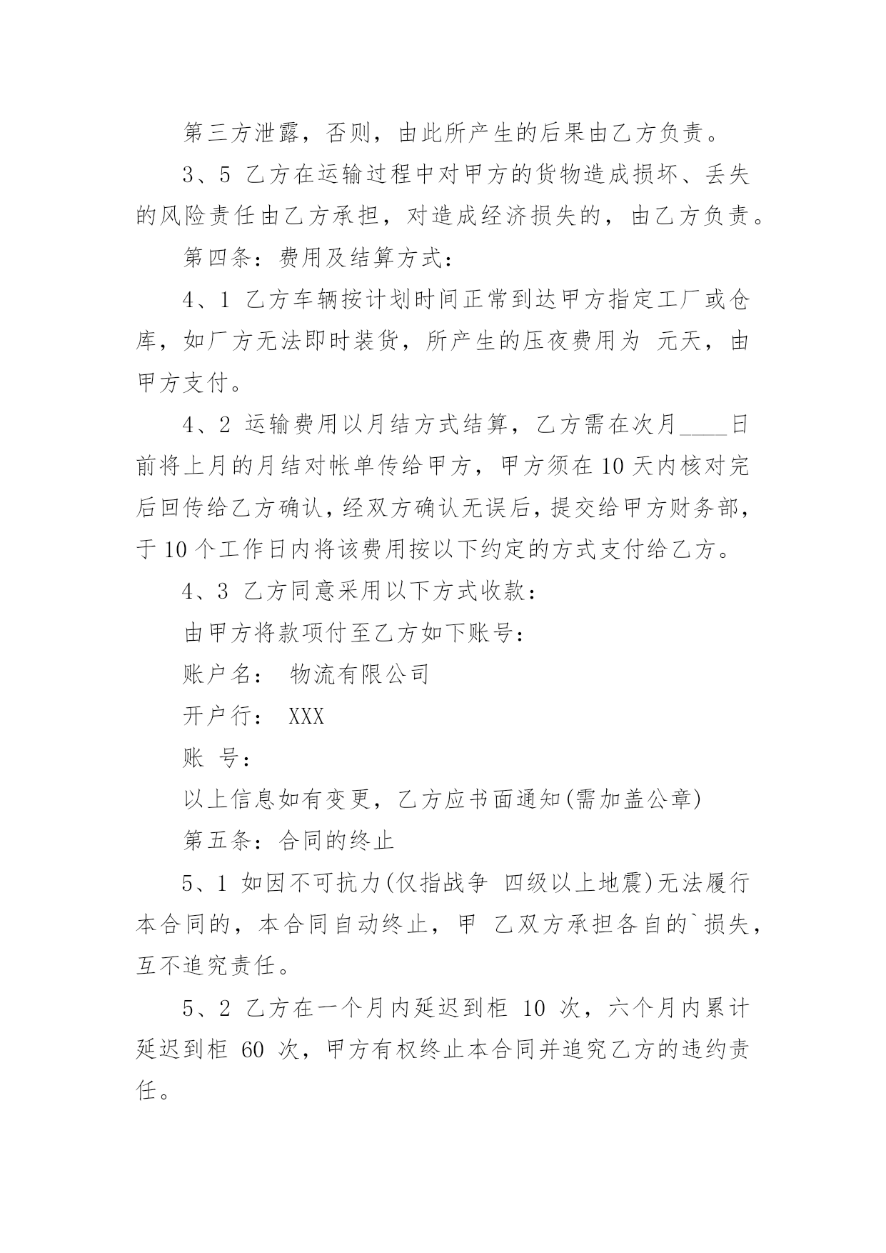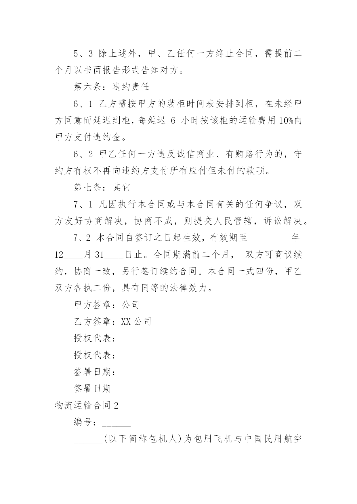 物流运输合同物流运输合同合集15篇在人们越来越相信法律的社会中,人们运用到合同的场合不断增多,签订合同也是最有效的法律依据之一。那么常见的合同书是什么样的呢?以下是小编为大家收集的物流运输合同,希望能够帮助到大家。物流运输合同1委托方:贸易公司(以下简称甲方)承运方:物流有限公司(以下简称乙方)鉴于甲方和乙方依法设立且合法存续,双方本着公平、平等、等价有偿和诚信原则,依据《中华人民共和国合同法》等相关法律法规的规定,就甲方委托乙方承运货物事宜签订本合同,以资共同信守:第一条:运输费用1、1甲乙双方建立战略商业伙伴关系,乙方给甲方最优惠的价格。1、2运输费用以甲乙双方签章确认的乙方报价单为准,该报价单作为本合同的不可分割的一部分。1、3如果乙方需变更价格,须提前1个月书面通知甲方。经甲方书面确认后,方可执行,否则,甲乙双方按变更前的价格结算。第二条:甲方责任2、1运输时间________年____月____日起至________年____月____日,甲方预报当月运输计划,货柜数量根据甲方所提供的数量而订,以便乙方提前调配车辆,确保运力。2、2甲方需调用车辆前,应提前一至两天向乙方传真书面的《托运单》并注明装柜地点和时间、货物名称、箱型、重量及卸货地点,联系人及电话,落重日期等。并对所提供托运资料的真实性负责。2、3特殊原因需临时增加拖柜量,提前24小时通知乙方,经双方协商同意后,由乙方安排拖柜来厂装货。2、4厂方正常装柜时间为每天24小时。甲方按协议约定及时与乙方结清各项费用。第三条:乙方责任3、1乙方所提供的车辆必须是技术性能良好,证照齐全、合法、有效,并购买了交强险、商业险、物流责任险。货物启运前,乙方须向甲方提供承运车辆及驾驶员的基本资料复印件(行驶证、营运证、保险卡、驾驶证、身份证)3、2乙方需按甲方《托运单》准时安排货柜到工厂装货,如遇特殊原因不能准时到厂,需提前6小时书面通知甲方,并经甲方同意后方可延迟。否则,所产生的费用由乙方承担。3、3货物运输过程中若发生意外交通事故,无论是否导至货物损坏,乙方在启动交通事故救急预案的同时,还应及时通知甲方,并随时通报事故处理情况。3、4本协议为甲方商业机密,乙方不得向任何第三方泄露,否则,由此所产生的后果由乙方负责。3、5乙方在运输过程中对甲方的货物造成损坏、丢失的风险责任由乙方承担,对造成经济损失的,由乙方负责。第四条:费用及结算方式:4、1乙方车辆按计划时间正常到达甲方指定工厂或仓库,如厂方无法即时装货,所产生的压夜费用为元天,由甲方支付。4、2运输费用以月结方式结算,乙方需在次月____日前将上月的月结对帐单传给甲方,甲方须在10天内核对完后回传给乙方确认,经双方确认无误后,提交给甲方财务部,于10个工作日内将该费用按以下约定的方式支付给乙方。4、3乙方同意采用以下方式收款:由甲方将款项付至乙方如下账号:账户名:物流有限公司开户行:XXX账号:以上信息如有变更,乙方应书面通知(需加盖公章)第五条:合同的终止5、1如因不可抗力(仅指战争四级以上地震)无法履行本合同的,本合同自动终止,甲乙双方承担各自的`损失,互不追究责任。5、2乙方在一个月内延迟到柜10次,六个月内累计延迟到柜60次,甲方有权终止本合同并追究乙方的违约责任。5、3除上述外,甲、乙任何一方终止合同,需提前二个月以书面报告形式告知对方。第六条:违约责任6、1乙方需按甲方的装柜时间表安排到柜,在未经甲方同意而延迟到柜,每延迟6小时按该柜的运输费用10%向甲方支付违约金。6、2甲乙任何一方违反诚信商业、有贿赂行为的,守约方有权不再向违约方支付所有应付但未付的款项。第七条:其它7、1凡因执行本合同或与本合同有关的任何争议,双方友好协商解决,协商不成,则提交人民管辖,诉讼解决。7、2本合同自签订之日起生效,有效期至________年12____月31____日止。合同期满前二个月,双方可商议续约,协商一致,另行签订续约合同。本合同一式四份,甲乙双方各执二份,具有同等的法律效力。甲方签章:公司乙方签章:XX公司授权代表:授权代表:签署日期:签署日期物流运输合同2编号:____________(以下简称包机人)为包用飞机与中国民用航空______的售票服务处(以下简称承运人)签订本协议书,双方同意遵守下列条款:(一)包机人于______月______日起包用______型飞机______架次,其航程如下:______月______日自______至______,停留______日______月______日自______至______,停留______日______月______日自______至______,停留______日包机费用总共__________元。(二)根据包机航程及经停站。可供包机人使用的最大载量为