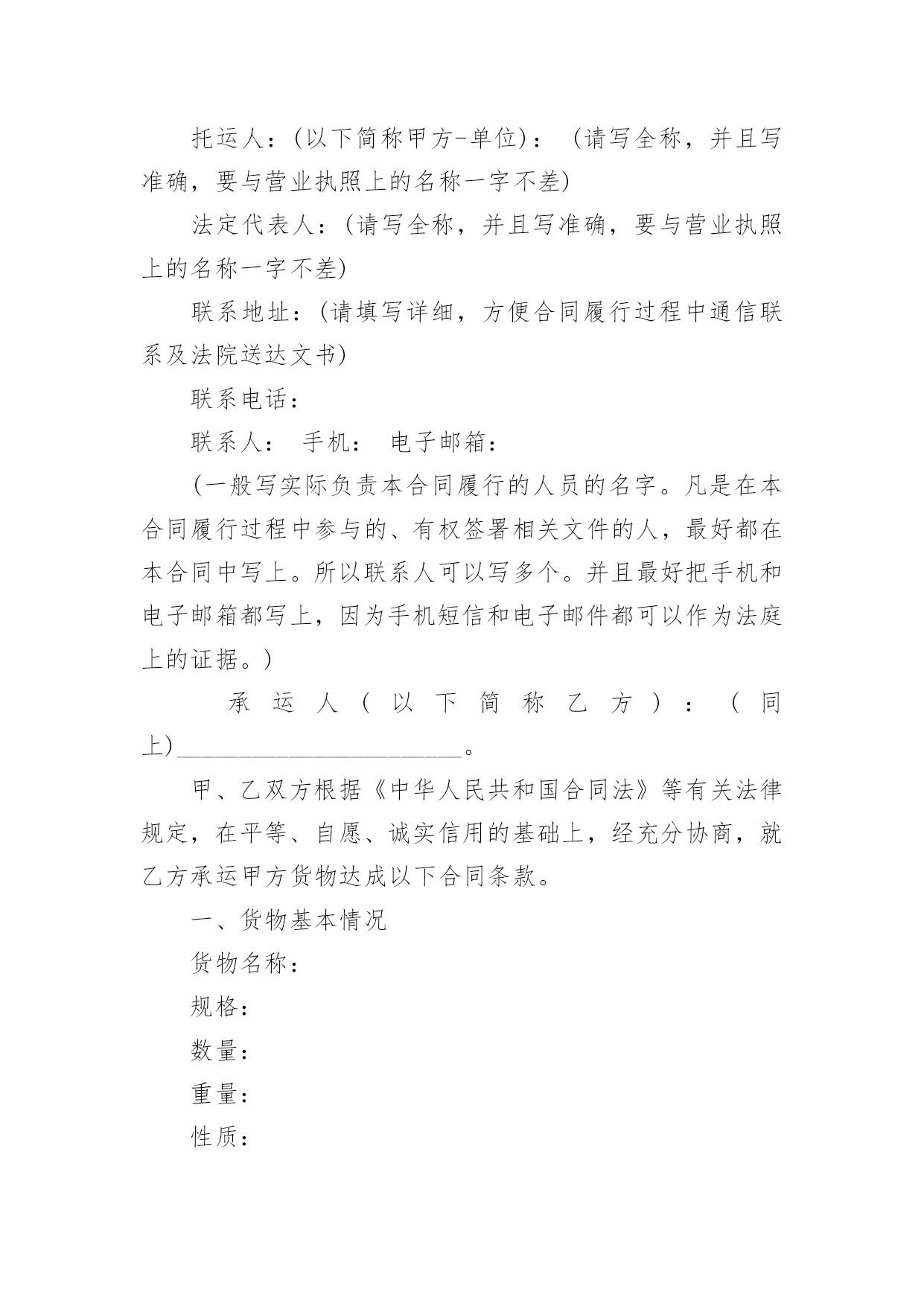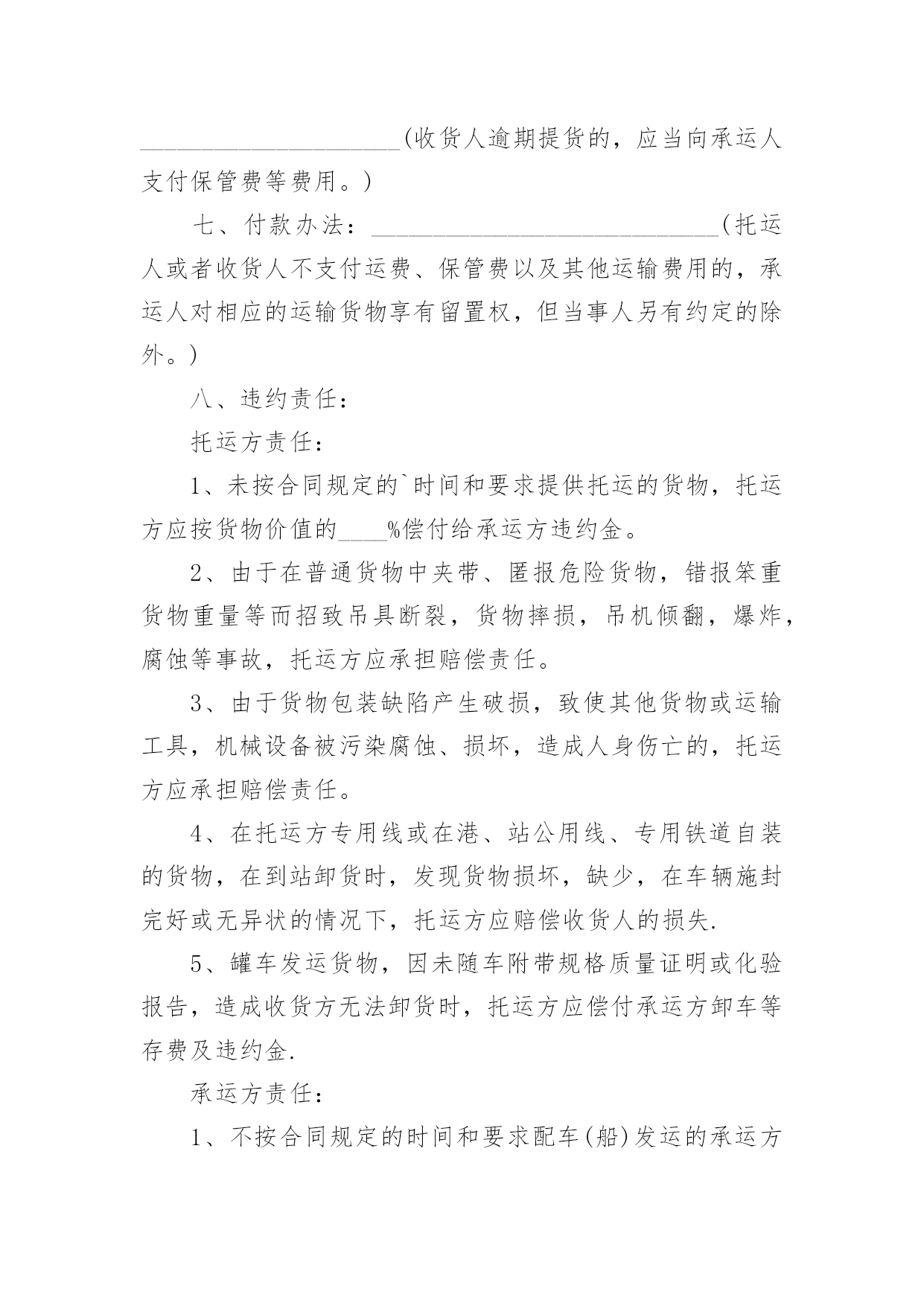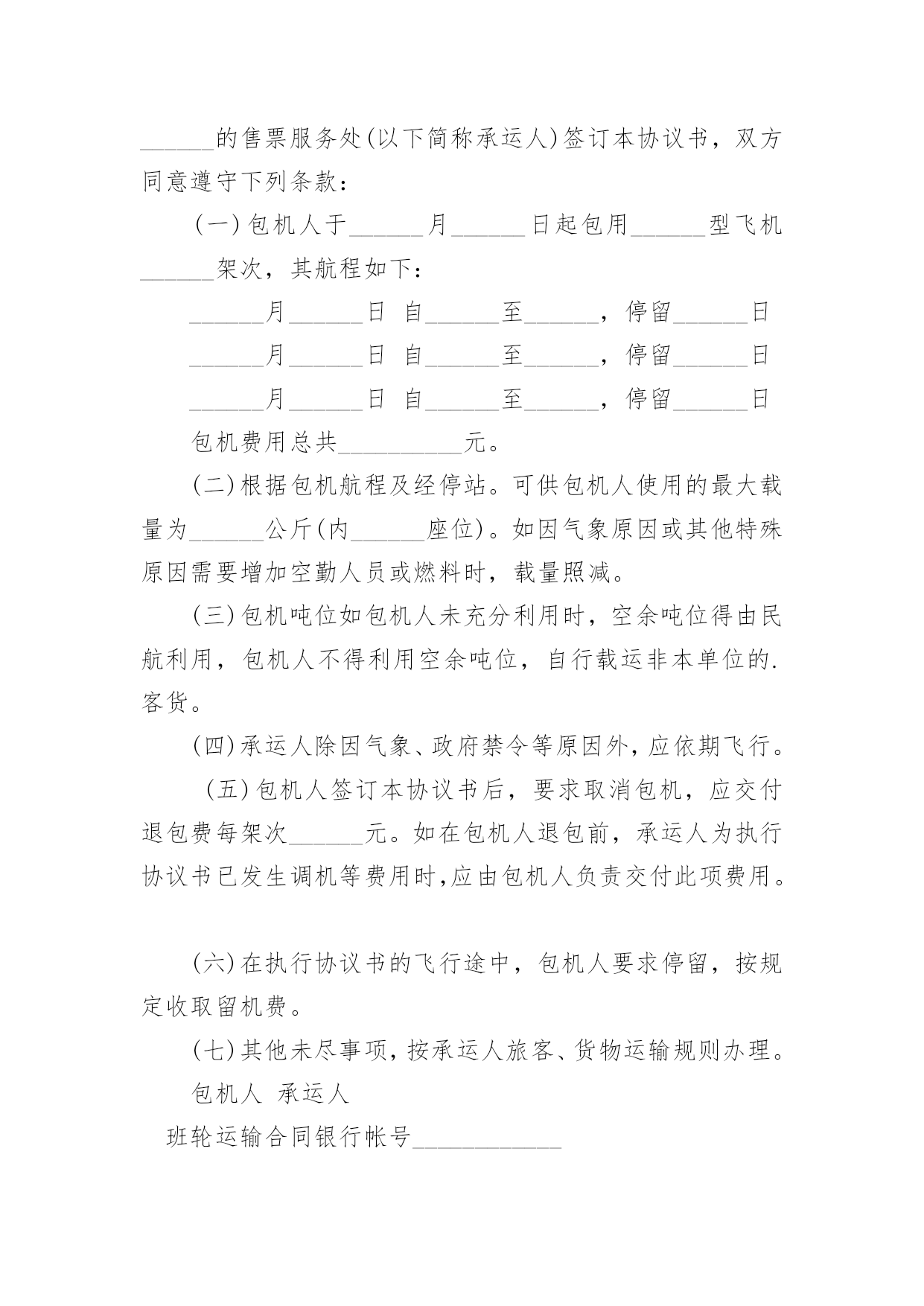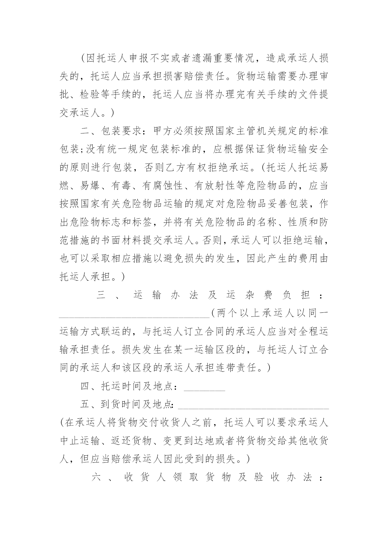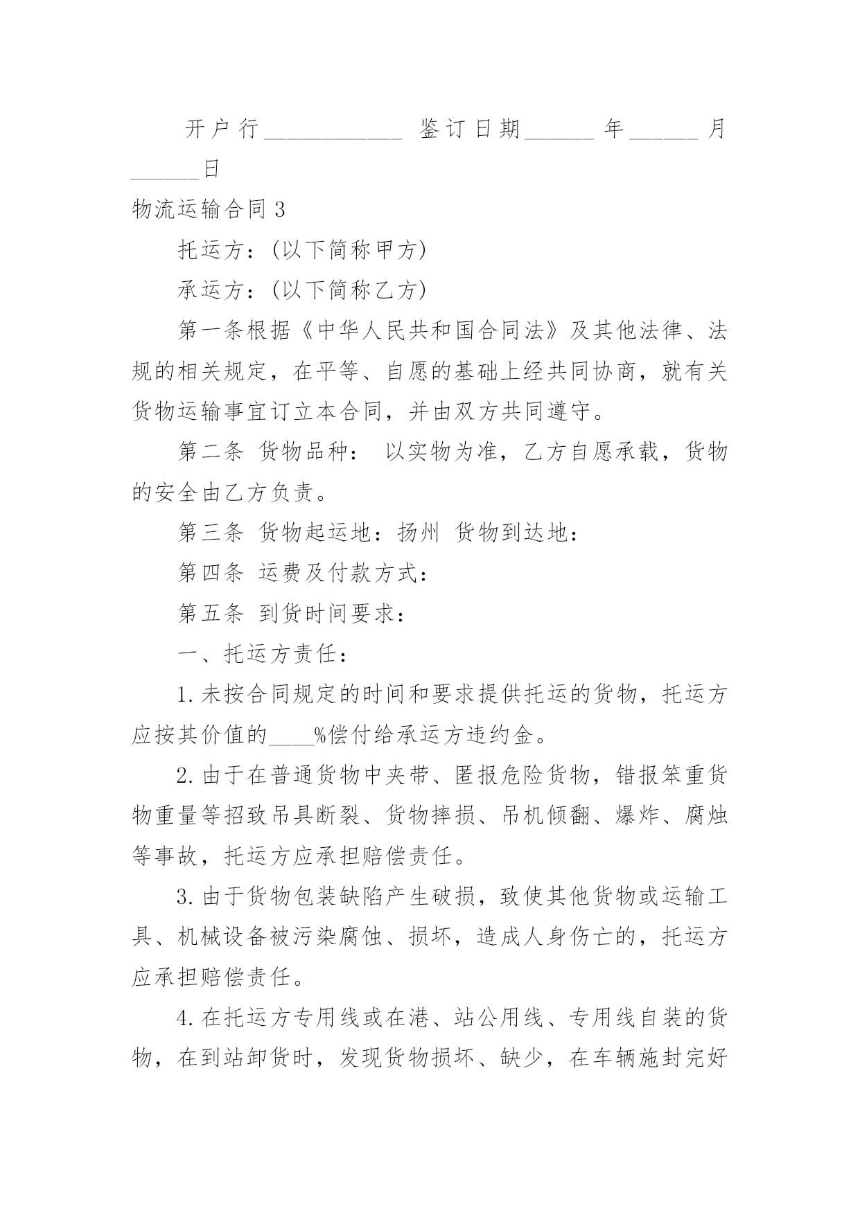 物流运输合同物流运输合同合集15篇在人们越来越相信法律的社会中,人们运用到合同的场合不断增多,签订合同也是最有效的法律依据之一。那么常见的合同书是什么样的呢?以下是小编为大家收集的物流运输合同,希望能够帮助到大家。物流运输合同1委托方:贸易公司(以下简称甲方)承运方:物流有限公司(以下简称乙方)鉴于甲方和乙方依法设立且合法存续,双方本着公平、平等、等价有偿和诚信原则,依据《中华人民共和国合同法》等相关法律法规的规定,就甲方委托乙方承运货物事宜签订本合同,以资共同信守:第一条:运输费用1、1甲乙双方建立战略商业伙伴关系,乙方给甲方最优惠的价格。1、2运输费用以甲乙双方签章确认的乙方报价单为准,该报价单作为本合同的不可分割的一部分。1、3如果乙方需变更价格,须提前1个月书面通知甲方。经甲方书面确认后,方可执行,否则,甲乙双方按变更前的价格结算。第二条:甲方责任2、1运输时间________年____月____日起至________年____月____日,甲方预报当月运输计划,货柜数量根据甲方所提供的数量而订,以便乙方提前调配车辆,确保运力。2、2甲方需调用车辆前,应提前一至两天向乙方传真书面的《托运单》并注明装柜地点和时间、货物名称、箱型、重量及卸货地点,联系人及电话,落重日期等。并对所提供托运资料的真实性负责。2、3特殊原因需临时增加拖柜量,提前24小时通知乙方,经双方协商同意后,由乙方安排拖柜来厂装货。2、4厂方正常装柜时间为每天24小时。甲方按协议约定及时与乙方结清各项费用。第三条:乙方责任3、1乙方所提供的车辆必须是技术性能良好,证照齐全、合法、有效,并购买了交强险、商业险、物流责任险。货物启运前,乙方须向甲方提供承运车辆及驾驶员的基本资料复印件(行驶证、营运证、保险卡、驾驶证、身份证)3、2乙方需按甲方《托运单》准时安排货柜到工厂装货,如遇特殊原因不能准时到厂,需提前6小时书面通知甲方,并经甲方同意后方可延迟。否则,所产生的费用由乙方承担。3、3货物运输过程中若发生意外交通事故,无论是否导至货物损坏,乙方在启动交通事故救急预案的同时,还应及时通知甲方,并随时通报事故处理情况。3、4本协议为甲方商业机密,乙方不得向任何第三方泄露,否则,由此所产生的后果由乙方负责。3、5乙方在运输过程中对甲方的货物造成损坏、丢失的风险责任由乙方承担,对造成经济损失的,由乙方负责。第四条:费用及结算方式:4、1乙方车辆按计划时间正常到达甲方指定工厂或仓库,如厂方无法即时装货,所产生的压夜费用为元天,由甲方支付。4、2运输费用以月结方式结算,乙方需在次月____日前将上月的月结对帐单传给甲方,甲方须在10天内核对完后回传给乙方确认,经双方确认无误后,提交给甲方财务部,于10个工作日内将该费用按以下约定的方式支付给乙方。4、3乙方同意采用以下方式收款:由甲方将款项付至乙方如下账号:账户名:物流有限公司开户行:XXX账号:以上信息如有变更,乙方应书面通知(需加盖公章)第五条:合同的终止5、1如因不可抗力(仅指战争四级以上地震)无法履行本合同的,本合同自动终止,甲乙双方承担各自的`损失,互不追究责任。5、2乙方在一个月内延迟到柜10次,六个月内累计延迟到柜60次,甲方有权终止本合同并追究乙方的违约责任。5、3除上述外,甲、乙任何一方终止合同,需提前二个月以书面报告形式告知对方。第六条:违约责任6、1乙方需按甲方的装柜时间表安排到柜,在未经甲方同意而延迟到柜,每延迟6小时按该柜的运输费用10%向甲方支付违约金。6、2甲乙任何一方违反诚信商业、有贿赂行为的,守约方有权不再向违约方支付所有应付但未付的款项。第七条:其它7、1凡因执行本合同或与本合同有关的任何争议,双方友好协商解决,协商不成,则提交人民管辖,诉讼解决。7、2本合同自签订之日起生效,有效期至________年12____月31____日止。合同期满前二个月,双方可商议续约,协商一致,另行签订续约合同。本合同一式四份,甲乙双方各执二份,具有同等的法律效力。甲方签章:公司乙方签章:XX公司授权代表:授权代表:签署日期:签署日期物流运输合同2编号:____________(以下简称包机人)为包用飞机与中国民用航空______的售票服务处(以下简称承运人)签订本协议书,双方同意遵守下列条款:(一)包机人于______月______日起包用______型飞机______架次,其航程如下:______月______日自______至______,停留______日______月______日自______至______,停留______日______月______日自______至______,停留______日包机费用总共__________元。(二)根据包机航程及经停站。可供包机人使用的最大载量为