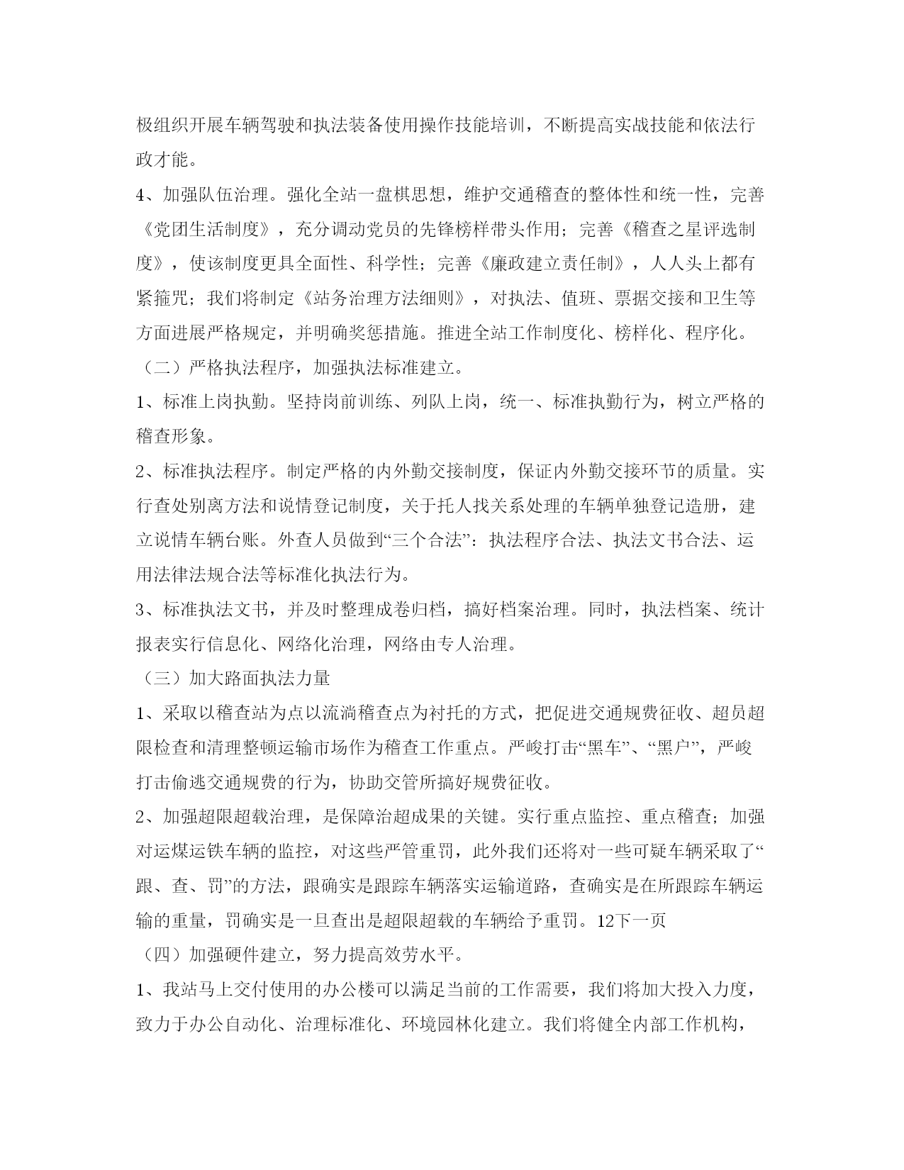 交通稽查站执法策划安排为了保证我县道路运输市场秩序,构成和谐交通大格局,实在加强稽查的工作职能,依照局党委关于“年度交通工作的总体部署”的要求,制定我站年稽查工作打算。一、指导思想以党的xx大和xx届六中全会精神为指导,贯彻执行以稽查支队和局党委关于稽查工作的重要指示,充分发挥交通稽查的特点和优势,落实标准化稽查站的总体规划,健全稽查党员干部的培训打算,完善工作制度,改良工作方法,加大工作力度,构成治超长效机制,为我县经济的跨越开展保驾护航,为繁荣道路运输市场营建良好的气氛。二、主要任务(一)大力加强思想政治教育和专业知识培训,不断提高队伍综合素养1、队伍建立目的。全体人员的职业道德素养明显提高,人人都能领先锋,个个都能挑重担,在执法过程中可以自觉做到遵章守纪,举止文明,遵守职责,严守程序,严肃执法,不枉不纵,有错必纠,执法水平和执法效率大为提高。2、加强思想政治教育,提高政治素养。完善学习制度和学习培训打算,要依照情势和工作需要,认真组织全体执法人员学习邓小平理论和“三个代表”重要思想,学习国家大政方针及省厅和市交通局的有关文件,积极开展政治教育和“四项教育”等各项政治理论学习,做好学习笔记,并定期地进展考试,考试成绩与年底评先选优挂钩。3、加强培训,提高专业文化素养。注重加强业务学习和培训,组织执法人员认真学习有关的法律法规和微机、英语、计算机、财会等相关文化知识的学习。在系统学习的根底上,重点学习《行政许可法》、《道路交通平安法》和《道路运输条例》,建立单位培训档案和个人学习档案。同时,我们将在明年月份组织队列及执法指挥动作等方面的训练,采取封闭式训练,使整体军事素养明显提高;积极组织开展车辆驾驶和执法装备使用操作技能培训,不断提高实战技能和依法行政才能。4、加强队伍治理。强化全站一盘棋思想,维护交通稽查的整体性和统一性,完善《党团生活制度》,充分调动党员的先锋榜样带头作用;完善《稽查之星评选制度》,使该制度更具全面性、科学性;完善《廉政建立责任制》,人人头上都有紧箍咒;我们将制定《站务治理方法细则》,对执法、值班、票据交接和卫生等方面进展严格规定,并明确奖惩措施。推进全站工作制度化、榜样化、程序化。(二)严格执法程序,加强执法标准建立。1、标准上岗执勤。坚持岗前训练、列队上岗,统一、标准执勤行为,树立严格的稽查形象。2、标准执法程序。制定严格的内外勤交接制度,保证内外勤交接环节的质量。实行查处别离方法和说情登记制度,关于托人找关系处理的车辆单独登记造册,建立说情车辆台账。外查人员做到“三个合法”:执法程序合法、执法文书合法、运用法律法规合法等标准化执法行为。3、标准执法文书,并及时整理成卷归档,搞好档案治理。同时,执法档案、统计报表实行信息化、网络化治理,网络由专人治理。(三)加大路面执法力量1、采取以稽查站为点以流淌稽查点为衬托的方式,把促进交通规费征收、超员超限检查和清理整顿运输市场作为稽查工作重点。严峻打击“黑车”、“黑户”,严峻打击偷逃交通规费的行为,协助交管所搞好规费征收。2、加强超限超载治理,是保障治超成果的关键。实行重点监控、重点稽查;加强对运煤运铁车辆的监控,对这些严管重罚,此外我们还将对一些可疑车辆采取了“跟、查、罚”的方法,跟确实是跟踪车辆落实运输道路,查确实是在所跟踪车辆运输的重量,罚确实是一旦查出是超限超载的车辆给予重罚。12下一页(四)加强硬件建立,努力提高效劳水平。1、我站马上交付使用的办公楼可以满足当前的工作需要,我们将加大投入力度,致力于办公自动化、治理标准化、环境园林化建立。我们将健全内部工作机构,按照交通稽查系统标准化建立的详细标准,逐项逐条认真对照施行,力争使我站的标准化达标水平进入全省前列。2、提高优质效劳的才能和水平。从表达效劳主旨出发,改变单纯稽查为效劳稽查,实在转变职能,改良和加强工作作风,努力为治理对象办实事、做好事,进一步树立交通“为民、高效、务实、廉洁”的良好形象。