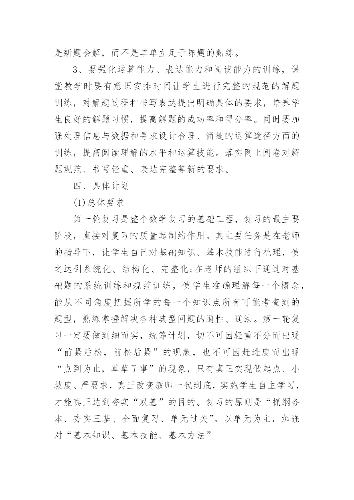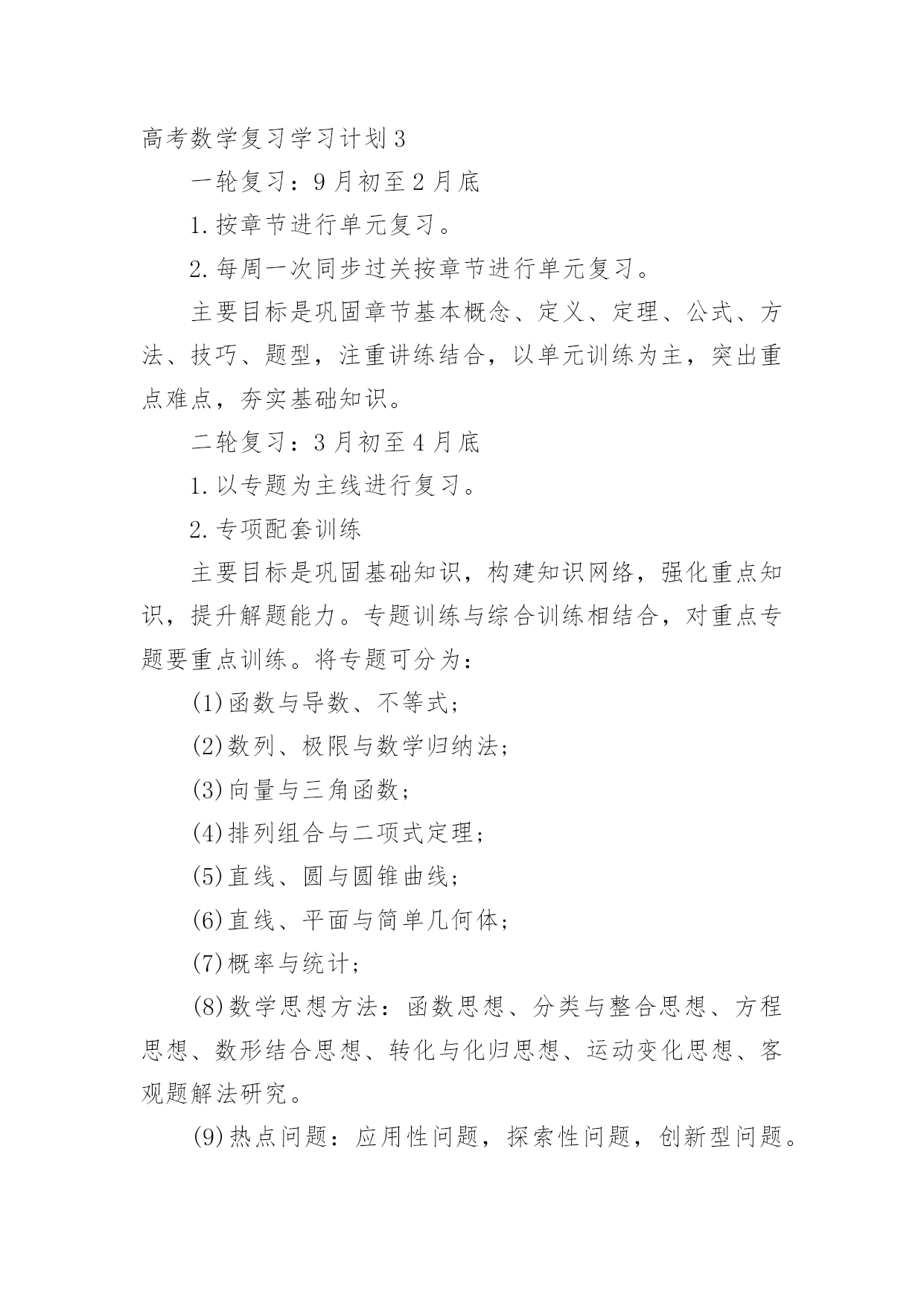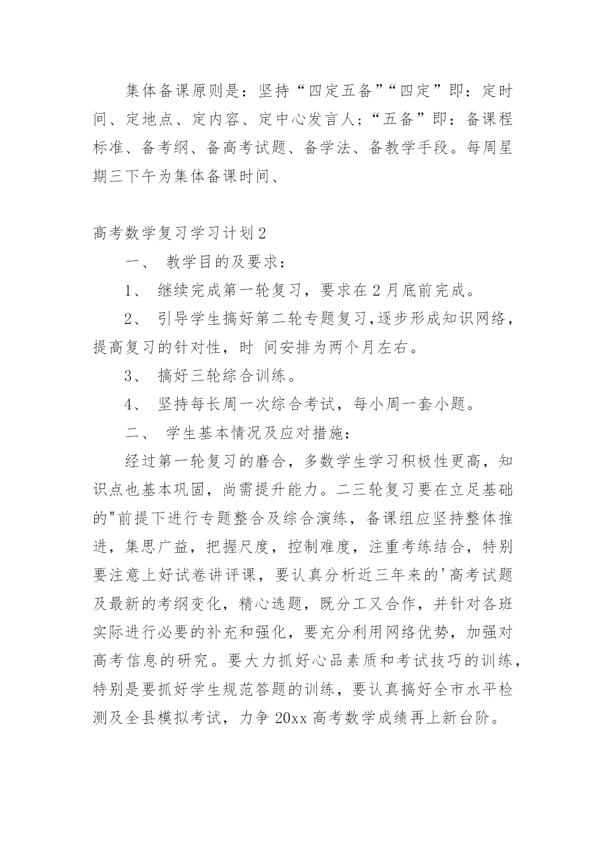 高考数学复习学习计划时间就如同白驹过隙般的流逝,成绩已属于过去,新一轮的工作即将来临,让我们一起来学习写计划吧。好的计划都具备一些什么特点呢?以下是小编帮大家整理的高考数学复习学习计划,仅供参考,欢迎大家阅读。高考数学复习学习计划1一、背景分析近几年来的高考数学试题逐步做到科学化、规范化,坚持了稳中求改、稳中创新的原则。考试题不但坚持了考查全面、比例适当,布局合理的特点,也突出体现了变知识立意为能力立意这一举措。更加注重考查学生进入高校学习所需的基本数学素养,这些变化应引起我们在教学中的关注和重视。二、指导思想在全面推行素质教育的背景下,努力提高课堂复习效率是高三数学复习的重要任务。通过复习,让学生在数学学习过程中,更好地学会从事社会生产和进一步学习所必需的数学基础知识,从而培养学生思维能力,激发学生学习数学的兴趣,使学生树立学好数学的信心。老师要在教学过程中不断了解新的教学信息,更新教育观念,探求新的教学模式,加强教改力度,准确把握课程标准和考试说明的各项基本要求,立足基本知识、基本技能、基本思想和基本方法教学,针对学生实际,指导学法,着力培养学生的创新能力和运用数学的意识和能力。三、目标要求第一轮复习要结合高考考点,紧扣教材,以加强双基教学为主线,以提高学生能力为目标,加强学生对知识的理解、联系、应用,同时结合高考题型强化训练,提高学生的解题能力。为此,我们确立了一轮复习的总体目标:通过梳理考点,培养学生分析问题、解决问题的能力;使学生养成思考严谨、分析条理、解答正确、书写规范的良好习惯,为二轮复习乃至高考奠定坚实的基础。具体要求如下:1、第一轮复习必须面向全体学生,降低复习起点,在夯实双基的前提下,注重培养学生的能力,包括:空间想象、抽象概括、推理论证、运算求解、数据处理等基本能力。提高学生对实际问题的阅读理解、思考判断能力;以及数学地提出、分析和解决问题(包括简单的实际问题)的能力,数学表达和交流的能力,发展独立获取数学知识的能力。复习教学要充分考虑到本班学生的实际水平,坚决反对脱离学生实际的任意拔高和只抓几个“优等生”放弃大部分“中等生”的不良做法,不做或少做无效劳动,加大分层教学和个别指导的力度,狠抓复习的针对性、实效性,提高复习效果。2、在将基础问题学实学活的同时,重视数学思想方法的复习。一定要把复习内容中反映出来的数学思想方法的教学体现在第一轮复习的全过程中,使学生真正领悟到如何灵活运用数学思想方法解题。必须让学生明白复习的最终目标是新题会解,而不是单单立足于陈题的熟练。3、要强化运算能力、表达能力和阅读能力的训练,课堂教学时要有意识安排时间让学生进行完整的规范的解题训练,对解题过程和书写表达提出明确具体的要求,培养学生良好的解题习惯,提高解题的成功率和得分率。同时要加强处理信息与数据和寻求设计合理、简捷的运算途径方面的训练,提高阅读理解的水平和运算技能。落实网上阅卷对解题规范、书写轻重、表达完整等新的要求。四、具体计划(1)总体要求第一轮复习是整个数学复习的基础工程,复习的最主要阶段,直接对复习的质量起制约作用。其主要任务是在老师的指导下,让学生自己对基础知识、基本技能进行梳理,使之达到系统化、结构化、完整化;在老师的组织下通过对基础题的系统训练和规范训练,使学生准确理解每一个概念,能从不同角度把握所学的每一个知识点所有可能考查到的题型,熟练掌握解决各种典型问题的通性、通法。第一轮复习一定要做到细而实,统筹计划,切不可因轻重不分而出现“前紧后松,前松后紧”的现象,也不可因赶进度而出现“点到为止,草草了事”的现象,只有真正实现低起点、小坡度、严要求,真正改变教师一包到底,实施学生自主学习,才能真正达到夯实“双基”的目的。复习的原则是“抓纲务本、夯实三基、全面复习、单元过关”。以单元为主,加强对“基本知识、基本技能、基本方法”能力培养的落实,做到广度上不留死角,全面系统地掌握高中数学知识的概念、定理、公式、法则,并形成记忆和技能。(2)要解决的问题①对于课本上的定义、定理、公式都要熟透于心,理解它的本质、变化与应用,使学生对每个知识点掌握到位,对数学概念的内涵和外延、公式定理的`适用范围有本质、透彻的理解。②对于课本的典型问题,既要掌握解答方法,又要思考它的变形、拓展,还应当注意它的应用。③知识网络的形成,解题小结论的提练,一些解题漏洞的防范,解题思考方式的总结。(3)总体思路设计为了保证有更好的教学效果,这一轮复习我们将以本校自订的复习资料为主,及时穿插补充讲义为辅。毎一节内容用两课时,第一课时,在学生预习的基础上,进一步对知识点、考点进行复习、强调,讲解典型例;第二课时,进行课时作业讲评及数学思想方法、解题规律、知识结构的总结。每一单元知识复习结束后都要进行滚动式单元测评,针对测评中发现的问题再以讲义的形