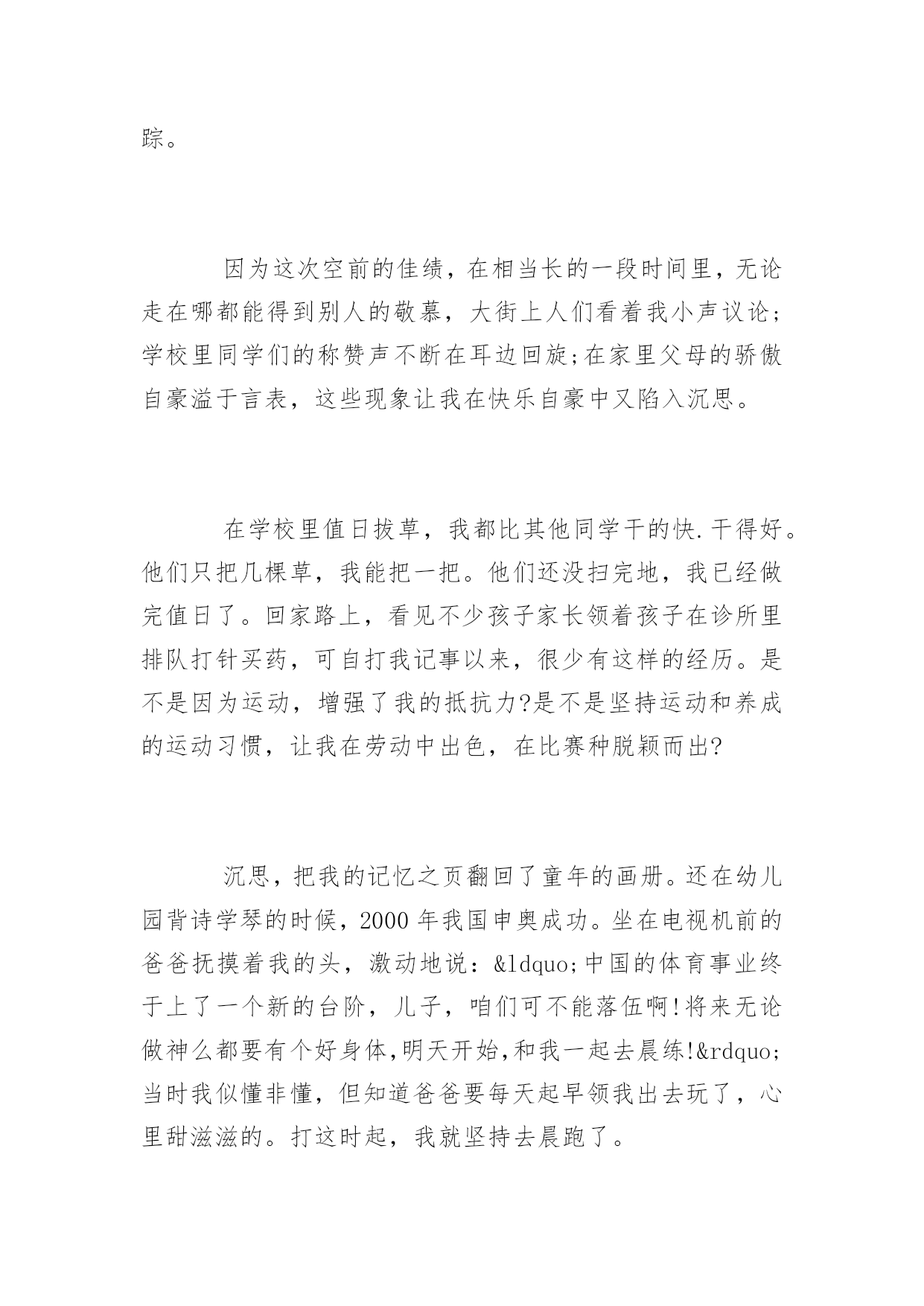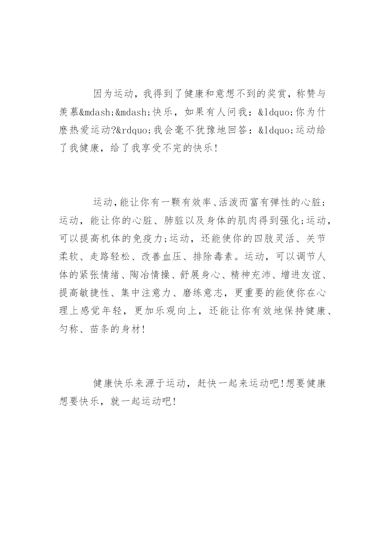 健康快乐来源于运动健康快乐的源头之一就是运动,生命在于运动。生命不息,运动不止。我的健康和快乐都是来源于我热爱运动。2006年9月的一天下午,发令员短暂的发令声使我紧张而又冷静:“各就位---预备---”“砰”的一声,伴着发令枪的响声,我疯一般的向前冲去。因为我没有爆发力,一卡式被落在了后面,但我经过一番超越和调整,终于在一瞬间第一个把左脚踏上了第二个弯到与直线的交汇点,超过了所有的运动员。我顾不上再向后看他们离我多远,只是奔跑,奔跑,再奔跑。大脑里一片空白。最后不知道什麽时候,不知道什麽情形,我终于到达了终点。我的眼前模模糊糊,已经站不稳,同学们连忙扶住我,当时我还不知道自己排了第几名不知过了多长时间,我终于醒了过来,这时候听见了回荡赛场的声音:下面公布‘小男小女’,男子组2500米长跑总决赛成绩:第一名:实验小学0111号……”我是第一名!我是第一名!这个声音不知在我心中回荡了多少次。我在农安最盛大的一次运动会上取得了绝无仅有的长跑成绩,并创下了新的纪录,只觉得从心里往外快活……肯德基,麦当劳……一切都被第一名冲击的无影无踪。因为这次空前的佳绩,在相当长的一段时间里,无论走在哪都能得到别人的敬慕,大街上人们看着我小声议论;学校里同学们的称赞声不断在耳边回旋;在家里父母的骄傲自豪溢于言表,这些现象让我在快乐自豪中又陷入沉思。在学校里值日拔草,我都比其他同学干的快.干得好。他们只把几棵草,我能把一把。他们还没扫完地,我已经做完值日了。回家路上,看见不少孩子家长领着孩子在诊所里排队打针买药,可自打我记事以来,很少有这样的经历。是不是因为运动,增强了我的抵抗力?是不是坚持运动和养成的运动习惯,让我在劳动中出色,在比赛种脱颖而出?沉思,把我的记忆之页翻回了童年的画册。还在幼儿园背诗学琴的时候,2000年我国申奥成功。坐在电视机前的爸爸抚摸着我的头,激动地说:“中国的体育事业终于上了一个新的台阶,儿子,咱们可不能落伍啊!将来无论做神么都要有个好身体,明天开始,和我一起去晨练!”当时我似懂非懂,但知道爸爸要每天起早领我出去玩了,心里甜滋滋的。打这时起,我就坚持去晨跑了。因为运动,我得到了健康和意想不到的奖赏,称赞与羡慕——快乐,如果有人问我:“你为什麽热爱运动?”我会毫不犹豫地回答:“运动给了我健康,给了我享受不完的快乐!运动,能让你有一颗有效率、活泼而富有弹性的心脏;运动,能让你的心脏、肺脏以及身体的肌肉得到强化;运动,可以提高机体的免疫力;运动,还能使你的四肢灵活、关节柔软、走路轻松、改善血压、排除毒素。运动,可以调节人体的紧张情绪、陶冶情操、舒展身心、精神充沛、增进友谊、提高敏捷性、集中注意力、磨练意志,更重要的能使你在心理上感觉年轻,更加乐观向上,还能让你有效地保持健康、匀称、苗条的身材!健康快乐来源于运动,赶快一起来运动吧!想要健康想要快乐,就一起运动吧!