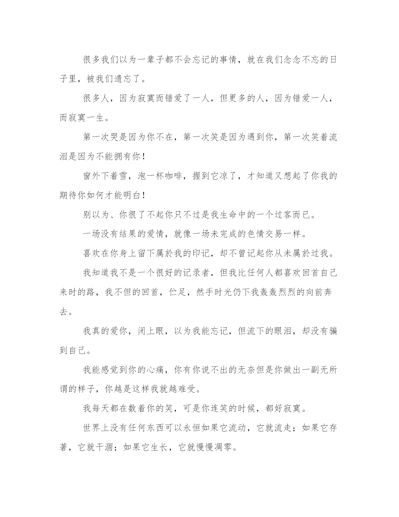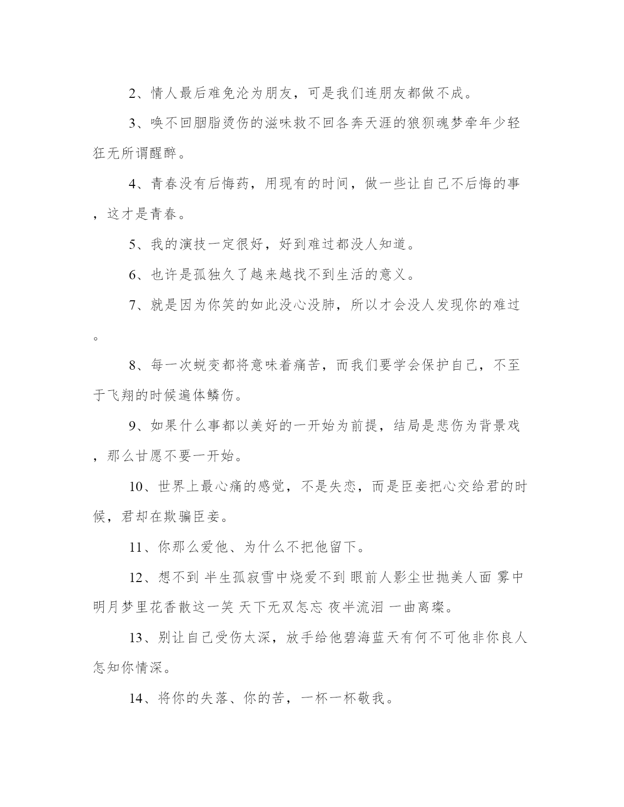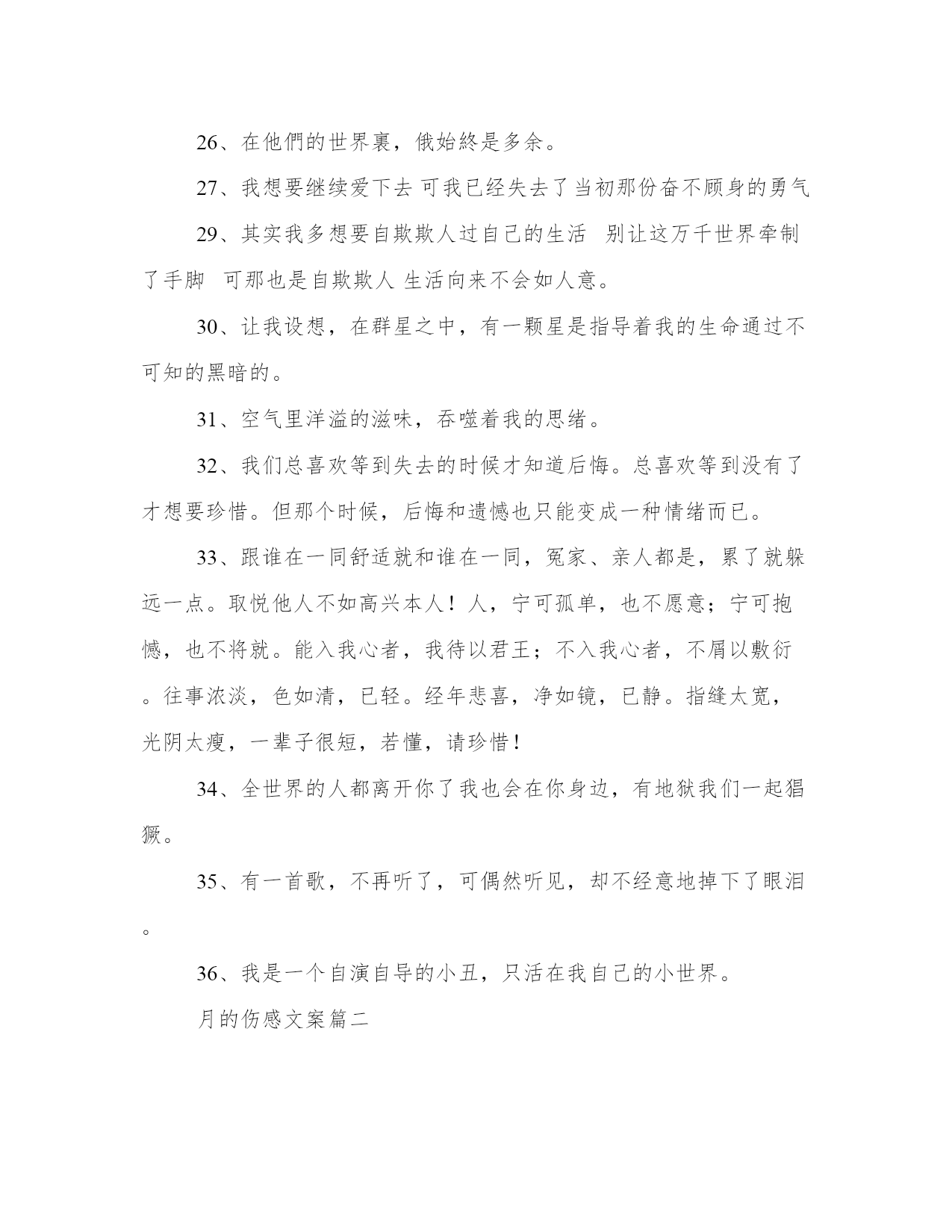 月的伤感文案(实用8篇)每个人都曾试图在平淡的学习、工作和生活中写一篇文章。写作是培养人的观察、联想、想象、思维和记忆的重要手段。相信许多人会觉得范文很难写?以下是我为大家搜集的优质范文,仅供参考,一起来看看吧月的伤感文案篇一一往情深深几许,深秋夕照深秋雨……以下是小编为大家提供的伤感语录36句,欢迎阅读借鉴。1、下雨了,我说:天哭了。降温了,心凉的透透的。2、你的饼干我的牛奶。我的小情绪和你的使坏。对不起,那些碎碎念不完。3、我想要一场婚礼,一件婚纱,一对戒指,一个伴儿。4、我们坚持着太阳的美好,继续那些未来的微笑。5、请爱了。如果可以,我想陪你到永远。6、如果真相是一种伤害,请选择谎言。如果谎言是一种伤害,请选择沉默。将美好和牵魂,满满地装进心房。7、我失落,只因为你。因为你所谓的永远是那样的虚伪。8、黑夜给我玄色的眼睛,我却用来寻找光亮。9、叹如今,忆往昔,泪彷徨。10、请不要叫醒我,我怕睁开眼看不到你。11、她们都说失去以后才懂得珍惜,其实珍惜后的失去比什么都痛。12、后来,我遇见很多人,像你的发,像你的眼,却不是你的脸。13、删除以前的说说时你会发现,曾经一直跟你亲密回复的人,现在却不知道是谁了。14、栖居水云间,闲种竹菊梅兰,安心静守这一方桃源。暖酒花窗前,细品苦辣酸甜,倾杯笑抿那半生尘缘。15、有时候,你不得不接受这个现实:有些事情已回不到从前了。出路,不通时,选择拐弯,心,不快时,选择看淡;情,渐远时,选择随意。有些事,挺一挺,就过去了。有些人,就是去狠一狠,也就忘记了。有些苦,笑一笑,就冰释了。有颗心,伤一伤,那么也就是坚强了。16、两个人交往过程中,总有一头热一头冷,当你是很不幸地在这段关系里,正好是比较热的那头,人家比你冷的时候,你就要判断,你受不受得了这个冷。如果受不了的话,就不要再做努力了。要用吵架这种方式刺激对方,来获得反应的话,双方其实都没有可能了。17、从来没有人来过我心上,我只是你中途过站的地方。18、希望你和你的她能好好走下去,也希望我能快些遇见我的他,我们都会过的很好,你是我尚好的青春,那些我付出过的心酸爱恋,我不后悔。19、我没有给你任何虚假的空白的承诺,我只是想尽我可能的留下更多的东西,不让你陪着我从头开始,不让你多受委屈。20、毕业了,再也回不去了,再也不能一起打球,一起吃饭,一起哈牛逼了,真的不想离开。再见了,兄弟们,愿大家以后都前程似锦!21、你曾经叫我不要哭泣,你说,这世间没有比我的泪水更沉重的事物,我想其实还是有的,比如你的一切。22、我们要回过去告别了,告别所有的.遗憾啊,我们就要变成青春应该成为的模样了,你应该为我们高兴,我们一定会在某地相遇的,答应我别再回头看了,再会。23、我不知道为什么可以那么亲密又可以那么陌生,我只知道爱了就可以义无反顾,便一直是你,无比害怕甜言蜜语与承诺,可以毁掉一切。24、刚刚向一个人告了白,事实证明孤独的人活在幻想中。没有遗憾,没有心酸,就像排练过无数次的一场戏,没有意外。25、我们总让在乎我们的人为我们哭泣,并总为那些永远不会在乎我们的人哭泣,且我们在意那些永远不会为我们哭泣的人。如果说我懂的道理比别人多一点,那是因为我犯的错误比别人多一点。26、在他們的世界裏,俄始終是多余。27、我想要继续爱下去可我已经失去了当初那份奋不顾身的勇气29、其实我多想要自欺欺人过自己的生活别让这万千世界牵制了手脚可那也是自欺欺人生活向来不会如人意。30、让我设想,在群星之中,有一颗星是指导着我的生命通过不可知的黑暗的。31、空气里洋溢的滋味,吞噬着我的思绪。32、我们总喜欢等到失去的时候才知道后悔。总喜欢等到没有了才想要珍惜。但那个时候,后悔和遗憾也只能变成一种情绪而已。33、跟谁在一同舒适就和谁在一同,冤家、亲人都是,累了就躲远一点。取悦他人不如高兴本人!人,宁可孤单,也不愿意;宁可抱憾,也不将就。能入我心者,我待以君王;不入我心者,不屑以敷衍。往事浓淡,色如清,已轻。经年悲喜,净如镜,已静。指缝太宽,光阴太瘦,一辈子很短,若懂,请珍惜!34、全世界的人都离开你了我也会在你身边,有地狱我们一起猖獗。35、有一首歌,不再听了,可偶然听见,却不经意地掉下了眼泪。36、我是一个自演自导的小丑,只活在我自己的小世界。月的伤感文案篇二很多我们以为一辈子都不会忘记的事情,就在我们念念不忘的日子里,被我们遗忘了。很多人,因为寂寞而错爱了一人,但更多的人,因为错爱一人,而寂寞一生。第一次哭是因为你不在,第一次笑是因为遇到你,第一次笑着流泪是因为不能拥有你!窗外下着雪,泡一杯咖啡,握到它凉了,才知道又想起了你我的期待你如何才能明白!别以为、你很了不起你只不过是我生命中的一个过客而已。