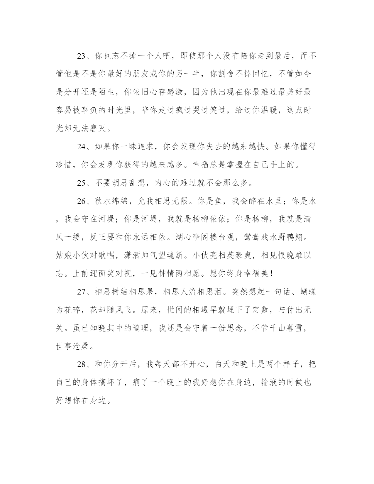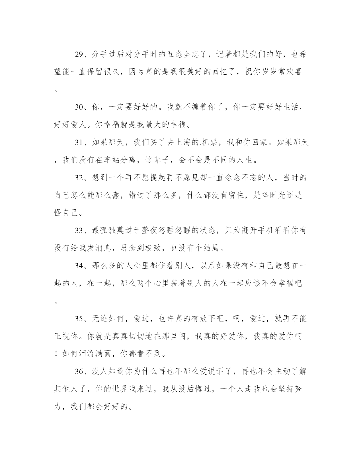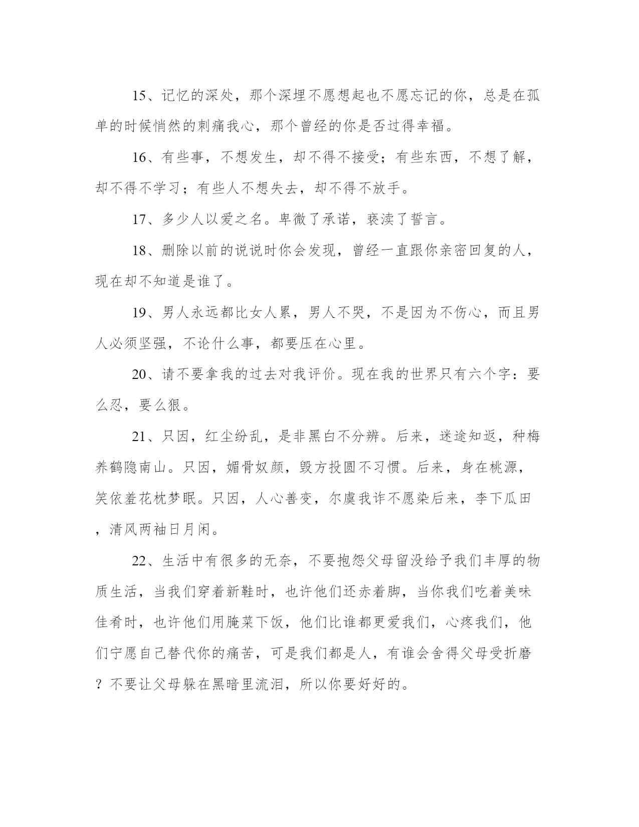 月的伤感文案(实用8篇)每个人都曾试图在平淡的学习、工作和生活中写一篇文章。写作是培养人的观察、联想、想象、思维和记忆的重要手段。相信许多人会觉得范文很难写?以下是我为大家搜集的优质范文,仅供参考,一起来看看吧月的伤感文案篇一一往情深深几许,深秋夕照深秋雨……以下是小编为大家提供的伤感语录36句,欢迎阅读借鉴。1、下雨了,我说:天哭了。降温了,心凉的透透的。2、你的饼干我的牛奶。我的小情绪和你的使坏。对不起,那些碎碎念不完。3、我想要一场婚礼,一件婚纱,一对戒指,一个伴儿。4、我们坚持着太阳的美好,继续那些未来的微笑。5、请爱了。如果可以,我想陪你到永远。6、如果真相是一种伤害,请选择谎言。如果谎言是一种伤害,请选择沉默。将美好和牵魂,满满地装进心房。7、我失落,只因为你。因为你所谓的永远是那样的虚伪。8、黑夜给我玄色的眼睛,我却用来寻找光亮。9、叹如今,忆往昔,泪彷徨。10、请不要叫醒我,我怕睁开眼看不到你。11、她们都说失去以后才懂得珍惜,其实珍惜后的失去比什么都痛。12、后来,我遇见很多人,像你的发,像你的眼,却不是你的脸。13、删除以前的说说时你会发现,曾经一直跟你亲密回复的人,现在却不知道是谁了。14、栖居水云间,闲种竹菊梅兰,安心静守这一方桃源。暖酒花窗前,细品苦辣酸甜,倾杯笑抿那半生尘缘。15、有时候,你不得不接受这个现实:有些事情已回不到从前了。出路,不通时,选择拐弯,心,不快时,选择看淡;情,渐远时,选择随意。有些事,挺一挺,就过去了。有些人,就是去狠一狠,也就忘记了。有些苦,笑一笑,就冰释了。有颗心,伤一伤,那么也就是坚强了。16、两个人交往过程中,总有一头热一头冷,当你是很不幸地在这段关系里,正好是比较热的那头,人家比你冷的时候,你就要判断,你受不受得了这个冷。如果受不了的话,就不要再做努力了。要用吵架这种方式刺激对方,来获得反应的话,双方其实都没有可能了。17、从来没有人来过我心上,我只是你中途过站的地方。18、希望你和你的她能好好走下去,也希望我能快些遇见我的他,我们都会过的很好,你是我尚好的青春,那些我付出过的心酸爱恋,我不后悔。19、我没有给你任何虚假的空白的承诺,我只是想尽我可能的留下更多的东西,不让你陪着我从头开始,不让你多受委屈。20、毕业了,再也回不去了,再也不能一起打球,一起吃饭,一起哈牛逼了,真的不想离开。再见了,兄弟们,愿大家以后都前程似锦!21、你曾经叫我不要哭泣,你说,这世间没有比我的泪水更沉重的事物,我想其实还是有的,比如你的一切。22、我们要回过去告别了,告别所有的.遗憾啊,我们就要变成青春应该成为的模样了,你应该为我们高兴,我们一定会在某地相遇的,答应我别再回头看了,再会。23、我不知道为什么可以那么亲密又可以那么陌生,我只知道爱了就可以义无反顾,便一直是你,无比害怕甜言蜜语与承诺,可以毁掉一切。24、刚刚向一个人告了白,事实证明孤独的人活在幻想中。没有遗憾,没有心酸,就像排练过无数次的一场戏,没有意外。25、我们总让在乎我们的人为我们哭泣,并总为那些永远不会在乎我们的人哭泣,且我们在意那些永远不会为我们哭泣的人。如果说我懂的道理比别人多一点,那是因为我犯的错误比别人多一点。26、在他們的世界裏,俄始終是多余。27、我想要继续爱下去可我已经失去了当初那份奋不顾身的勇气29、其实我多想要自欺欺人过自己的生活别让这万千世界牵制了手脚可那也是自欺欺人生活向来不会如人意。30、让我设想,在群星之中,有一颗星是指导着我的生命通过不可知的黑暗的。31、空气里洋溢的滋味,吞噬着我的思绪。32、我们总喜欢等到失去的时候才知道后悔。总喜欢等到没有了才想要珍惜。但那个时候,后悔和遗憾也只能变成一种情绪而已。33、跟谁在一同舒适就和谁在一同,冤家、亲人都是,累了就躲远一点。取悦他人不如高兴本人!人,宁可孤单,也不愿意;宁可抱憾,也不将就。能入我心者,我待以君王;不入我心者,不屑以敷衍。往事浓淡,色如清,已轻。经年悲喜,净如镜,已静。指缝太宽,光阴太瘦,一辈子很短,若懂,请珍惜!34、全世界的人都离开你了我也会在你身边,有地狱我们一起猖獗。35、有一首歌,不再听了,可偶然听见,却不经意地掉下了眼泪。36、我是一个自演自导的小丑,只活在我自己的小世界。月的伤感文案篇二很多我们以为一辈子都不会忘记的事情,就在我们念念不忘的日子里,被我们遗忘了。很多人,因为寂寞而错爱了一人,但更多的人,因为错爱一人,而寂寞一生。第一次哭是因为你不在,第一次笑是因为遇到你,第一次笑着流泪是因为不能拥有你!窗外下着雪,泡一杯咖啡,握到它凉了,才知道又想起了你我的期待你如何才能明白!别以为、你很了不起你只不过是我生命中的一个过客而已。