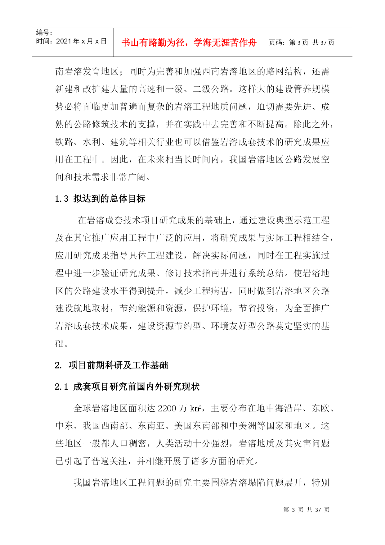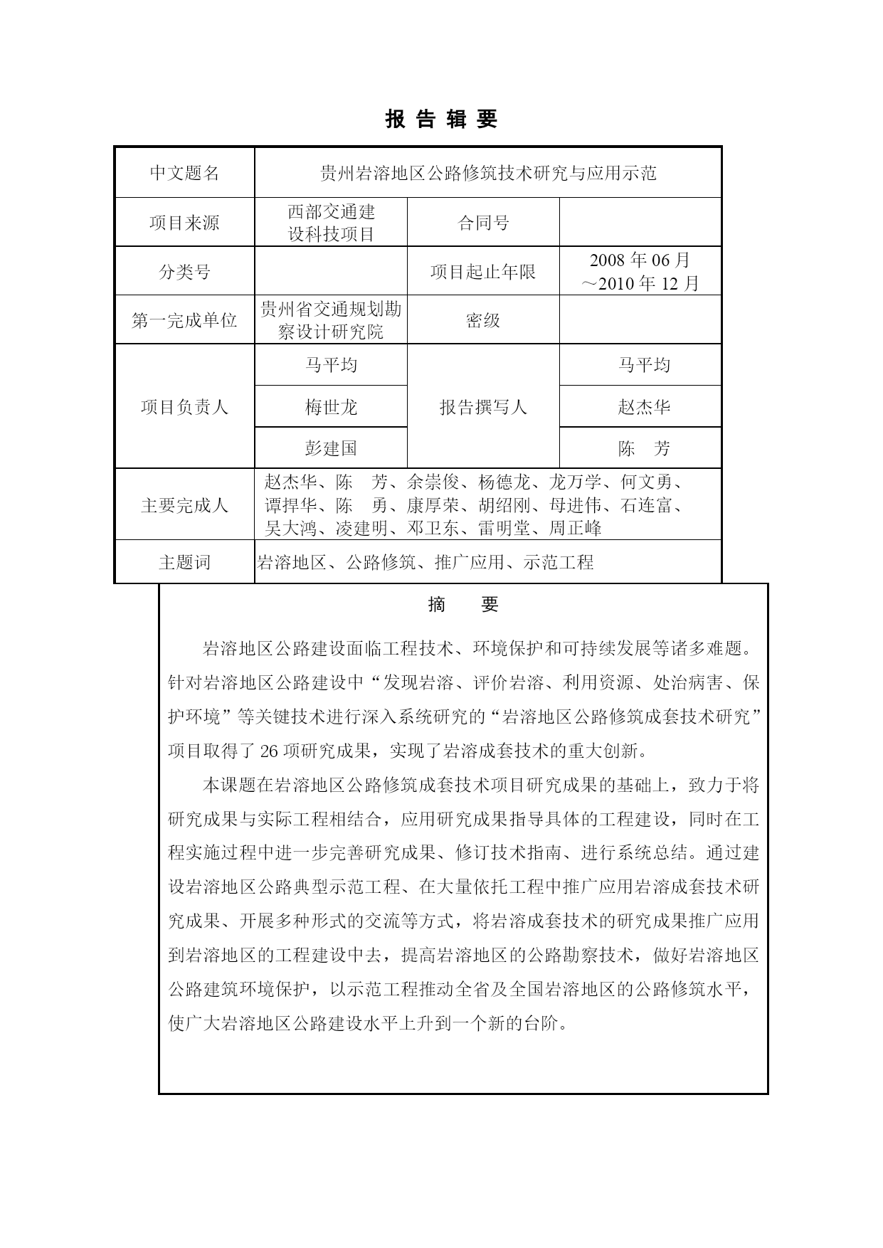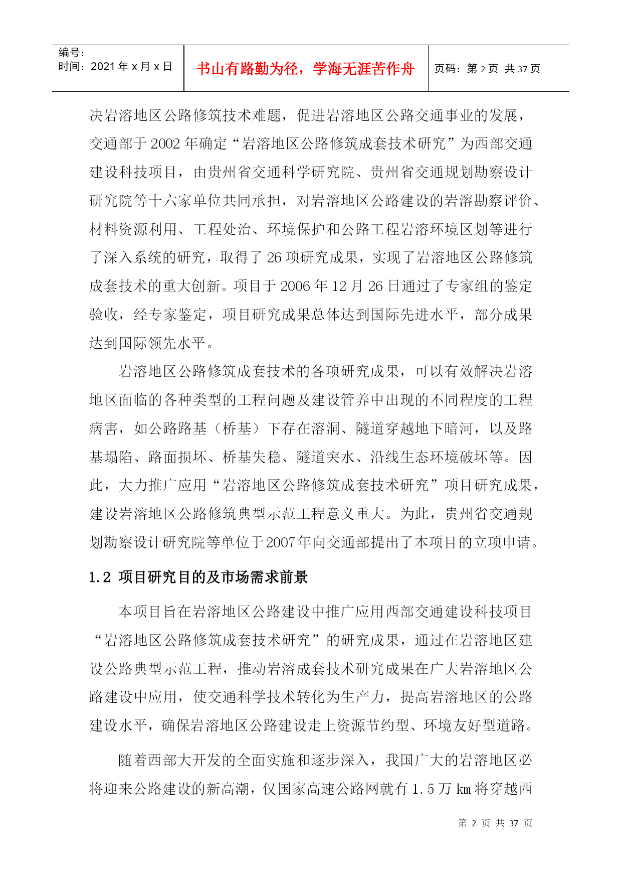 PAGE西部交通建设科技项目可行性研究报告项目名称:贵州岩溶地区公路修筑技术研究与应用示范申报单位:贵州省交通规划勘察设计研究院中华人民共和国交通部制2008年05月报告辑要中文题名贵州岩溶地区公路修筑技术研究与应用示范项目来源西部交通建设科技项目合同号分类号项目起止年限2008年06月~2010年12月第一完成单位贵州省交通规划勘察设计研究院密级项目负责人马平均报告撰写人马平均梅世龙赵杰华彭建国陈芳主要完成人赵杰华、陈芳、余崇俊、杨德龙、龙万学、何文勇、谭捍华、陈勇、康厚荣、胡绍刚、母进伟、石连富、吴大鸿、凌建明、邓卫东、雷明堂、周正峰主题词岩溶地区、公路修筑、推广应用、示范工程摘要岩溶地区公路建设面临工程技术、环境保护和可持续发展等诸多难题。针对岩溶地区公路建设中“发现岩溶、评价岩溶、利用资源、处治病害、保护环境”等关键技术进行深入系统研究的“岩溶地区公路修筑成套技术研究”项目取得了26项研究成果,实现了岩溶成套技术的重大创新。本课题在岩溶地区公路修筑成套技术项目研究成果的基础上,致力于将研究成果与实际工程相结合,应用研究成果指导具体的工程建设,同时在工程实施过程中进一步完善研究成果、修订技术指南、进行系统总结。通过建设岩溶地区公路典型示范工程、在大量依托工程中推广应用岩溶成套技术研究成果、开展多种形式的交流等方式,将岩溶成套技术的研究成果推广应用到岩溶地区的工程建设中去,提高岩溶地区的公路勘察技术,做好岩溶地区公路建筑环境保护,以示范工程推动全省及全国岩溶地区的公路修筑水平,使广大岩溶地区公路建设水平上升到一个新的台阶。目录TOC\o"1-2"\h\z\uHYPERLINK\l"_Toc204506158"1.概况PAGEREF_Toc204506158\h1HYPERLINK\l"_Toc204506159"1.1项目背景及必要性PAGEREF_Toc204506159\h1HYPERLINK\l"_Toc204506160"1.2项目研究目的及市场需求前景PAGEREF_Toc204506160\h2HYPERLINK\l"_Toc204506161"1.3拟达到的总体目标PAGEREF_Toc204506161\h3HYPERLINK\l"_Toc204506162"2.项目前期科研及工作基础PAGEREF_Toc204506162\h3HYPERLINK\l"_Toc204506163"2.1成套项目研究前国内外研究现状PAGEREF_Toc204506163\h3HYPERLINK\l"_Toc204506164"2.2项目工作基础PAGEREF_Toc204506164\h5HYPERLINK\l"_Toc204506165"2.3已开展的推广应用情况PAGEREF_Toc204506165\h5HYPERLINK\l"_Toc204506166"3.项目实施方案PAGEREF_Toc204506166\h6HYPERLINK\l"_Toc204506168"3.1深化研究的内容PAGEREF_Toc204506168\h6HYPERLINK\l"_Toc204506170"3.2推广应用的典型示范工程PAGEREF_Toc204506170\h6HYPERLINK\l"_Toc204506171"3.2.1典型示范工程概况PAGEREF_Toc204506171\h6HYPERLINK\l"_Toc204506172"3.2.2推广应用的主要研究成果PAGEREF_Toc204506172\h8HYPERLINK\l"_Toc204506175"3.3推广应用工作PAGEREF_Toc204506175\h11HYPERLINK\l"_Toc204506177"3.3.1其它推广应用工程概况PAGEREF_Toc204506177\h11HYPERLINK\l"_Toc204506178"3.3.2技术交流形式及安排PAGEREF_Toc204506178\h17HYPERLINK\l"_Toc204506179"3.4技术路线PAGEREF_Toc204506179\h17HYPERLINK\l"_Toc204506181"3.5进度安排PAGEREF_Toc204506181\h18HYPERLINK\l"_Toc204506182"3.6