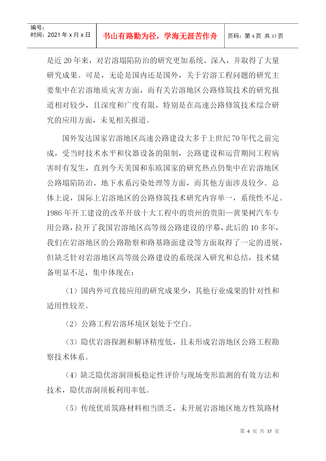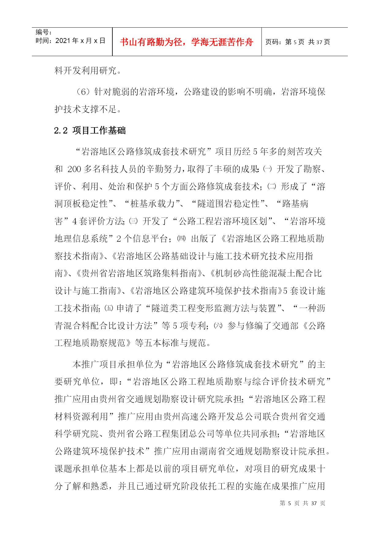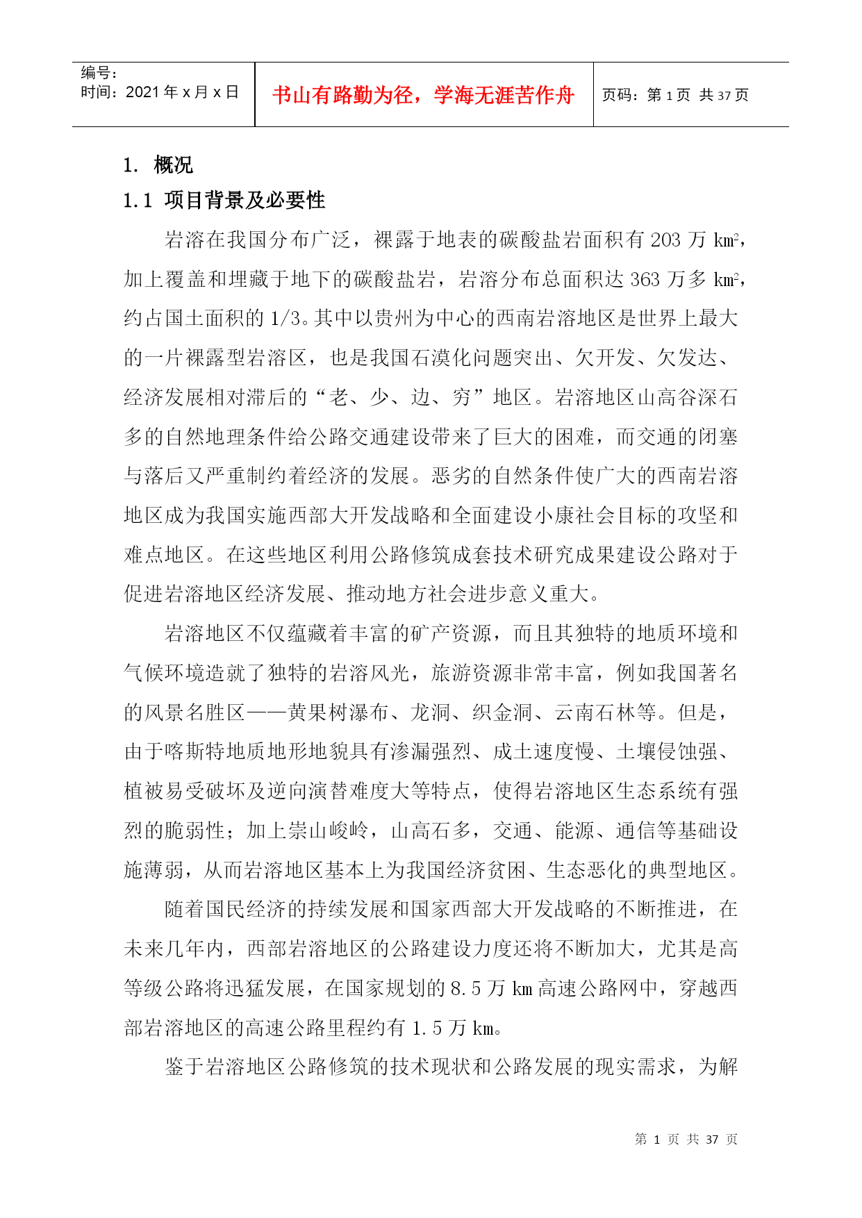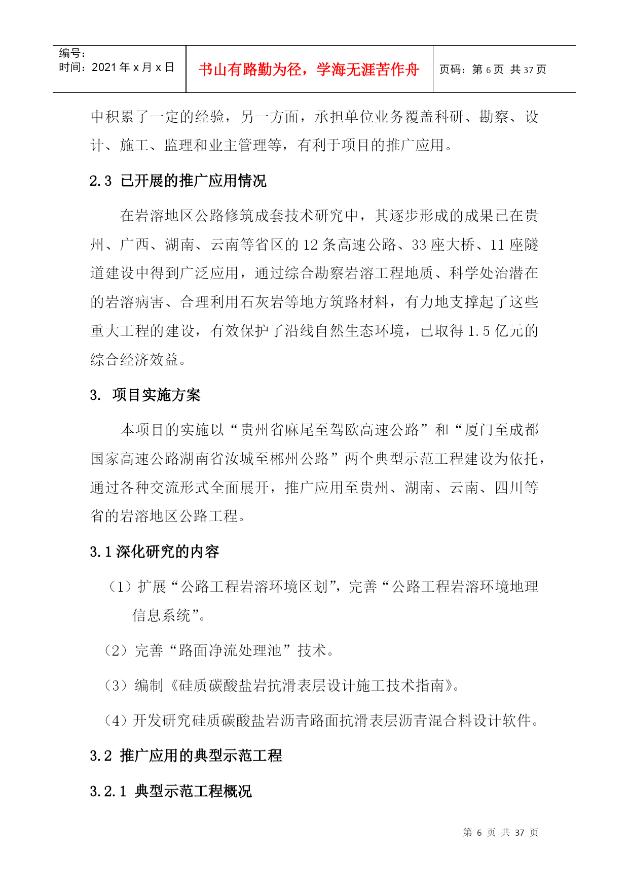 PAGE西部交通建设科技项目可行性研究报告项目名称:贵州岩溶地区公路修筑技术研究与应用示范申报单位:贵州省交通规划勘察设计研究院中华人民共和国交通部制2008年05月报告辑要中文题名贵州岩溶地区公路修筑技术研究与应用示范项目来源西部交通建设科技项目合同号分类号项目起止年限2008年06月~2010年12月第一完成单位贵州省交通规划勘察设计研究院密级项目负责人马平均报告撰写人马平均梅世龙赵杰华彭建国陈芳主要完成人赵杰华、陈芳、余崇俊、杨德龙、龙万学、何文勇、谭捍华、陈勇、康厚荣、胡绍刚、母进伟、石连富、吴大鸿、凌建明、邓卫东、雷明堂、周正峰主题词岩溶地区、公路修筑、推广应用、示范工程摘要岩溶地区公路建设面临工程技术、环境保护和可持续发展等诸多难题。针对岩溶地区公路建设中“发现岩溶、评价岩溶、利用资源、处治病害、保护环境”等关键技术进行深入系统研究的“岩溶地区公路修筑成套技术研究”项目取得了26项研究成果,实现了岩溶成套技术的重大创新。本课题在岩溶地区公路修筑成套技术项目研究成果的基础上,致力于将研究成果与实际工程相结合,应用研究成果指导具体的工程建设,同时在工程实施过程中进一步完善研究成果、修订技术指南、进行系统总结。通过建设岩溶地区公路典型示范工程、在大量依托工程中推广应用岩溶成套技术研究成果、开展多种形式的交流等方式,将岩溶成套技术的研究成果推广应用到岩溶地区的工程建设中去,提高岩溶地区的公路勘察技术,做好岩溶地区公路建筑环境保护,以示范工程推动全省及全国岩溶地区的公路修筑水平,使广大岩溶地区公路建设水平上升到一个新的台阶。目录TOC\o"1-2"\h\z\uHYPERLINK\l"_Toc204506158"1.概况PAGEREF_Toc204506158\h1HYPERLINK\l"_Toc204506159"1.1项目背景及必要性PAGEREF_Toc204506159\h1HYPERLINK\l"_Toc204506160"1.2项目研究目的及市场需求前景PAGEREF_Toc204506160\h2HYPERLINK\l"_Toc204506161"1.3拟达到的总体目标PAGEREF_Toc204506161\h3HYPERLINK\l"_Toc204506162"2.项目前期科研及工作基础PAGEREF_Toc204506162\h3HYPERLINK\l"_Toc204506163"2.1成套项目研究前国内外研究现状PAGEREF_Toc204506163\h3HYPERLINK\l"_Toc204506164"2.2项目工作基础PAGEREF_Toc204506164\h5HYPERLINK\l"_Toc204506165"2.3已开展的推广应用情况PAGEREF_Toc204506165\h5HYPERLINK\l"_Toc204506166"3.项目实施方案PAGEREF_Toc204506166\h6HYPERLINK\l"_Toc204506168"3.1深化研究的内容PAGEREF_Toc204506168\h6HYPERLINK\l"_Toc204506170"3.2推广应用的典型示范工程PAGEREF_Toc204506170\h6HYPERLINK\l"_Toc204506171"3.2.1典型示范工程概况PAGEREF_Toc204506171\h6HYPERLINK\l"_Toc204506172"3.2.2推广应用的主要研究成果PAGEREF_Toc204506172\h8HYPERLINK\l"_Toc204506175"3.3推广应用工作PAGEREF_Toc204506175\h11HYPERLINK\l"_Toc204506177"3.3.1其它推广应用工程概况PAGEREF_Toc204506177\h11HYPERLINK\l"_Toc204506178"3.3.2技术交流形式及安排PAGEREF_Toc204506178\h17HYPERLINK\l"_Toc204506179"3.4技术路线PAGEREF_Toc204506179\h17HYPERLINK\l"_Toc204506181"3.5进度安排PAGEREF_Toc204506181\h18HYPERLINK\l"_Toc204506182"3.6