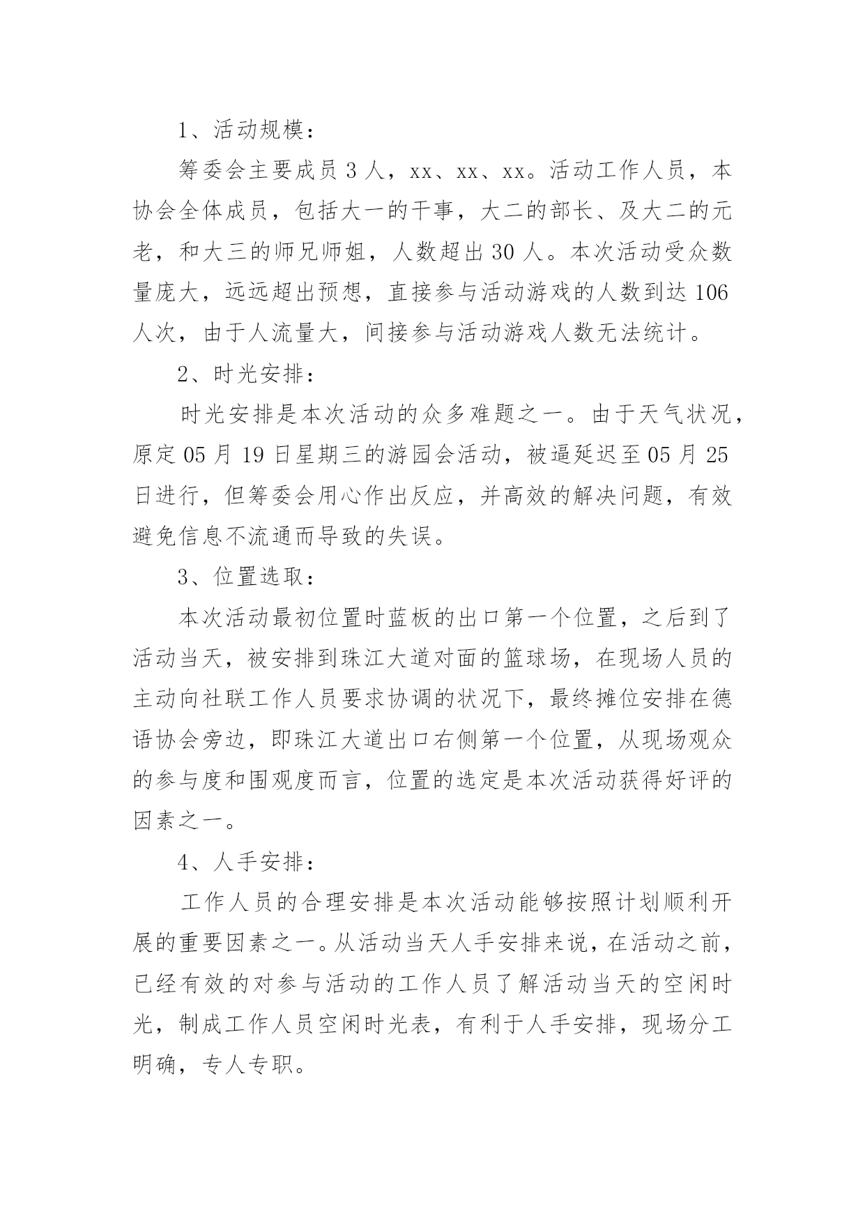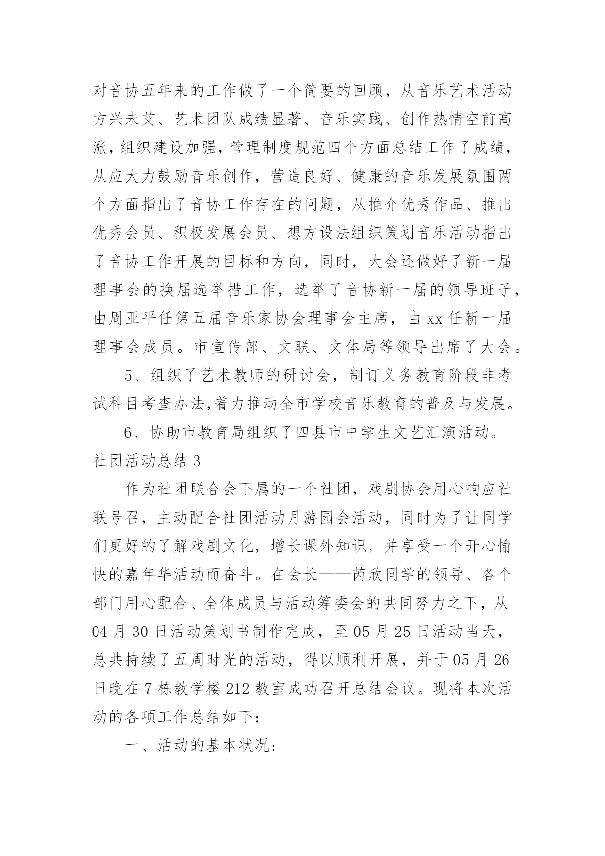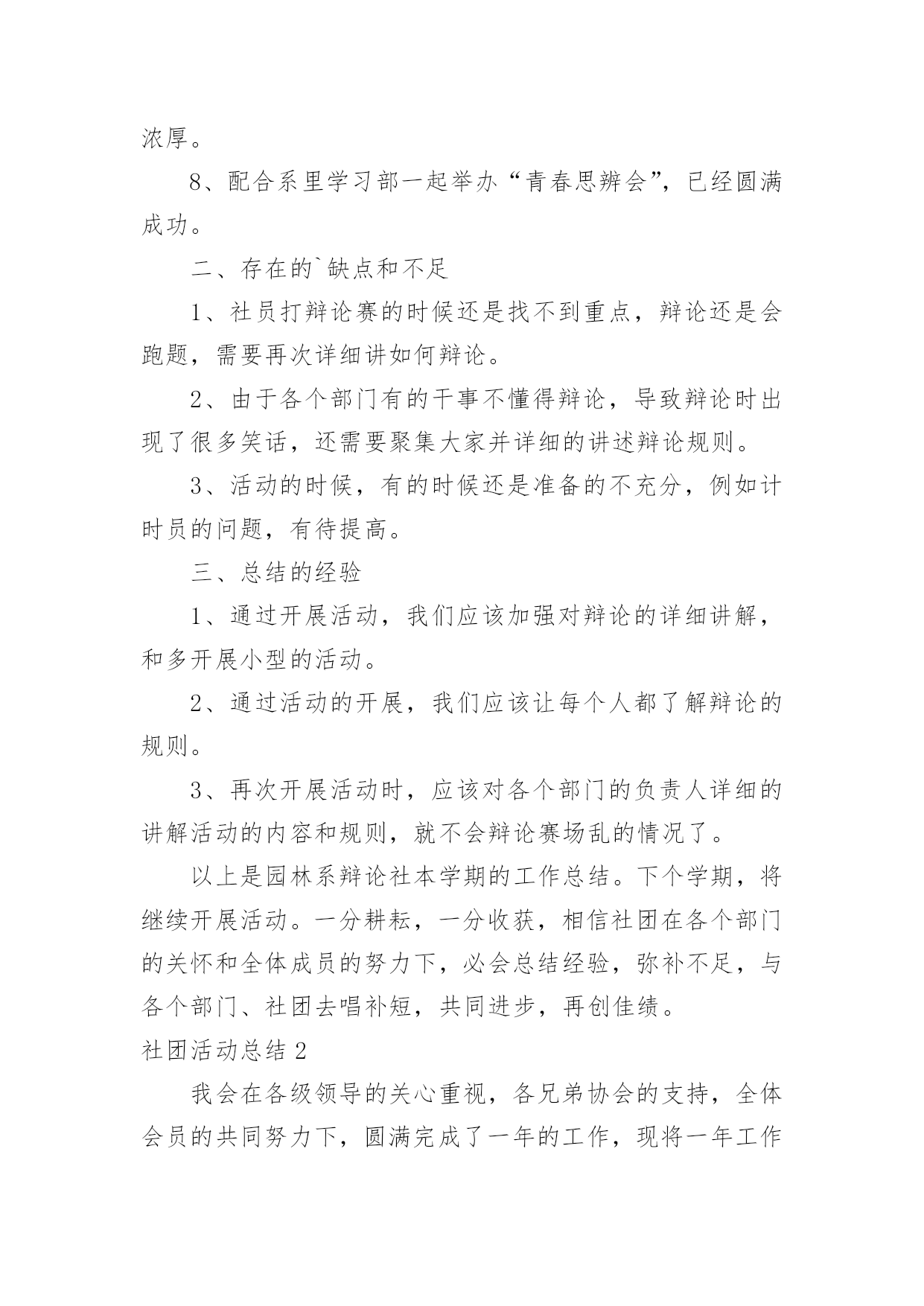 社团活动总结社团活动总结【集合15篇】总结是对某一特定时间段内的学习和工作生活等表现情况加以回顾和分析的一种书面材料,它能帮我们理顺知识结构,突出重点,突破难点,因此,让我们写一份总结吧。总结怎么写才是正确的呢?以下是小编帮大家整理的社团活动总结,欢迎阅读与收藏。社团活动总结1大一上学期生活已接近尾声,春节触手可及,迎接我们的是新年,新气象。值此之际,随着各个活动圆满的举办,但是还是有些不足,我们有必要对我们的工作做一个总结。现总结如下:一、取得的成绩:1、让所有的社员了解什么是辩论2、模拟真实赛场,辩论小练兵3、观看示范赛、发现不足立新志4、走出去、细留心5、副社长的竞选圆满成功,社员积极配合竞选工作。6、社员都准时参加辩论小练兵,8个辩手也准备充分,小型辩论赛也圆满成功。7、通过游戏,社员也都互相熟悉,互相认识,气氛很浓厚。8、配合系里学习部一起举办“青春思辨会”,已经圆满成功。二、存在的`缺点和不足1、社员打辩论赛的时候还是找不到重点,辩论还是会跑题,需要再次详细讲如何辩论。2、由于各个部门有的干事不懂得辩论,导致辩论时出现了很多笑话,还需要聚集大家并详细的讲述辩论规则。3、活动的时候,有的时候还是准备的不充分,例如计时员的问题,有待提高。三、总结的经验1、通过开展活动,我们应该加强对辩论的详细讲解,和多开展小型的活动。2、通过活动的开展,我们应该让每个人都了解辩论的规则。3、再次开展活动时,应该对各个部门的负责人详细的讲解活动的内容和规则,就不会辩论赛场乱的情况了。以上是园林系辩论社本学期的工作总结。下个学期,将继续开展活动。一分耕耘,一分收获,相信社团在各个部门的关怀和全体成员的努力下,必会总结经验,弥补不足,与各个部门、社团去唱补短,共同进步,再创佳绩。社团活动总结2我会在各级领导的关心重视,各兄弟协会的支持,全体会员的共同努力下,圆满完成了一年的工作,现将一年工作总结如下:一、加强管理,协会的凝聚力不断加强1、关注大局,制订了音协发展的五年规划。《五年规划》从四个方面着手,一是实施精品战略,推动音乐创作,创作出反映时代精神,富于艺术创新,贴近实际、贴近生活、贴近群众的作品,让人民群众欣赏到喜闻乐见易懂易唱的优秀作品。二是推出优秀人才,提高队伍素质,尤其注意对年轻一代音乐人才的培养,为年轻人脱颖而出提供条件和机会,使xx音乐艺术的舞台活跃而富有生机,使xx音乐艺术舞台鲜花盛开、百花齐放。三是加强协会自身建设,充分发挥协会的优势,提升内涵管理,制定行之有效的措施,以增强和壮大协会的实力,加强协会的活动力。四是以音乐创作为龙头,带动音乐教学、表演等社会音乐活动的展开,以增强协会的凝聚力和权威性;提高协会的社会地位和影响力,促进全民音乐素质的全面提高。2、注重内涵,管理进一步到位。先后六次召开协会负责人会议,通过短信平台信息与各位理事经常保持工作联系,建立了理事会xx联系形式,在从前理事会工作的基础上,进一步完善和健全了组织机构,调优调强了理事会成员,进行了明确分工,责任到人,做到事务有人管理,活动有人安排。同时,加强了与文联及兄弟协会的多沟通和联系,吸收xx范围内优秀的音乐工作者和对音乐事业执著爱好和关心者加入到协会中,一年内新近发展会员xx人,正式注册会员人数达xx人,协会力量更为强大。二、开展活动,协会的影响力不断提高1、组织了xxxx年初升高音乐、美术特长生测试,其中美术特长生xx人、声乐特长生xx人、器乐特长生xx人、舞蹈特长生xx人,评出柏加中学等音乐专业测试优秀单位xx个,永和中学等美术专业测试优秀单位xx个。2、充分发挥音协分会作用。二胡分会在xx理事的带领下,做了许多卓有成效的工作。(1)二月份组建了市二胡协会的交流群。(2)xxx年xx月xx日上午,xx省音乐家协会二胡专业委员会第五次工作经验交流会暨第五次换届选举大会在xx市隆重召开,我协会二胡分会一行五人参加了会议。会议选举了新一届领导班子,我协会会员xx当选为第五届理事,各地二胡专委会负责人作了宝贵的工作经验交流,会后大家认真聆听了中央音乐学院田再励教授的学术讲座,晚上观看了xx励教授师生精彩的音乐会,收获颇多,受益匪浅。(3)积极配合省音协做好了考级工作。(4)十一月,组织市二胡协会的成员赴x观看了二胡名家xx的独奏音乐会和二胡大师xx教授在xx举办的音乐会及讲座。3、组织在全市开展了文明彩铃、短信创意大赛活动。4、xxx年xx月xx日下午x点在市自来水公司五楼召开了第四届音乐家协会工作总结暨换届选举大会,周亚平主席对第四届音乐家协会理事会的'工作作了报告,从四个方面对音协五年来的工作做了一个简要的回顾,从音乐艺术活动方兴未艾、艺术团队成绩显著、音乐实践、创作热情空前高涨,组织建设加强,管理制度规范四个方面总结工作了成绩,从应大力鼓励音乐创