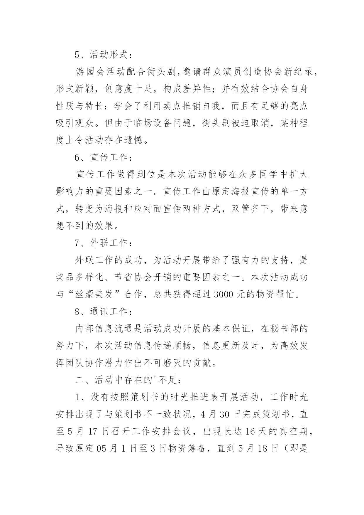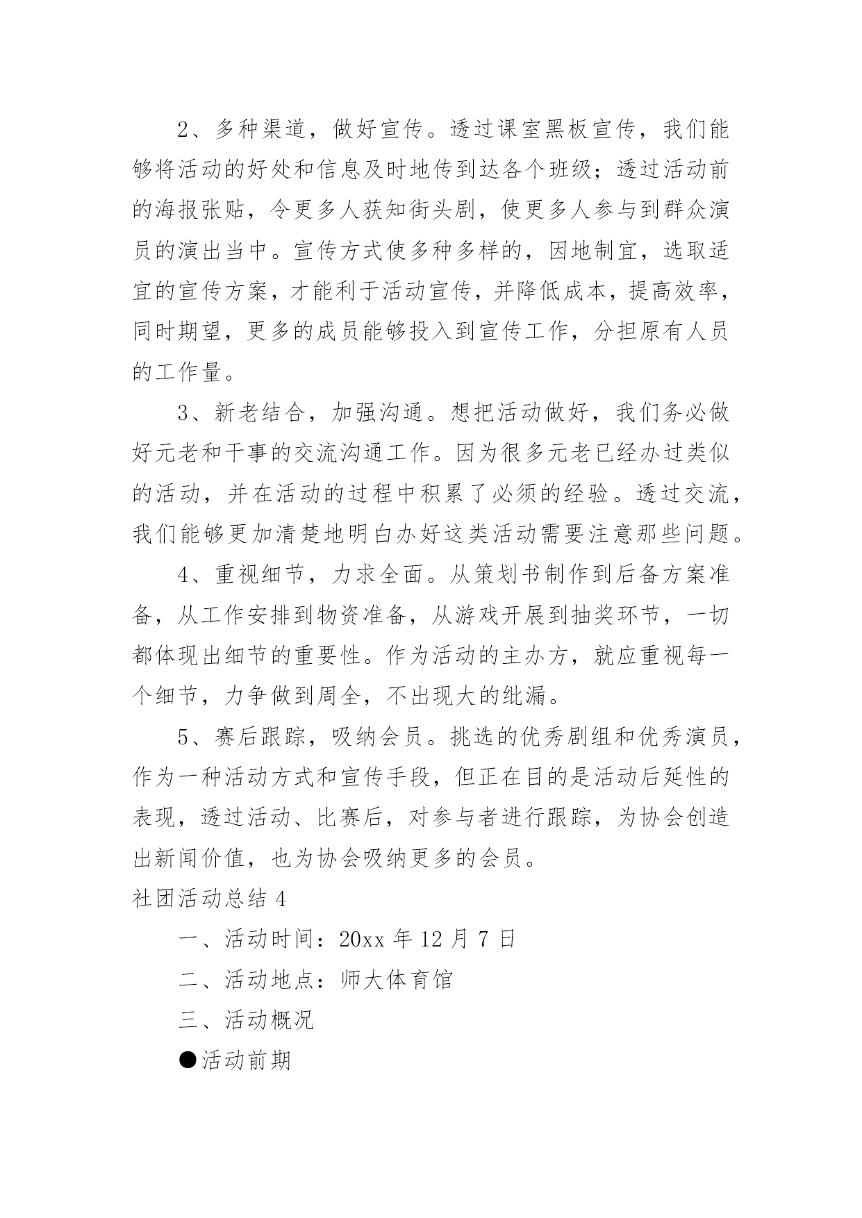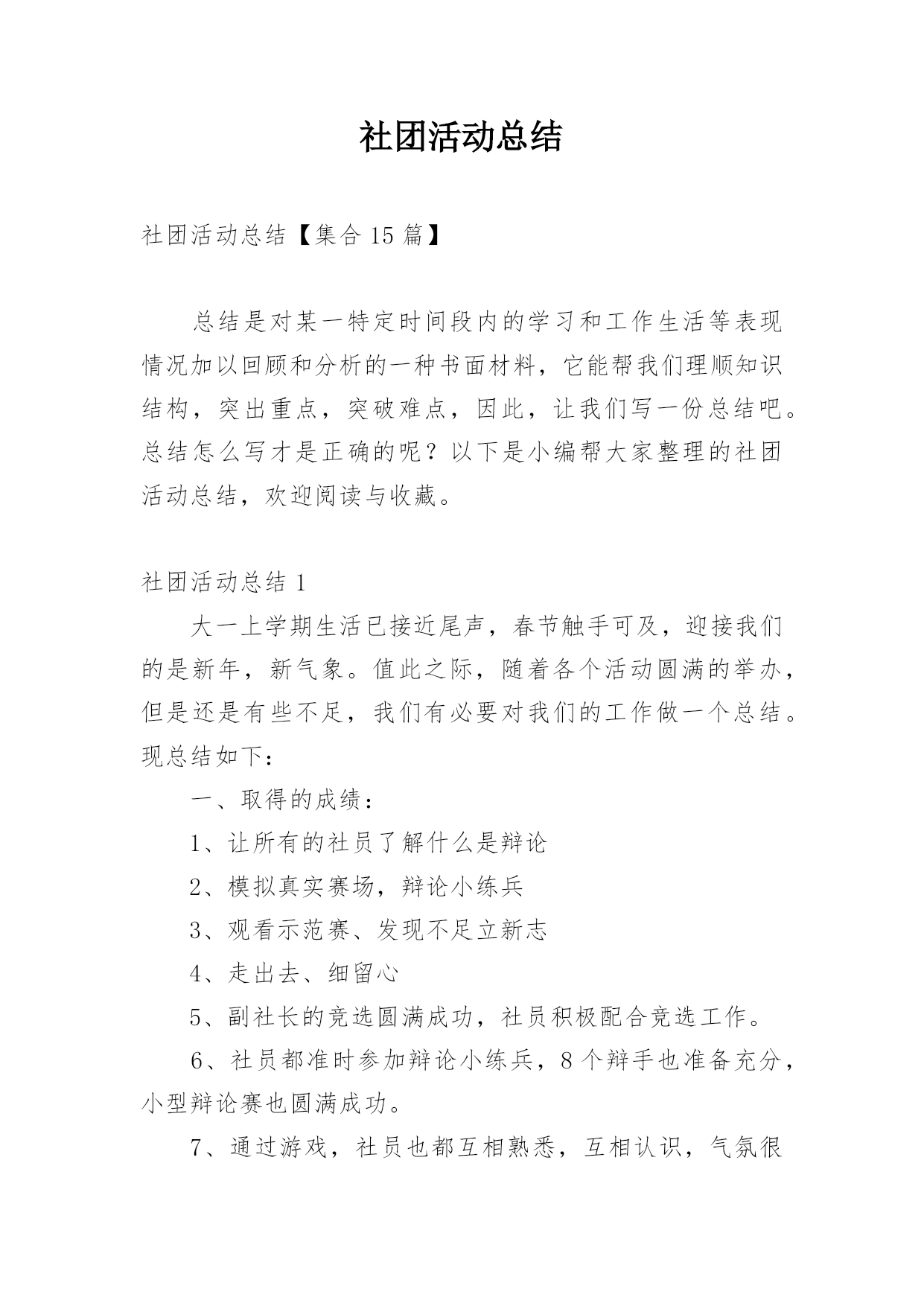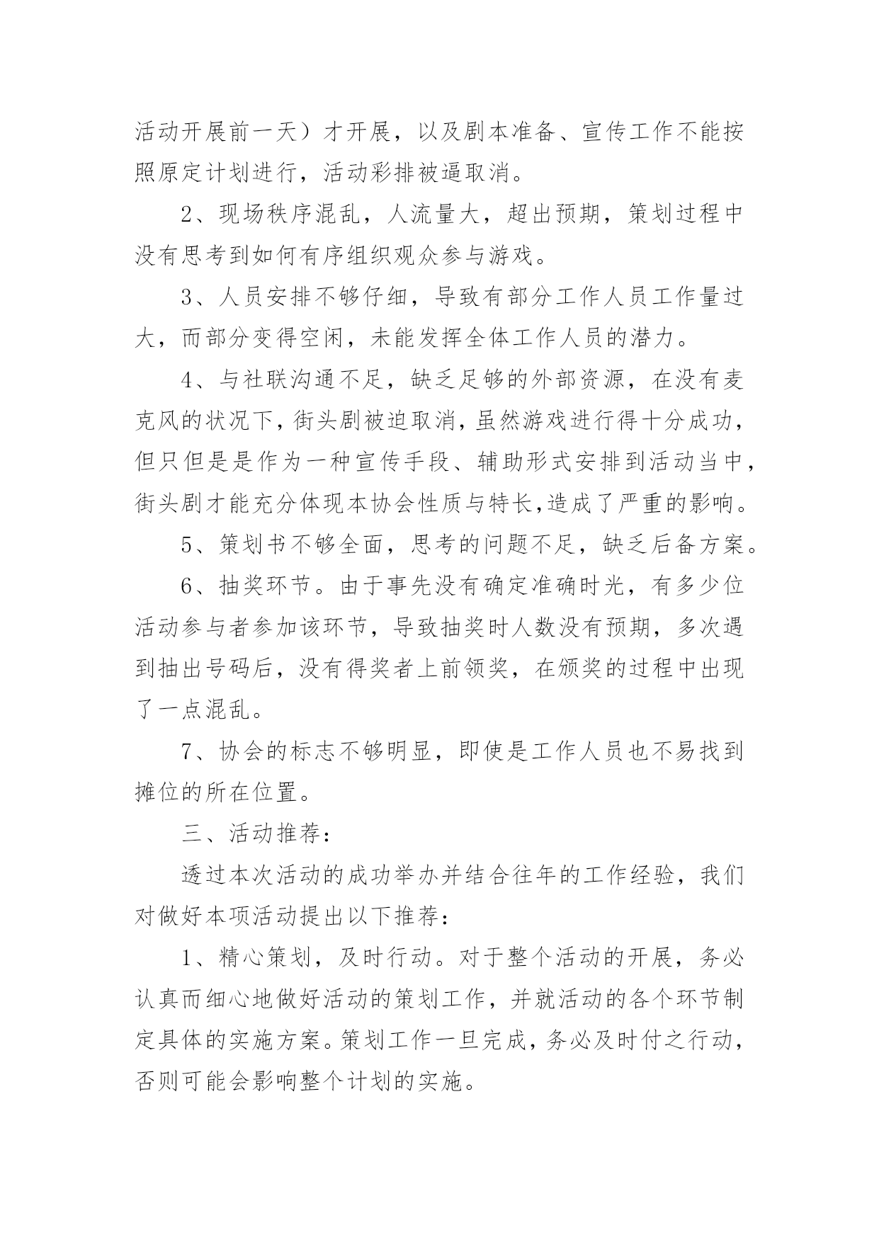 社团活动总结社团活动总结【集合15篇】总结是对某一特定时间段内的学习和工作生活等表现情况加以回顾和分析的一种书面材料,它能帮我们理顺知识结构,突出重点,突破难点,因此,让我们写一份总结吧。总结怎么写才是正确的呢?以下是小编帮大家整理的社团活动总结,欢迎阅读与收藏。社团活动总结1大一上学期生活已接近尾声,春节触手可及,迎接我们的是新年,新气象。值此之际,随着各个活动圆满的举办,但是还是有些不足,我们有必要对我们的工作做一个总结。现总结如下:一、取得的成绩:1、让所有的社员了解什么是辩论2、模拟真实赛场,辩论小练兵3、观看示范赛、发现不足立新志4、走出去、细留心5、副社长的竞选圆满成功,社员积极配合竞选工作。6、社员都准时参加辩论小练兵,8个辩手也准备充分,小型辩论赛也圆满成功。7、通过游戏,社员也都互相熟悉,互相认识,气氛很浓厚。8、配合系里学习部一起举办“青春思辨会”,已经圆满成功。二、存在的`缺点和不足1、社员打辩论赛的时候还是找不到重点,辩论还是会跑题,需要再次详细讲如何辩论。2、由于各个部门有的干事不懂得辩论,导致辩论时出现了很多笑话,还需要聚集大家并详细的讲述辩论规则。3、活动的时候,有的时候还是准备的不充分,例如计时员的问题,有待提高。三、总结的经验1、通过开展活动,我们应该加强对辩论的详细讲解,和多开展小型的活动。2、通过活动的开展,我们应该让每个人都了解辩论的规则。3、再次开展活动时,应该对各个部门的负责人详细的讲解活动的内容和规则,就不会辩论赛场乱的情况了。以上是园林系辩论社本学期的工作总结。下个学期,将继续开展活动。一分耕耘,一分收获,相信社团在各个部门的关怀和全体成员的努力下,必会总结经验,弥补不足,与各个部门、社团去唱补短,共同进步,再创佳绩。社团活动总结2我会在各级领导的关心重视,各兄弟协会的支持,全体会员的共同努力下,圆满完成了一年的工作,现将一年工作总结如下:一、加强管理,协会的凝聚力不断加强1、关注大局,制订了音协发展的五年规划。《五年规划》从四个方面着手,一是实施精品战略,推动音乐创作,创作出反映时代精神,富于艺术创新,贴近实际、贴近生活、贴近群众的作品,让人民群众欣赏到喜闻乐见易懂易唱的优秀作品。二是推出优秀人才,提高队伍素质,尤其注意对年轻一代音乐人才的培养,为年轻人脱颖而出提供条件和机会,使xx音乐艺术的舞台活跃而富有生机,使xx音乐艺术舞台鲜花盛开、百花齐放。三是加强协会自身建设,充分发挥协会的优势,提升内涵管理,制定行之有效的措施,以增强和壮大协会的实力,加强协会的活动力。四是以音乐创作为龙头,带动音乐教学、表演等社会音乐活动的展开,以增强协会的凝聚力和权威性;提高协会的社会地位和影响力,促进全民音乐素质的全面提高。2、注重内涵,管理进一步到位。先后六次召开协会负责人会议,通过短信平台信息与各位理事经常保持工作联系,建立了理事会xx联系形式,在从前理事会工作的基础上,进一步完善和健全了组织机构,调优调强了理事会成员,进行了明确分工,责任到人,做到事务有人管理,活动有人安排。同时,加强了与文联及兄弟协会的多沟通和联系,吸收xx范围内优秀的音乐工作者和对音乐事业执著爱好和关心者加入到协会中,一年内新近发展会员xx人,正式注册会员人数达xx人,协会力量更为强大。二、开展活动,协会的影响力不断提高1、组织了xxxx年初升高音乐、美术特长生测试,其中美术特长生xx人、声乐特长生xx人、器乐特长生xx人、舞蹈特长生xx人,评出柏加中学等音乐专业测试优秀单位xx个,永和中学等美术专业测试优秀单位xx个。2、充分发挥音协分会作用。二胡分会在xx理事的带领下,做了许多卓有成效的工作。(1)二月份组建了市二胡协会的交流群。(2)xxx年xx月xx日上午,xx省音乐家协会二胡专业委员会第五次工作经验交流会暨第五次换届选举大会在xx市隆重召开,我协会二胡分会一行五人参加了会议。会议选举了新一届领导班子,我协会会员xx当选为第五届理事,各地二胡专委会负责人作了宝贵的工作经验交流,会后大家认真聆听了中央音乐学院田再励教授的学术讲座,晚上观看了xx励教授师生精彩的音乐会,收获颇多,受益匪浅。(3)积极配合省音协做好了考级工作。(4)十一月,组织市二胡协会的成员赴x观看了二胡名家xx的独奏音乐会和二胡大师xx教授在xx举办的音乐会及讲座。3、组织在全市开展了文明彩铃、短信创意大赛活动。4、xxx年xx月xx日下午x点在市自来水公司五楼召开了第四届音乐家协会工作总结暨换届选举大会,周亚平主席对第四届音乐家协会理事会的'工作作了报告,从四个方面对音协五年来的工作做了一个简要的回顾,从音乐艺术活动方兴未艾、艺术团队成绩显著、音乐实践、创作热情空前高涨,组织建设加强,管理制度规范四个方面总结工作了成绩,从应大力鼓励音乐创