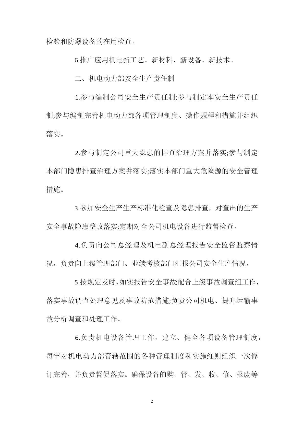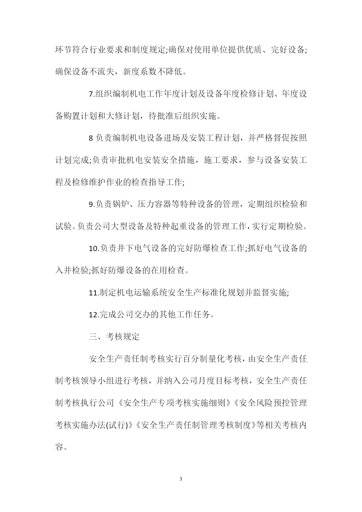 PAGEPAGE4机电动力部安全生产责任制机电动力部是矿井机电管理的职能部门,负责对矿井机电、提升运输、供排水、压风、通信联络系统进行业务检查指导和矿井机电设备管理,建立机电工作的规范化秩序,做到科学管理、合理使用、计划检修、安全运转,定期组织设备及配件的安全大检查等工作,安全生产职责如下:一、机电动力部安全生产责任范围1.严格贯彻执行国家有关安全生产的法律、法规、规章、规程、标准、技术规范和上级有关安全生产的指示、指令,依法进行安全生产监督检查。2.负责矿井机电设备管理工作,建立、健全各项设备管理制度。3.负责全公司机电、提升运输、供排水、压风设备、通信联络系统的安全运转和运行,按规定安排落实大型设备检修,保证各系统安全装置、安全设备齐全、有效。4.负责公司节能管理工作,制定节能管理办法、节能计划、节能技术进步措施、能源消耗定额,下达考核指标,监督并考核;同时开展节能宣传,组织节能培训,执行节能信息交流。5.负责井下电气设备的防爆性能检查,包括电气设备的入井检验和防爆设备的在用检查。6.推广应用机电新工艺、新材料、新设备、新技术。二、机电动力部安全生产责任制1.参与编制公司安全生产责任制;参与制定本安全生产责任制;参与编制完善机电动力部各项管理制度、操作规程和措施并组织落实。2.参与制定公司重大隐患的排查治理方案并落实;参与制定本部门隐患排查治理方案并落实;落实本部门重大危险源的安全管理措施。3.参加安全生产生产标准化检查及隐患排查,对查出的生产安全事故隐患整改落实;定期对全公司机电设备进行监督检查。4.负责向公司总经理及机电副总经理报告安全监督监察情况,负责向上级管理部门、业绩考核部门汇报公司安全生产情况。5.按规定及时、如实报告安全事故;配合上级事故调查组工作,落实事故调查处理意见及事故防范措施;负责公司机电、提升运输事故分析调查和处理工作。6.负责机电设备管理工作,建立、健全各项设备管理制度,每年对机电动力部管辖范围的各种管理制度和实施细则组织一次修订完善,并负责督促落实。确保设备的购、管、发、收、修、报废等环节符合行业要求和制度规定;确保对使用单位提供优质、完好设备;确保设备不流失,新度系数不降低。7.组织编制机电工作年度计划及设备年度检修计划、年度设备购置计划和大修计划,待批准后组织实施。8负责编制机电设备进场及安装工程计划,并严格督促按照计划完成;负责审批机电安装安全措施,施工要求,参与设备安装工程及检修维护作业的检查指导工作;9.负责锅炉、压力容器等特种设备的管理,定期组织检验和试验。负责公司大型设备及特种起重设备的管理工作,实行定期检验。10.负责井下电气设备的完好防爆检查工作;抓好电气设备的入井检验;抓好防爆设备的在用检查。11.制定机电运输系统安全生产标准化规划并监督实施;12.完成公司交办的其他工作任务。三、考核规定安全生产责任制考核实行百分制量化考核,由安全生产责任制考核领导小组进行考核,并纳入公司月度目标考核,安全生产责任制考核执行公司《安全生产专项考核实施细则》《安全风险预控管理考核实施办法(试行)》《安全生产责任制管理考核制度》等相关考核内容。