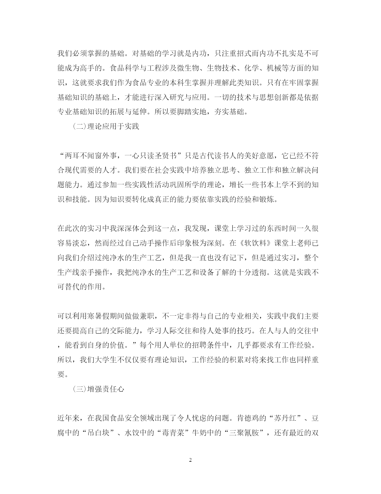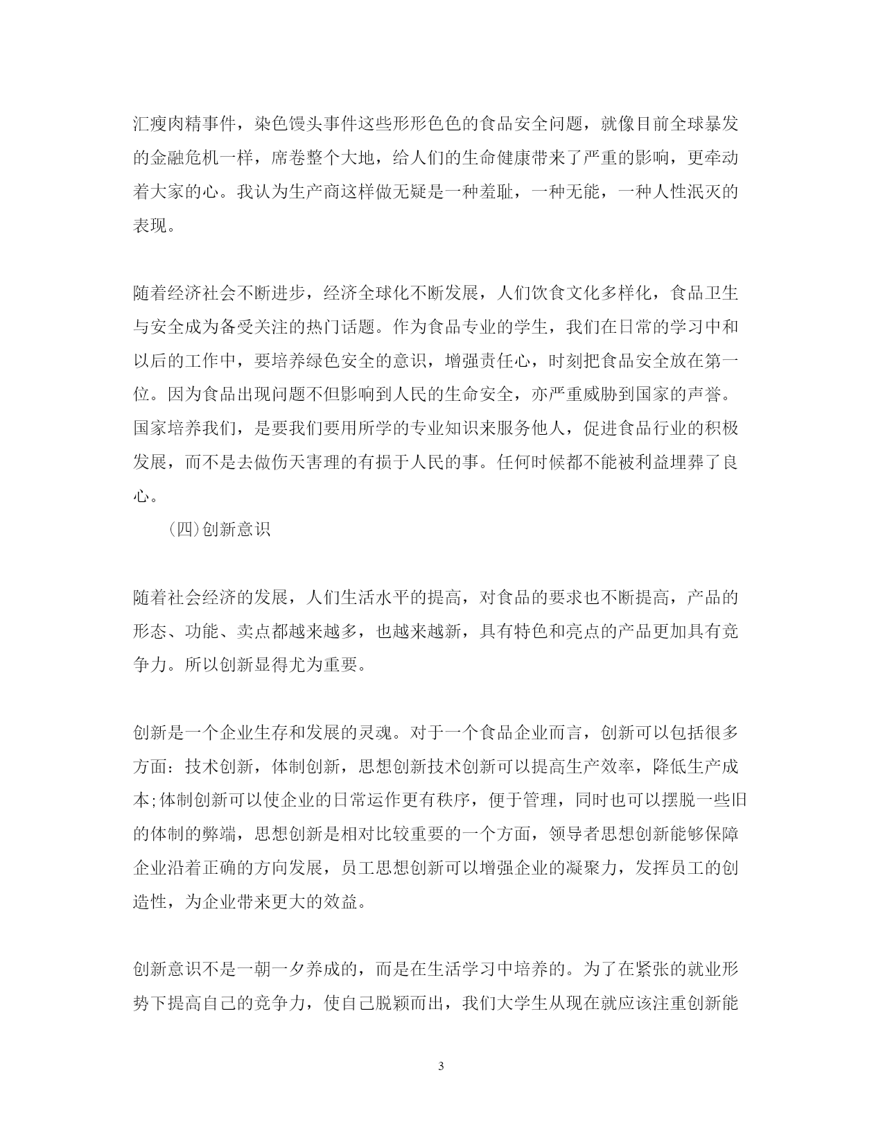 此资料由网络收集而来,如有侵权请告知上传者立即删除。资料共分享,我们负责传递知识。PAGEPAGE11专业实习自我鉴定范文转眼间,三个星期的食品教学实习结束了,此期间我收获颇多,学到知识的同时,也领悟到很多东西。大三的生活已经接近尾声,将课堂所学知识运用于实践是我们提高自己能力的必经之路。此次实习为我们提供了很好的机会。实习期间,我对桶装水生产线、饮料生产线、乳制品生产线和焙烤生产线有了更深刻的了解,更重要的是我们接触到了食品生产中常见的设备。以前只能在课堂上通过书上和老师PPT上的图片来了解食品设备的工作原理和结构,而在实习中,我们可以拆卸机器深入了解,这样的机会很珍贵,所以我十分珍惜此次实习。纸上得来终觉浅,绝知此事要躬行。在短暂的实习过程中,我深深的感觉到所学知识的肤浅和在实际运用中专业知识的匮乏。乳制品生产和果酒的生产我在课堂上已经学习过,但是涉及到某些具体工序的目的及原理时,知识还是很模糊,无法准确表述出来。例如我们知道硅藻土过滤的作用,却不了解其设备的工作原理。同时我认识到食品机械设备知识的重要性,在我们实习的过程中,硅藻土过滤器就出现了问题,然而我们束手无策,因为不懂其原理及构造,所以只能干着急却无能为力。虽然机械设备的学习对于一个女生来说很枯燥无味,但兴趣在于培养。理论知识是基础,没有知识量的积累,就无法达到质的突破。通过此次的实习,我总结,应对食品行业现在的发展状况和前景,作为一个食品专业的大学生,必须注意一下方面知识及意识的强化:(一)加强专业基础知识的学习专业基础就好比盖高楼时的根基,根基没打好早晚有一天会挎掉的,而且盖得越高,损失也越惨重。这些底层知识和课本不是没有用也不是高深的不能学,而是我们必须掌握的基础。对基础的学习就是内功,只注重招式而内功不扎实是不可能成为高手的。食品科学与工程涉及微生物、生物技术、化学、机械等方面的知识,这就要求我们作为食品专业的本科生掌握并理解此类知识。只有在牢固掌握基础知识的基础上,才能进行深入研究与应用。一切的技术与思想创新都是依据专业基础知识的拓展与延伸。所以要脚踏实地,夯实基础。(二)理论应用于实践“两耳不闻窗外事,一心只读圣贤书”只是古代读书人的美好意愿,它已经不符合现代需要的人才。我们要在社会实践中培养独立思考、独立工作和独立解决问题能力。通过参加一些实践性活动巩固所学的理论,增长一些书本上学不到的知识和技能。因为知识要转化成真正的能力要依靠实践的经验和锻炼。在此次的实习中我深深体会到这一点,我发现,课堂上学习过的东西时间一久很容易淡忘,然而经过自己动手操作后印象极为深刻。在《软饮料》课堂上老师已向我们介绍过纯净水的生产工艺,但是我一直也没有记下,但是通过实习,整个生产线亲手操作,我把纯净水的生产工艺和设备了解的十分透彻。这就是实践不可替代的作用。可以利用寒暑假期间做做兼职,不一定非得与自己的专业相关,实践中我们主要还要提高自己的交际能力,学习人际交往和待人处事的技巧。在人与人的交往中,能看到自身的价值。”每个用人单位的招聘条件中,几乎都要求有工作经验。所以,我们大学生不仅仅要有理论知识,工作经验的积累对将来找工作也同样重要。(三)增强责任心近年来,在我国食品安全领域出现了令人忧虑的问题。肯德鸡的“苏丹红”、豆腐中的“吊白块”、水饺中的“毒青菜”牛奶中的“三聚氰胺”,还有最近的双汇瘦肉精事件,染色馒头事件这些形形色色的食品安全问题,就像目前全球暴发的金融危机一样,席卷整个大地,给人们的生命健康带来了严重的影响,更牵动着大家的心。我认为生产商这样做无疑是一种羞耻,一种无能,一种人性泯灭的表现。随着经济社会不断进步,经济全球化不断发展,人们饮食文化多样化,食品卫生与安全成为备受关注的热门话题。作为食品专业的学生,我们在日常的学习中和以后的工作中,要培养绿色安全的意识,增强责任心,时刻把食品安全放在第一位。因为食品出现问题不但影响到人民的生命安全,亦严重威胁到国家的声誉。国家培养我们,是要我们要用所学的专业知识来服务他人,促进食品行业的积极发展,而不是去做伤天害理的有损于人民的事。任何时候都不能被利益埋葬了良心。(四)创新意识随着社会经济的发展,人们生活水平的提高,对食品的要求也不断提高,产品的形态、功能、卖点都越来越多,也越来越新,具有特色和亮点的产品更加具有竞争力。所以创新显得尤为重要。创新是一个企业生存和发展的灵魂。对于一个食品企业而言,创新可以包括很多方面:技术创新,体制创新,思想创新技术创新可以提高生产效率,降低生产成本;体制创新可以使企业的日常运作更有秩序,便于管理,同时也可以摆脱一些旧的体制的弊端,思想创新是相对比较重要的一个方面,领导者思想创新能够保障企业沿着正确的方向发展,员工思想创新可以增强企业