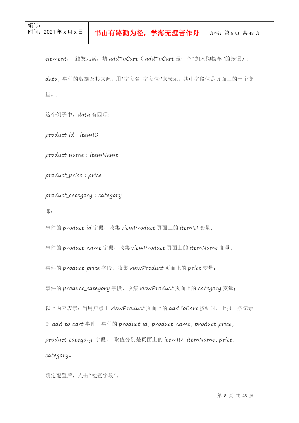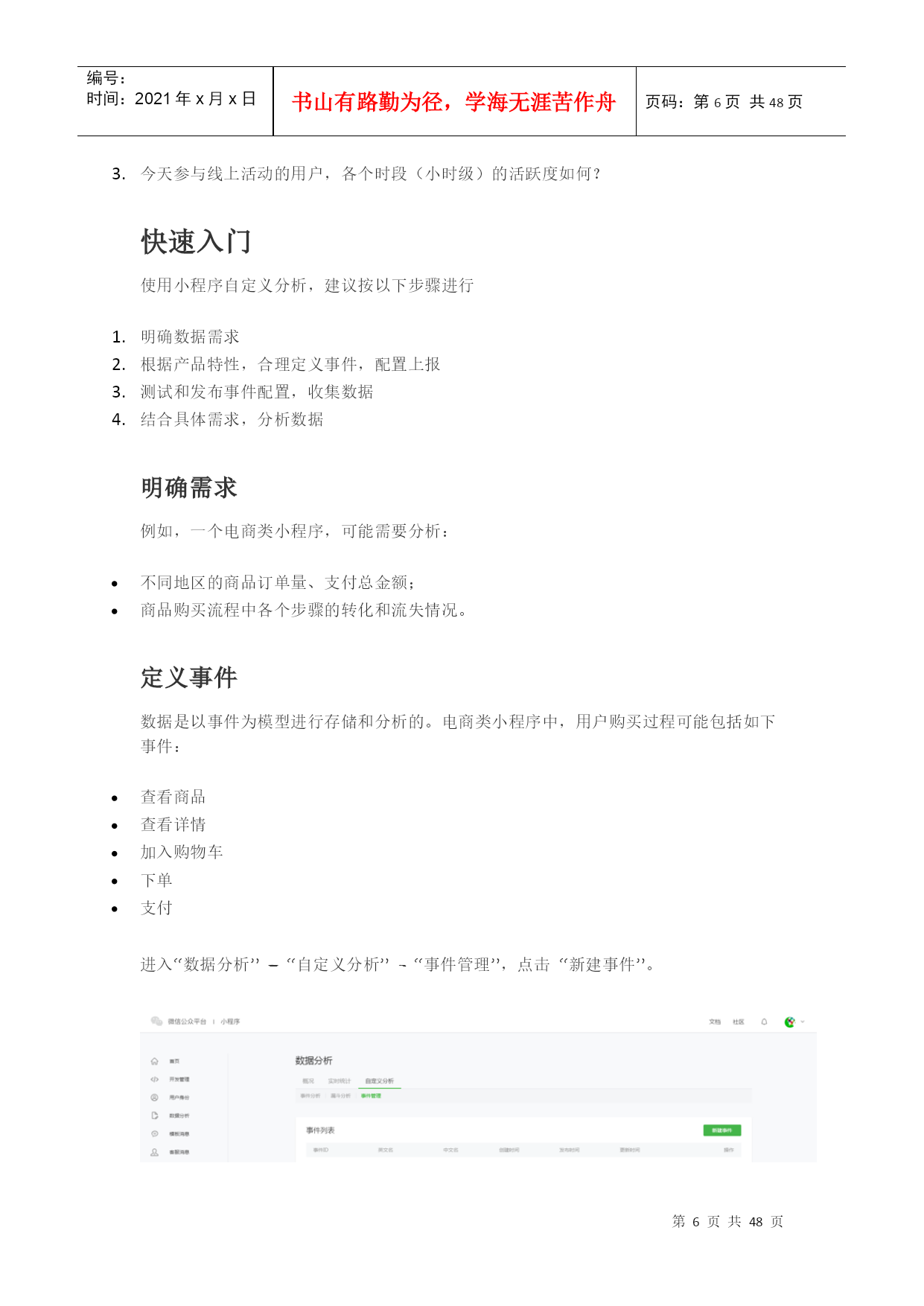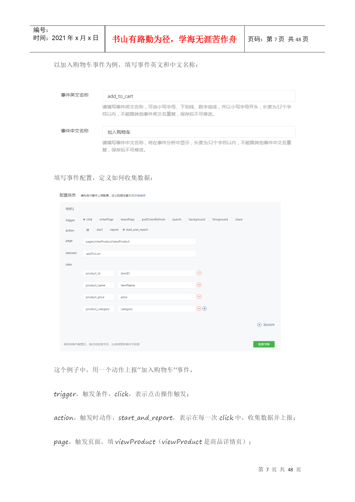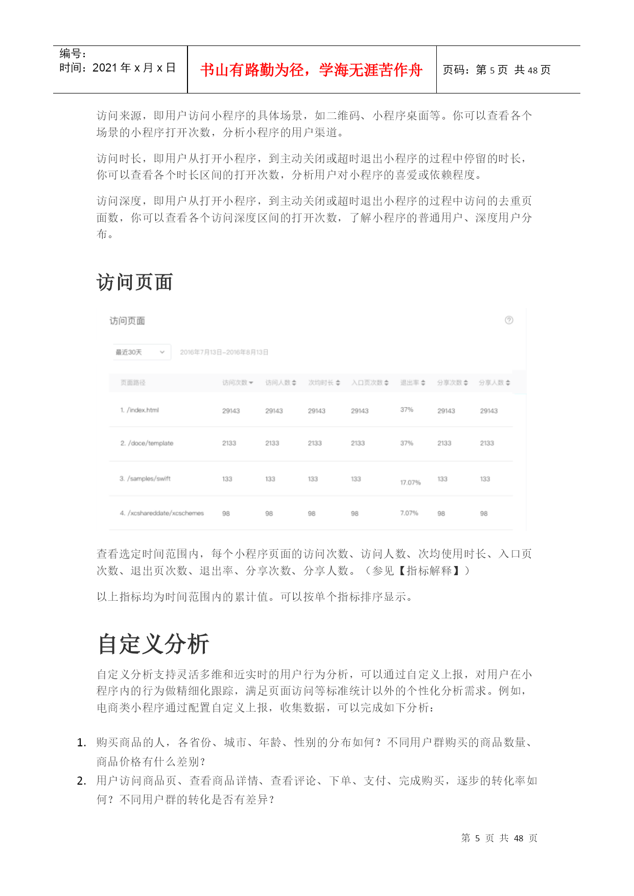 编号:时间:2021年x月x日书山有路勤为径,学海无涯苦作舟页码:第PAGE48页共NUMPAGES48页第PAGE\*MERGEFORMAT48页共NUMPAGES\*MERGEFORMAT48页微信小程序数据分析教程功能概述小程序数据分析,是面向小程序开发者、运营者的数据分析工具,提供关键指标统计、实时访问监控、自定义分析等,帮助小程序产品迭代优化和运营。主要功能如下:概况:提供小程序关键指标趋势以及top页面访问数据,快速了解小程序发展概况;访问分析:提供小程序用户访问来源、规模、频次、时长、深度以及页面详情等数据,具体分析用户新增和活跃情况;实时统计:提供小程序实时访问数据,满足实时监控需求;自定义分析:配置自定义上报,精细跟踪用户在小程序内的行为,结合用户属性、系统属性、事件属性进行灵活多维的事件分析和漏斗分析,满足小程序的个性化分析需求;留存分析:提供小程序新增用户和活跃用户的留存数据,分析用户留存与流失,功能正在开发中;用户画像:提供小程序的用户画像数据,包括用户地域、性别、平台类型、设备、网络类型等,功能正在开发中。概况昨日概况查看昨日关键用户指标,反映小程序昨日用户活跃概况,以及对比一天前、一周前、一月前的增长率。趋势概况查看关键指标的趋势,包括累计访问用户数、打开次数、访问次数、访问人数、新访问用户数、分享次数、分享人数、人均停留时长、次均停留时长(参见【指标解释】),可选择时间进行对比。Top页面查看用户最常访问的页面,以及页面访问次数和占比(单个页面访问次数/总访问次数),区分入口页和受访页。其中,入口页指用户进入小程序访问的第一个页面;受访页指用户访问的每一个页面。实时统计查看实时用户访问数据,可以选择所有页面或单个页面为分析对象,可以选择具体的时间粒度(1分钟、5分钟、10分钟、30分钟、1小时),可以按时间进行对比。为了更好地查看数据趋势,时间粒度为分钟时,请注意合理选择时间范围。详情数据查看每一个页面在所选时间范围内的总访问次数及占比。访问分析访问趋势查看小程序的用户访问趋势,包括打开次数、访问次数、访问人数、新用户数、人均访问时长、次均访问时长、平均访问深度。(参见【指标解释】)可以选择时间粒度,按天、周、月汇总查看。当时间粒度为周或月时,次数为累计汇总值,人数去重。访问分布访问来源,即用户访问小程序的具体场景,如二维码、小程序桌面等。你可以查看各个场景的小程序打开次数,分析小程序的用户渠道。访问时长,即用户从打开小程序,到主动关闭或超时退出小程序的过程中停留的时长,你可以查看各个时长区间的打开次数,分析用户对小程序的喜爱或依赖程度。访问深度,即用户从打开小程序,到主动关闭或超时退出小程序的过程中访问的去重页面数,你可以查看各个访问深度区间的打开次数,了解小程序的普通用户、深度用户分布。访问页面查看选定时间范围内,每个小程序页面的访问次数、访问人数、次均使用时长、入口页次数、退出页次数、退出率、分享次数、分享人数。(参见【指标解释】)以上指标均为时间范围内的累计值。可以按单个指标排序显示。自定义分析自定义分析支持灵活多维和近实时的用户行为分析,可以通过自定义上报,对用户在小程序内的行为做精细化跟踪,满足页面访问等标准统计以外的个性化分析需求。例如,电商类小程序通过配置自定义上报,收集数据,可以完成如下分析:购买商品的人,各省份、城市、年龄、性别的分布如何?不同用户群购买的商品数量、商品价格有什么差别?用户访问商品页、查看商品详情、查看评论、下单、支付、完成购买,逐步的转化率如何?不同用户群的转化是否有差异?今天参与线上活动的用户,各个时段(小时级)的活跃度如何?快速入门使用小程序自定义分析,建议按以下步骤进行明确数据需求根据产品特性,合理定义事件,配置上报测试和发布事件配置,收集数据结合具体需求,分析数据明确需求例如,一个电商类小程序,可能需要分析:不同地区的商品订单量、支付总金额;商品购买流程中各个步骤的转化和流失情况。定义事件数据是以事件为模型进行存储和分析的。电商类小程序中,用户购买过程可能包括如下事件:查看商品查看详情加入购物车下单支付进入“数据分析”–“自定义分析”-“事件管理”,点击“新建事件”。以加入购物车事件为例,填写事件英文和中文名称:填写事件配置,定义如何收集数据:这个例子中,用一个动作上报“加入购物车”事件。trigger,触发条件,click,表示点击操作触发;action,触发时动作,start_and_report,表示在每一次click中,收集数据并上报;page,触发页面,填viewProdu