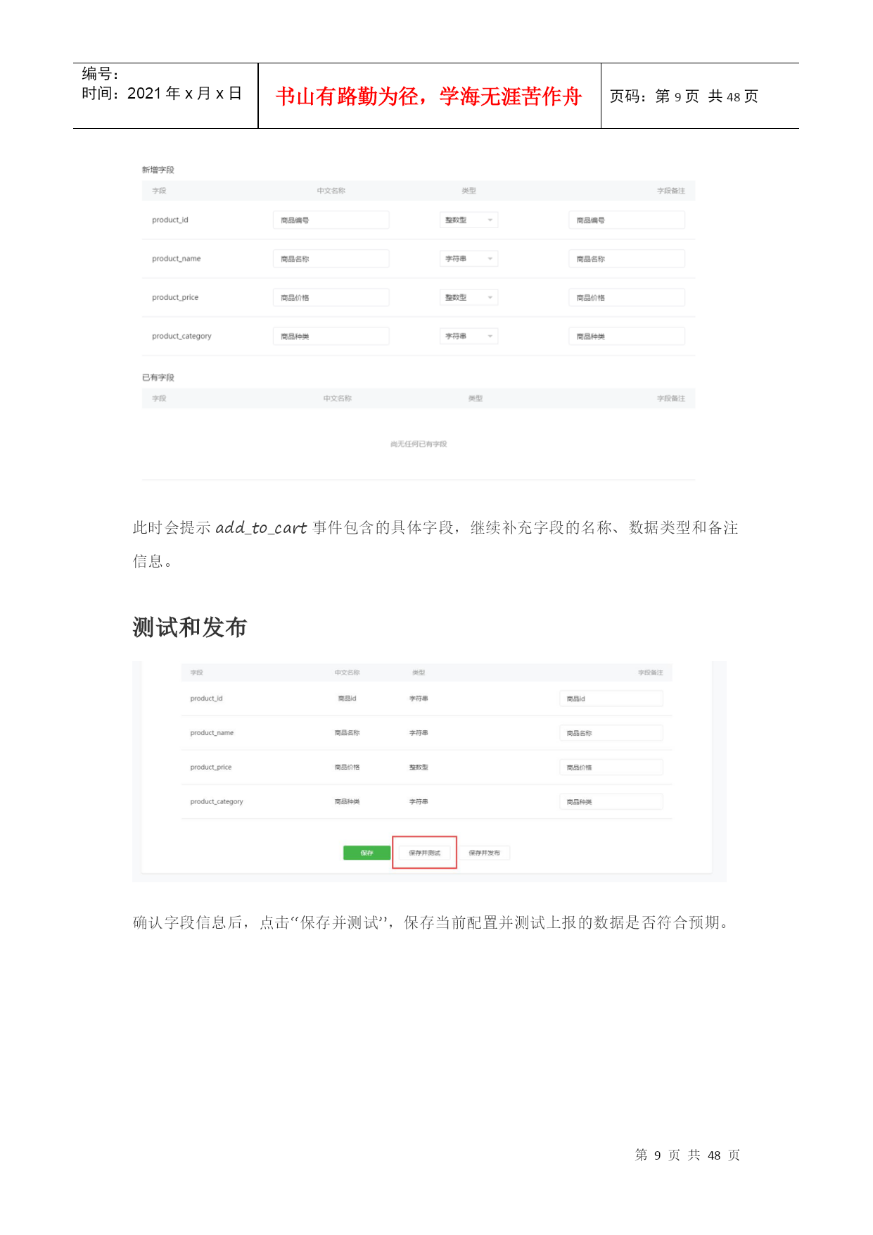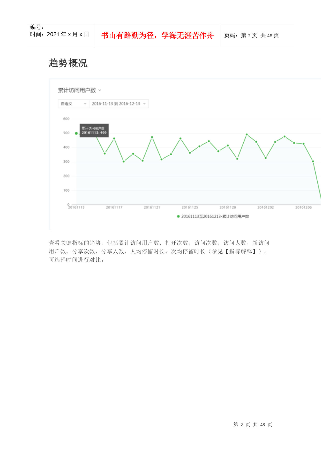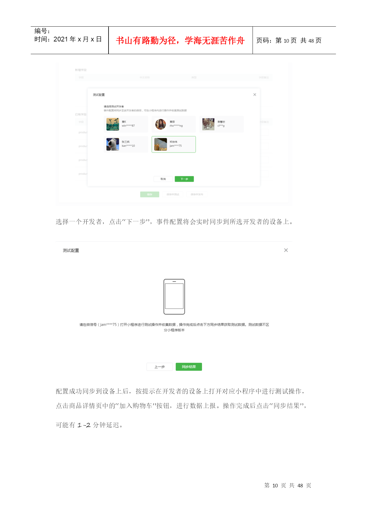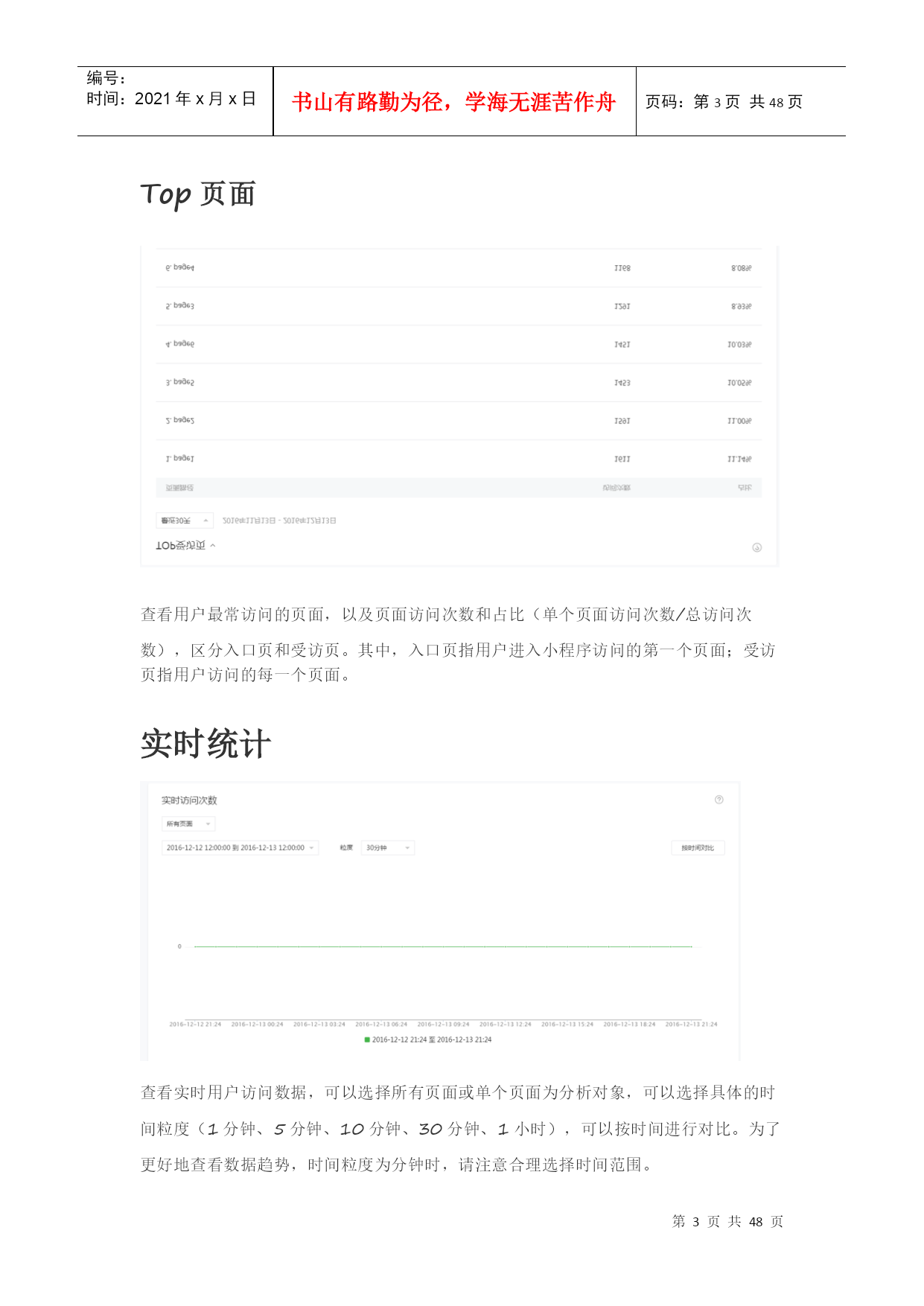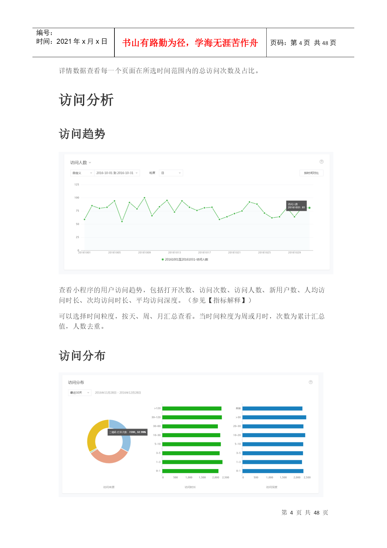编号:时间:2021年x月x日书山有路勤为径,学海无涯苦作舟页码:第PAGE48页共NUMPAGES48页第PAGE\*MERGEFORMAT48页共NUMPAGES\*MERGEFORMAT48页微信小程序数据分析教程功能概述小程序数据分析,是面向小程序开发者、运营者的数据分析工具,提供关键指标统计、实时访问监控、自定义分析等,帮助小程序产品迭代优化和运营。主要功能如下:概况:提供小程序关键指标趋势以及top页面访问数据,快速了解小程序发展概况;访问分析:提供小程序用户访问来源、规模、频次、时长、深度以及页面详情等数据,具体分析用户新增和活跃情况;实时统计:提供小程序实时访问数据,满足实时监控需求;自定义分析:配置自定义上报,精细跟踪用户在小程序内的行为,结合用户属性、系统属性、事件属性进行灵活多维的事件分析和漏斗分析,满足小程序的个性化分析需求;留存分析:提供小程序新增用户和活跃用户的留存数据,分析用户留存与流失,功能正在开发中;用户画像:提供小程序的用户画像数据,包括用户地域、性别、平台类型、设备、网络类型等,功能正在开发中。概况昨日概况查看昨日关键用户指标,反映小程序昨日用户活跃概况,以及对比一天前、一周前、一月前的增长率。趋势概况查看关键指标的趋势,包括累计访问用户数、打开次数、访问次数、访问人数、新访问用户数、分享次数、分享人数、人均停留时长、次均停留时长(参见【指标解释】),可选择时间进行对比。Top页面查看用户最常访问的页面,以及页面访问次数和占比(单个页面访问次数/总访问次数),区分入口页和受访页。其中,入口页指用户进入小程序访问的第一个页面;受访页指用户访问的每一个页面。实时统计查看实时用户访问数据,可以选择所有页面或单个页面为分析对象,可以选择具体的时间粒度(1分钟、5分钟、10分钟、30分钟、1小时),可以按时间进行对比。为了更好地查看数据趋势,时间粒度为分钟时,请注意合理选择时间范围。详情数据查看每一个页面在所选时间范围内的总访问次数及占比。访问分析访问趋势查看小程序的用户访问趋势,包括打开次数、访问次数、访问人数、新用户数、人均访问时长、次均访问时长、平均访问深度。(参见【指标解释】)可以选择时间粒度,按天、周、月汇总查看。当时间粒度为周或月时,次数为累计汇总值,人数去重。访问分布访问来源,即用户访问小程序的具体场景,如二维码、小程序桌面等。你可以查看各个场景的小程序打开次数,分析小程序的用户渠道。访问时长,即用户从打开小程序,到主动关闭或超时退出小程序的过程中停留的时长,你可以查看各个时长区间的打开次数,分析用户对小程序的喜爱或依赖程度。访问深度,即用户从打开小程序,到主动关闭或超时退出小程序的过程中访问的去重页面数,你可以查看各个访问深度区间的打开次数,了解小程序的普通用户、深度用户分布。访问页面查看选定时间范围内,每个小程序页面的访问次数、访问人数、次均使用时长、入口页次数、退出页次数、退出率、分享次数、分享人数。(参见【指标解释】)以上指标均为时间范围内的累计值。可以按单个指标排序显示。自定义分析自定义分析支持灵活多维和近实时的用户行为分析,可以通过自定义上报,对用户在小程序内的行为做精细化跟踪,满足页面访问等标准统计以外的个性化分析需求。例如,电商类小程序通过配置自定义上报,收集数据,可以完成如下分析:购买商品的人,各省份、城市、年龄、性别的分布如何?不同用户群购买的商品数量、商品价格有什么差别?用户访问商品页、查看商品详情、查看评论、下单、支付、完成购买,逐步的转化率如何?不同用户群的转化是否有差异?今天参与线上活动的用户,各个时段(小时级)的活跃度如何?快速入门使用小程序自定义分析,建议按以下步骤进行明确数据需求根据产品特性,合理定义事件,配置上报测试和发布事件配置,收集数据结合具体需求,分析数据明确需求例如,一个电商类小程序,可能需要分析:不同地区的商品订单量、支付总金额;商品购买流程中各个步骤的转化和流失情况。定义事件数据是以事件为模型进行存储和分析的。电商类小程序中,用户购买过程可能包括如下事件:查看商品查看详情加入购物车下单支付进入“数据分析”–“自定义分析”-“事件管理”,点击“新建事件”。以加入购物车事件为例,填写事件英文和中文名称:填写事件配置,定义如何收集数据:这个例子中,用一个动作上报“加入购物车”事件。trigger,触发条件,click,表示点击操作触发;action,触发时动作,start_and_report,表示在每一次click中,收集数据并上报;page,触发页面,填viewProdu