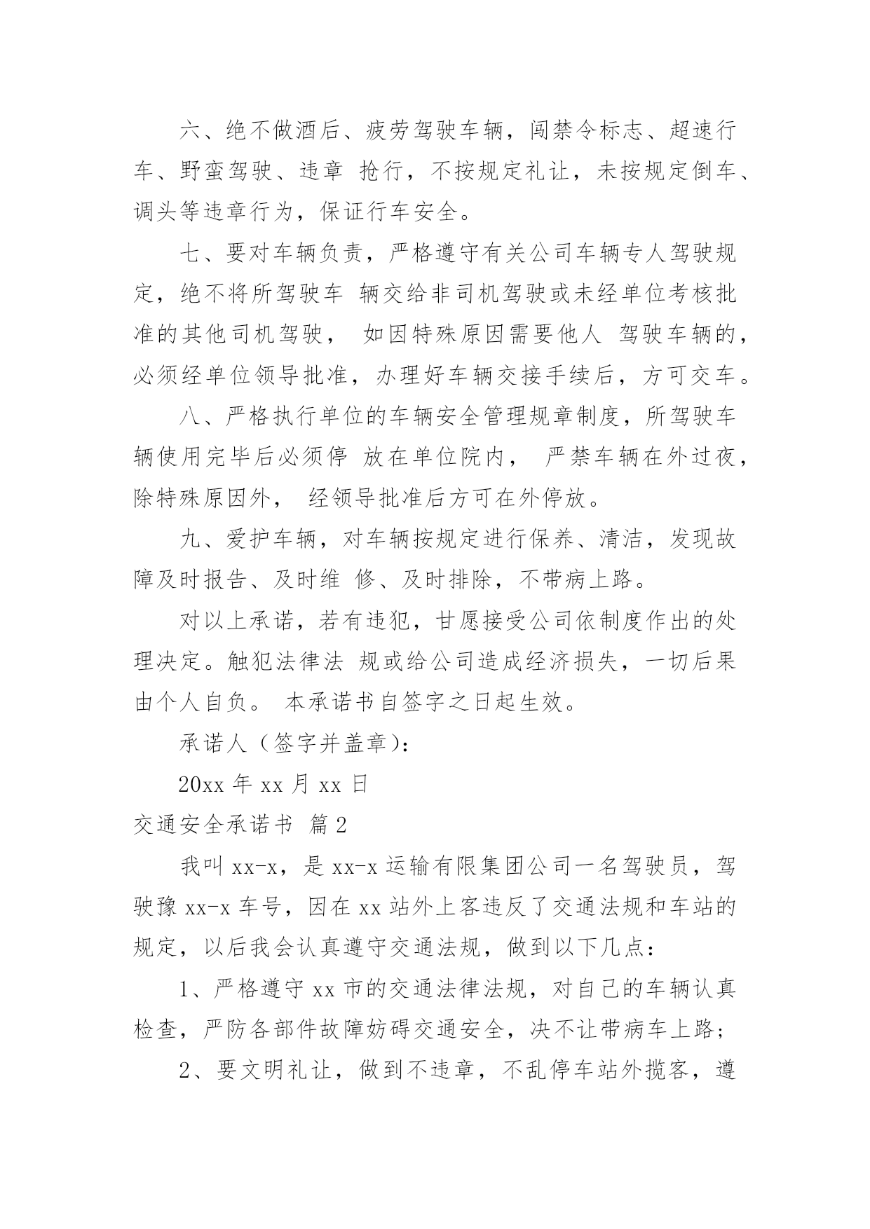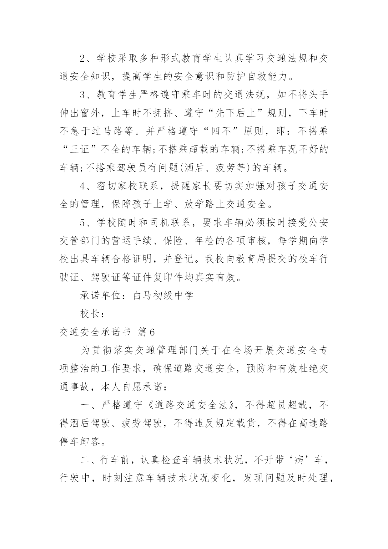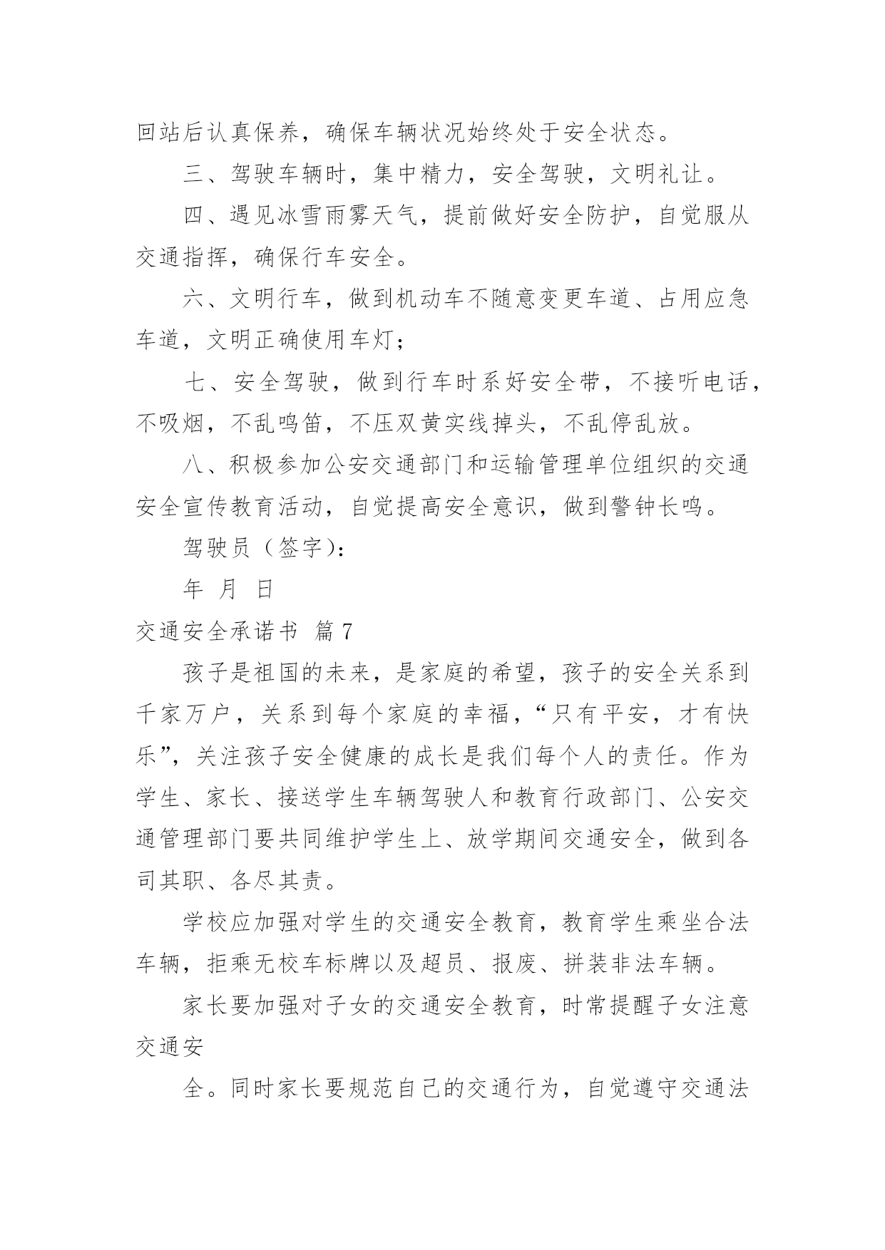 交通安全承诺书交通安全承诺书范文7篇在我们平凡的日常里,承诺书的使用频率越来越高,承诺书是单方意思表示,不具有合同效力。写起承诺书来就毫无头绪?以下是小编整理的交通安全承诺书7篇,欢迎大家借鉴与参考,希望对大家有所帮助。交通安全承诺书篇1为了保障自己和他人的人身、财产安全,本人自愿承诺并遵守、认真履行下列条款内容:一、认真学习并自觉遵守《中华人民共和国道路交通安全法》及相关《实施细则》,坚持“安全第一、文明行车”“宁停三分、不抢一秒”的职业行为准则。二、积极参加单位组织的交通安全教育学习和培训,接受单位定期安全知识、驾驶技能和机械常识的考核。三、精心维护所驾车辆,严格落实车辆《三检》制度,保持车辆技术状况完好,严格按规程操作车辆,杜绝车辆机械事故的发生。四、在无任务时,要在车队待命,做到坚守岗位、服从领导、听从分配、随叫随到,因故外出经领导同意,保证雷厉风行、令行禁止,不推诿扯皮。五、在动用车辆时,严格执行报告、登记制度。事前必须经领导批准,返回后,及时按照规定登记出车情况。六、绝不做酒后、疲劳驾驶车辆,闯禁令标志、超速行车、野蛮驾驶、违章抢行,不按规定礼让,未按规定倒车、调头等违章行为,保证行车安全。七、要对车辆负责,严格遵守有关公司车辆专人驾驶规定,绝不将所驾驶车辆交给非司机驾驶或未经单位考核批准的其他司机驾驶,如因特殊原因需要他人驾驶车辆的,必须经单位领导批准,办理好车辆交接手续后,方可交车。八、严格执行单位的车辆安全管理规章制度,所驾驶车辆使用完毕后必须停放在单位院内,严禁车辆在外过夜,除特殊原因外,经领导批准后方可在外停放。九、爱护车辆,对车辆按规定进行保养、清洁,发现故障及时报告、及时维修、及时排除,不带病上路。对以上承诺,若有违犯,甘愿接受公司依制度作出的处理决定。触犯法律法规或给公司造成经济损失,一切后果由个人自负。本承诺书自签字之日起生效。承诺人(签字并盖章):20xx年xx月xx日交通安全承诺书篇2我叫xx-x,是xx-x运输有限集团公司一名驾驶员,驾驶豫xx-x车号,因在xx站外上客违反了交通法规和车站的规定,以后我会认真遵守交通法规,做到以下几点:1、严格遵守xx市的交通法律法规,对自己的车辆认真检查,严防各部件故障妨碍交通安全,决不让带病车上路;2、要文明礼让,做到不违章,不乱停车站外揽客,遵章守法,做好安检工作,服从站内的一切管理;3、保证车辆干净整洁,礼貌待客、给乘客创造一个文明守法的乘车环境;4、严禁易燃易爆危险品上车,认真遵守好运营规则,做到站外不停车上下人和货物,不超员超载给我站创造一个好的榜样,开好车。单位:xx-xxx-xx公司车号:保证人:交通安全承诺书篇3安全无小事,交通安全从我做起。众多的事故告诉我们,交通事故的发生往往只是行人、车辆一念之间的疏忽、大意。为了进一步增强同学们的交通安全意识和遵守交通法规的自觉性,保障每一位同学的生命安全,保障学生上学、放学路上的交通安全,我校开展自觉遵守交通规则、文明出行的承诺活动。要求每一位学生及家长自觉做到以下承诺:家长承诺:1、家长不使用无证、无牌、报废车辆,农用车、三轮车、手扶车、“病车”、超载车等低速车、面包车等不符合法定载客要求的车辆接送学生,不酒后驾驶车辆接送学生。2、对孩子履行监护人的义务,保障孩子在校外的交通安全。配合学校加强对孩子的交通安全教育,一定督促好孩子认真学习交通法规和交通安全知识,提高自己的'安全意识和防护自救能力,时刻提醒自己注意维护自己和他人的交通安全,并教育孩子自觉遵守交通安全法规。发现孩子的不良交通行为及时教育和纠正。3、教育孩子上下学途中不得嬉戏打闹,注意交通法规,过马路时要注意交通信号标志,注意来往车辆,要靠右行走。提高子女的交通安全意识。4、密切与学校沟通共同教育管理学生。学生承诺:1、认真学习交通安全知识,遵守交通法规,提高自己的安全意识和防护自救能力。2、严格遵守交通法规,不追逐打闹,不三五并肩行驶;3、严格遵守“五不”原则:乘坐汽车时,不得将头、胳膊等身体部位伸向窗外;不准乘坐无证、无牌、证件不全的车辆和报废车辆;不乘坐农用车、三轮车、“病车”、超载车等不符合法定载客要求的车辆;不搭乘司机酒后、疲劳等的车辆;不搭乘危险驾驶的车辆。4、在道路上行走做到:走路靠右行,不违章过马路,在没有交通信号的交叉路口或横穿公路时要慢行,注意观察、看清来往车辆。做到“一停二看三通过”;“红灯停、绿灯行”等。不骑自行车。5严格执行学校、家长的交通安全教育。服从指挥,严格遵守其他应该遵守的交通法规。承诺人:学生(签名):年级班家长(签名):交通安全承诺书篇4安全无小事,交通安全从我做起。我承诺自觉做到以下几点:1、认真学习交通安全知识,遵守交通法规,提高自己的安全意识和防护自救能力。2、严格遵守交通法规,坚决不骑车上