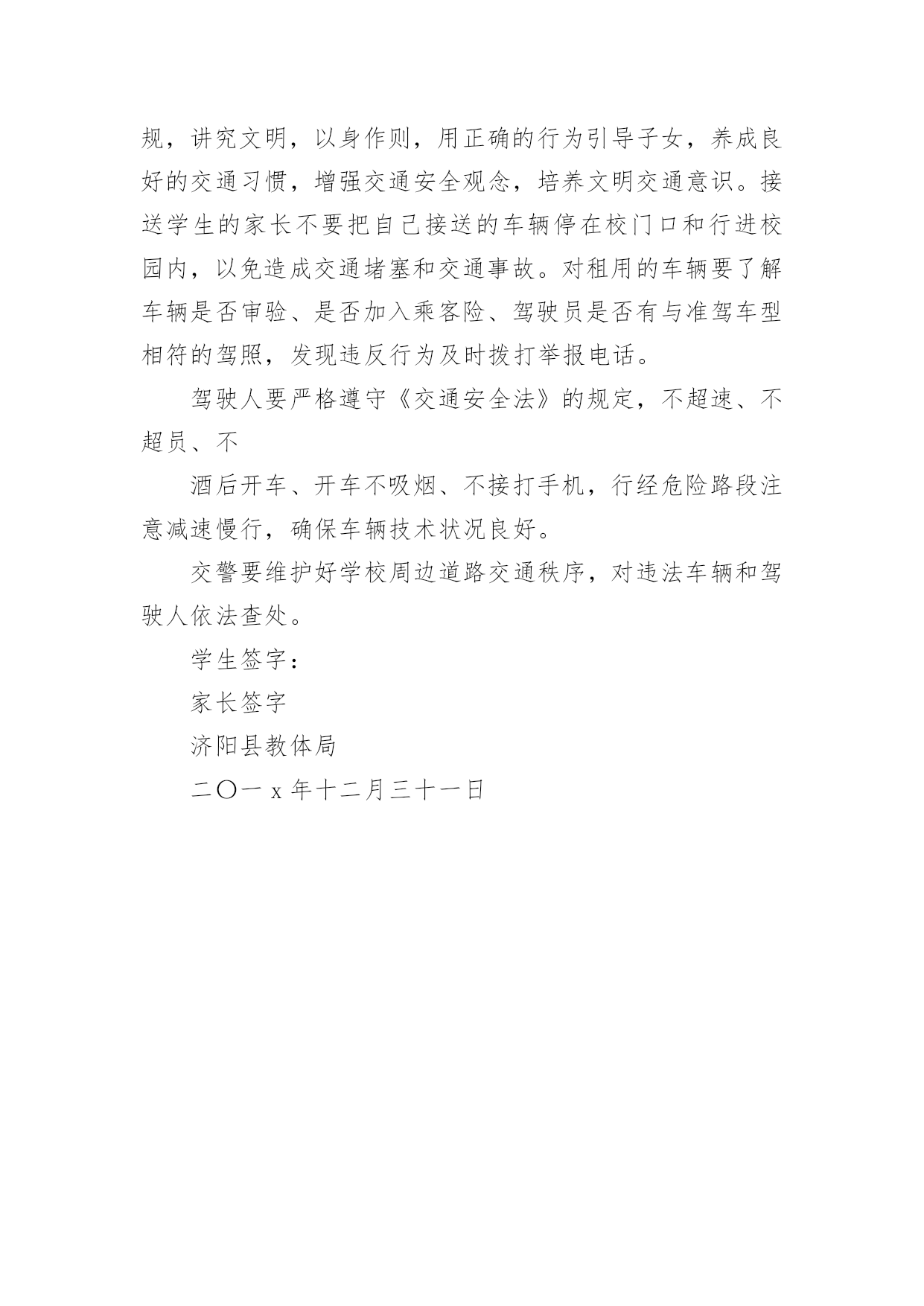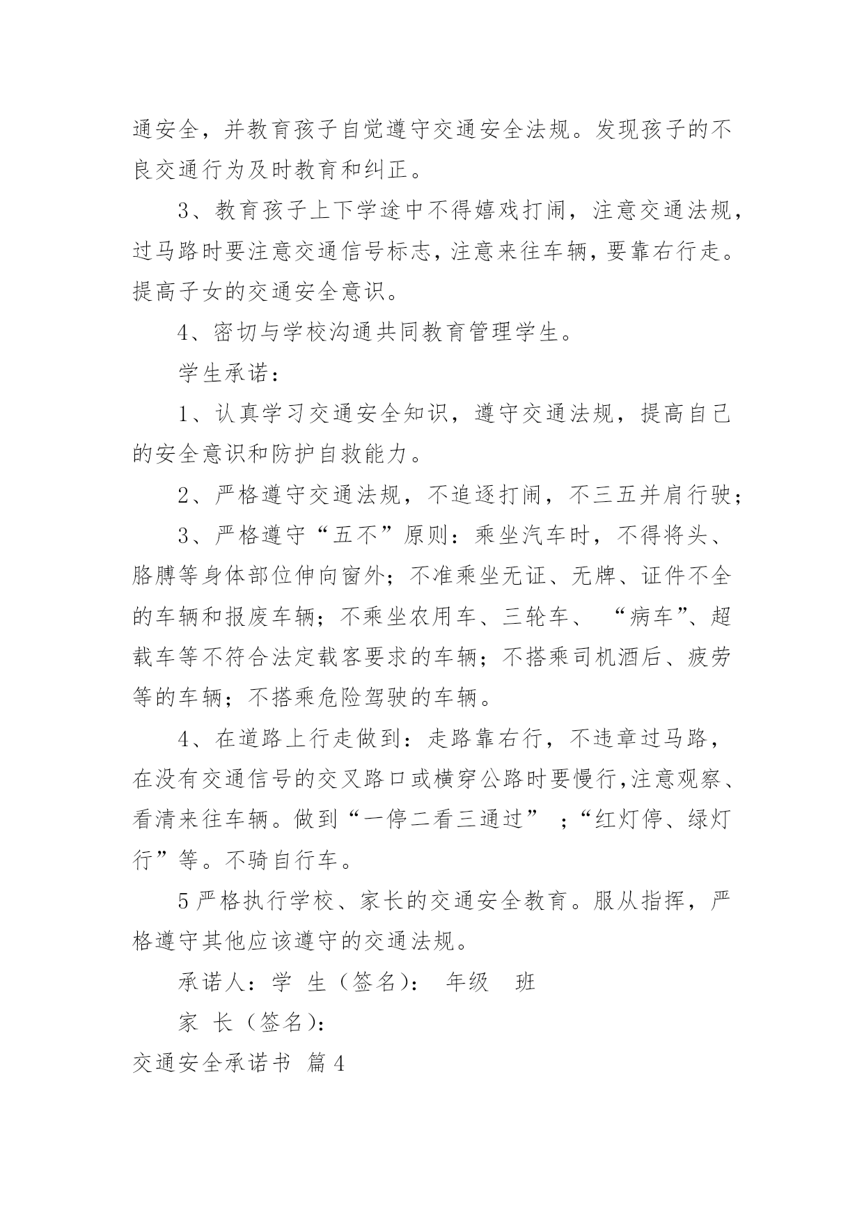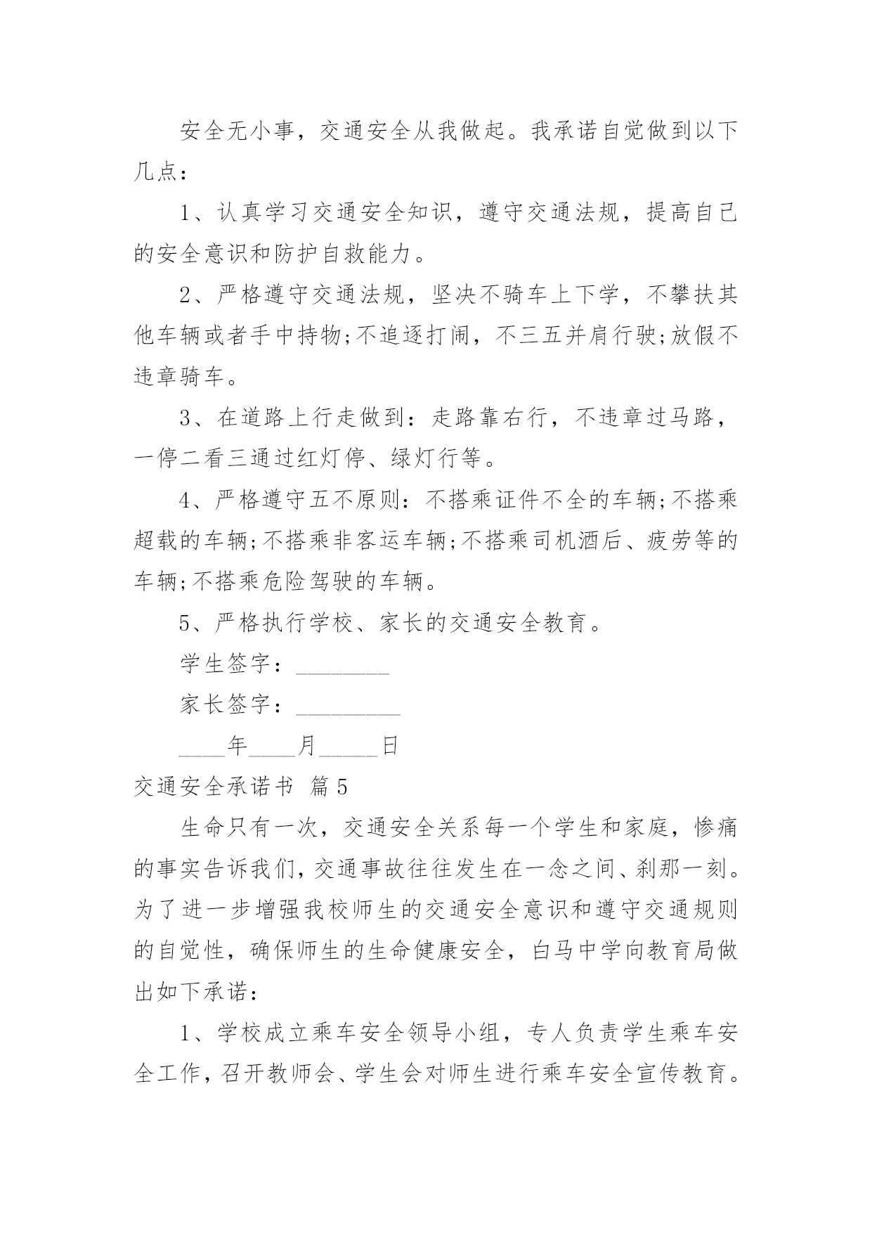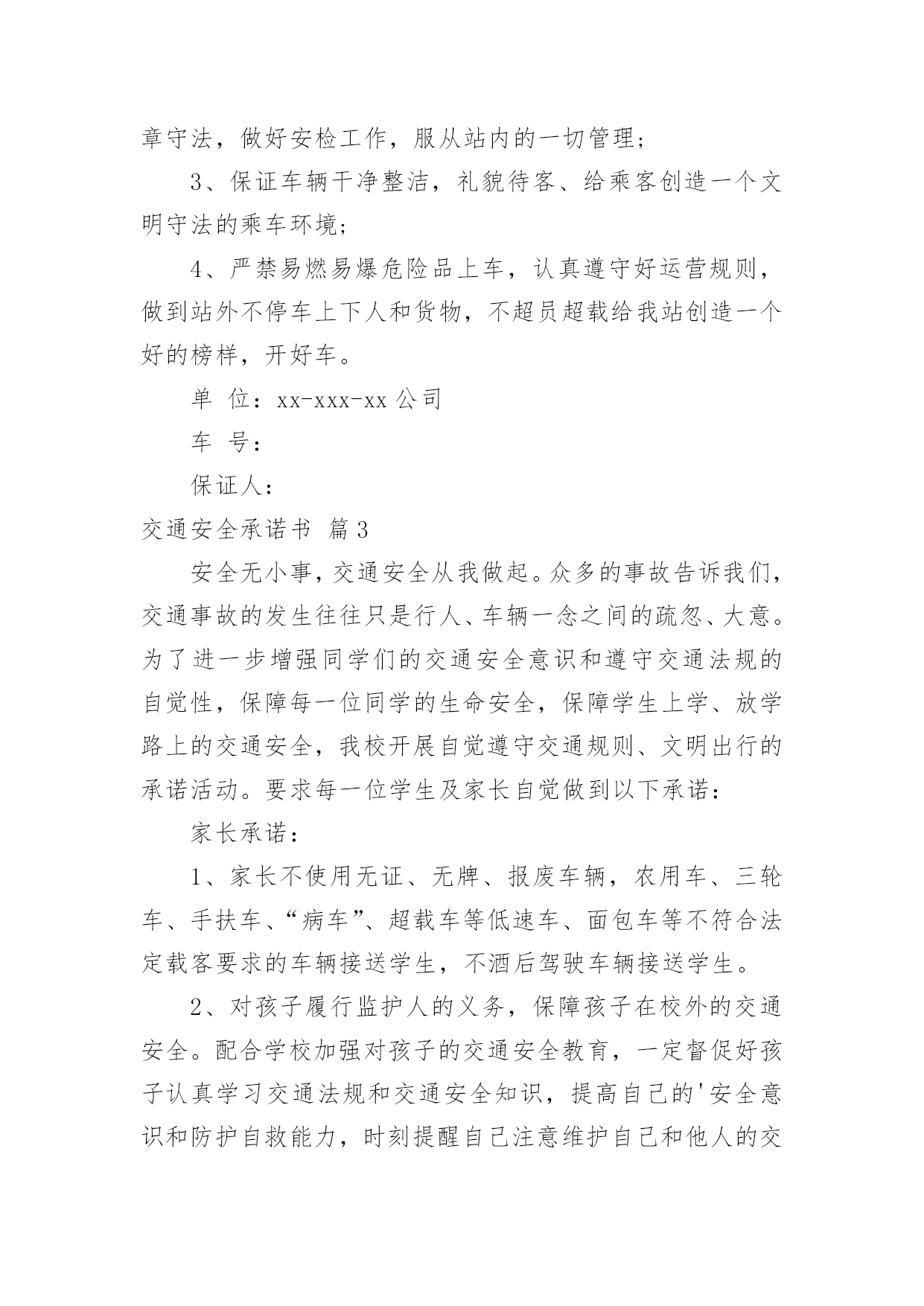 交通安全承诺书交通安全承诺书范文7篇在我们平凡的日常里,承诺书的使用频率越来越高,承诺书是单方意思表示,不具有合同效力。写起承诺书来就毫无头绪?以下是小编整理的交通安全承诺书7篇,欢迎大家借鉴与参考,希望对大家有所帮助。交通安全承诺书篇1为了保障自己和他人的人身、财产安全,本人自愿承诺并遵守、认真履行下列条款内容:一、认真学习并自觉遵守《中华人民共和国道路交通安全法》及相关《实施细则》,坚持“安全第一、文明行车”“宁停三分、不抢一秒”的职业行为准则。二、积极参加单位组织的交通安全教育学习和培训,接受单位定期安全知识、驾驶技能和机械常识的考核。三、精心维护所驾车辆,严格落实车辆《三检》制度,保持车辆技术状况完好,严格按规程操作车辆,杜绝车辆机械事故的发生。四、在无任务时,要在车队待命,做到坚守岗位、服从领导、听从分配、随叫随到,因故外出经领导同意,保证雷厉风行、令行禁止,不推诿扯皮。五、在动用车辆时,严格执行报告、登记制度。事前必须经领导批准,返回后,及时按照规定登记出车情况。六、绝不做酒后、疲劳驾驶车辆,闯禁令标志、超速行车、野蛮驾驶、违章抢行,不按规定礼让,未按规定倒车、调头等违章行为,保证行车安全。七、要对车辆负责,严格遵守有关公司车辆专人驾驶规定,绝不将所驾驶车辆交给非司机驾驶或未经单位考核批准的其他司机驾驶,如因特殊原因需要他人驾驶车辆的,必须经单位领导批准,办理好车辆交接手续后,方可交车。八、严格执行单位的车辆安全管理规章制度,所驾驶车辆使用完毕后必须停放在单位院内,严禁车辆在外过夜,除特殊原因外,经领导批准后方可在外停放。九、爱护车辆,对车辆按规定进行保养、清洁,发现故障及时报告、及时维修、及时排除,不带病上路。对以上承诺,若有违犯,甘愿接受公司依制度作出的处理决定。触犯法律法规或给公司造成经济损失,一切后果由个人自负。本承诺书自签字之日起生效。承诺人(签字并盖章):20xx年xx月xx日交通安全承诺书篇2我叫xx-x,是xx-x运输有限集团公司一名驾驶员,驾驶豫xx-x车号,因在xx站外上客违反了交通法规和车站的规定,以后我会认真遵守交通法规,做到以下几点:1、严格遵守xx市的交通法律法规,对自己的车辆认真检查,严防各部件故障妨碍交通安全,决不让带病车上路;2、要文明礼让,做到不违章,不乱停车站外揽客,遵章守法,做好安检工作,服从站内的一切管理;3、保证车辆干净整洁,礼貌待客、给乘客创造一个文明守法的乘车环境;4、严禁易燃易爆危险品上车,认真遵守好运营规则,做到站外不停车上下人和货物,不超员超载给我站创造一个好的榜样,开好车。单位:xx-xxx-xx公司车号:保证人:交通安全承诺书篇3安全无小事,交通安全从我做起。众多的事故告诉我们,交通事故的发生往往只是行人、车辆一念之间的疏忽、大意。为了进一步增强同学们的交通安全意识和遵守交通法规的自觉性,保障每一位同学的生命安全,保障学生上学、放学路上的交通安全,我校开展自觉遵守交通规则、文明出行的承诺活动。要求每一位学生及家长自觉做到以下承诺:家长承诺:1、家长不使用无证、无牌、报废车辆,农用车、三轮车、手扶车、“病车”、超载车等低速车、面包车等不符合法定载客要求的车辆接送学生,不酒后驾驶车辆接送学生。2、对孩子履行监护人的义务,保障孩子在校外的交通安全。配合学校加强对孩子的交通安全教育,一定督促好孩子认真学习交通法规和交通安全知识,提高自己的'安全意识和防护自救能力,时刻提醒自己注意维护自己和他人的交通安全,并教育孩子自觉遵守交通安全法规。发现孩子的不良交通行为及时教育和纠正。3、教育孩子上下学途中不得嬉戏打闹,注意交通法规,过马路时要注意交通信号标志,注意来往车辆,要靠右行走。提高子女的交通安全意识。4、密切与学校沟通共同教育管理学生。学生承诺:1、认真学习交通安全知识,遵守交通法规,提高自己的安全意识和防护自救能力。2、严格遵守交通法规,不追逐打闹,不三五并肩行驶;3、严格遵守“五不”原则:乘坐汽车时,不得将头、胳膊等身体部位伸向窗外;不准乘坐无证、无牌、证件不全的车辆和报废车辆;不乘坐农用车、三轮车、“病车”、超载车等不符合法定载客要求的车辆;不搭乘司机酒后、疲劳等的车辆;不搭乘危险驾驶的车辆。4、在道路上行走做到:走路靠右行,不违章过马路,在没有交通信号的交叉路口或横穿公路时要慢行,注意观察、看清来往车辆。做到“一停二看三通过”;“红灯停、绿灯行”等。不骑自行车。5严格执行学校、家长的交通安全教育。服从指挥,严格遵守其他应该遵守的交通法规。承诺人:学生(签名):年级班家长(签名):交通安全承诺书篇4安全无小事,交通安全从我做起。我承诺自觉做到以下几点:1、认真学习交通安全知识,遵守交通法规,提高自己的安全意识和防护自救能力。2、严格遵守交通法规,坚决不骑车上