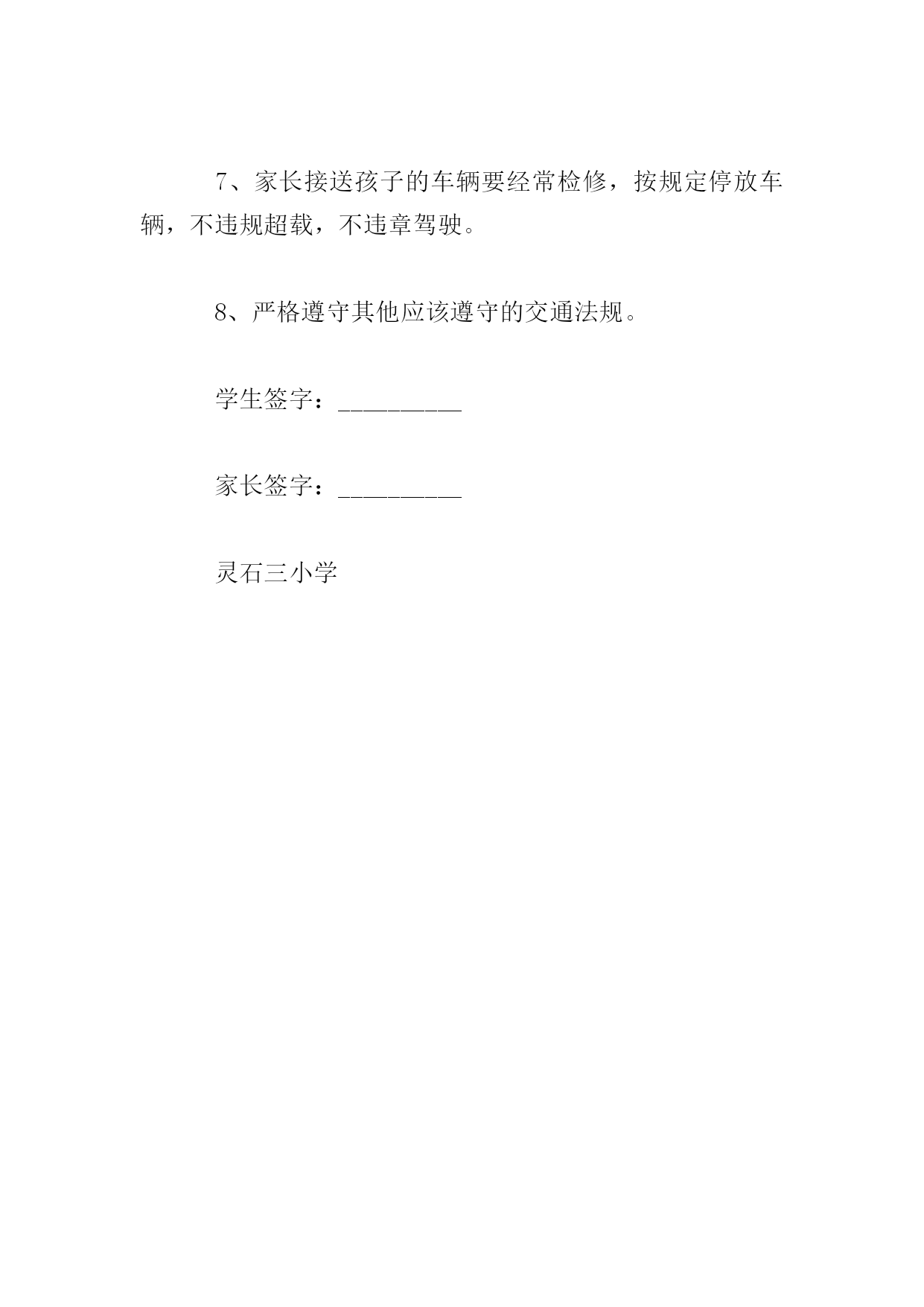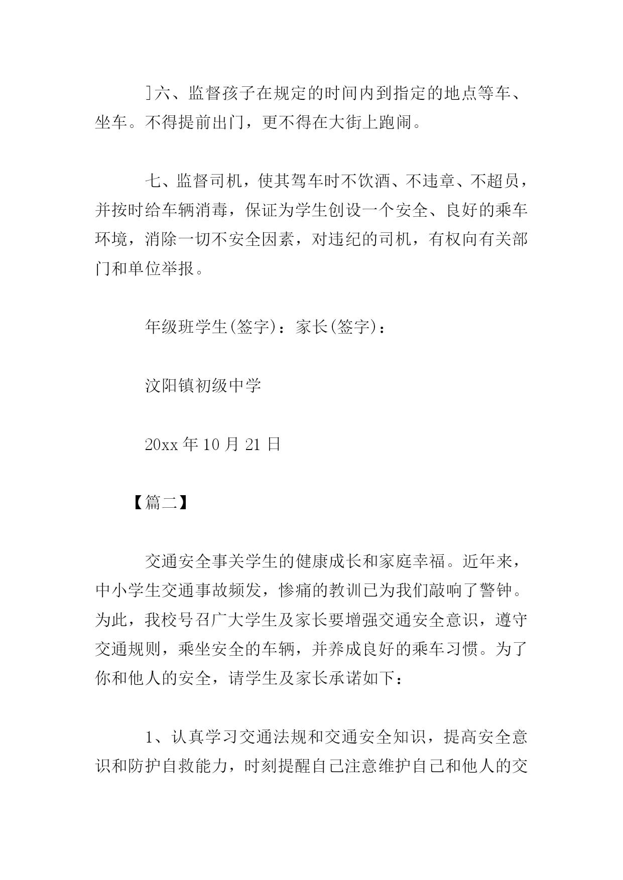 交通安全的保证书范文【篇一】为保证学生的交通安全,我保证做到:一、认真教育孩子,自觉遵守交通法规,养成良好的行为习惯.不在公路上踢球、游玩、戏闹。上学、放学时时处处注意交通安全。二、教育孩子乘车时要遵守秩序,注意乘车安全。三、作为孩子的第一监护人,我保证孩子不乘坐无标识、无证、无牌或不合手续的报废车、农用车及个别私自组织的无运营手续的违规车辆。否则发生问题,后果自负。四、教育孩子文明乘车,不拥挤,不抢座,不打架,自觉遵守乘车纪律,确保乘车期间的人身安全。五、现在个别接送学生的车辆超员严重,保证自己的孩子不乘坐超员的车辆。否则由此引发的各种问题,后果由自负。]六、监督孩子在规定的时间内到指定的地点等车、坐车。不得提前出门,更不得在大街上跑闹。七、监督司机,使其驾车时不饮酒、不违章、不超员,并按时给车辆消毒,保证为学生创设一个安全、良好的乘车环境,消除一切不安全因素,对违纪的司机,有权向有关部门和单位举报。年级班学生(签字):家长(签字):汶阳镇初级中学20xx年10月21日【篇二】交通安全事关学生的健康成长和家庭幸福。近年来,中小学生交通事故频发,惨痛的教训已为我们敲响了警钟。为此,我校号召广大学生及家长要增强交通安全意识,遵守交通规则,乘坐安全的车辆,并养成良好的乘车习惯。为了你和他人的安全,请学生及家长承诺如下:1、认真学习交通法规和交通安全知识,提高安全意识和防护自救能力,时刻提醒自己注意维护自己和他人的交通安全。2、严格遵守骑自行车、电动自行车应该遵守的交通法规,不骑“病车”,不违章骑车,骑自行车不带人。不满12周岁的学生不在道路上驾驶自行车、三轮车,不满16周岁的学生不在道路上驾驶电动自行车。3、严格遵守行人应该遵守的交通法规(包括爱护护路法规),走路靠右行,不违章过马路,做到“一停二看三通过”、“红灯停,绿灯行”,不翻越护栏,不横穿绿化带,不向过往车辆抛掷石块等。4、严格遵守乘车时应该遵守的交通法规(例公交车、公共汽车等),上车时不拥挤、遵守“先下后上”规则,不将头手伸出窗外,不在车内戏闹或大声喧哗,下车时不急于过马路等。5、严格遵守“四不”原则,即:不搭乘“三证”不全的车辆(三无车辆);不搭乘超载车辆;不搭乘车况不好的车辆;不搭乘驾驶员有问题(酒后、疲劳等)的车辆。6、家长要教育子女按时上下学,不驾驶摩托车等机动车辆,不在公路上踢球、溜滑板、游玩、奔跑、戏闹,时时处处注意交通安全。7、家长接送孩子的车辆要经常检修,按规定停放车辆,不违规超载,不违章驾驶。8、严格遵守其他应该遵守的交通法规。学生签字:__________家长签字:__________灵石三小学