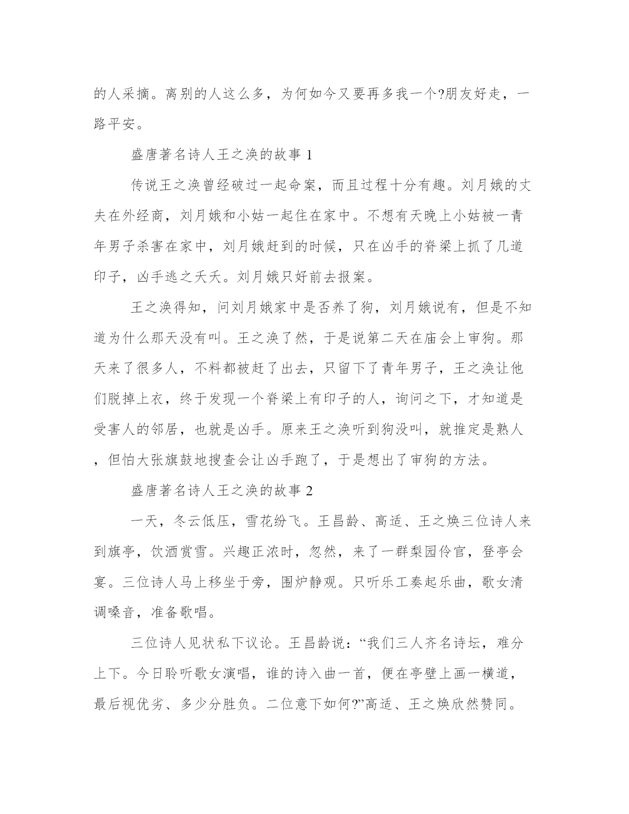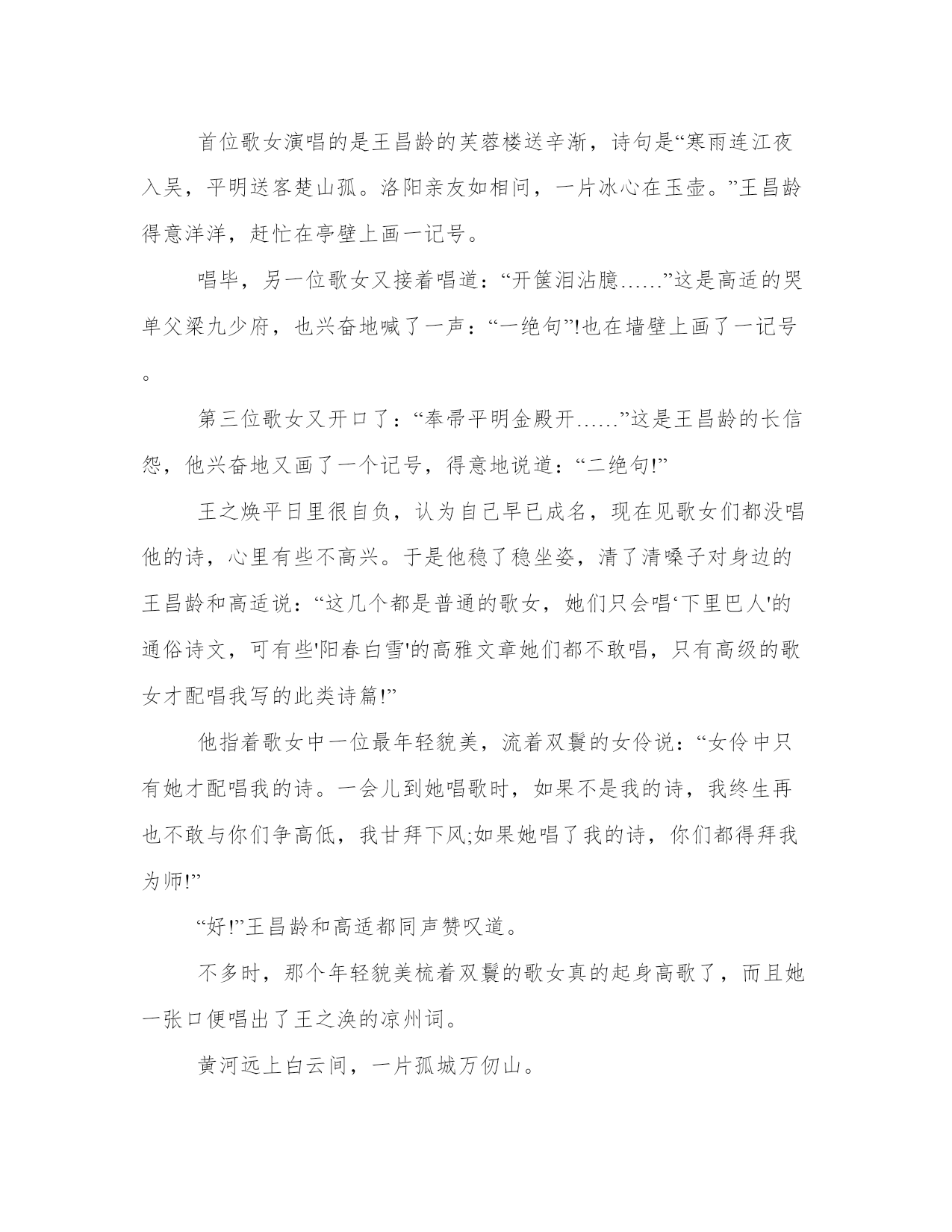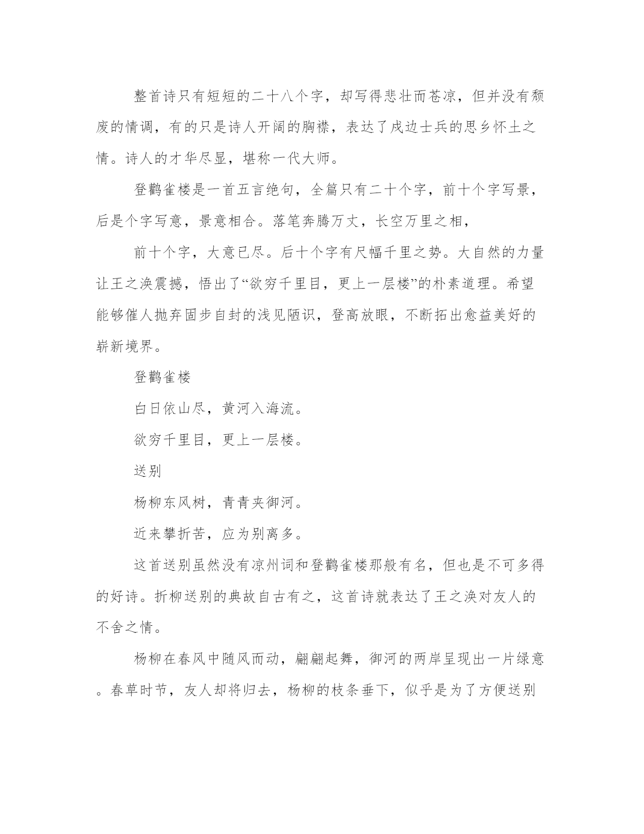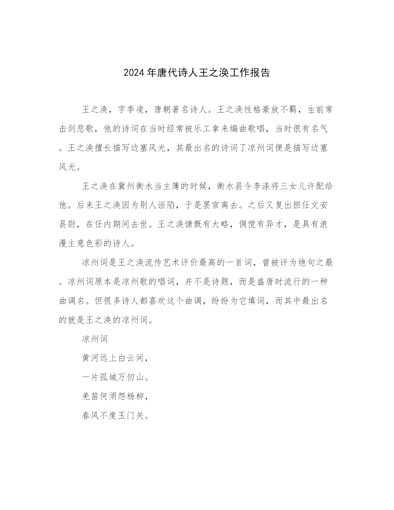2024年唐代诗人王之涣工作报告王之涣,字季凌,唐朝著名诗人。王之涣性格豪放不羁,生前常击剑悲歌,他的诗词在当时经常被乐工拿来编曲歌唱,当时很有名气。王之涣擅长描写边塞风光,其最出名的诗词了凉州词便是描写边塞风光。王之涣在冀州衡水当主簿的时候,衡水县令李涤将三女儿许配给他。后来王之涣因为别人诬陷,于是罢官离去。之后又复出担任文安县尉,在任内期间去世。王之涣慷慨有大略,倜傥有异才,是具有浪漫主意色彩的诗人。凉州词是王之涣流传艺术评价最高的一首词,曾被评为绝句之最。凉州词原本是凉州歌的唱词,并不是诗题,而是盛唐时流行的一种曲调名。但很多诗人都喜欢这个曲调,纷纷为它填词,而其中最出名的就是王之涣的凉州词。凉州词黄河远上白云间,一片孤城万仞山。羌笛何须怨杨柳,春风不度玉门关。整首诗只有短短的二十八个字,却写得悲壮而苍凉,但并没有颓废的情调,有的只是诗人开阔的胸襟,表达了戍边士兵的思乡怀土之情。诗人的才华尽显,堪称一代大师。登鹳雀楼是一首五言绝句,全篇只有二十个字,前十个字写景,后是个字写意,景意相合。落笔奔腾万丈,长空万里之相,前十个字,大意已尽。后十个字有尺幅千里之势。大自然的力量让王之涣震撼,悟出了“欲穷千里目,更上一层楼”的朴素道理。希望能够催人抛弃固步自封的浅见陋识,登高放眼,不断拓出愈益美好的崭新境界。登鹳雀楼白日依山尽,黄河入海流。欲穷千里目,更上一层楼。送别杨柳东风树,青青夹御河。近来攀折苦,应为别离多。这首送别虽然没有凉州词和登鹳雀楼那般有名,但也是不可多得的好诗。折柳送别的典故自古有之,这首诗就表达了王之涣对友人的不舍之情。杨柳在春风中随风而动,翩翩起舞,御河的两岸呈现出一片绿意。春草时节,友人却将归去,杨柳的枝条垂下,似乎是为了方便送别的人采摘。离别的人这么多,为何如今又要再多我一个?朋友好走,一路平安。盛唐著名诗人王之涣的故事1传说王之涣曾经破过一起命案,而且过程十分有趣。刘月娥的丈夫在外经商,刘月娥和小姑一起住在家中。不想有天晚上小姑被一青年男子杀害在家中,刘月娥赶到的时候,只在凶手的脊梁上抓了几道印子,凶手逃之夭夭。刘月娥只好前去报案。王之涣得知,问刘月娥家中是否养了狗,刘月娥说有,但是不知道为什么那天没有叫。王之涣了然,于是说第二天在庙会上审狗。那天来了很多人,不料都被赶了出去,只留下了青年男子,王之涣让他们脱掉上衣,终于发现一个脊梁上有印子的人,询问之下,才知道是受害人的邻居,也就是凶手。原来王之涣听到狗没叫,就推定是熟人,但怕大张旗鼓地搜查会让凶手跑了,于是想出了审狗的方法。盛唐著名诗人王之涣的故事2一天,冬云低压,雪花纷飞。王昌龄、高适、王之焕三位诗人来到旗亭,饮酒赏雪。兴趣正浓时,忽然,来了一群梨园伶官,登亭会宴。三位诗人马上移坐于旁,围炉静观。只听乐工奏起乐曲,歌女清调嗓音,准备歌唱。三位诗人见状私下议论。王昌龄说:“我们三人齐名诗坛,难分上下。今日聆听歌女演唱,谁的诗入曲一首,便在亭壁上画一横道,最后视优劣、多少分胜负。二位意下如何?”高适、王之焕欣然赞同。首位歌女演唱的是王昌龄的芙蓉楼送辛渐,诗句是“寒雨连江夜入吴,平明送客楚山孤。洛阳亲友如相问,一片冰心在玉壶。”王昌龄得意洋洋,赶忙在亭壁上画一记号。唱毕,另一位歌女又接着唱道:“开箧泪沾臆……”这是高适的哭单父梁九少府,也兴奋地喊了一声:“一绝句”!也在墙壁上画了一记号。第三位歌女又开口了:“奉帚平明金殿开……”这是王昌龄的长信怨,他兴奋地又画了一个记号,得意地说道:“二绝句!”王之焕平日里很自负,认为自己早已成名,现在见歌女们都没唱他的诗,心里有些不高兴。于是他稳了稳坐姿,清了清嗓子对身边的王昌龄和高适说:“这几个都是普通的歌女,她们只会唱‘下里巴人'的通俗诗文,可有些'阳春白雪'的高雅文章她们都不敢唱,只有高级的歌女才配唱我写的此类诗篇!”他指着歌女中一位最年轻貌美,流着双鬟的女伶说:“女伶中只有她才配唱我的诗。一会儿到她唱歌时,如果不是我的诗,我终生再也不敢与你们争高低,我甘拜下风;如果她唱了我的诗,你们都得拜我为师!”“好!”王昌龄和高适都同声赞叹道。不多时,那个年轻貌美梳着双鬟的歌女真的起身高歌了,而且她一张口便唱出了王之涣的凉州词。黄河远上白云间,一片孤城万仞山。羌笛何须怨杨柳,春风不度玉门关。歌声凄婉动听,牵人心弦。听罢,高适、王昌龄异口同声赞道:“仁兄之诗确实高我等一筹,好诗,实在是好诗!”