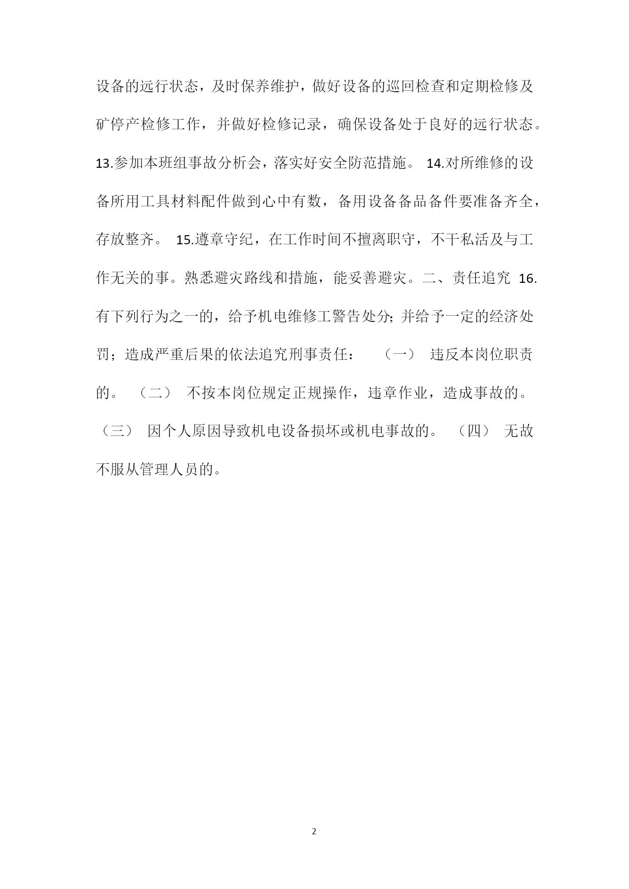 PAGEPAGE2机电维修工安全生产责任制机电维修工安全生产责任制机电维修工是掘进工作面机电设备的管理者,在本班班组长直接领导下负责本班组机电设备检查、维修和保养工作。熟悉煤矿三大规程的相关内容,《煤矿机电设备完好标准》、《煤矿机电设备检修质量标准》的相关规定,并经过培训、考试合格,取得操作资格证书后,方可持证上岗。一、岗位职责1.熟悉本岗位工作标准及操作顺序,并严格对照执行;2.严格按规程、措施及操作标准和程序施工,杜绝违章,确保安全;3.对责任范围内的安全隐患及时排查,积极汇报处理,并做好记录;4.积极认真学习业务技术、安全知识,提高业务水平。5.管线悬挂:电缆一条线:电缆平直成线,高度一致,电缆吊挂钩统一,吊挂钩间距均匀,符合企业标准。6.设备卫生:设备上台上架,摆放整齐,安全间隙符合规定,设备卫生整洁,无积尘。开关站周围20m范围内卫生整洁。7.设备检修:及时检修,不带电检修,螺丝禁锢,杜绝失爆,设备、开关各种保护、闭锁完好。8.机电配件定置化:分类摆放,上台上架,挂牌管理。备件摆放走向一条线,整齐统一,牌板悬挂一条线,规格统一,机电检修记录齐全,及时填写,及时进行机电设备隐患排查,并积极及时处理,机电牌板悬挂整齐,牌板规格统一。9.熟练掌握本班组所管辖范围内设备的结构性能原理及技术特征,及时掌握设备的远行状态,及时保养维护,做好设备的巡回检查和定期检修及矿停产检修工作,并做好检修记录,确保设备处于良好的远行状态。13.参加本班组事故分析会,落实好安全防范措施。14.对所维修的设备所用工具材料配件做到心中有数,备用设备备品备件要准备齐全,存放整齐。15.遵章守纪,在工作时间不擅离职守,不干私活及与工作无关的事。熟悉避灾路线和措施,能妥善避灾。二、责任追究16.有下列行为之一的,给予机电维修工警告处分;并给予一定的经济处罚;造成严重后果的依法追究刑事责任:(一)违反本岗位职责的。(二)不按本岗位规定正规操作,违章作业,造成事故的。(三)因个人原因导致机电设备损坏或机电事故的。(四)无故不服从管理人员的。