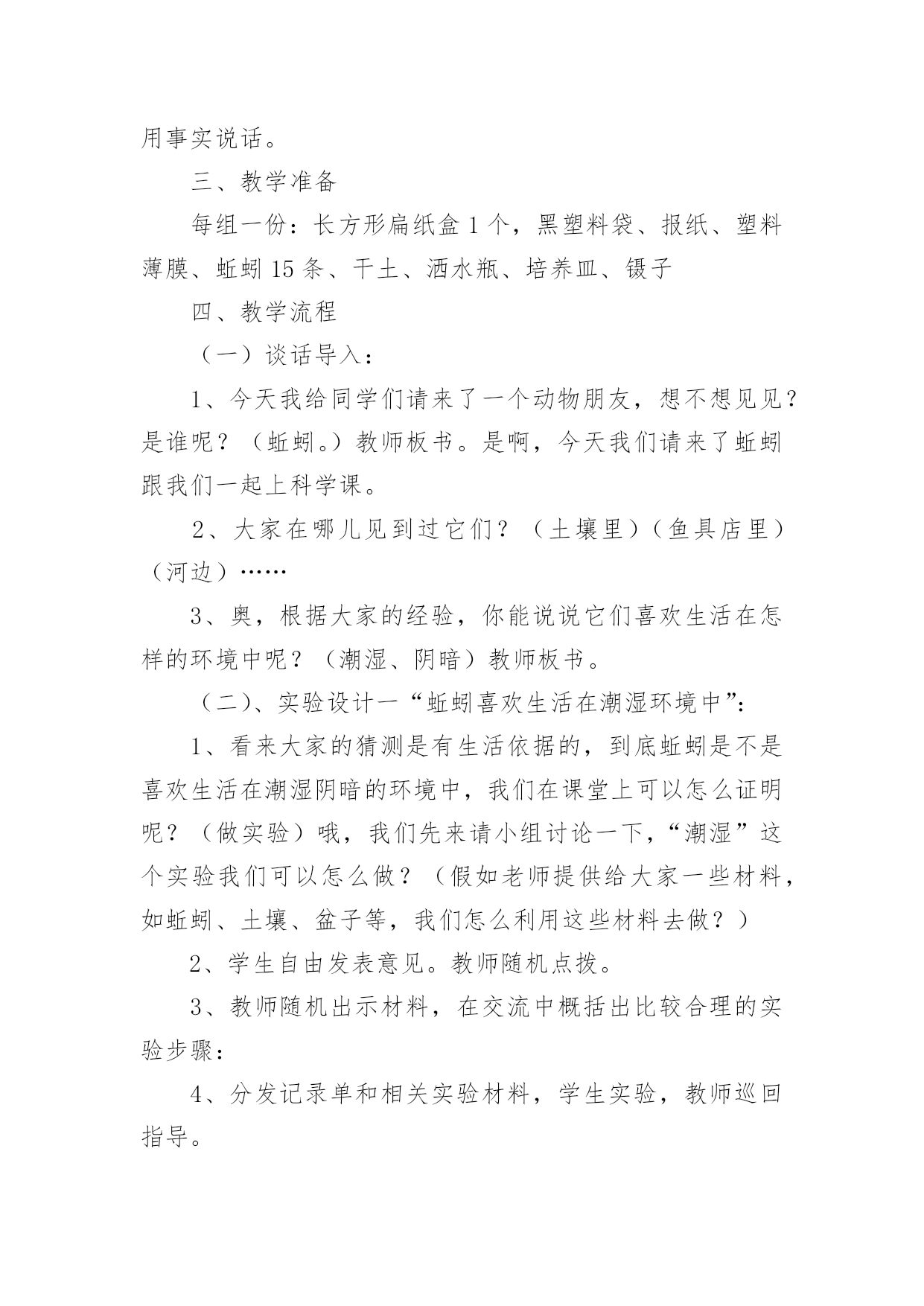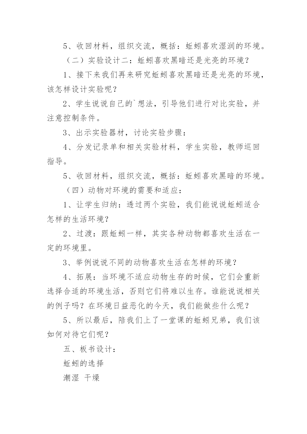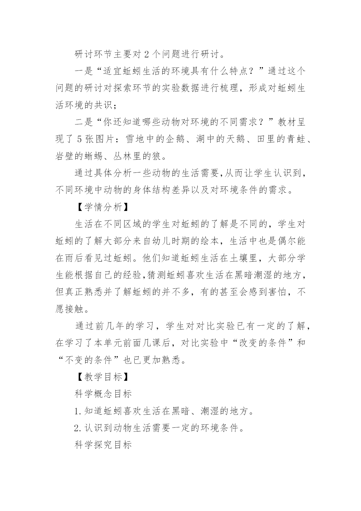 《蚯蚓的选择》教学设计作为一名老师,通常需要用到教学设计来辅助教学,教学设计是教育技术的组成部分,它的功能在于运用系统方法设计教学过程,使之成为一种具有操作性的程序。教学设计应该怎么写才好呢?以下是小编收集整理的《蚯蚓的选择》教学设计,欢迎阅读与收藏。《蚯蚓的选择》教学设计1【教材简析】通过前面3节课的学习,学生已经知道植物的生存需要一定的环境。本节课中,学生将通过对比实验,了解蚯蚓生活需要的环境条件,最后从蚯蚓联系到其他的动物。聚焦环节教材通过简短的对话引导学生从关注植物的生存需要一定的环境,转移到动物也是这样吗?蚯蚓适宜的生活环境是怎样的?探索环节先是引导学生根据经验对蚯蚓喜欢的生活环境做出有依据的推测,接着重点展开“蚯蚓对光照的选择”、“蚯蚓对干燥或潮湿环境的选择”两个探索活动。在前几课的学习中,学生需要先制定详细实验计划后展开实践活动。在这一课中教材直接呈现具体实验操作方法,再让学生分析其中隐含的“改变什么条件”、“哪些条件保持不变”,从而帮助学生从逆向的角度进一步深化对对比实验变量控制的认识,特别是在实践操作中的具体落实。研讨环节主要对2个问题进行研讨。一是“适宜蚯蚓生活的环境具有什么特点?”通过这个问题的研讨对探索环节的实验数据进行梳理,形成对蚯蚓生活环境的共识;二是“你还知道哪些动物对环境的不同需求?”教材呈现了5张图片:雪地中的企鹅、湖中的天鹅、田里的青蛙、岩壁的蜥蜴、丛林里的狼。通过具体分析一些动物的生活需要,从而让学生认识到,不同环境中动物的身体结构差异以及对环境条件的需求。【学情分析】生活在不同区域的学生对蚯蚓的了解是不同的,学生对蚯蚓的了解大部分来自幼儿时期的绘本,生活中也是偶尔能在雨后看见过蚯蚓。他们知道蚯蚓生活在土壤里,大部分学生能根据自己的经验,猜测蚯蚓喜欢生活在黑暗潮湿的地方,但真正熟悉并了解蚯蚓的并不多,有的甚至会感到害怕,不愿接触。通过前几年的学习,学生对对比实验已有一定的了解,在学习了本单元前面几课后,对比实验中“改变的条件”和“不变的条件”也已更加熟悉。【教学目标】科学概念目标1.知道蚯蚓喜欢生活在黑暗、潮湿的地方。2.认识到动物生活需要一定的环境条件。科学探究目标通过控制变量开展对比实验,探究蚯蚓对光照、潮湿等条件的需求。科学态度目标严谨实验,尊重实验证据,能以事实为依据作出分析判断。科学、技术、社会与环境目标认识到生物与环境是相互联系的,树立保护好环境即保护我们自己的意识。【教学重难点】重点:对比实验探究蚯蚓对光照、潮湿等条件的需求。难点:准确控制变量、收集数据,科学分析判断。【教学准备】演示准备:多媒体课件、实验记录汇总表小组准备:实验一:1个底部全铺湿纸巾(布)的长条盒子(无盖、内侧涂黑),用于遮光的'科学书1本,镊子1把,蚯蚓10条、实验记录单。实验二:1个长条盒子,2份干土,1份水,镊子1把,蚯蚓10条、实验记录单。【教学过程】一、聚焦环节(预设1分钟)1.前几课的学习,我们知道植物的生存需要一定的环境。那么,动物是不是也是这样的呢?课件出示“蚯蚓图”,比如蚯蚓,它适宜的生活环境是什么样的?2.今天我们就来学习第四课《蚯蚓的选择》(板书揭题)二、探索环节(预设29分钟)1.问题及推测(预设2分钟)在大自然中,蚯蚓会选择怎样的环境来生活呢?你是怎么知道的?(预设:黑暗、潮湿、肥沃等)2.确定探究主题(预设2分钟)根据同学们的推测,我们有必要通过实验来进行求证。我们这节课的教材中选择了两个重点因素开展了实验探究,请大家翻看教材P8、P9。分别是哪两个因素?(蚯蚓对光的选择、蚯蚓对干燥或潮湿环境的选择)3.变量控制的讨论(预设10分钟)(1)我们先来看“蚯蚓对光的选择”这个实验。请小组进行讨论:这个实验中改变的条件是什么?哪些条件保持不变?学生分组讨论,完成实验设计单,师分组巡视指导。请小组汇报,其他小组看看有没有什么补充或意见?小结形成共识。(2)再来看“蚯蚓对干燥或潮湿环境的选择”这个实验。请小组进行讨论:这个实验中改变的条件是什么?哪些条件保持不变?学生分组讨论,完成实验设计单,师分组巡视指导。请小组汇报,其他小组看看有没有什么补充或意见?小结形成共识。4.实验探究(预设15分钟)(1)出示温馨提示:①两个实验都要把10条蚯蚓放在盒子的中间。②过3分钟以后,对蚯蚓数量进行统计,并将结果记录在记录表中。③两个实验都要重复做3次。(2)分组领取实验材料,开展实验。(3)实验结束,整理实验器材和记录表数据。三、研讨环节(预设10分钟)1.问题一:“适宜蚯蚓生活的环境具有什么特点?”(预设6分钟)(1)请大家根据刚才实验中所获得的数据,来阐述你们的发现。(2)请小组上台展示实验数据,进行汇报,并接受其他小组的提问质疑。可请多个小组进行汇报,直至形成共识,师课件呈现共识。(预设:蚯