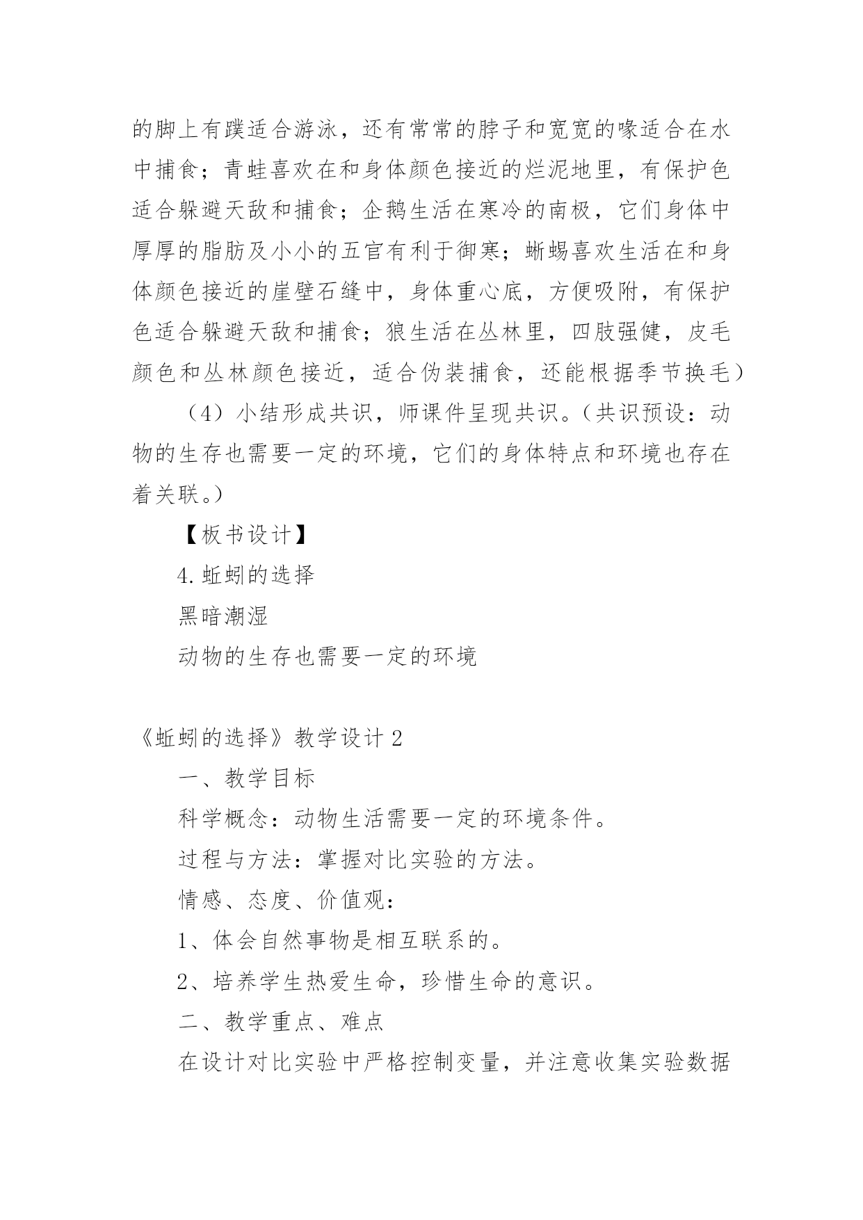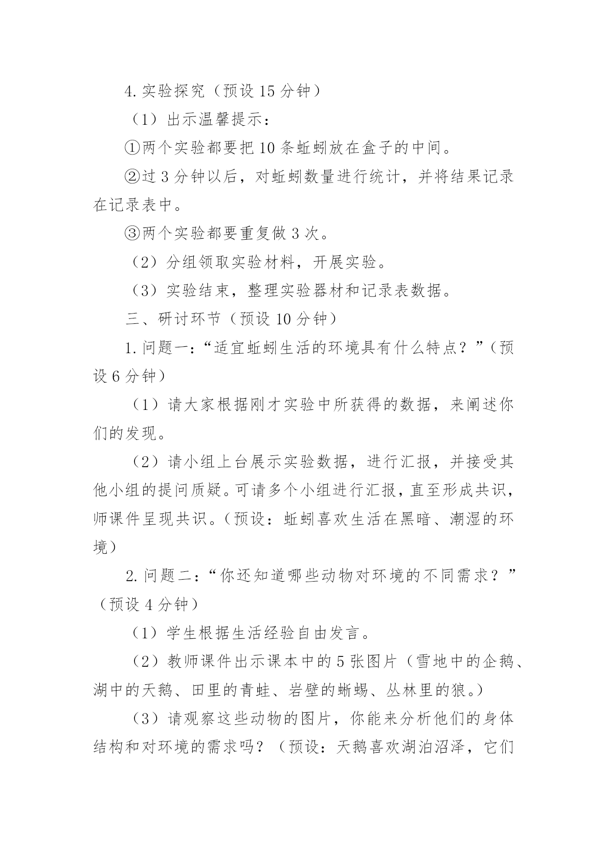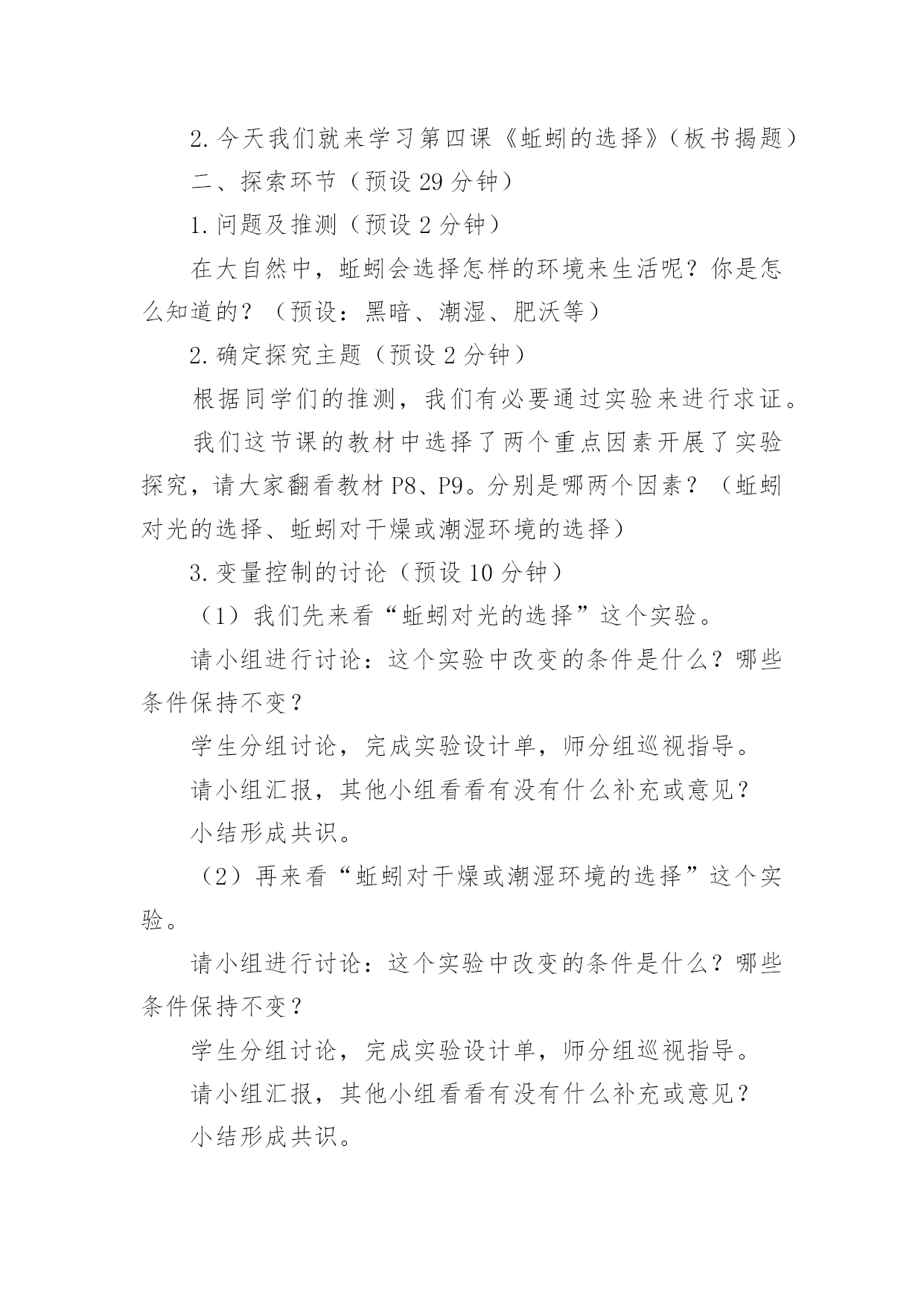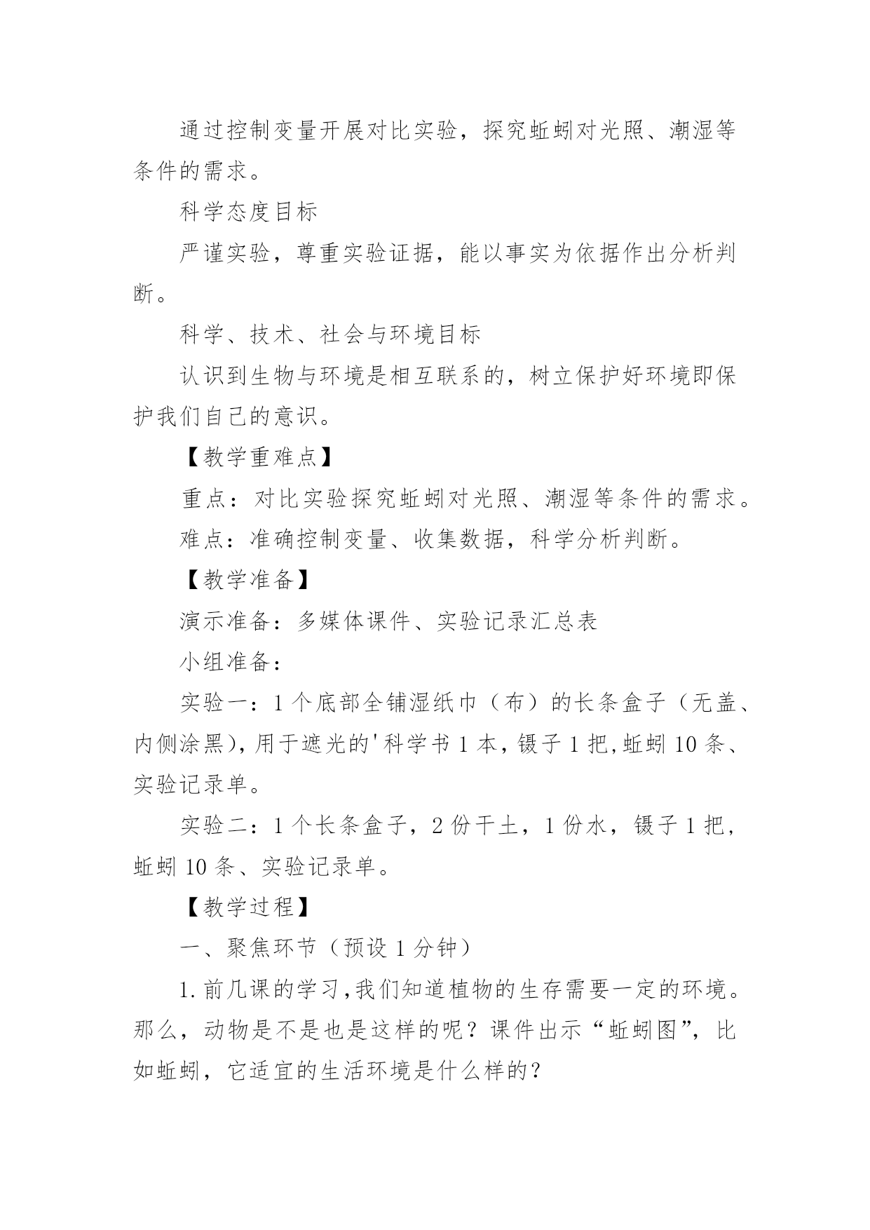 《蚯蚓的选择》教学设计作为一名老师,通常需要用到教学设计来辅助教学,教学设计是教育技术的组成部分,它的功能在于运用系统方法设计教学过程,使之成为一种具有操作性的程序。教学设计应该怎么写才好呢?以下是小编收集整理的《蚯蚓的选择》教学设计,欢迎阅读与收藏。《蚯蚓的选择》教学设计1【教材简析】通过前面3节课的学习,学生已经知道植物的生存需要一定的环境。本节课中,学生将通过对比实验,了解蚯蚓生活需要的环境条件,最后从蚯蚓联系到其他的动物。聚焦环节教材通过简短的对话引导学生从关注植物的生存需要一定的环境,转移到动物也是这样吗?蚯蚓适宜的生活环境是怎样的?探索环节先是引导学生根据经验对蚯蚓喜欢的生活环境做出有依据的推测,接着重点展开“蚯蚓对光照的选择”、“蚯蚓对干燥或潮湿环境的选择”两个探索活动。在前几课的学习中,学生需要先制定详细实验计划后展开实践活动。在这一课中教材直接呈现具体实验操作方法,再让学生分析其中隐含的“改变什么条件”、“哪些条件保持不变”,从而帮助学生从逆向的角度进一步深化对对比实验变量控制的认识,特别是在实践操作中的具体落实。研讨环节主要对2个问题进行研讨。一是“适宜蚯蚓生活的环境具有什么特点?”通过这个问题的研讨对探索环节的实验数据进行梳理,形成对蚯蚓生活环境的共识;二是“你还知道哪些动物对环境的不同需求?”教材呈现了5张图片:雪地中的企鹅、湖中的天鹅、田里的青蛙、岩壁的蜥蜴、丛林里的狼。通过具体分析一些动物的生活需要,从而让学生认识到,不同环境中动物的身体结构差异以及对环境条件的需求。【学情分析】生活在不同区域的学生对蚯蚓的了解是不同的,学生对蚯蚓的了解大部分来自幼儿时期的绘本,生活中也是偶尔能在雨后看见过蚯蚓。他们知道蚯蚓生活在土壤里,大部分学生能根据自己的经验,猜测蚯蚓喜欢生活在黑暗潮湿的地方,但真正熟悉并了解蚯蚓的并不多,有的甚至会感到害怕,不愿接触。通过前几年的学习,学生对对比实验已有一定的了解,在学习了本单元前面几课后,对比实验中“改变的条件”和“不变的条件”也已更加熟悉。【教学目标】科学概念目标1.知道蚯蚓喜欢生活在黑暗、潮湿的地方。2.认识到动物生活需要一定的环境条件。科学探究目标通过控制变量开展对比实验,探究蚯蚓对光照、潮湿等条件的需求。科学态度目标严谨实验,尊重实验证据,能以事实为依据作出分析判断。科学、技术、社会与环境目标认识到生物与环境是相互联系的,树立保护好环境即保护我们自己的意识。【教学重难点】重点:对比实验探究蚯蚓对光照、潮湿等条件的需求。难点:准确控制变量、收集数据,科学分析判断。【教学准备】演示准备:多媒体课件、实验记录汇总表小组准备:实验一:1个底部全铺湿纸巾(布)的长条盒子(无盖、内侧涂黑),用于遮光的'科学书1本,镊子1把,蚯蚓10条、实验记录单。实验二:1个长条盒子,2份干土,1份水,镊子1把,蚯蚓10条、实验记录单。【教学过程】一、聚焦环节(预设1分钟)1.前几课的学习,我们知道植物的生存需要一定的环境。那么,动物是不是也是这样的呢?课件出示“蚯蚓图”,比如蚯蚓,它适宜的生活环境是什么样的?2.今天我们就来学习第四课《蚯蚓的选择》(板书揭题)二、探索环节(预设29分钟)1.问题及推测(预设2分钟)在大自然中,蚯蚓会选择怎样的环境来生活呢?你是怎么知道的?(预设:黑暗、潮湿、肥沃等)2.确定探究主题(预设2分钟)根据同学们的推测,我们有必要通过实验来进行求证。我们这节课的教材中选择了两个重点因素开展了实验探究,请大家翻看教材P8、P9。分别是哪两个因素?(蚯蚓对光的选择、蚯蚓对干燥或潮湿环境的选择)3.变量控制的讨论(预设10分钟)(1)我们先来看“蚯蚓对光的选择”这个实验。请小组进行讨论:这个实验中改变的条件是什么?哪些条件保持不变?学生分组讨论,完成实验设计单,师分组巡视指导。请小组汇报,其他小组看看有没有什么补充或意见?小结形成共识。(2)再来看“蚯蚓对干燥或潮湿环境的选择”这个实验。请小组进行讨论:这个实验中改变的条件是什么?哪些条件保持不变?学生分组讨论,完成实验设计单,师分组巡视指导。请小组汇报,其他小组看看有没有什么补充或意见?小结形成共识。4.实验探究(预设15分钟)(1)出示温馨提示:①两个实验都要把10条蚯蚓放在盒子的中间。②过3分钟以后,对蚯蚓数量进行统计,并将结果记录在记录表中。③两个实验都要重复做3次。(2)分组领取实验材料,开展实验。(3)实验结束,整理实验器材和记录表数据。三、研讨环节(预设10分钟)1.问题一:“适宜蚯蚓生活的环境具有什么特点?”(预设6分钟)(1)请大家根据刚才实验中所获得的数据,来阐述你们的发现。(2)请小组上台展示实验数据,进行汇报,并接受其他小组的提问质疑。可请多个小组进行汇报,直至形成共识,师课件呈现共识。(预设:蚯