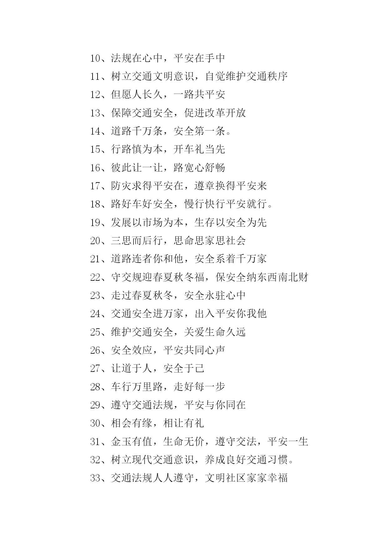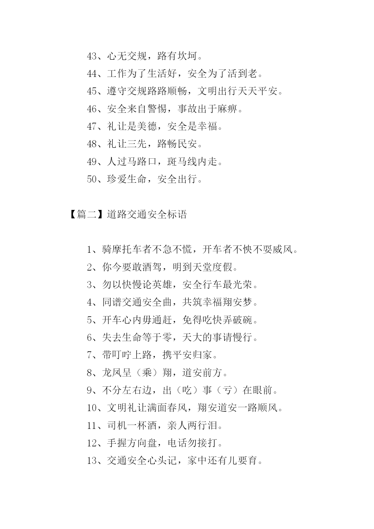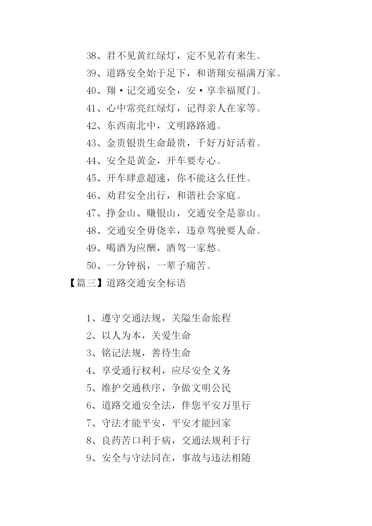 道路交通安全标语三篇【篇一】道路交通安全标语1、一秒钟车祸,一辈子痛苦。2、小手拉大手,共走平安路。3、交通安全时时不忘,幸福生活天天拥有。4、实线、虚线、斑马线,都是生命安全线。5、脚下留神,心中留意,慎行每步,安全一生。6、安全乘车、安全骑车、安全走路。7、绷紧安全琴弦,奏响生命旋律。8、多看一眼,安全保险;多防一步,少出事故。9、生命只有一次,安全伴君一生。10、安全来自长期警惕,事故源于瞬间麻痹。11、学校门前莫开快,司机献出一点爱。12、跨入校园,好好学习;走出校门,好好走路。13、祸起瞬间,防患未然。14、红灯停、绿灯行,交通法规记在心。15、遵守交通法规,关爱生命旅程。16、安全与生命一线索,幸福和安全两相连。17、文明交通,从小做起,从我做起。18、关爱生命,安全出行,从我做起,从小做起。19、乱窜马路,游戏人生。20、交通安全教育要从娃娃抓起。21、道路通行见形象,红绿灯前看修养。22、道路因文明行驶而通畅,生活因出入平安而幸福。23、千里之行,慎于足下。24、人生美好,步步小心。25、安全在你脚下,生命在你手中。26、安全与守法同在,事故与违法相随。27、增强交通安全意识,提高自我保护能力。28、横穿马路:一看、二等、三通过。29、一停二看三通过,麻痹大意是灾祸。30、逞一时之勇,得一世之悔。31、宁绕百步远,不抢一步险。32、严是爱、松是害,出了事故坑后代。33、一丝不苟保安全,半分疏忽生祸端。34、心头常亮红绿灯,安全行驶伴人生。35、小小黄帽每天戴,出行安全总常在。36、红灯短暂,生命无限。37、交通法规须记牢,珍爱生命最重要。38、孩童路边走,成人要牵手。39、一人安危系全家,全家幸福系一人。40、上学放学过马路,交通法规要记住;先戴安全小黄帽,再把大拇指儿翘。41、路无规不畅,国无法不宁。42、守交通规则,树文明新风。43、心无交规,路有坎坷。44、工作为了生活好,安全为了活到老。45、遵守交规路路顺畅,文明出行天天平安。46、安全来自警惕,事故出于麻痹。47、礼让是美德,安全是幸福。48、礼让三先,路畅民安。49、人过马路口,斑马线内走。50、珍爱生命,安全出行。【篇二】道路交通安全标语1、骑摩托车者不急不慌,开车者不怏不耍威风。2、你今要敢酒驾,明到天堂度假。3、勿以快慢论英雄,安全行车最光荣。4、同谱交通安全曲,共筑幸福翔安梦。5、开车心内毋通赶,免得吃快弄破碗。6、失去生命等于零,天大的事请慢行。7、带叮咛上路,携平安归家。8、龙凤呈(乘)翔,道安前方。9、不分左右边,出(吃)事(亏)在眼前。10、文明礼让满面春风,翔安道安一路顺风。11、司机一杯酒,亲人两行泪。12、手握方向盘,电话勿接打。13、交通安全心头记,家中还有儿要育。14、文明同心,道安同行,翔安同梦。15、礼让自然路宽,向您道声平安。16、红灯面前等一等,幸福生活长又长。17、文明驾车是朵花,飙车违驾必定垮。18、从文明开“驶”,到安全为止。19、开车不斗气,安全要牢记。20、忽视交规吃苦头,盲视安全栽跟头。21、但愿人长久,一路共平安。22、莫以飙车论英雄,文明驾驶最光荣。23、急如风,快如电,家中老小全变样。24、开车喝了酒,生命不长久。25、开车不是过家家,安全归来乐开花。26、守交规之心最贵,保平安之举最美!27、酒驾害人害己,苦了老婆,害了子女。28、多停,多让,路畅,心欢。29、只有把握路的方向,才能到达爱的港湾。30、你若想回家,就不能酒驾。31、遵守交规安全在,违章行车事故来。32、当文明翔安的“驶”者,做交通安全的“达”人。33、交通安全无所谓,一日三餐有人喂。34、争当文明“驶”者,共建和谐翔安。35、酒后不驾是口号,贵在行动最需要。36、路好车好安全,慢行快行平安出行。37、君让一秒值千金,愿耽三分笑和亲。38、君不见黄红绿灯,定不见若有来生。39、道路安全始于足下,和谐翔安福满万家。40、翔·记交通安全,安·享幸福厦门。41、心中常亮红绿灯,记得亲人在家等。42、东西南北中,文明路路通。43、金贵银贵生命最贵,千好万好活着。44、安全是黄金,开车要专心。45、开车肆意超速,你不能这么任性。46、劝君安全出行,和谐社会家庭。47、挣金山、赚银山,交通安全是靠山。48、交通安全毋侥幸,违章驾驶要
