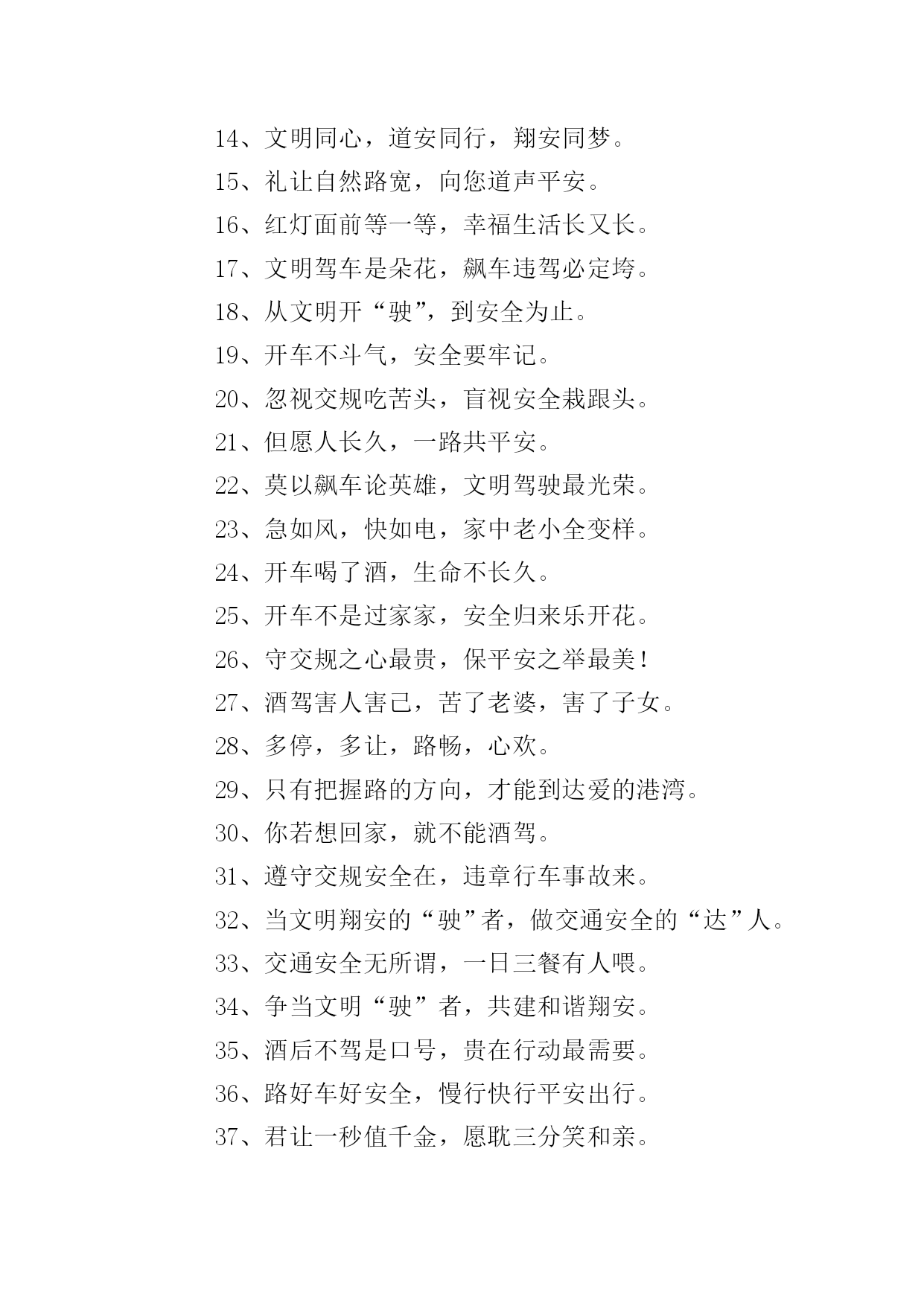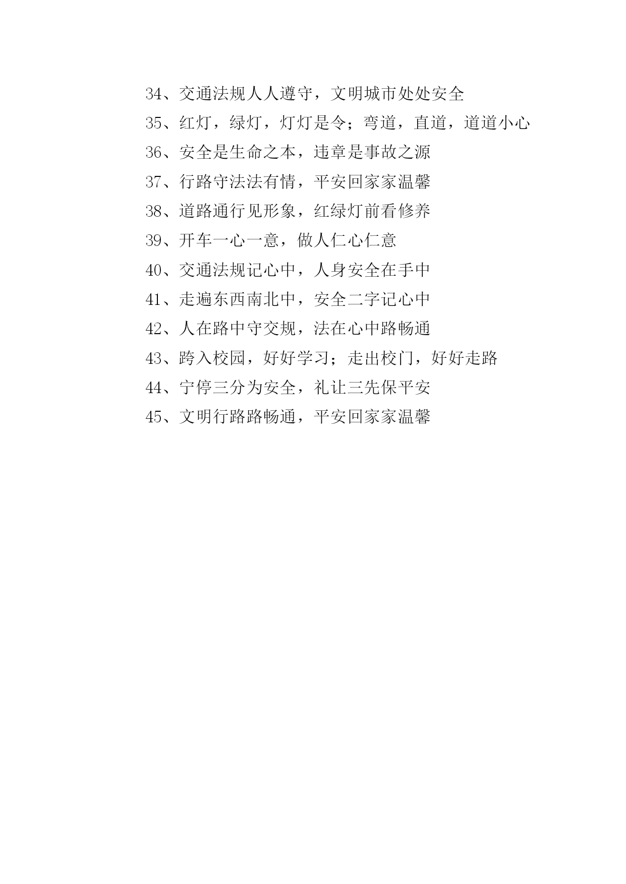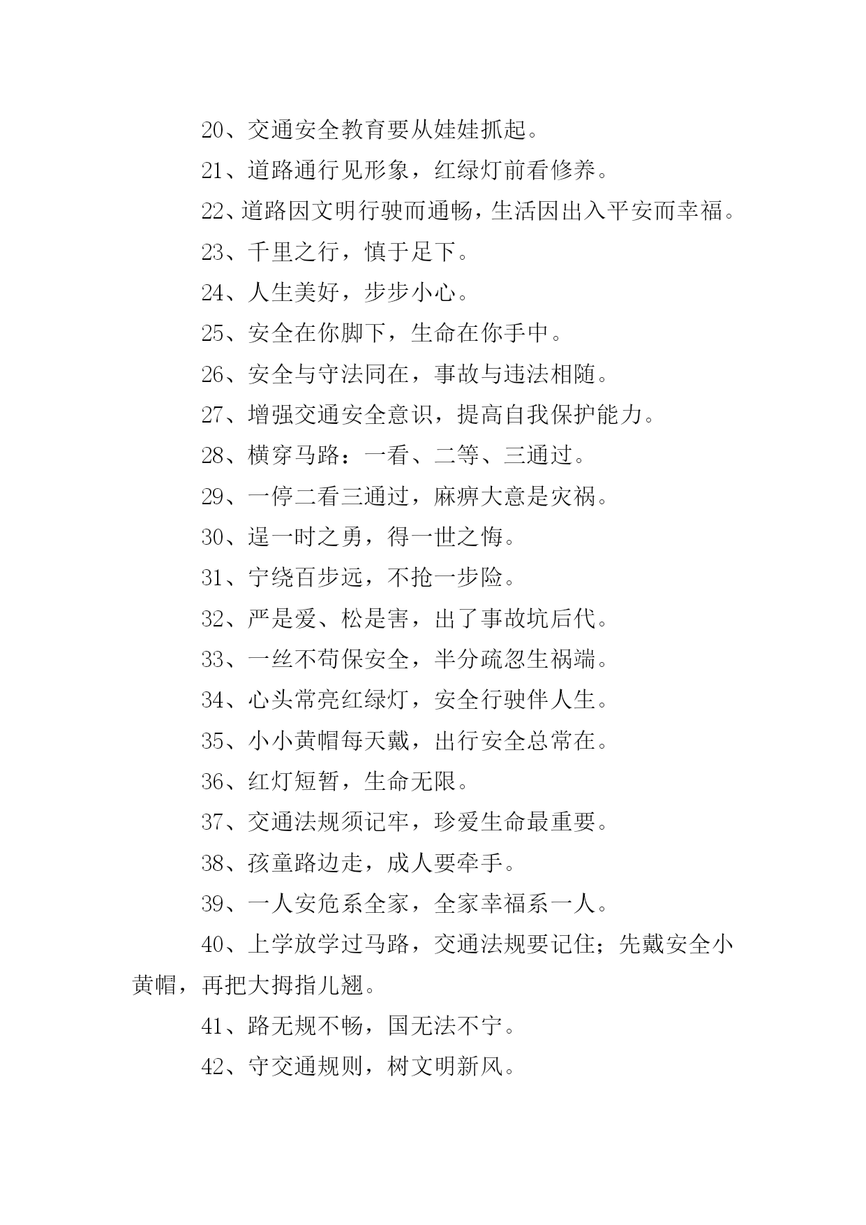 道路交通安全标语三篇【篇一】道路交通安全标语1、一秒钟车祸,一辈子痛苦。2、小手拉大手,共走平安路。3、交通安全时时不忘,幸福生活天天拥有。4、实线、虚线、斑马线,都是生命安全线。5、脚下留神,心中留意,慎行每步,安全一生。6、安全乘车、安全骑车、安全走路。7、绷紧安全琴弦,奏响生命旋律。8、多看一眼,安全保险;多防一步,少出事故。9、生命只有一次,安全伴君一生。10、安全来自长期警惕,事故源于瞬间麻痹。11、学校门前莫开快,司机献出一点爱。12、跨入校园,好好学习;走出校门,好好走路。13、祸起瞬间,防患未然。14、红灯停、绿灯行,交通法规记在心。15、遵守交通法规,关爱生命旅程。16、安全与生命一线索,幸福和安全两相连。17、文明交通,从小做起,从我做起。18、关爱生命,安全出行,从我做起,从小做起。19、乱窜马路,游戏人生。20、交通安全教育要从娃娃抓起。21、道路通行见形象,红绿灯前看修养。22、道路因文明行驶而通畅,生活因出入平安而幸福。23、千里之行,慎于足下。24、人生美好,步步小心。25、安全在你脚下,生命在你手中。26、安全与守法同在,事故与违法相随。27、增强交通安全意识,提高自我保护能力。28、横穿马路:一看、二等、三通过。29、一停二看三通过,麻痹大意是灾祸。30、逞一时之勇,得一世之悔。31、宁绕百步远,不抢一步险。32、严是爱、松是害,出了事故坑后代。33、一丝不苟保安全,半分疏忽生祸端。34、心头常亮红绿灯,安全行驶伴人生。35、小小黄帽每天戴,出行安全总常在。36、红灯短暂,生命无限。37、交通法规须记牢,珍爱生命最重要。38、孩童路边走,成人要牵手。39、一人安危系全家,全家幸福系一人。40、上学放学过马路,交通法规要记住;先戴安全小黄帽,再把大拇指儿翘。41、路无规不畅,国无法不宁。42、守交通规则,树文明新风。43、心无交规,路有坎坷。44、工作为了生活好,安全为了活到老。45、遵守交规路路顺畅,文明出行天天平安。46、安全来自警惕,事故出于麻痹。47、礼让是美德,安全是幸福。48、礼让三先,路畅民安。49、人过马路口,斑马线内走。50、珍爱生命,安全出行。【篇二】道路交通安全标语1、骑摩托车者不急不慌,开车者不怏不耍威风。2、你今要敢酒驾,明到天堂度假。3、勿以快慢论英雄,安全行车最光荣。4、同谱交通安全曲,共筑幸福翔安梦。5、开车心内毋通赶,免得吃快弄破碗。6、失去生命等于零,天大的事请慢行。7、带叮咛上路,携平安归家。8、龙凤呈(乘)翔,道安前方。9、不分左右边,出(吃)事(亏)在眼前。10、文明礼让满面春风,翔安道安一路顺风。11、司机一杯酒,亲人两行泪。12、手握方向盘,电话勿接打。13、交通安全心头记,家中还有儿要育。14、文明同心,道安同行,翔安同梦。15、礼让自然路宽,向您道声平安。16、红灯面前等一等,幸福生活长又长。17、文明驾车是朵花,飙车违驾必定垮。18、从文明开“驶”,到安全为止。19、开车不斗气,安全要牢记。20、忽视交规吃苦头,盲视安全栽跟头。21、但愿人长久,一路共平安。22、莫以飙车论英雄,文明驾驶最光荣。23、急如风,快如电,家中老小全变样。24、开车喝了酒,生命不长久。25、开车不是过家家,安全归来乐开花。26、守交规之心最贵,保平安之举最美!27、酒驾害人害己,苦了老婆,害了子女。28、多停,多让,路畅,心欢。29、只有把握路的方向,才能到达爱的港湾。30、你若想回家,就不能酒驾。31、遵守交规安全在,违章行车事故来。32、当文明翔安的“驶”者,做交通安全的“达”人。33、交通安全无所谓,一日三餐有人喂。34、争当文明“驶”者,共建和谐翔安。35、酒后不驾是口号,贵在行动最需要。36、路好车好安全,慢行快行平安出行。37、君让一秒值千金,愿耽三分笑和亲。38、君不见黄红绿灯,定不见若有来生。39、道路安全始于足下,和谐翔安福满万家。40、翔·记交通安全,安·享幸福厦门。41、心中常亮红绿灯,记得亲人在家等。42、东西南北中,文明路路通。43、金贵银贵生命最贵,千好万好活着。44、安全是黄金,开车要专心。45、开车肆意超速,你不能这么任性。46、劝君安全出行,和谐社会家庭。47、挣金山、赚银山,交通安全是靠山。48、交通安全毋侥幸,违章驾驶要