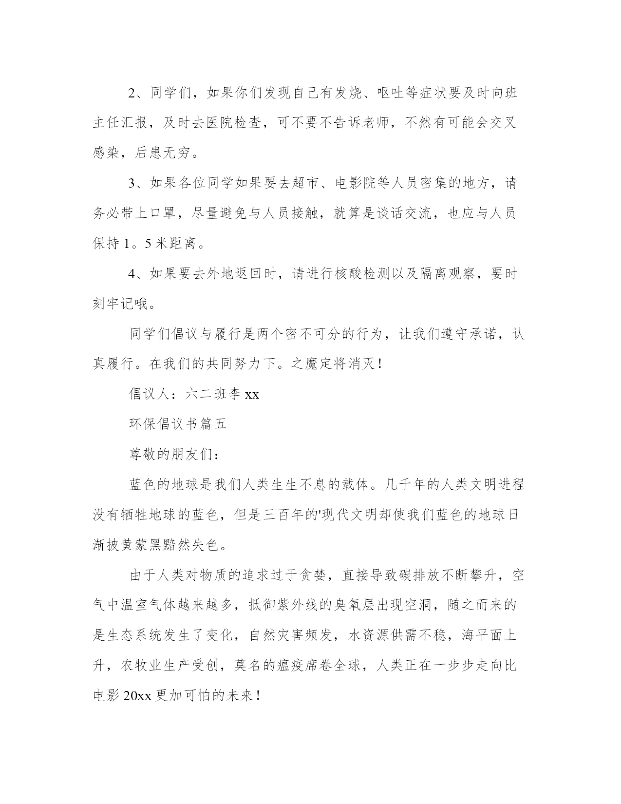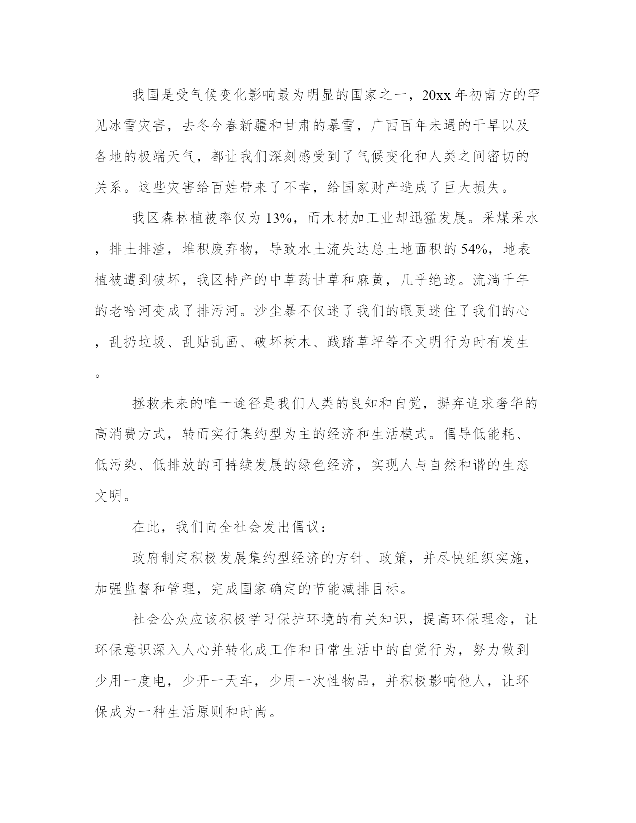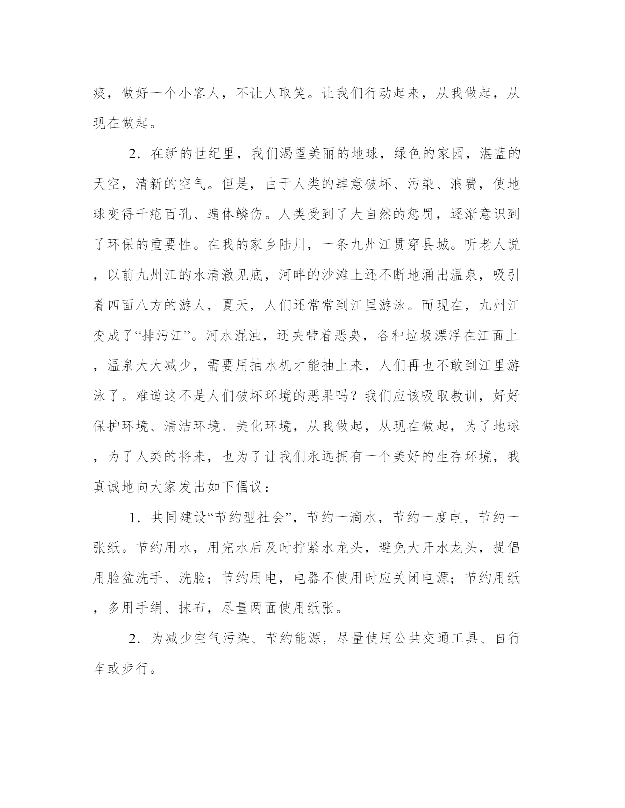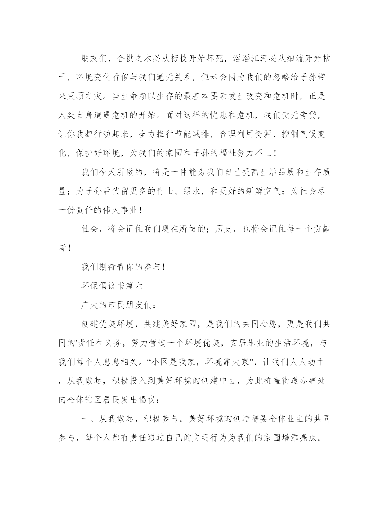 环保倡议书(精选9篇)在日常学习、工作或生活中,大家总少不了接触作文或者范文吧,通过文章可以把我们那些零零散散的思想,聚集在一块。相信许多人会觉得范文很难写?接下来小编就给大家介绍一下优秀的范文该怎么写,我们一起来看一看吧。环保倡议书篇一1.相信每个人都想在良好的生活环境里度过岁月吧!要想给自己和他人营造一个良好的生活环境,就要注意身边的生活。由于世界环保卫生过差,这些都表现在生活垃圾的处理上,它会给人类带来环境污染的影响,所以,我真诚的大家提出以下几点倡议:1.不要乱扔垃圾,不随地吐痰。2.节约用纸:打印过的纸用来做草稿纸;用打印过的纸的背面再打印。3.为环保作出贡献:多种花草树木。4.爱护好自己身边的环境。5.用完水或电就及时关紧。我知道,这几点小小的倡议还不足以代表我的爱国之心,所以我决定再为祖国写更多的倡议书,希望你们能接受我提出的意见,我也希望能有更多人爱国。从现在起,从我做起,不乱丢垃圾,不随地吐痰,做好小主人的榜样。从现在起,从我做起,不管去到那,不乱丢垃圾,都不随地吐痰,做好一个小客人,不让人取笑。让我们行动起来,从我做起,从现在做起。2.在新的世纪里,我们渴望美丽的地球,绿色的家园,湛蓝的天空,清新的空气。但是,由于人类的肆意破坏、污染、浪费,使地球变得千疮百孔、遍体鳞伤。人类受到了大自然的惩罚,逐渐意识到了环保的重要性。在我的家乡陆川,一条九州江贯穿县城。听老人说,以前九州江的水清澈见底,河畔的沙滩上还不断地涌出温泉,吸引着四面八方的游人,夏天,人们还常常到江里游泳。而现在,九州江变成了“排污江”。河水混浊,还夹带着恶臭,各种垃圾漂浮在江面上,温泉大大减少,需要用抽水机才能抽上来,人们再也不敢到江里游泳了。难道这不是人们破坏环境的恶果吗?我们应该吸取教训,好好保护环境、清洁环境、美化环境,从我做起,从现在做起,为了地球,为了人类的将来,也为了让我们永远拥有一个美好的生存环境,我真诚地向大家发出如下倡议:1.共同建设“节约型社会”,节约一滴水,节约一度电,节约一张纸。节约用水,用完水后及时拧紧水龙头,避免大开水龙头,提倡用脸盆洗手、洗脸;节约用电,电器不使用时应关闭电源;节约用纸,多用手绢、抹布,尽量两面使用纸张。2.为减少空气污染、节约能源,尽量使用公共交通工具、自行车或步行。3.为保护森林、矿产等自然资源,尽量购买使用再生材料制成的、可多次长期使用的商品;减少使用一次性纸杯、一次性木筷和餐盒等。4.减少使用塑料袋,它是白色污染的元凶。5.发展经济不能以破坏环境为代价,要把发展经济与保护环境放在同等的位置。6.加强环保的宣传教育,从小培养环保意识,积极投入到保护环境的活动当中。7.自觉保护生态环境,积极参与绿化美化活动。地球只有一个,她的生命是脆弱的,不能因为我们为着眼前的发展和获得微小利益,以肆虐的行为,无“度”的获取,使原本已经脆弱的躯体更加脆弱!记住,保护地球,就是保护我们自己!环保倡议书篇二尊敬的主席:您好!我是观海卫镇中心小学的`一名小学生。随着21世纪科技的进步和工业的发展,工厂里生产排出的污水和废弃物品也大大增多了。环境污染越来越严重,环境保护迫在眉睫!以前,人们可以在小河里洗衣服、洗蔬菜水果、游泳,但是现在不可以了。因为,人们总喜欢把垃圾往河里扔,现在的小河都被污染了。以前的小河清澈见底,现在的河水变黑了,河底工满了青苔和绿藻,河面漂浮着生活垃圾,散发出一阵阵的恶臭!人们已经习惯大量使用并丢弃塑料袋了,这些塑料袋被埋在土里,需要很多很多年后才能被完全分解,还会污染土地,同时污染到种在这些田里的蔬菜水果。工厂排出的废气污染到大气环境。人类经常呼吸到这种空气,就会容易生病的,甚至缩短寿命!因此,我倡议:我们要保护环境,不去破坏生态平衡,珍惜我们赖以生存的家园。从我做起,从现在做起,从身边做起,从小事做起,让我们的生活变得更加美好!倡议人:xx20xx年5月26日环保倡议书篇三同学们:我国是一个人口众多的国家,保护环境是我们每个学生共同的义务。为了保护我校的'环境卫生,我向学校发出保护环境的倡议,让我们从今天起努力做到以下几点:1、不破坏校园内的设施设备。2、不随地吐痰,不乱扔垃圾,不往厕所内扔垃圾,如果厕所造成堵塞,对我们的生活会带来很多不便,在校期间,尽量不要吃零食,吃完后一定要将其扔到垃圾桶内。3、我校新铺了悬浮地板,请同学们在下课后要认真爱护它哦!不要在上面洒水,不在上面蹦跳,要不然悬浮地板就不会“悬浮”了。4、不在树木、墙面上乱涂乱画,保护树木从我做起。5、不随意踩踏花草、小脚轻轻,小草青青。6、不在校园的鱼池里乱扔杂物。7、请同学们不要将自己的宠物带进校园,因为宠物的排泄物会很难清理。一份倡议,一种责任,一个
