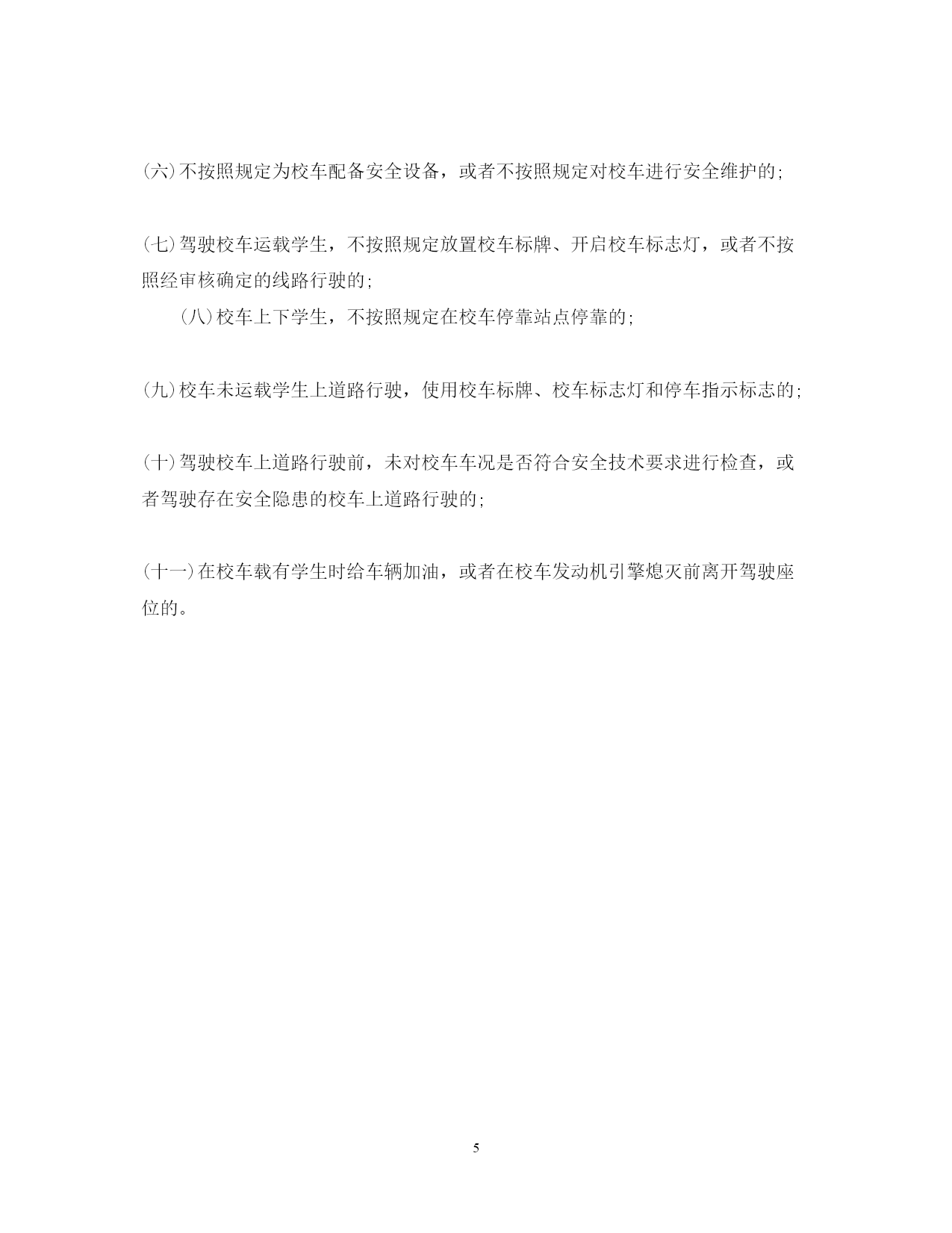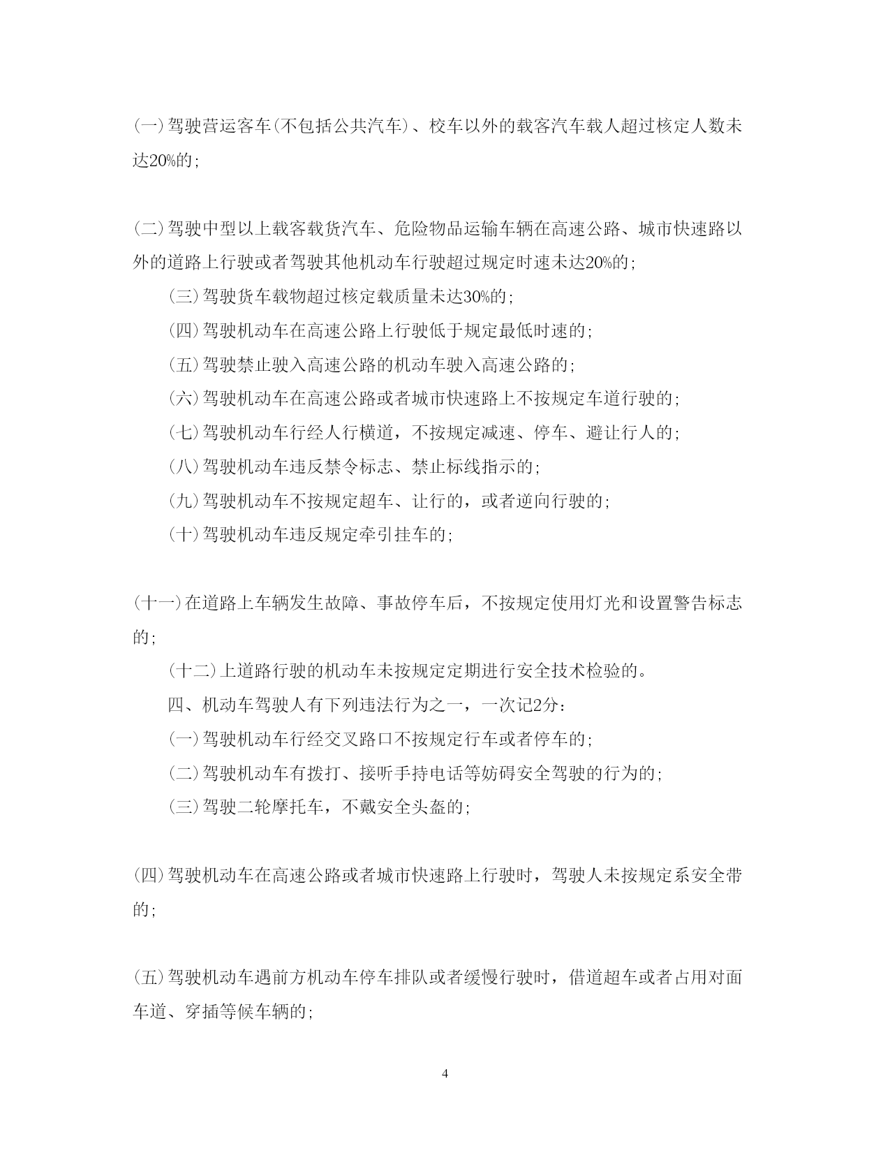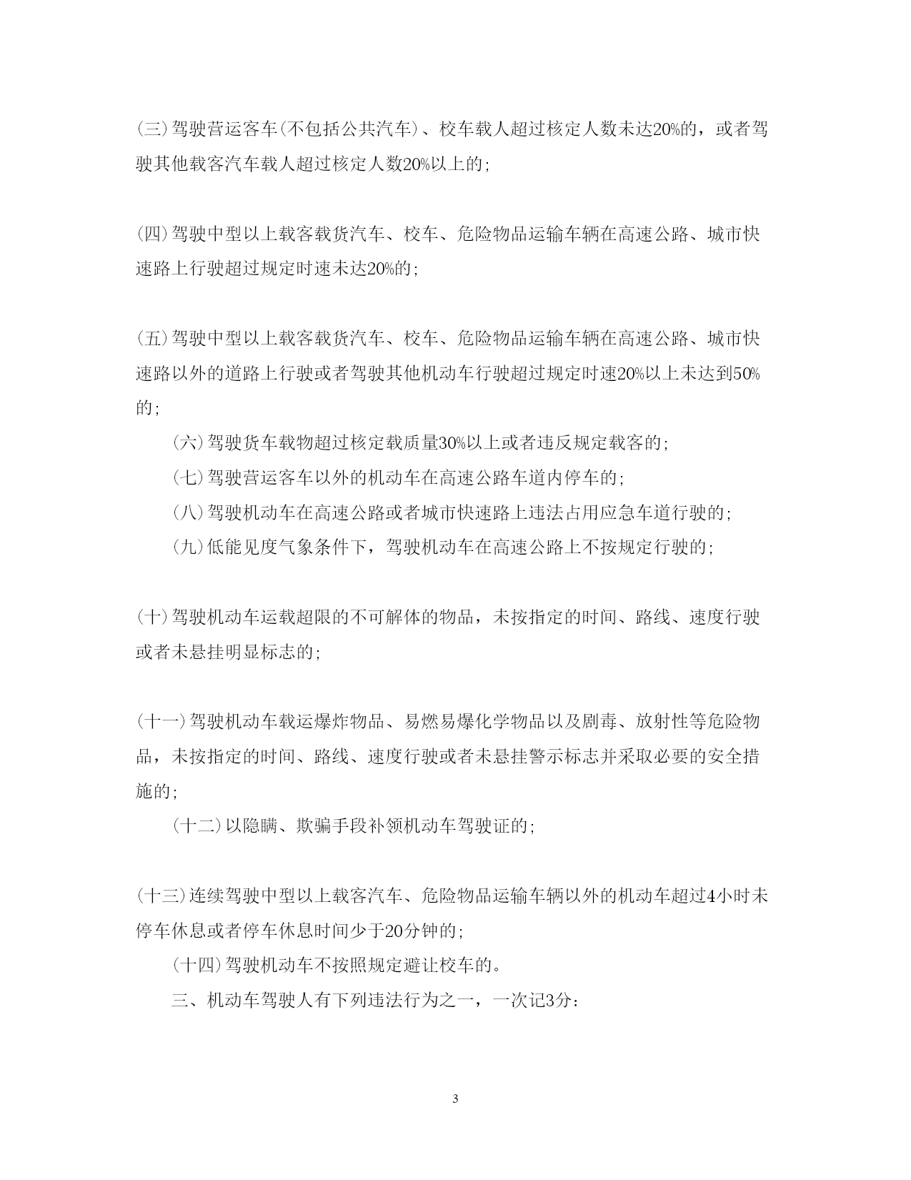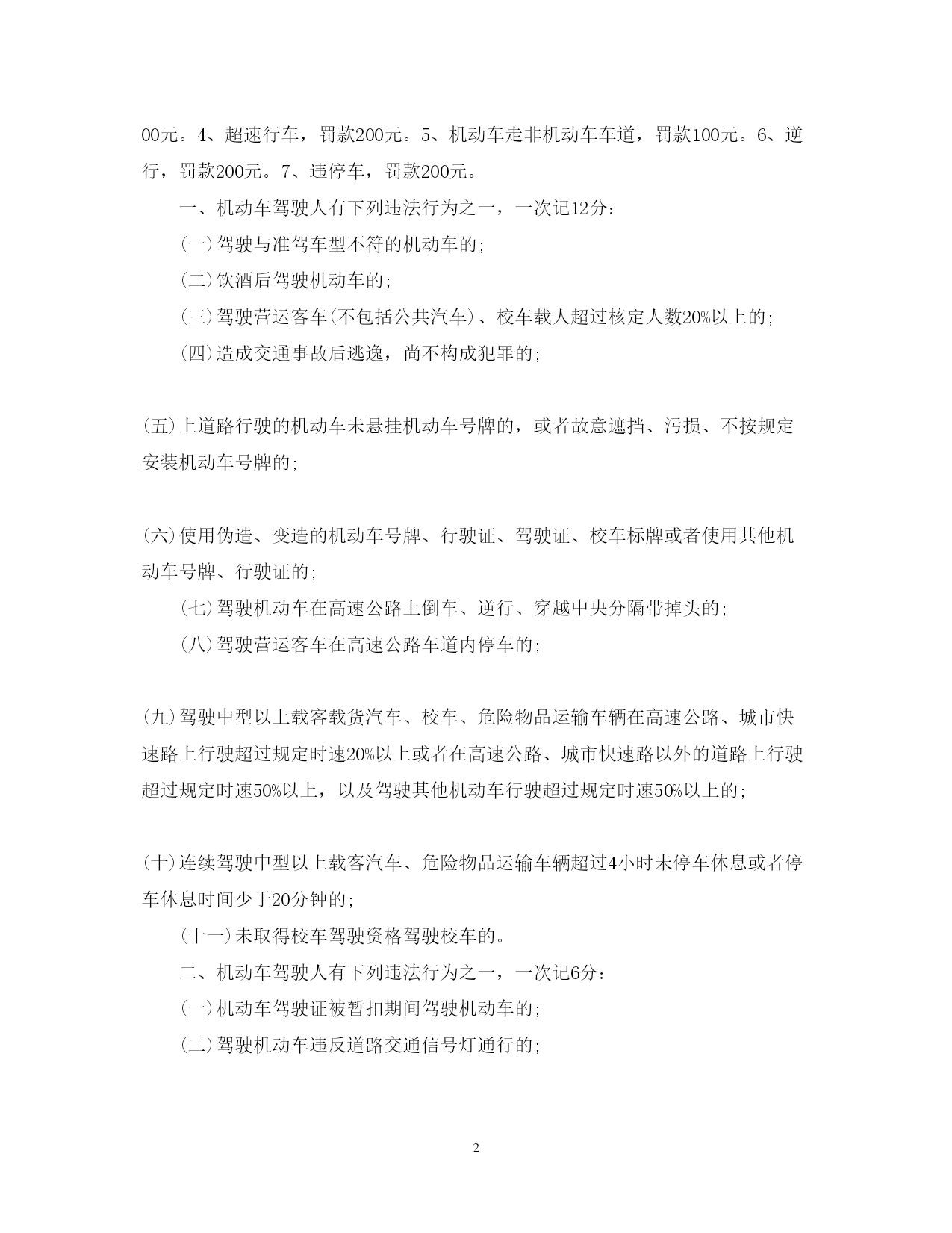 此资料由网络收集而来,如有侵权请告知上传者立即删除。资料共分享,我们负责传递知识。PAGEPAGE52020年交通处罚最新细则交通处罚是公安机关交巡警部门依照交通管理法律、法规和规章的规定,对道路交通违章行为人所作的行政处罚。那么20xx交通处罚有哪些新规呢?下面范文网小编分享了20xx年交通处罚新规定,供你阅读参考。20xx年交通处罚最新规定公安部10月8日公布了最新修订的《机动车驾驶证申领和使用规定》,新交通规则严格了对驾驶员的管理。最新交通法规扣分细则也更为严格,闯红灯交通违法记分将由3分提高到6分,不挂号牌或遮挡号牌的一次就将扣光12分。最新交通法规中关于校车驾驶人管理的内容自发布之日起施行,其他规定将于20xx年1月1日起正式施行。20xx新交通规则提高了违法成本,记分项也由38项增加至52项。具体扣分细节如下:交通违法的处理:(被交警抓到)1、闯红灯,记6分,罚100元。2、酒驾,5年内不得再考取驾照。3、不系安全带,记3分,罚100元。4、副驾不系安全带,记1分,罚50元。5、行驶途中拨打手机,记3分,罚100元。6、行驶途中抽烟,记1分,罚100元。7、有意遮挡号牌,记12分,顶额处罚。8、超速驾驶,记6分。从20xx年7月起,7种摄录违法(非现场处罚)罚款+记分:(是摄录罚款)1、闯红灯,罚款200元。2、不按导向车道行驶,罚款200元。3、违反禁止标线行驶,罚款100元。4、超速行车,罚款200元。5、机动车走非机动车车道,罚款100元。6、逆行,罚款200元。7、违停车,罚款200元。一、机动车驾驶人有下列违法行为之一,一次记12分:(一)驾驶与准驾车型不符的机动车的;(二)饮酒后驾驶机动车的;(三)驾驶营运客车(不包括公共汽车)、校车载人超过核定人数20%以上的;(四)造成交通事故后逃逸,尚不构成犯罪的;(五)上道路行驶的机动车未悬挂机动车号牌的,或者故意遮挡、污损、不按规定安装机动车号牌的;(六)使用伪造、变造的机动车号牌、行驶证、驾驶证、校车标牌或者使用其他机动车号牌、行驶证的;(七)驾驶机动车在高速公路上倒车、逆行、穿越中央分隔带掉头的;(八)驾驶营运客车在高速公路车道内停车的;(九)驾驶中型以上载客载货汽车、校车、危险物品运输车辆在高速公路、城市快速路上行驶超过规定时速20%以上或者在高速公路、城市快速路以外的道路上行驶超过规定时速50%以上,以及驾驶其他机动车行驶超过规定时速50%以上的;(十)连续驾驶中型以上载客汽车、危险物品运输车辆超过4小时未停车休息或者停车休息时间少于20分钟的;(十一)未取得校车驾驶资格驾驶校车的。二、机动车驾驶人有下列违法行为之一,一次记6分:(一)机动车驾驶证被暂扣期间驾驶机动车的;(二)驾驶机动车违反道路交通信号灯通行的;(三)驾驶营运客车(不包括公共汽车)、校车载人超过核定人数未达20%的,或者驾驶其他载客汽车载人超过核定人数20%以上的;(四)驾驶中型以上载客载货汽车、校车、危险物品运输车辆在高速公路、城市快速路上行驶超过规定时速未达20%的;(五)驾驶中型以上载客载货汽车、校车、危险物品运输车辆在高速公路、城市快速路以外的道路上行驶或者驾驶其他机动车行驶超过规定时速20%以上未达到50%的;(六)驾驶货车载物超过核定载质量30%以上或者违反规定载客的;(七)驾驶营运客车以外的机动车在高速公路车道内停车的;(八)驾驶机动车在高速公路或者城市快速路上违法占用应急车道行驶的;(九)低能见度气象条件下,驾驶机动车在高速公路上不按规定行驶的;(十)驾驶机动车运载超限的不可解体的物品,未按指定的时间、路线、速度行驶或者未悬挂明显标志的;(十一)驾驶机动车载运爆炸物品、易燃易爆化学物品以及剧毒、放射性等危险物品,未按指定的时间、路线、速度行驶或者未悬挂警示标志并采取必要的安全措施的;(十二)以隐瞒、欺骗手段补领机动车驾驶证的;(十三)连续驾驶中型以上载客汽车、危险物品运输车辆以外的机动车超过4小时未停车休息或者停车休息时间少于20分钟的;(十四)驾驶机动车不按照规定避让校车的。三、机动车驾驶人有下列违法行为之一,一次记3分:(一)驾驶营运客车(不包括公共汽车)、校车以外的载客汽车载人超过核定人数未达20%的;(二)驾驶中型以上载客载货汽车、危险物品运输车辆在高速公路、城市快速路以外的道路上行驶或者驾驶其他机动车行驶超过规定时速未达20%的;(三)驾驶货车载物超过核定载质量未达30%的;(四)驾驶机动车在高速公路上行驶低于规定最低时速的;(五)驾驶禁止驶入高速公路的机动车驶入高速公路的;(六)驾驶机动车在高速公路或者城市快速路上不按规定车道行驶的;(七