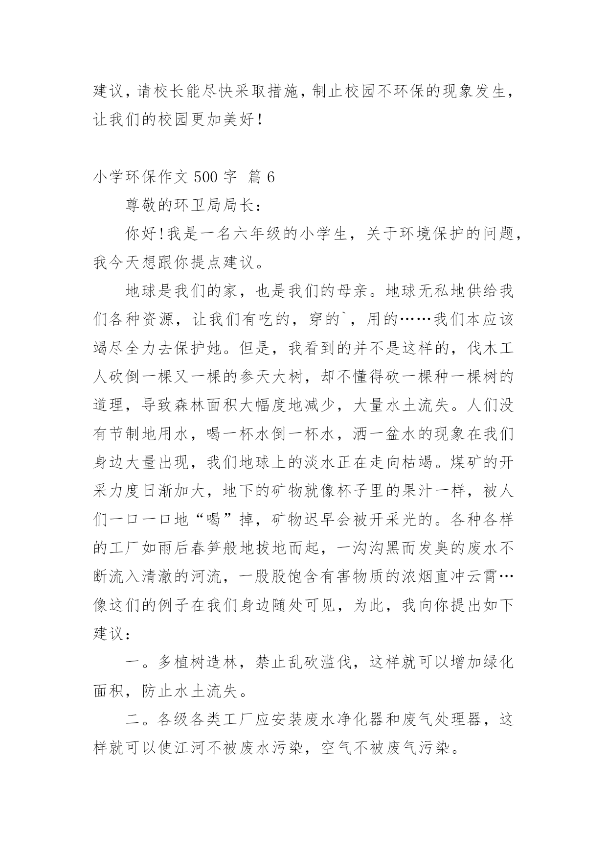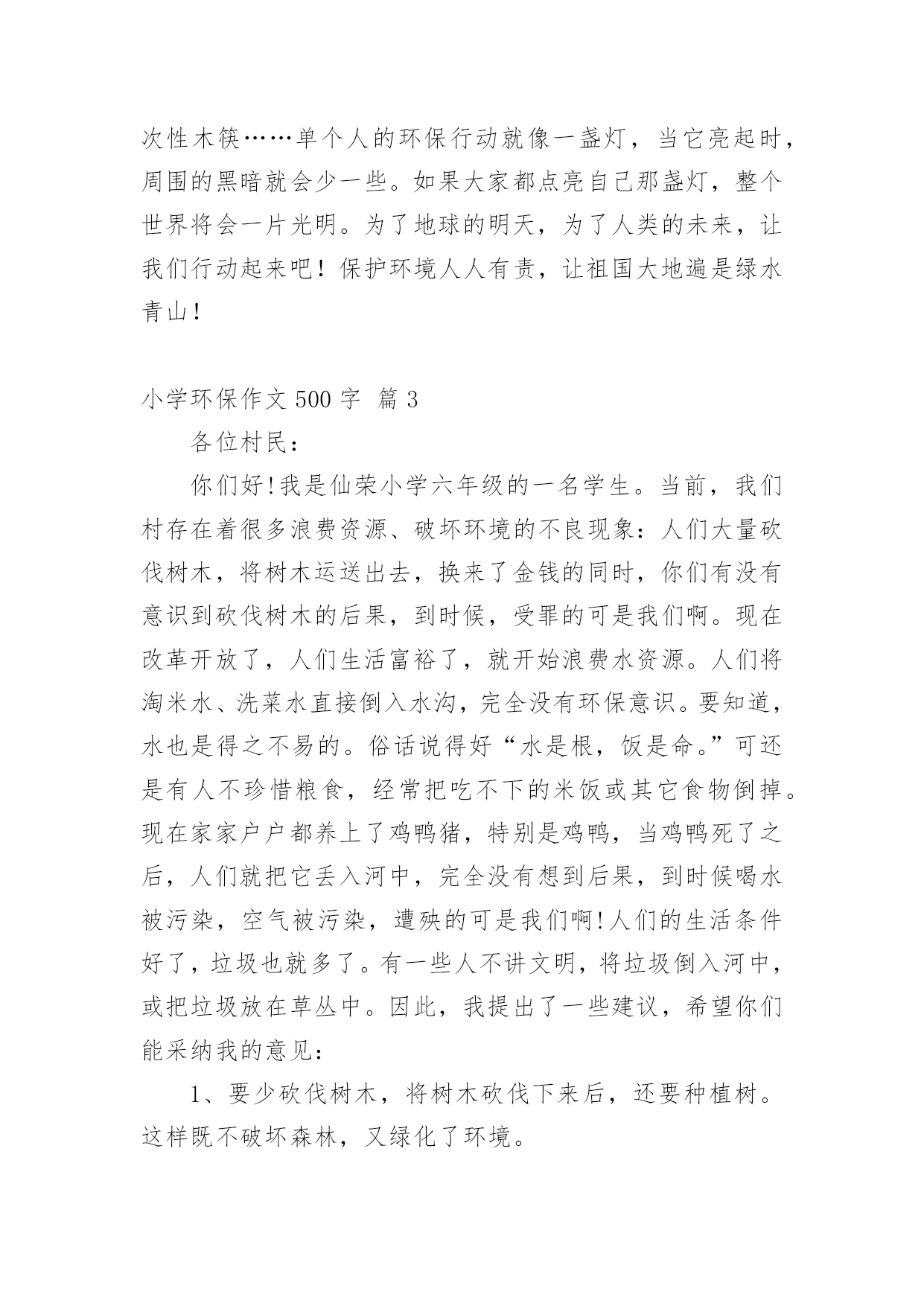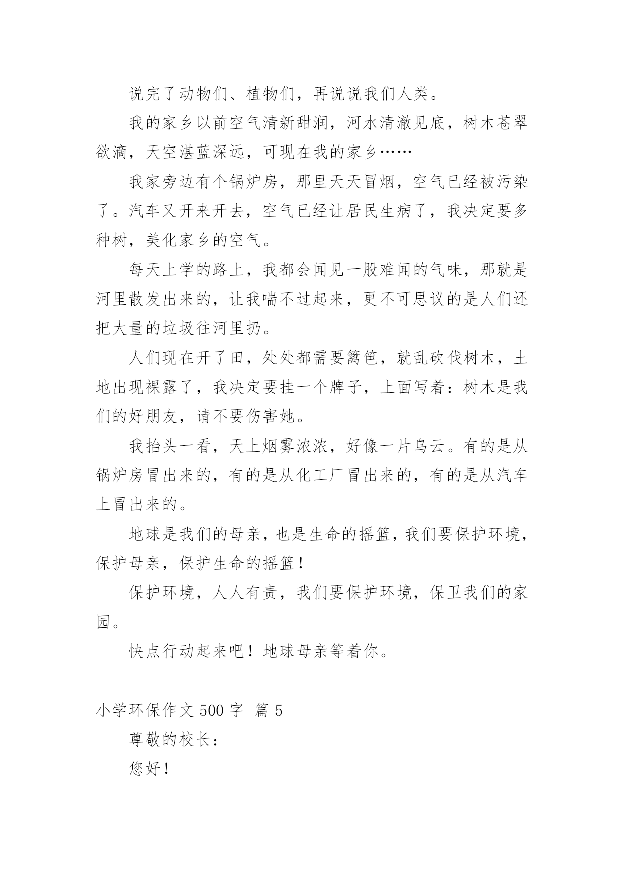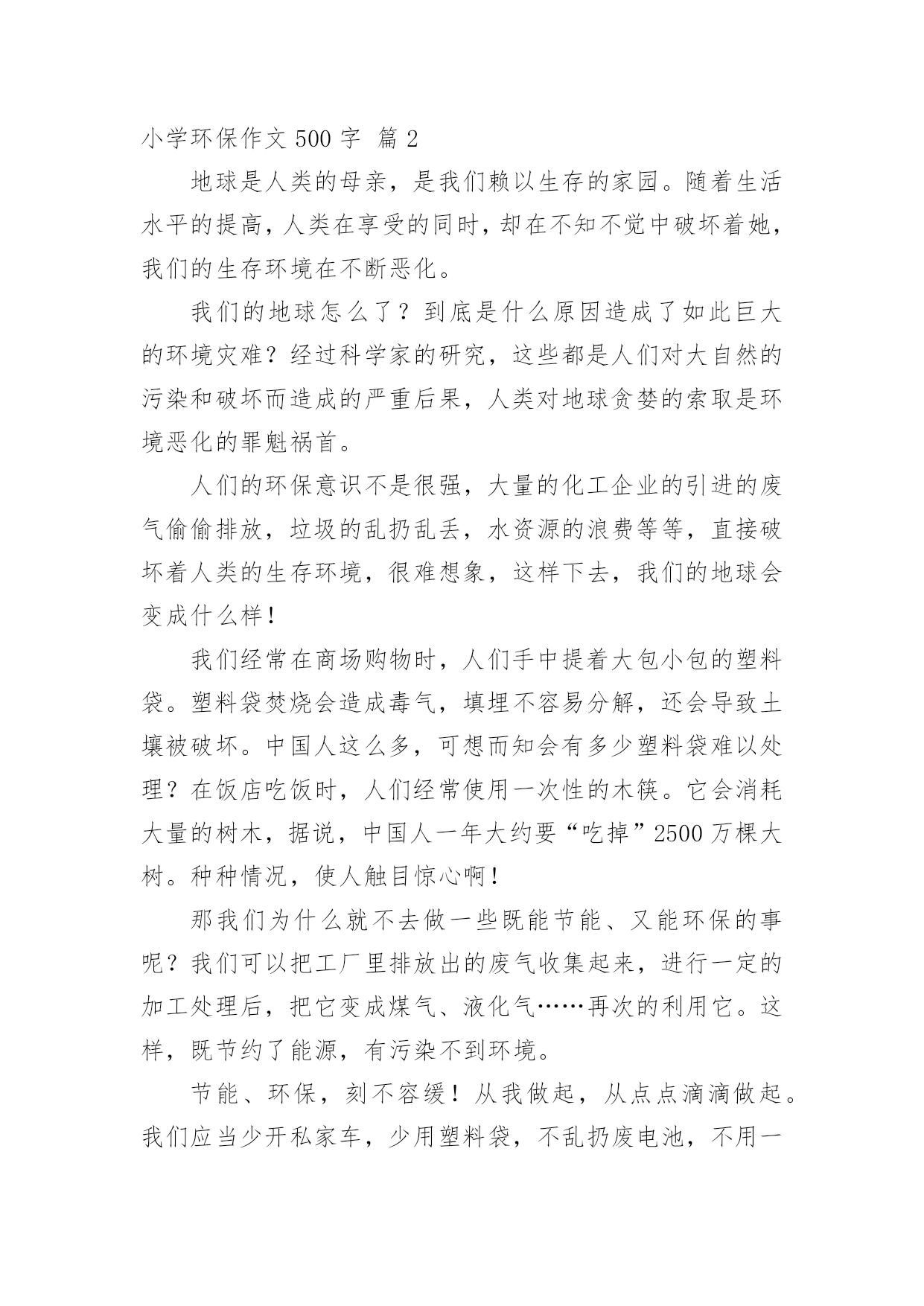 小学环保作文500字小学环保作文500字锦集七篇在日常学习、工作和生活中,许多人都写过作文吧,作文一定要做到主题集中,围绕同一主题作深入阐述,切忌东拉西扯,主题涣散甚至无主题。那么,怎么去写作文呢?以下是小编为大家整理的小学环保作文500字7篇,仅供参考,大家一起来看看吧。小学环保作文500字篇1举一个例子:我国的木兰溪,在50年代初本是一个清澈见底的河流,但现在它已是鱼虾绝迹的污河,又为我们的地球母亲添多一道疤痕。这,不是给人类重重地敲响了警钟吗?由此,我郑重地向仍未觉悟的人们建议:第一,人类要想征服可怕的大自然,就必须尊重自然。对于改造自然理应慎之又慎,又要大刀阔斧,勇于实践和改良,才能控制自然,使自身利益与自然协调发展,决不能重蹈西方发达国家“先污染,后治理”的覆辙。第二,要从我做起,首先选择有利于保护环境的生活方式。善待我们的家园、善待地球,共创一个美好的生活环境。1、节约资源减少污染(1)节水为荣,随时关上水龙头,防止滴漏。(2)慎用清洁剂,尽量用肥皂,减少洗涤剂中的化学物质对水的污染。2、绿色消费环保选择(1)用无铅汽油、无镉铅电池、无磷洗涤剂,减少水与空气的污染。(2)购买低砩家用制冷器具、无砩发用摩丝,减少对臭氧层的污染。3、重复使用多次利用尽量少使用一次性用品,多使用耐用品。如不使用一次性塑料和餐盒,减少白色污染;不使用一次性筷子;自备购物口袋或提篮。4、分类回收循环再用不乱丢弃废电池、废塑料等垃圾、废物;将垃圾分类投放,变废为宝,使资源循环再生,造福人类。5、保护自然万物共存不猎杀、使用珍稀动物和受保护的动物,关爱与保护野生动植物;植树造林,爱护我们身边的每一寸绿地、每一株花草、每一片树木。6、讲究卫生保护环境不随地吐痰,不乱扔垃圾,不在公共场所吸烟,不制造噪音。作为新时代的小学生,我倡导同学门提高保护环境的意识,也建议叔叔阿姨们加入我们的队伍中来,为保护环境、造福后代贡献自己的力量。因为:保护环境,刻不容缓!小学环保作文500字篇2地球是人类的母亲,是我们赖以生存的家园。随着生活水平的提高,人类在享受的同时,却在不知不觉中破坏着她,我们的生存环境在不断恶化。我们的地球怎么了?到底是什么原因造成了如此巨大的环境灾难?经过科学家的研究,这些都是人们对大自然的污染和破坏而造成的严重后果,人类对地球贪婪的索取是环境恶化的罪魁祸首。人们的环保意识不是很强,大量的化工企业的引进的废气偷偷排放,垃圾的乱扔乱丢,水资源的浪费等等,直接破坏着人类的生存环境,很难想象,这样下去,我们的地球会变成什么样!我们经常在商场购物时,人们手中提着大包小包的塑料袋。塑料袋焚烧会造成毒气,填埋不容易分解,还会导致土壤被破坏。中国人这么多,可想而知会有多少塑料袋难以处理?在饭店吃饭时,人们经常使用一次性的木筷。它会消耗大量的树木,据说,中国人一年大约要“吃掉”2500万棵大树。种种情况,使人触目惊心啊!那我们为什么就不去做一些既能节能、又能环保的事呢?我们可以把工厂里排放出的废气收集起来,进行一定的加工处理后,把它变成煤气、液化气……再次的利用它。这样,既节约了能源,有污染不到环境。节能、环保,刻不容缓!从我做起,从点点滴滴做起。我们应当少开私家车,少用塑料袋,不乱扔废电池,不用一次性木筷……单个人的环保行动就像一盏灯,当它亮起时,周围的黑暗就会少一些。如果大家都点亮自己那盏灯,整个世界将会一片光明。为了地球的明天,为了人类的未来,让我们行动起来吧!保护环境人人有责,让祖国大地遍是绿水青山!小学环保作文500字篇3各位村民:你们好!我是仙荣小学六年级的一名学生。当前,我们村存在着很多浪费资源、破坏环境的不良现象:人们大量砍伐树木,将树木运送出去,换来了金钱的同时,你们有没有意识到砍伐树木的后果,到时候,受罪的可是我们啊。现在改革开放了,人们生活富裕了,就开始浪费水资源。人们将淘米水、洗菜水直接倒入水沟,完全没有环保意识。要知道,水也是得之不易的。俗话说得好“水是根,饭是命。”可还是有人不珍惜粮食,经常把吃不下的米饭或其它食物倒掉。现在家家户户都养上了鸡鸭猪,特别是鸡鸭,当鸡鸭死了之后,人们就把它丢入河中,完全没有想到后果,到时候喝水被污染,空气被污染,遭殃的可是我们啊!人们的生活条件好了,垃圾也就多了。有一些人不讲文明,将垃圾倒入河中,或把垃圾放在草丛中。因此,我提出了一些建议,希望你们能采纳我的意见:1、要少砍伐树木,将树木砍伐下来后,还要种植树。这样既不破坏森林,又绿化了环境。2、要珍惜水资源。可以将淘米水、洗菜水、洗衣服水用来浇灌树木。3、要珍惜粮食。一粥一米都是劳动人民用双手种植得来的。要清楚自己的饭量,盛饭时,不能盛太多,如果实在吃不下去,可以喂给鸡鸭吃。节约光荣,浪费可耻。4、要爱护环境。家中的死鸡死鸭可以密封,然后拿到垃圾